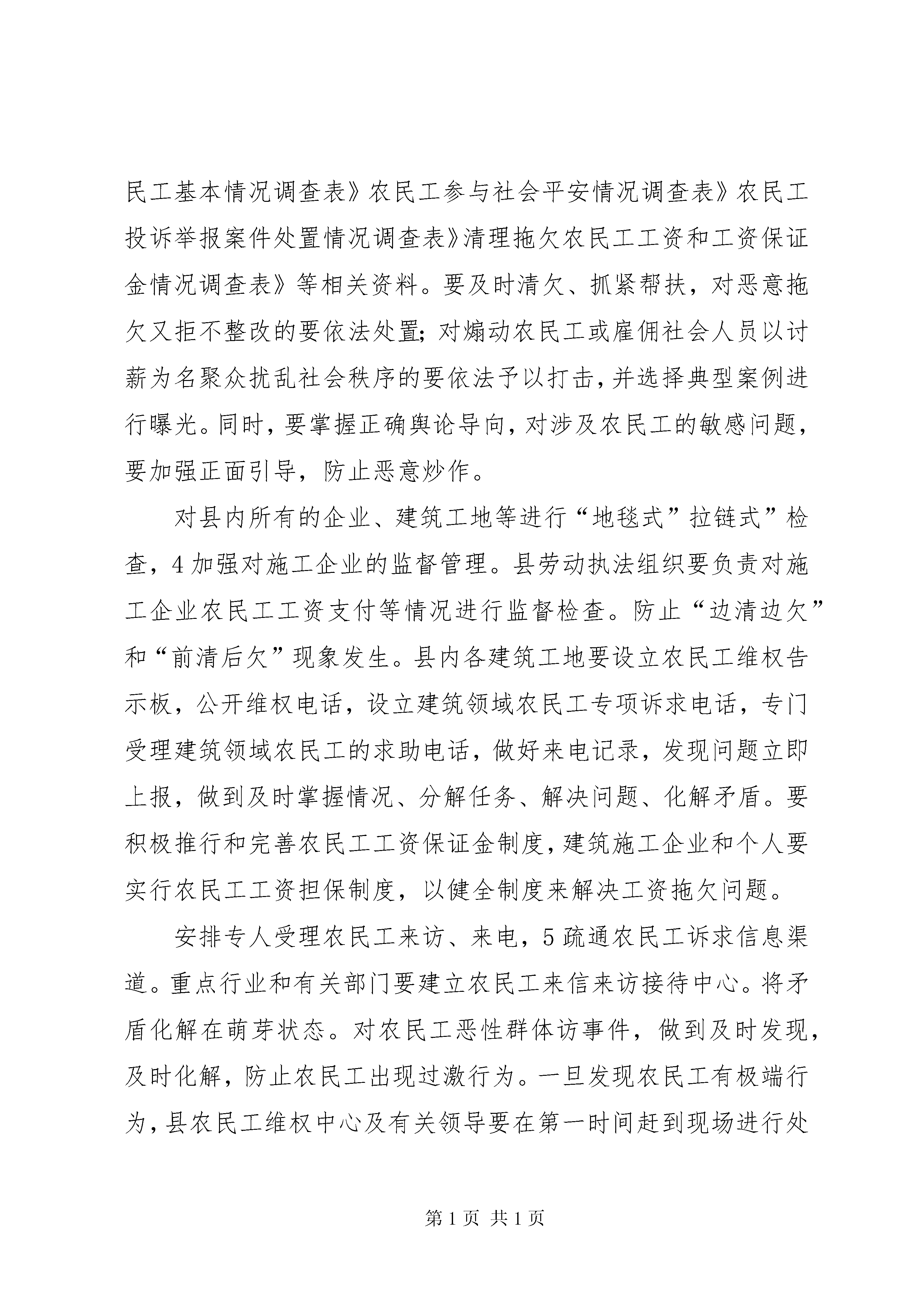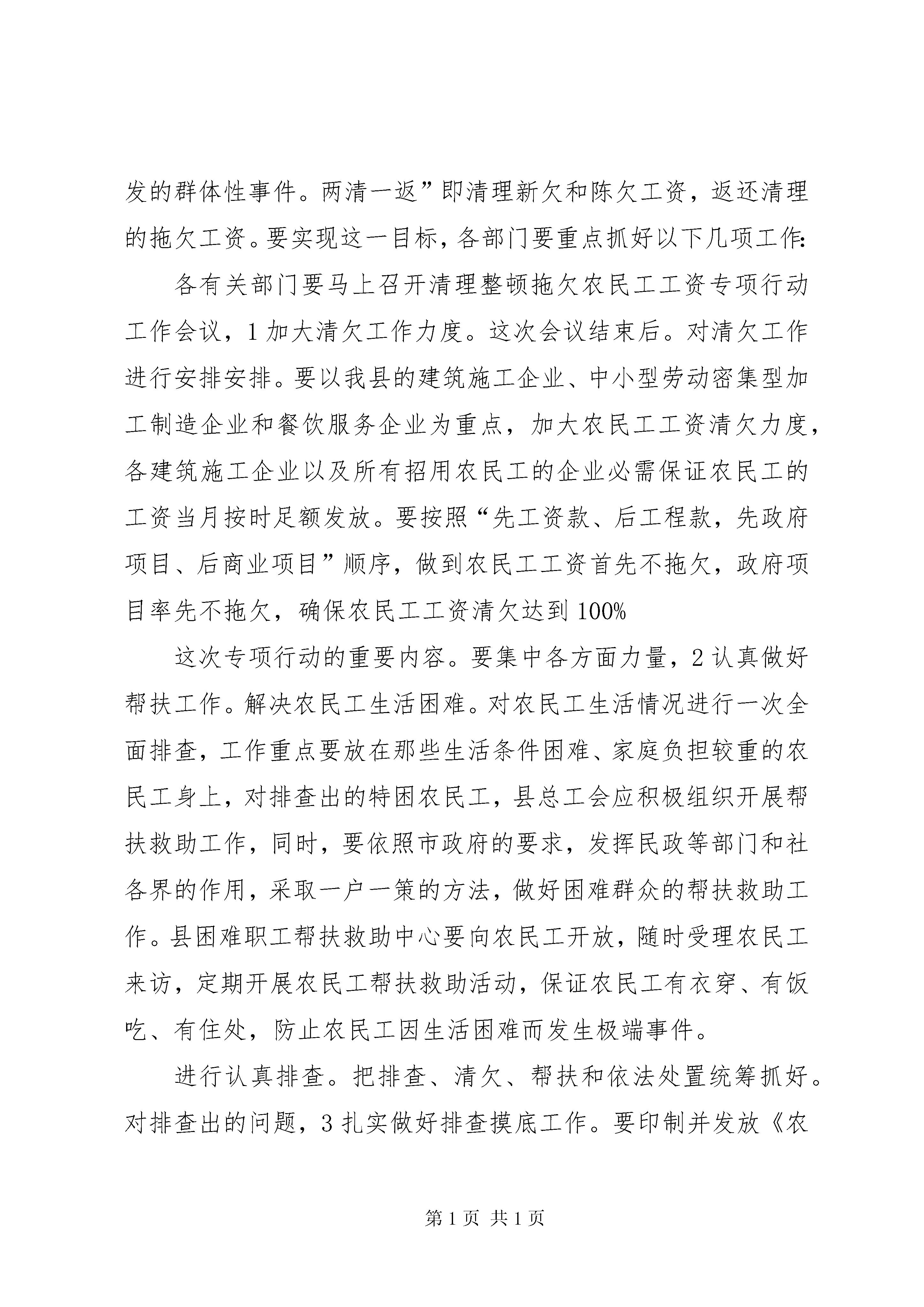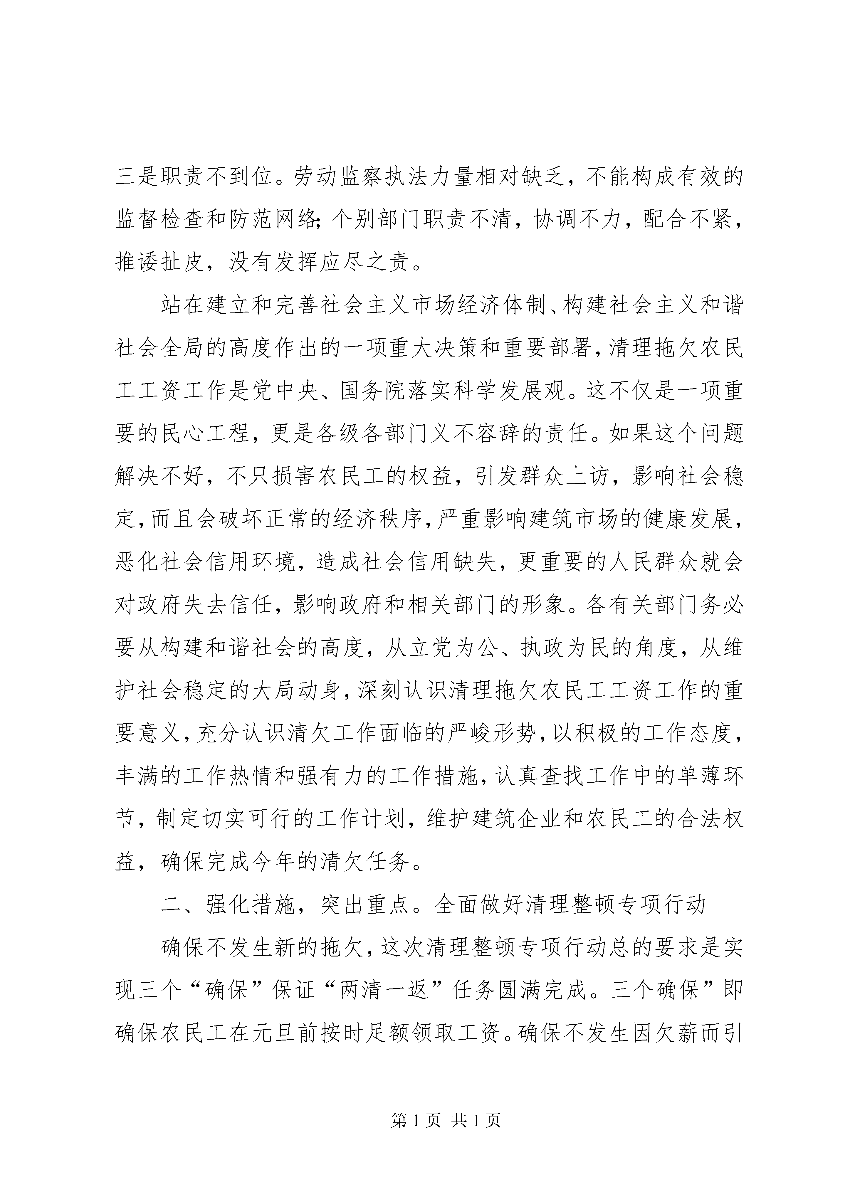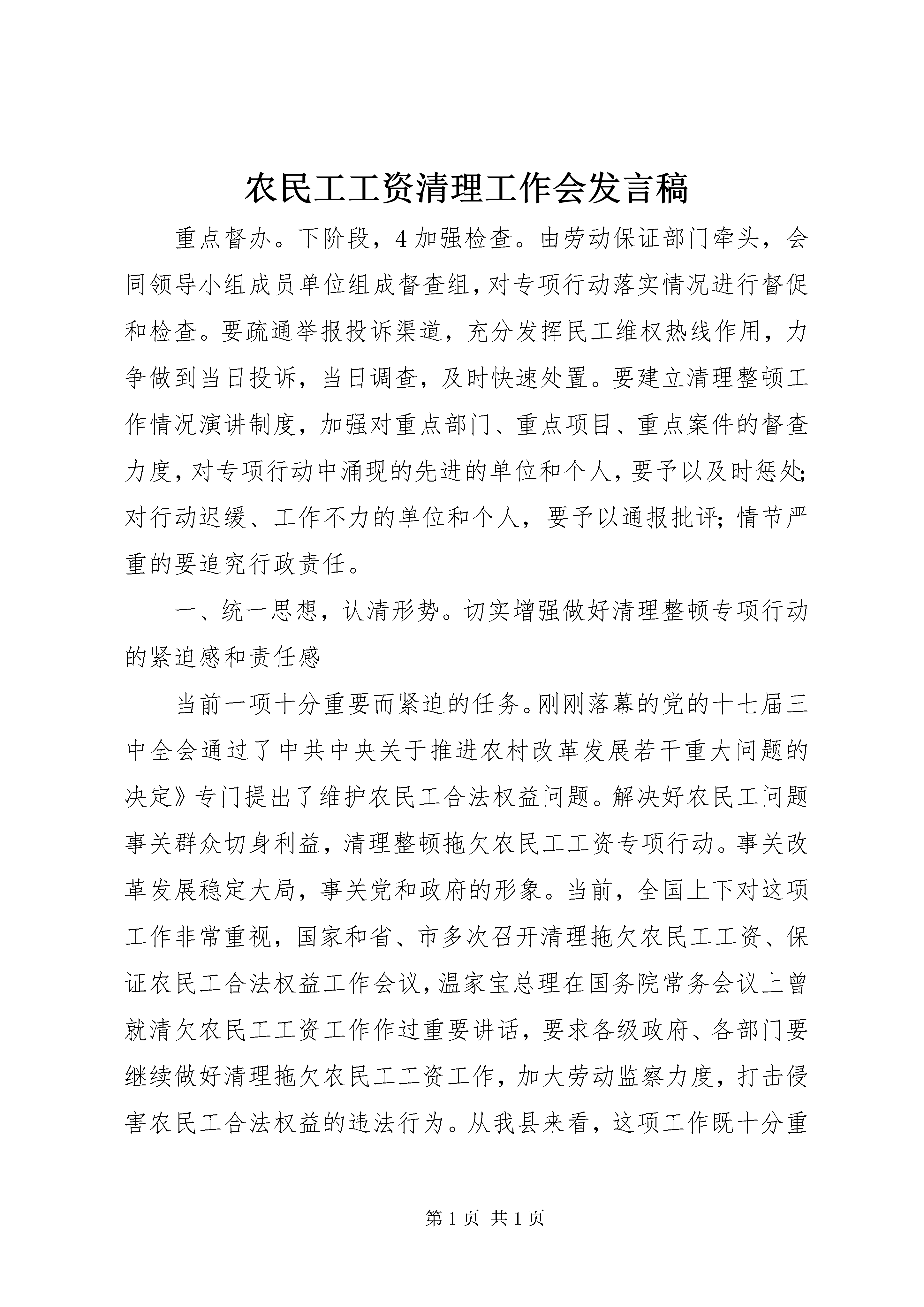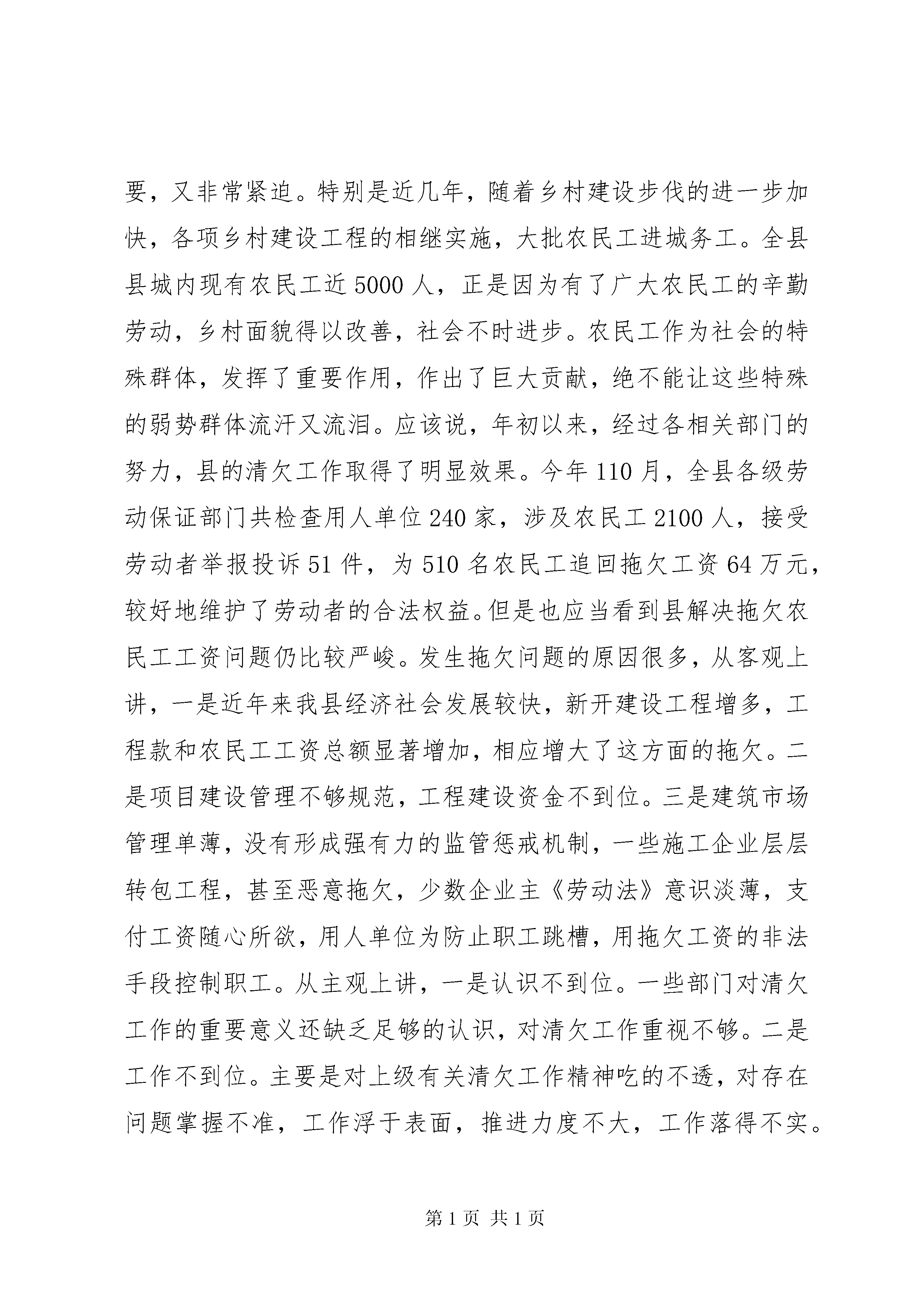 农民工工资清理工作会发言稿重点督办。下阶段,4加强检查。由劳动保证部门牵头,会同领导小组成员单位组成督查组,对专项行动落实情况进行督促和检查。要疏通举报投诉渠道,充分发挥民工维权热线作用,力争做到当日投诉,当日调查,及时快速处置。要建立清理整顿工作情况演讲制度,加强对重点部门、重点项目、重点案件的督查力度,对专项行动中涌现的先进的单位和个人,要予以及时惩处;对行动迟缓、工作不力的单位和个人,要予以通报批评;情节严重的要追究行政责任。一、统一思想,认清形势。切实增强做好清理整顿专项行动的紧迫感和责任感当前一项十分重要而紧迫的任务。刚刚落幕的党的十七届三中全会通过了中共中央关于推进农村改革发展若干重大问题的决定》专门提出了维护农民工合法权益问题。解决好农民工问题事关群众切身利益,清理整顿拖欠农民工工资专项行动。事关改革发展稳定大局,事关党和政府的形象。当前,全国上下对这项工作非常重视,国家和省、市多次召开清理拖欠农民工工资、保证农民工合法权益工作会议,温家宝总理在国务院常务会议上曾就清欠农民工工资工作作过重要讲话,要求各级政府、各部门要继续做好清理拖欠农民工工资工作,加大劳动监察力度,打击侵害农民工合法权益的违法行为。从我县来看,这项工作既十分重要,又非常紧迫。特别是近几年,随着乡村建设步伐的进一步加快,各项乡村建设工程的相继实施,大批农民工进城务工。全县县城内现有农民工近5000人,正是因为有了广大农民工的辛勤劳动,乡村面貌得以改善,社会不时进步。农民工作为社会的特殊群体,发挥了重要作用,作出了巨大贡献,绝不能让这些特殊的弱势群体流汗又流泪。应该说,年初以来,经过各相关部门的努力,县的清欠工作取得了明显效果。今年110月,全县各级劳动保证部门共检查用人单位240家,涉及农民工2100人,接受劳动者举报投诉51件,为510名农民工追回拖欠工资64万元,较好地维护了劳动者的合法权益。但是也应当看到县解决拖欠农民工工资问题仍比较严峻。发生拖欠问题的原因很多,从客观上讲,一是近年来我县经济社会发展较快,新开建设工程增多,工程款和农民工工资总额显著增加,相应增大了这方面的拖欠。二是项目建设管理不够规范,工程建设资金不到位。三是建筑市场管理单薄,没有形成强有力的监管惩戒机制,一些施工企业层层转包工程,甚至恶意拖欠,少数企业主《劳动法》意识淡薄,支付工资随心所欲,用人单位为防止职工跳槽,用拖欠工资的非法手段控制职工。从主观上讲,一是认识不到位。一些部门对清欠工作的重要意义还缺乏足够的认识,对清欠工作重视不够。二是工作不到位。主要是对上级有关清欠工作精神吃的不透,对存在问题掌握不准,工作浮于表面,推进力度不大,工作落得不实。三是职责不到位。劳动监察执法力量相对缺乏,不能构成有效的监督检查和防范网络;个别部门职责不清,协调不力,配合不紧,推诿扯皮,没有发挥应尽之责。站在建立和完善社会主义市场经济体制、构建社会主义和谐社会全局的高度作出的一项重大决策和重要部署,清理拖欠农民工工资工作是党中央、国务院落实科学发展观。这不仅是一项重要的民心工程,更是各级各部门义不容辞的责任。如果这个问题解决不好,不只损害农民工的权益,引发群众上访,影响社会稳定,而且会破坏正常的经济秩序,严重影响建筑市场的健康发展,恶化社会信用环境,造成社会信用缺失,更重要的人民群众就会对政府失去信任,影响政府和相关部门的形象。各有关部门务必要从构建和谐社会的高度,从立党为公、执政为民的角度,从维护社会稳定的大局动身,深刻认识清理拖欠农民工工资工作的重要意义,充分认识清欠工作面临的严峻形势,以积极的工作态度,丰满的工作热情和强有力的工作措施,认真查找工作中的单薄环节,制定切实可行的工作计划,维护建筑企业和农民工的合法权益,确保完成今年的清欠任务。二、强化措施,突出重点。全面做好清理整顿专项行动确保不发生新的拖欠,这次清理整顿专项行动总的要求是实现三个“确保”保证“两清一返”任务圆满完成。三个确保”即确保农民工在元旦前按时足额领取工资。确保不发生因欠薪而引发的群体性事件。两清一返”即清理新欠和陈欠工资,返还清理的拖欠工资。要实现这一目标,各部门要重点抓好以下几项工作:各有关部门要马上召开清理整顿拖欠农民工工资专项行动工作会议,1加大清欠工作力度。这次会议结束后。对清欠工作进行安排安排。要以我县的建筑施工企业、中小型劳动密集型加工制造企业和餐饮服务企业为重点,加大农民工工资清欠力度,各建筑施工企业以及所有招用农民工的企业必需保证农民工的工资当月按时足额发放。要按照“先工资款、后工程款,先政府项目、后商业项目”顺序,做到农民工工资首先不拖欠,政府项目率先不拖欠,确保农民工工资清欠达到100%这次专项行动的重要内容。要集中各方面力量,2认真做好帮扶工作。解决农民工生活