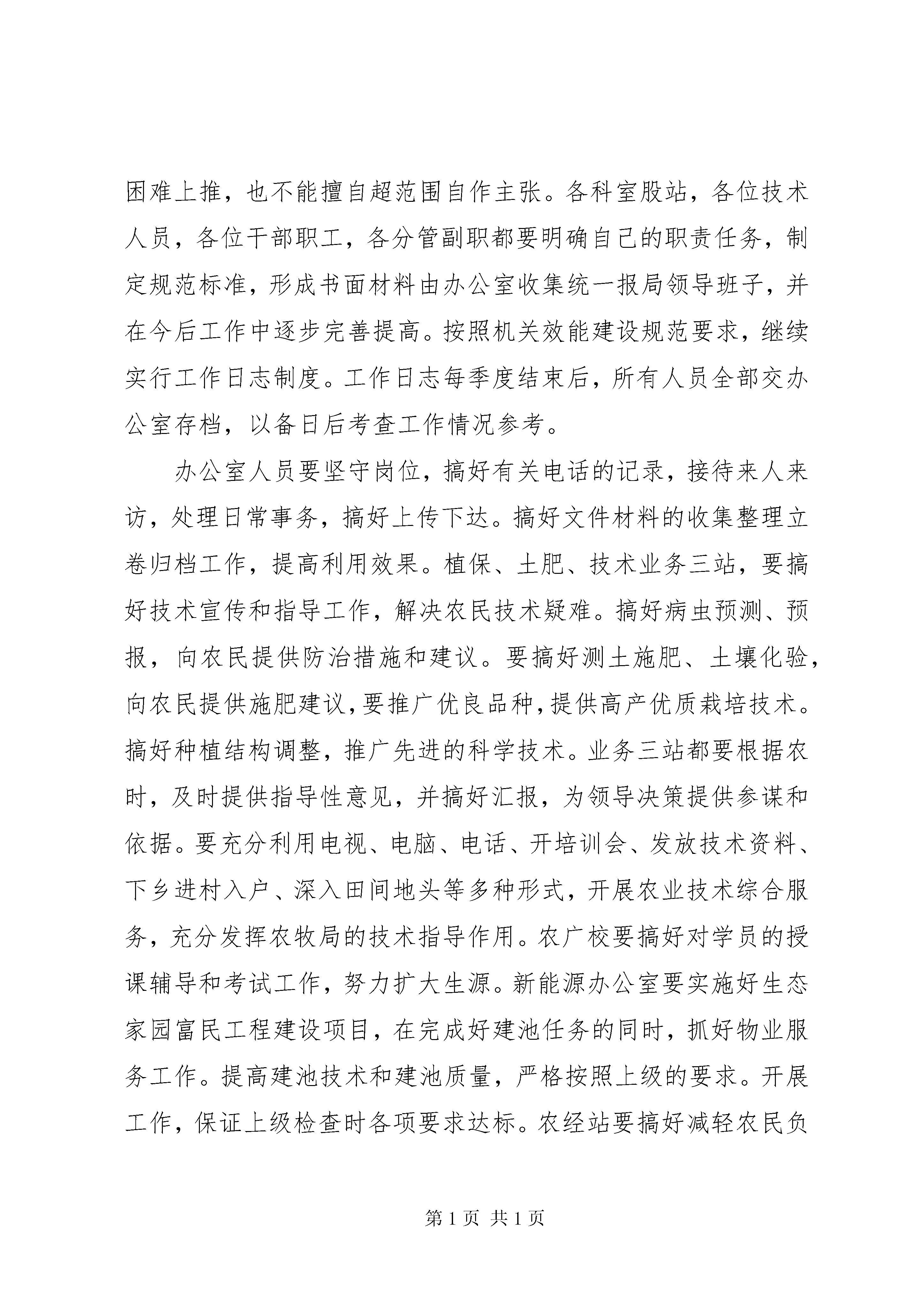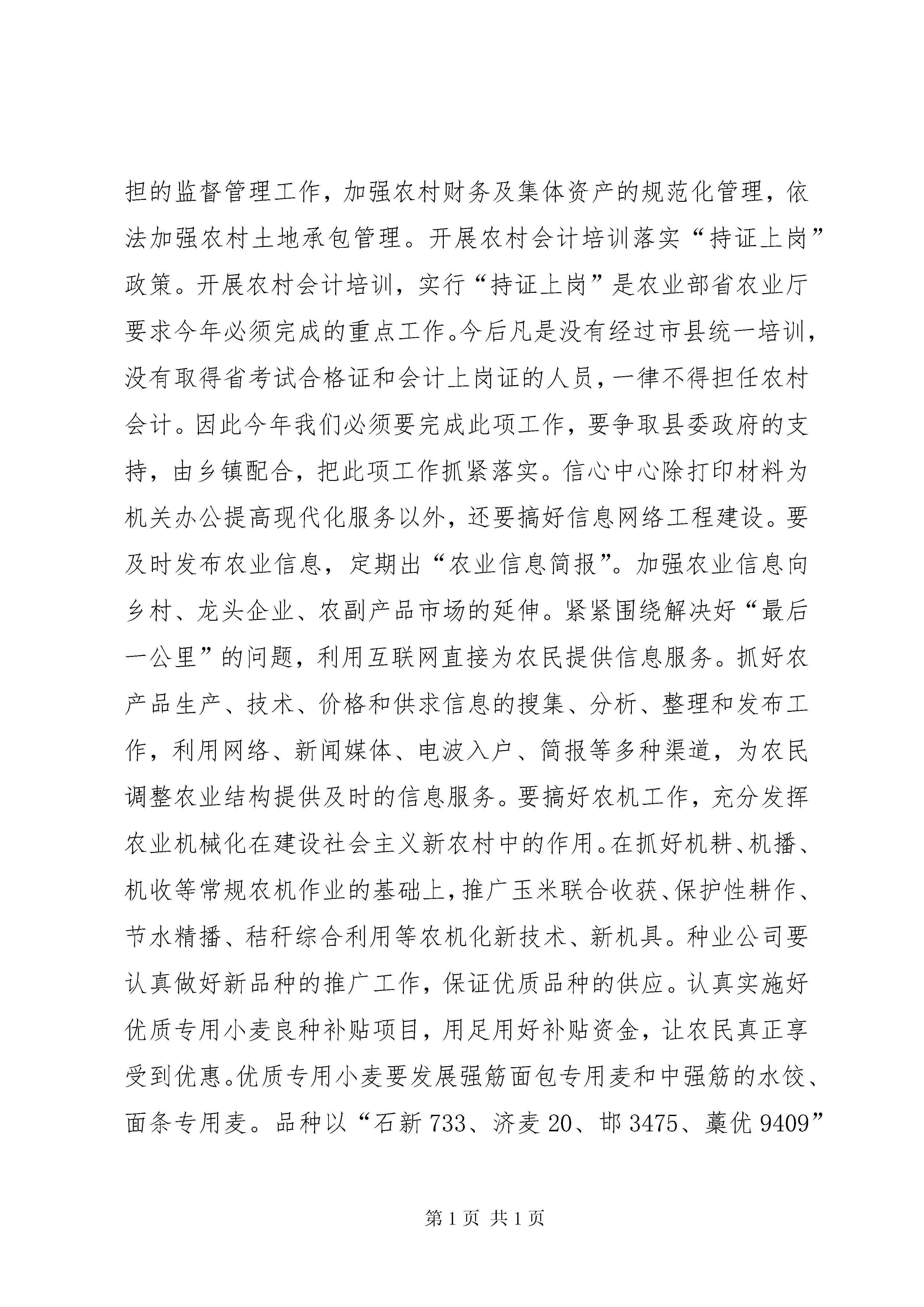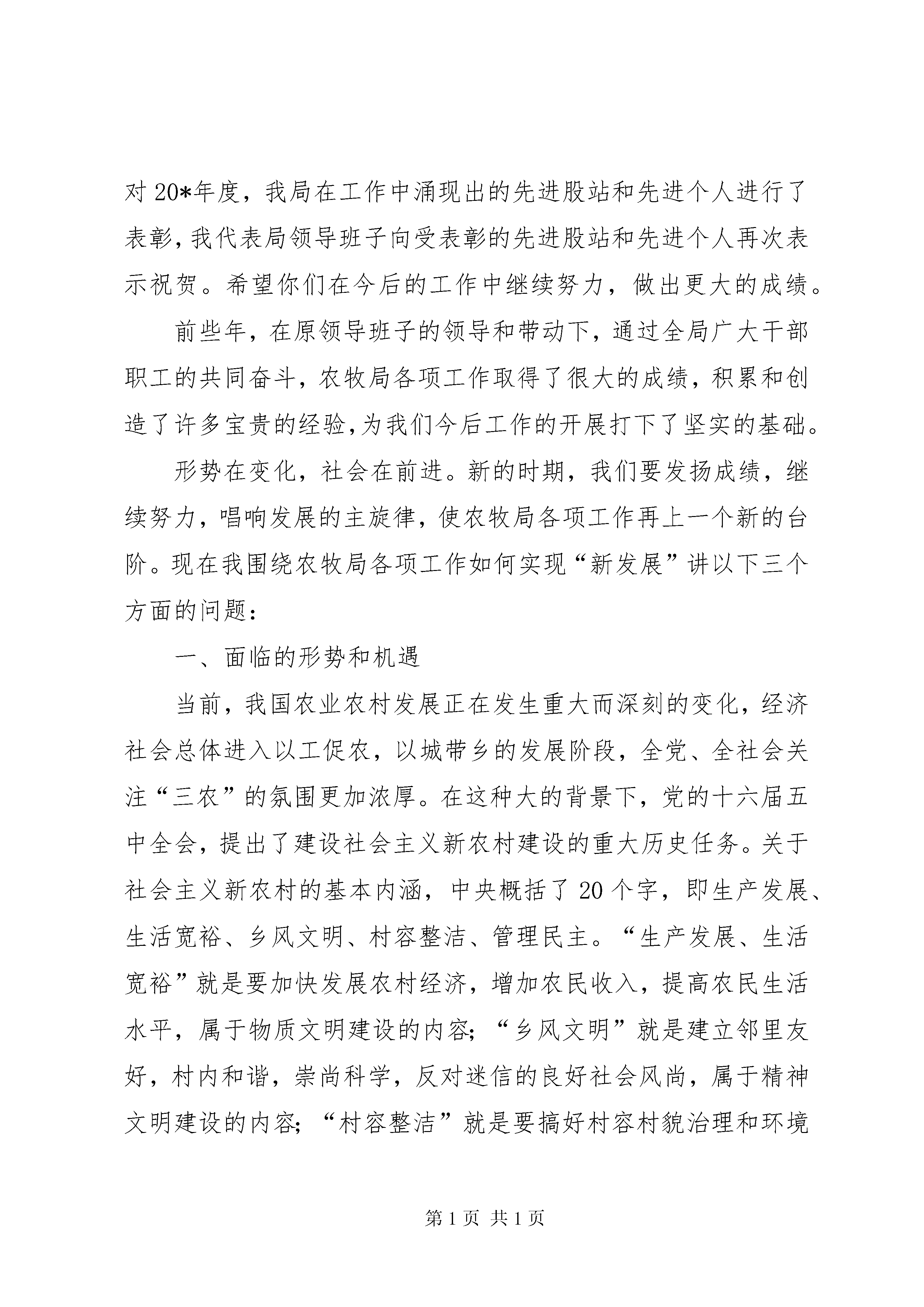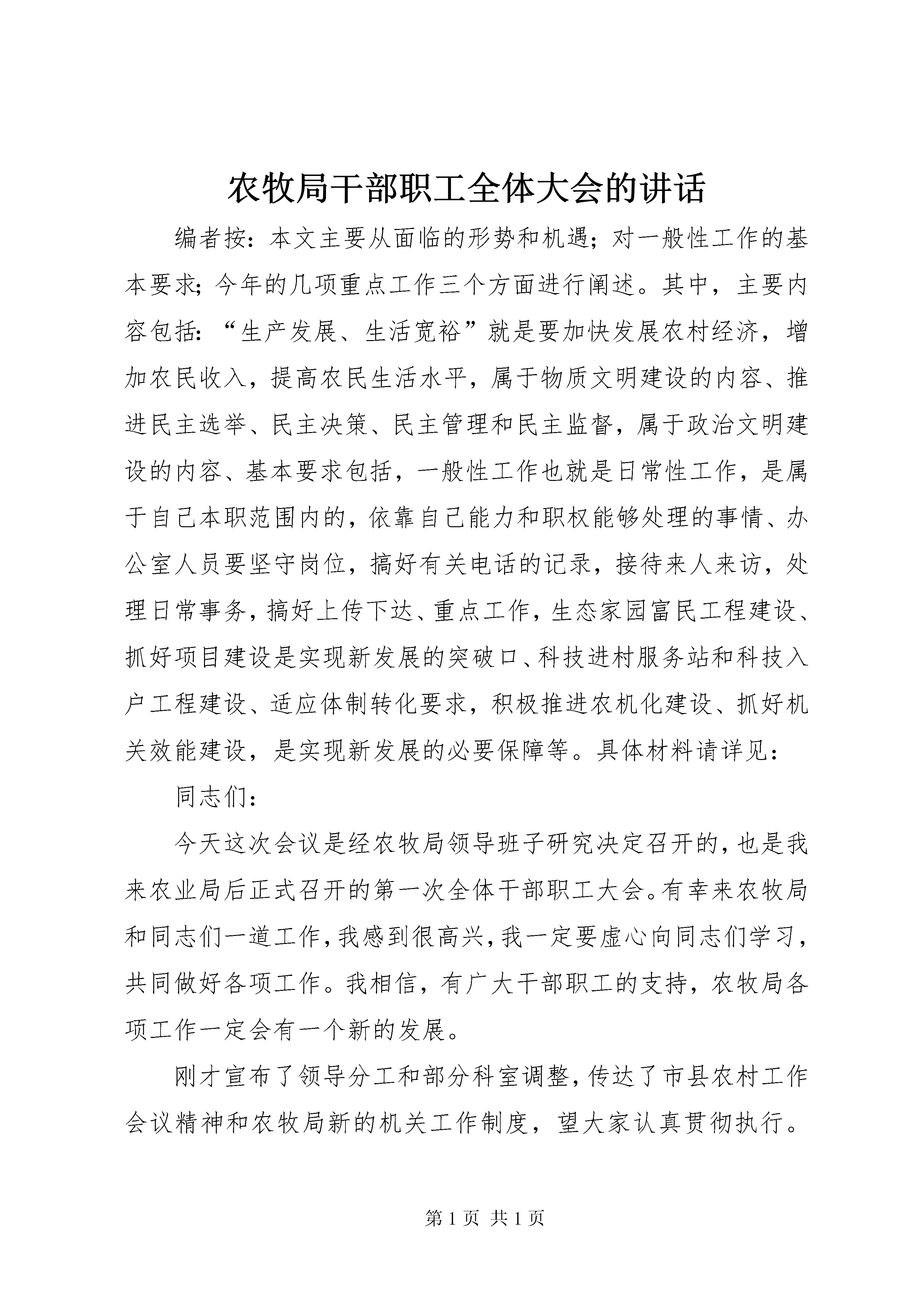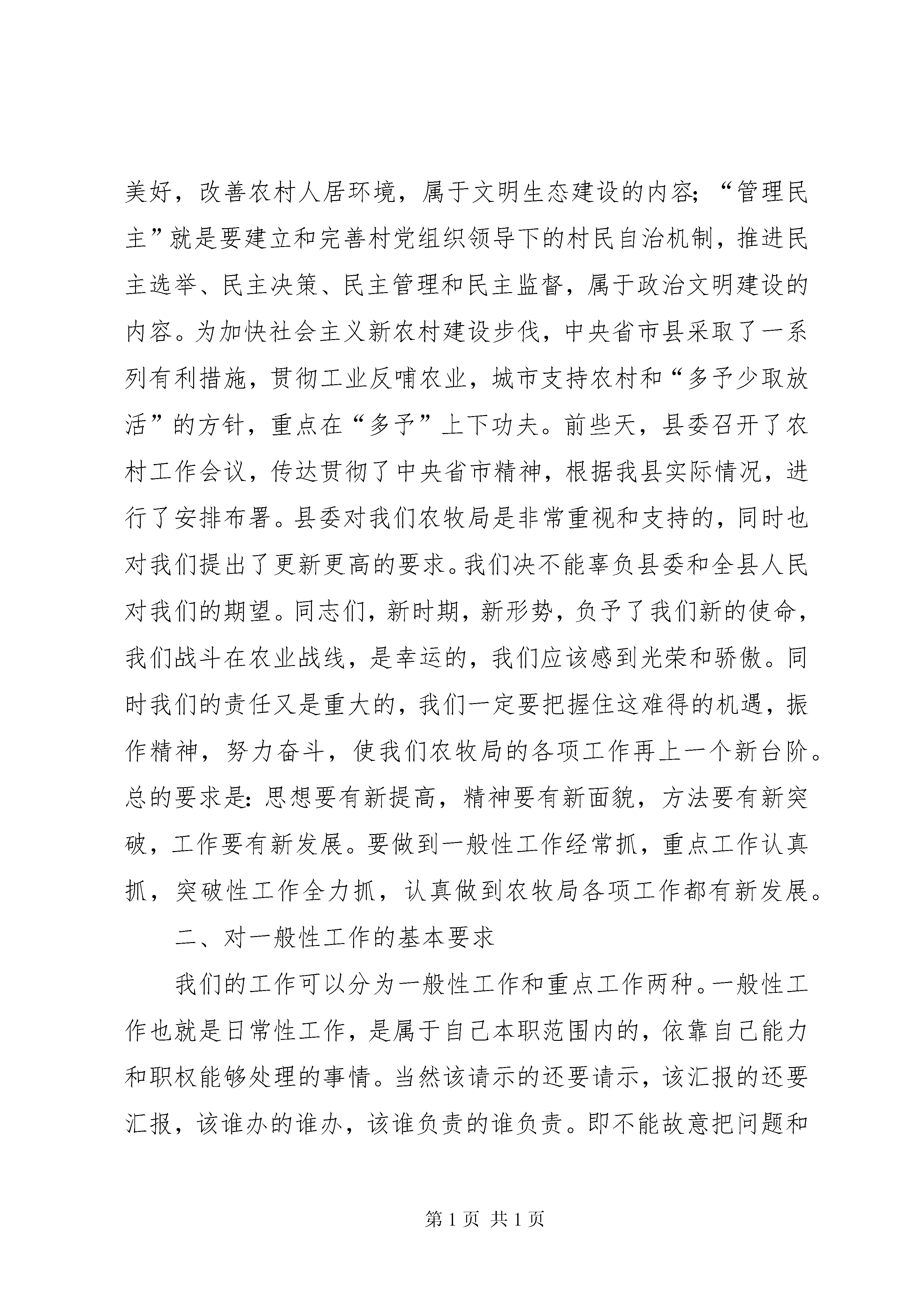 农牧局干部职工全体大会的讲话编者按:本文主要从面临的形势和机遇;对一般性工作的基本要求;今年的几项重点工作三个方面进行阐述。其中,主要内容包括:“生产发展、生活宽裕”就是要加快发展农村经济,增加农民收入,提高农民生活水平,属于物质文明建设的内容、推进民主选举、民主决策、民主管理和民主监督,属于政治文明建设的内容、基本要求包括,一般性工作也就是日常性工作,是属于自己本职范围内的,依靠自己能力和职权能够处理的事情、办公室人员要坚守岗位,搞好有关电话的记录,接待来人来访,处理日常事务,搞好上传下达、重点工作,生态家园富民工程建设、抓好项目建设是实现新发展的突破口、科技进村服务站和科技入户工程建设、适应体制转化要求,积极推进农机化建设、抓好机关效能建设,是实现新发展的必要保障等。具体材料请详见:同志们:今天这次会议是经农牧局领导班子研究决定召开的,也是我来农业局后正式召开的第一次全体干部职工大会。有幸来农牧局和同志们一道工作,我感到很高兴,我一定要虚心向同志们学习,共同做好各项工作。我相信,有广大干部职工的支持,农牧局各项工作一定会有一个新的发展。刚才宣布了领导分工和部分科室调整,传达了市县农村工作会议精神和农牧局新的机关工作制度,望大家认真贯彻执行。对20*年度,我局在工作中涌现出的先进股站和先进个人进行了表彰,我代表局领导班子向受表彰的先进股站和先进个人再次表示祝贺。希望你们在今后的工作中继续努力,做出更大的成绩。前些年,在原领导班子的领导和带动下,通过全局广大干部职工的共同奋斗,农牧局各项工作取得了很大的成绩,积累和创造了许多宝贵的经验,为我们今后工作的开展打下了坚实的基础。形势在变化,社会在前进。新的时期,我们要发扬成绩,继续努力,唱响发展的主旋律,使农牧局各项工作再上一个新的台阶。现在我围绕农牧局各项工作如何实现“新发展”讲以下三个方面的问题:一、面临的形势和机遇当前,我国农业农村发展正在发生重大而深刻的变化,经济社会总体进入以工促农,以城带乡的发展阶段,全党、全社会关注“三农”的氛围更加浓厚。在这种大的背景下,党的十六届五中全会,提出了建设社会主义新农村建设的重大历史任务。关于社会主义新农村的基本内涵,中央概括了20个字,即生产发展、生活宽裕、乡风文明、村容整洁、管理民主。“生产发展、生活宽裕”就是要加快发展农村经济,增加农民收入,提高农民生活水平,属于物质文明建设的内容;“乡风文明”就是建立邻里友好,村内和谐,崇尚科学,反对迷信的良好社会风尚,属于精神文明建设的内容;“村容整洁”就是要搞好村容村貌治理和环境美好,改善农村人居环境,属于文明生态建设的内容;“管理民主”就是要建立和完善村党组织领导下的村民自治机制,推进民主选举、民主决策、民主管理和民主监督,属于政治文明建设的内容。为加快社会主义新农村建设步伐,中央省市县采取了一系列有利措施,贯彻工业反哺农业,城市支持农村和“多予少取放活”的方针,重点在“多予”上下功夫。前些天,县委召开了农村工作会议,传达贯彻了中央省市精神,根据我县实际情况,进行了安排布署。县委对我们农牧局是非常重视和支持的,同时也对我们提出了更新更高的要求。我们决不能辜负县委和全县人民对我们的期望。同志们,新时期,新形势,负予了我们新的使命,我们战斗在农业战线,是幸运的,我们应该感到光荣和骄傲。同时我们的责任又是重大的,我们一定要把握住这难得的机遇,振作精神,努力奋斗,使我们农牧局的各项工作再上一个新台阶。总的要求是:思想要有新提高,精神要有新面貌,方法要有新突破,工作要有新发展。要做到一般性工作经常抓,重点工作认真抓,突破性工作全力抓,认真做到农牧局各项工作都有新发展。二、对一般性工作的基本要求我们的工作可以分为一般性工作和重点工作两种。一般性工作也就是日常性工作,是属于自己本职范围内的,依靠自己能力和职权能够处理的事情。当然该请示的还要请示,该汇报的还要汇报,该谁办的谁办,该谁负责的谁负责。即不能故意把问题和困难上推,也不能擅自超范围自作主张。各科室股站,各位技术人员,各位干部职工,各分管副职都要明确自己的职责任务,制定规范标准,形成书面材料由办公室收集统一报局领导班子,并在今后工作中逐步完善提高。按照机关效能建设规范要求,继续实行工作日志制度。工作日志每季度结束后,所有人员全部交办公室存档,以备日后考查工作情况参考。办公室人员要坚守岗位,搞好有关电话的记录,接待来人来访,处理日常事务,搞好上传下达。搞好文件材料的收集整理立卷归档工作,提高利用效果。植保、土肥、技术业务三站,要搞好技术宣传和指导工作,解决农民技术疑难。搞好病虫预测、预报,向农民提供防治措施和建议。要搞好测土施肥、土壤化验,向农民提供施肥建议,要推广优良品种,提供高产优质栽培技术。搞好种植结构调整,推广先进的科