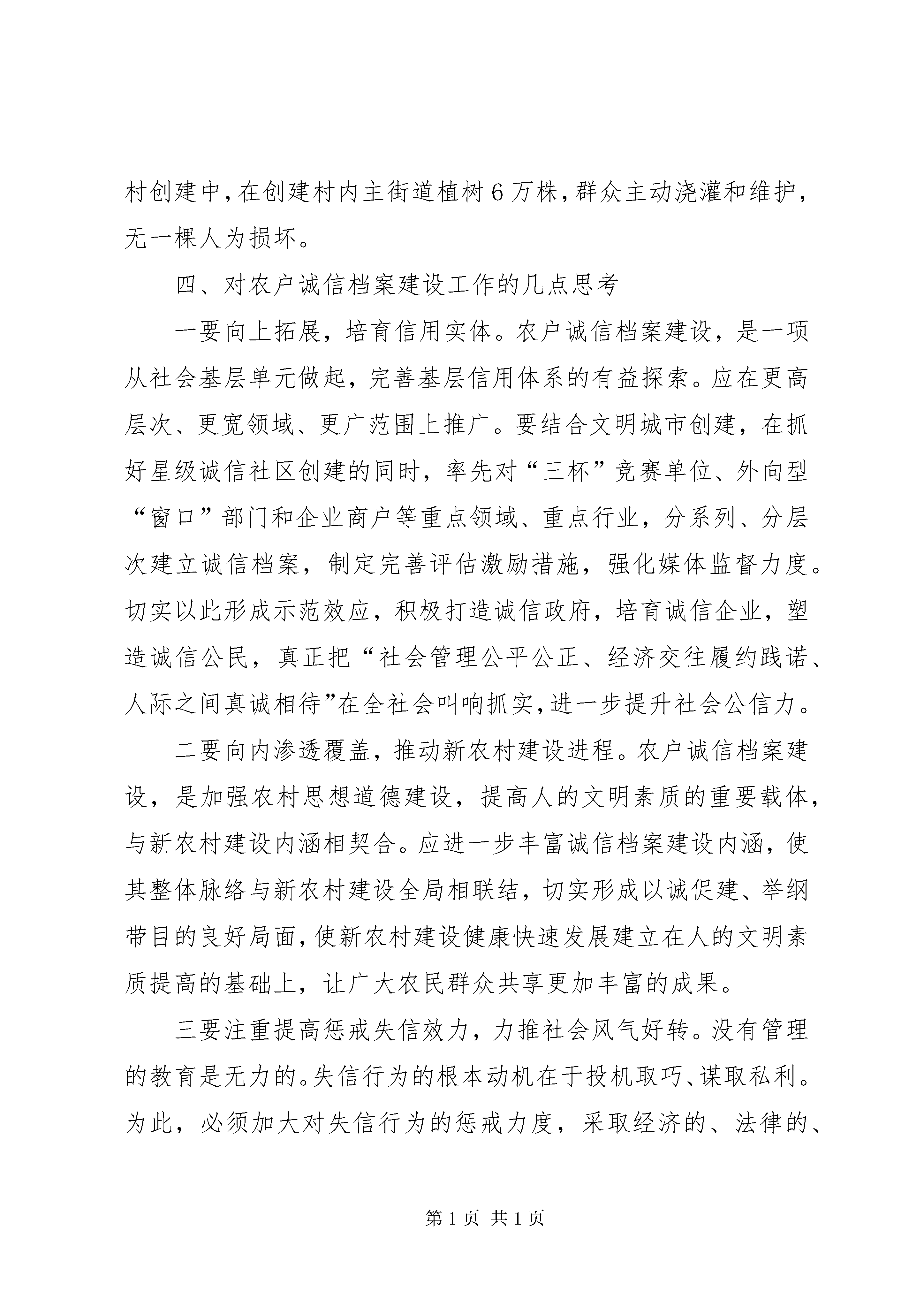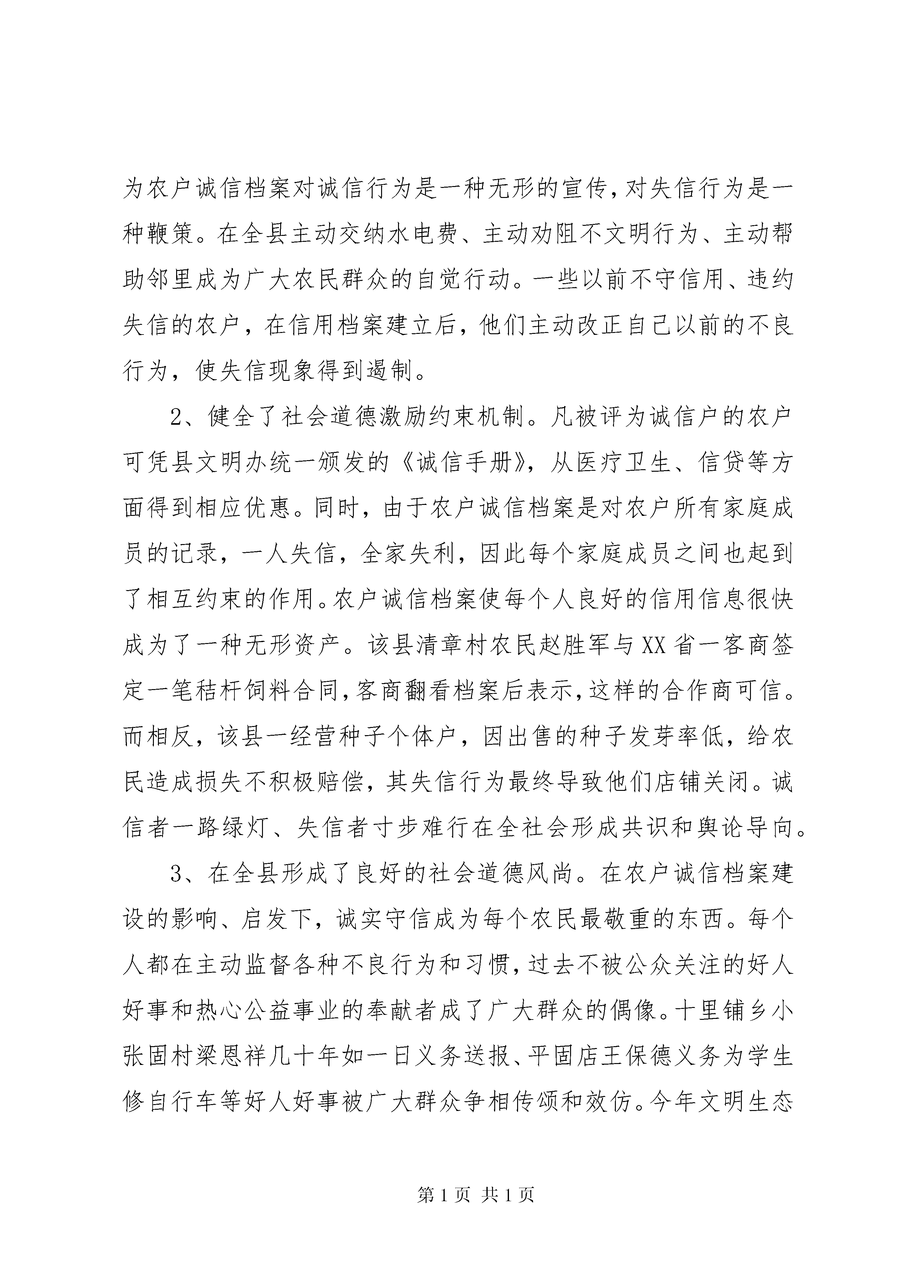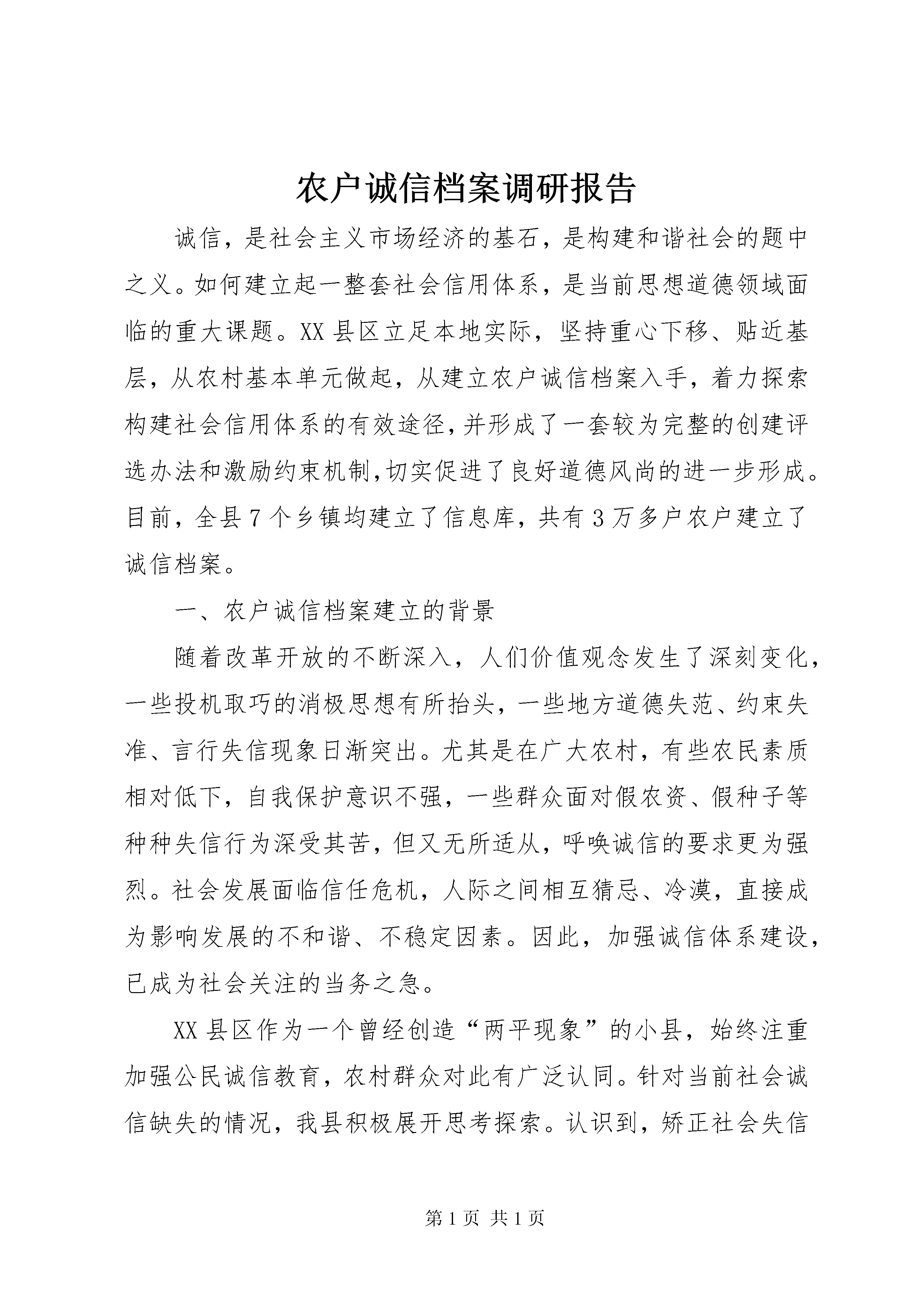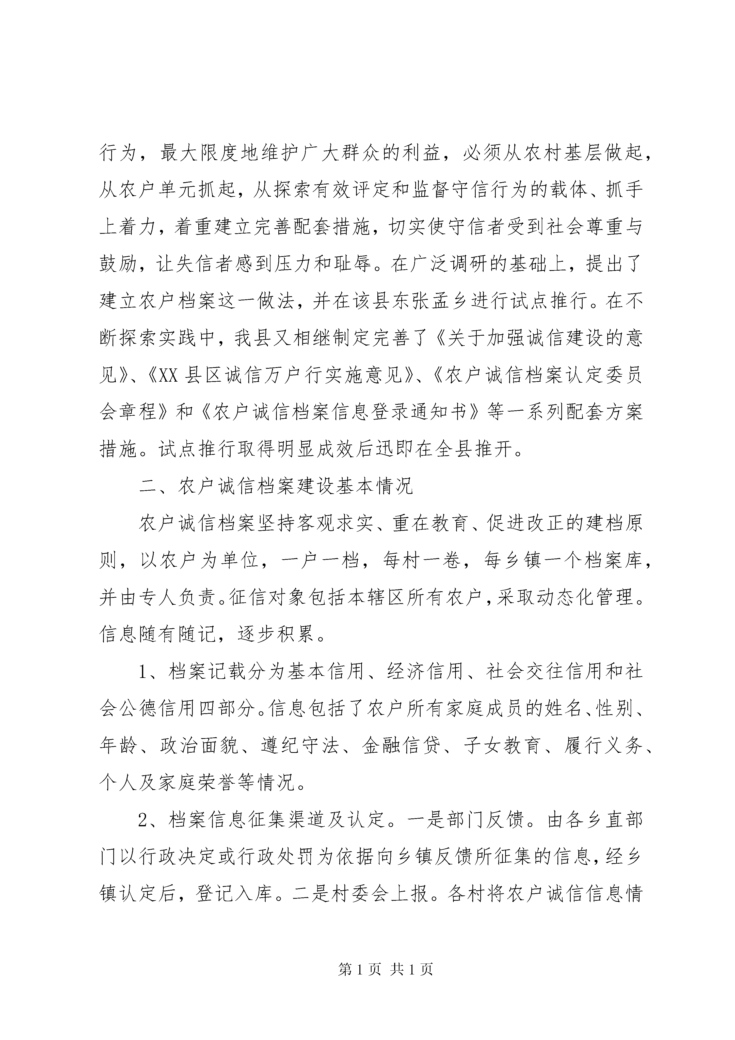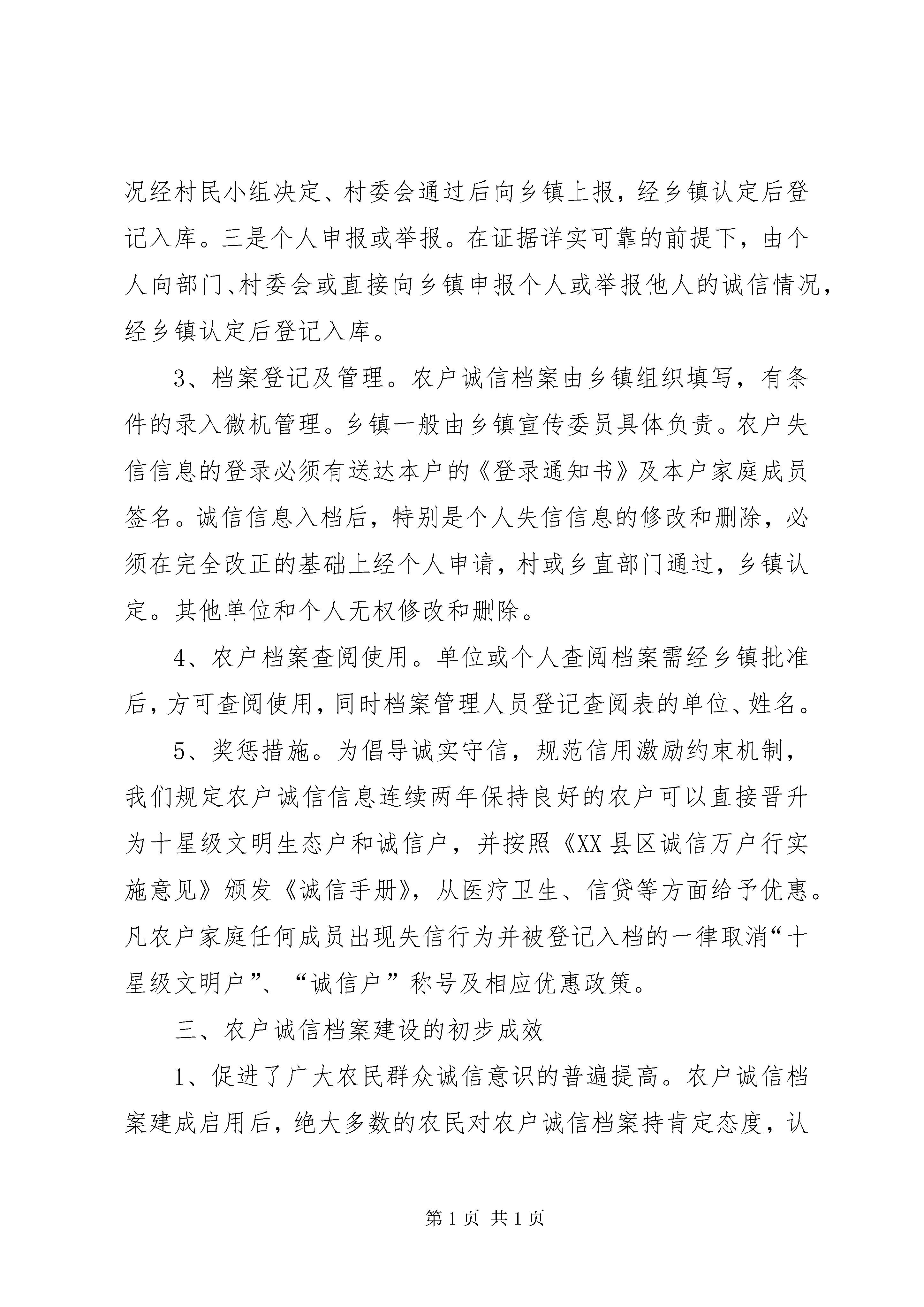 农户诚信档案调研报告诚信,是社会主义市场经济的基石,是构建和谐社会的题中之义。如何建立起一整套社会信用体系,是当前思想道德领域面临的重大课题。XX县区立足本地实际,坚持重心下移、贴近基层,从农村基本单元做起,从建立农户诚信档案入手,着力探索构建社会信用体系的有效途径,并形成了一套较为完整的创建评选办法和激励约束机制,切实促进了良好道德风尚的进一步形成。目前,全县7个乡镇均建立了信息库,共有3万多户农户建立了诚信档案。一、农户诚信档案建立的背景随着改革开放的不断深入,人们价值观念发生了深刻变化,一些投机取巧的消极思想有所抬头,一些地方道德失范、约束失准、言行失信现象日渐突出。尤其是在广大农村,有些农民素质相对低下,自我保护意识不强,一些群众面对假农资、假种子等种种失信行为深受其苦,但又无所适从,呼唤诚信的要求更为强烈。社会发展面临信任危机,人际之间相互猜忌、冷漠,直接成为影响发展的不和谐、不稳定因素。因此,加强诚信体系建设,已成为社会关注的当务之急。XX县区作为一个曾经创造“两平现象”的小县,始终注重加强公民诚信教育,农村群众对此有广泛认同。针对当前社会诚信缺失的情况,我县积极展开思考探索。认识到,矫正社会失信行为,最大限度地维护广大群众的利益,必须从农村基层做起,从农户单元抓起,从探索有效评定和监督守信行为的载体、抓手上着力,着重建立完善配套措施,切实使守信者受到社会尊重与鼓励,让失信者感到压力和耻辱。在广泛调研的基础上,提出了建立农户档案这一做法,并在该县东张孟乡进行试点推行。在不断探索实践中,我县又相继制定完善了《关于加强诚信建设的意见》、《XX县区诚信万户行实施意见》、《农户诚信档案认定委员会章程》和《农户诚信档案信息登录通知书》等一系列配套方案措施。试点推行取得明显成效后迅即在全县推开。二、农户诚信档案建设基本情况农户诚信档案坚持客观求实、重在教育、促进改正的建档原则,以农户为单位,一户一档,每村一卷,每乡镇一个档案库,并由专人负责。征信对象包括本辖区所有农户,采取动态化管理。信息随有随记,逐步积累。1、档案记载分为基本信用、经济信用、社会交往信用和社会公德信用四部分。信息包括了农户所有家庭成员的姓名、性别、年龄、政治面貌、遵纪守法、金融信贷、子女教育、履行义务、个人及家庭荣誉等情况。2、档案信息征集渠道及认定。一是部门反馈。由各乡直部门以行政决定或行政处罚为依据向乡镇反馈所征集的信息,经乡镇认定后,登记入库。二是村委会上报。各村将农户诚信信息情况经村民小组决定、村委会通过后向乡镇上报,经乡镇认定后登记入库。三是个人申报或举报。在证据详实可靠的前提下,由个人向部门、村委会或直接向乡镇申报个人或举报他人的诚信情况,经乡镇认定后登记入库。3、档案登记及管理。农户诚信档案由乡镇组织填写,有条件的录入微机管理。乡镇一般由乡镇宣传委员具体负责。农户失信信息的登录必须有送达本户的《登录通知书》及本户家庭成员签名。诚信信息入档后,特别是个人失信信息的修改和删除,必须在完全改正的基础上经个人申请,村或乡直部门通过,乡镇认定。其他单位和个人无权修改和删除。4、农户档案查阅使用。单位或个人查阅档案需经乡镇批准后,方可查阅使用,同时档案管理人员登记查阅表的单位、姓名。5、奖惩措施。为倡导诚实守信,规范信用激励约束机制,我们规定农户诚信信息连续两年保持良好的农户可以直接晋升为十星级文明生态户和诚信户,并按照《XX县区诚信万户行实施意见》颁发《诚信手册》,从医疗卫生、信贷等方面给予优惠。凡农户家庭任何成员出现失信行为并被登记入档的一律取消“十星级文明户”、“诚信户”称号及相应优惠政策。三、农户诚信档案建设的初步成效1、促进了广大农民群众诚信意识的普遍提高。农户诚信档案建成启用后,绝大多数的农民对农户诚信档案持肯定态度,认为农户诚信档案对诚信行为是一种无形的宣传,对失信行为是一种鞭策。在全县主动交纳水电费、主动劝阻不文明行为、主动帮助邻里成为广大农民群众的自觉行动。一些以前不守信用、违约失信的农户,在信用档案建立后,他们主动改正自己以前的不良行为,使失信现象得到遏制。2、健全了社会道德激励约束机制。凡被评为诚信户的农户可凭县文明办统一颁发的《诚信手册》,从医疗卫生、信贷等方面得到相应优惠。同时,由于农户诚信档案是对农户所有家庭成员的记录,一人失信,全家失利,因此每个家庭成员之间也起到了相互约束的作用。农户诚信档案使每个人良好的信用信息很快成为了一种无形资产。该县清章村农民赵胜军与XX省一客商签定一笔秸杆饲料合同,客商翻看档案后表示,这样的合作商可信。而相反,该县一经营种子个体户,因出售的种子发芽率低,给农民造成损失不积极赔偿,其失信行为最终导致他们店铺关闭。诚信者一路绿灯、失信者寸步难行在全社会形成共识和舆论导向。3、在
