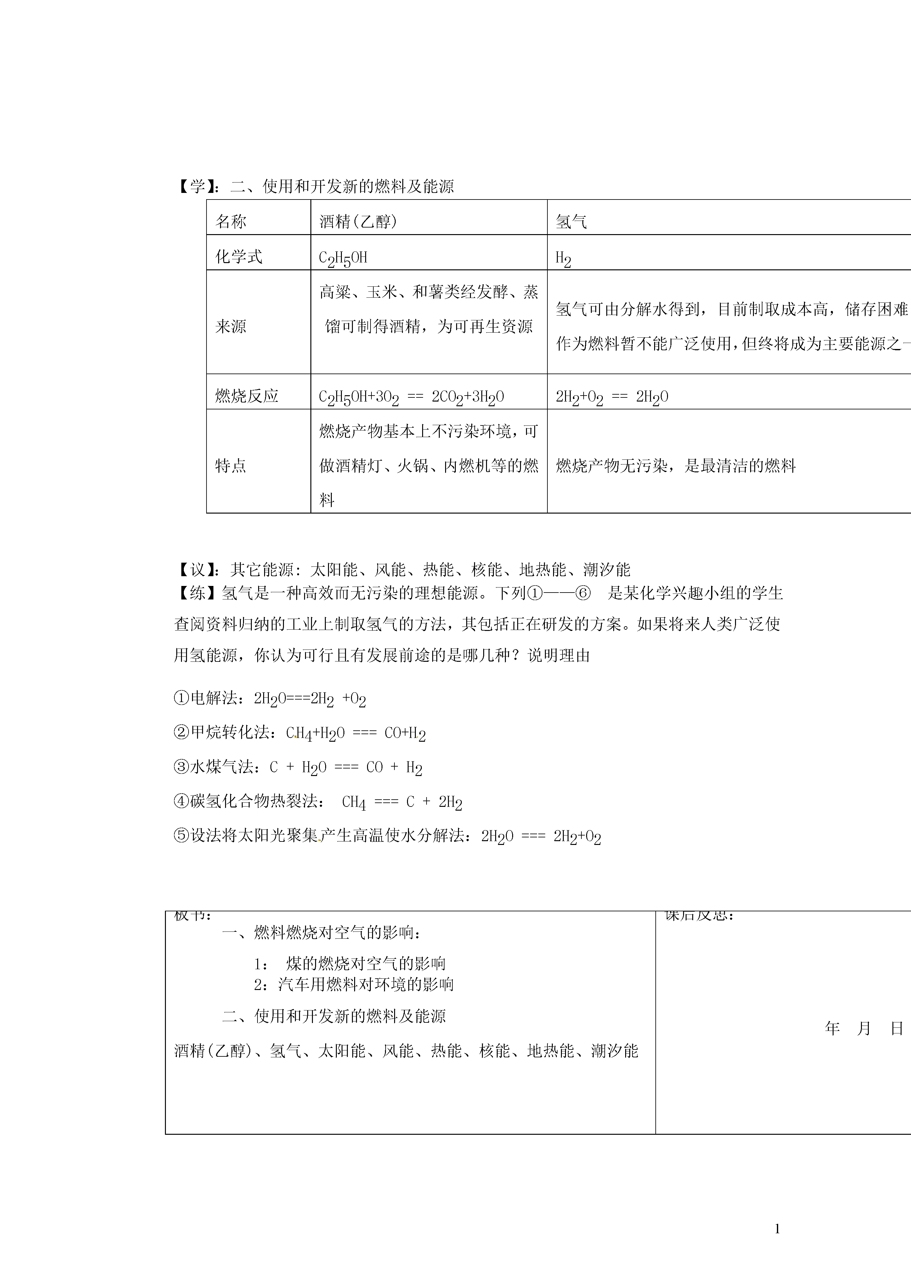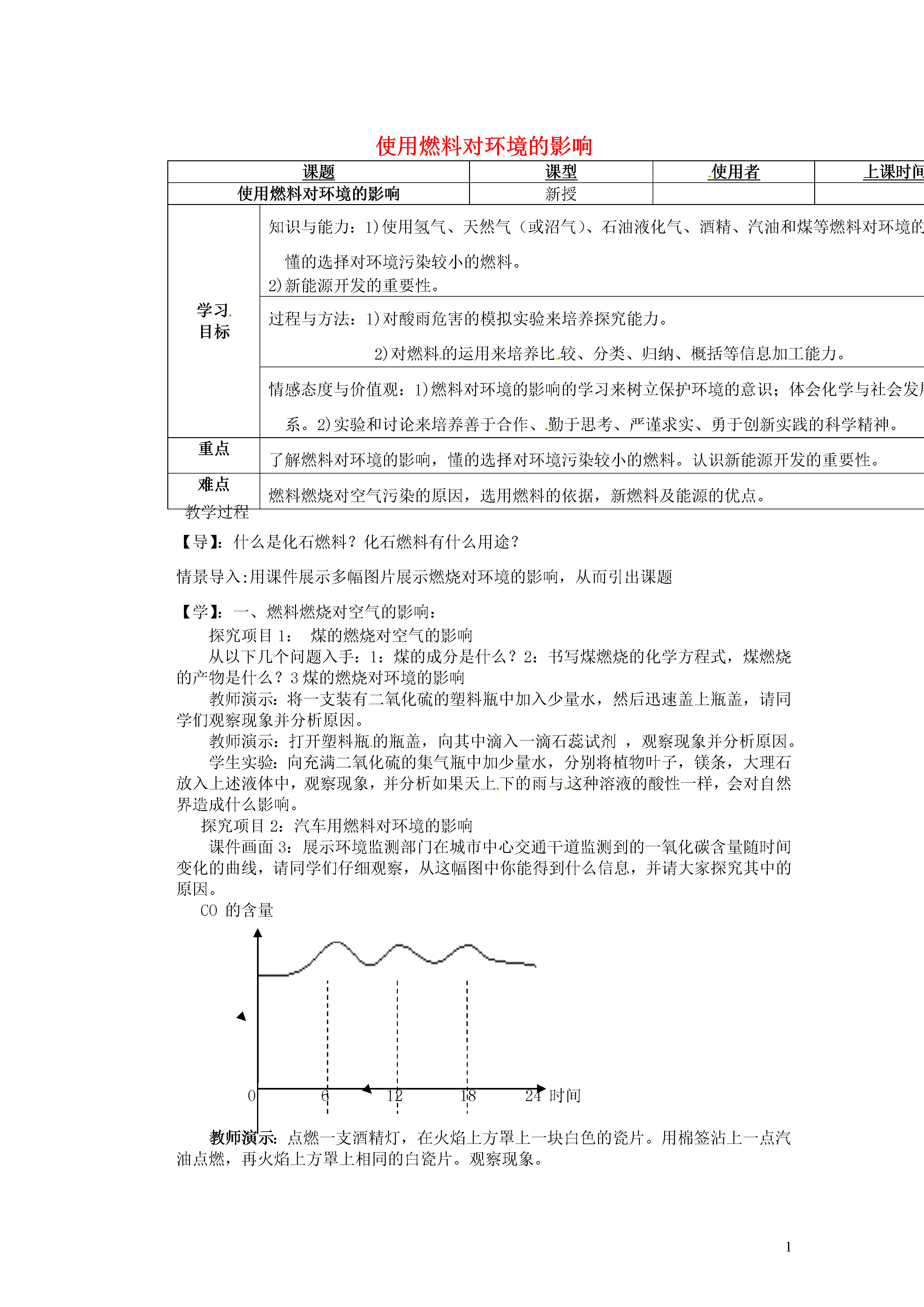 1使用燃料对环境的影响课题课型使用者上课时间使用燃料对环境的影响新授学习目标知识与能力:1)使用氢气、天然气(或沼气)、石油液化气、酒精、汽油和煤等燃料对环境的影响,懂的选择对环境污染较小的燃料。2)新能源开发的重要性。过程与方法:1)对酸雨危害的模拟实验来培养探究能力。2)对燃料的运用来培养比较、分类、归纳、概括等信息加工能力。情感态度与价值观:1)燃料对环境的影响的学习来树立保护环境的意识;体会化学与社会发展的关系。2)实验和讨论来培养善于合作、勤于思考、严谨求实、勇于创新实践的科学精神。重点了解燃料对环境的影响,懂的选择对环境污染较小的燃料。认识新能源开发的重要性。难点燃料燃烧对空气污染的原因,选用燃料的依据,新燃料及能源的优点。教学过程【导】:什么是化石燃料?化石燃料有什么用途?情景导入:用课件展示多幅图片展示燃烧对环境的影响,从而引出课题【学】:一、燃料燃烧对空气的影响:探究项目1:煤的燃烧对空气的影响从以下几个问题入手:1:煤的成分是什么?2:书写煤燃烧的化学方程式,煤燃烧的产物是什么?3煤的燃烧对环境的影响教师演示:将一支装有二氧化硫的塑料瓶中加入少量水,然后迅速盖上瓶盖,请同学们观察现象并分析原因。教师演示:打开塑料瓶的瓶盖,向其中滴入一滴石蕊试剂,观察现象并分析原因。学生实验:向充满二氧化硫的集气瓶中加少量水,分别将植物叶子,镁条,大理石放入上述液体中,观察现象,并分析如果天上下的雨与这种溶液的酸性一样,会对自然界造成什么影响。探究项目2:汽车用燃料对环境的影响课件画面3:展示环境监测部门在城市中心交通干道监测到的一氧化碳含量随时间变化的曲线,请同学们仔细观察,从这幅图中你能得到什么信息,并请大家探究其中的原因。CO的含量06121824时间教师演示:点燃一支酒精灯,在火焰上方罩上一块白色的瓷片。用棉签沾上一点汽油点燃,再火焰上方罩上相同的白瓷片。观察现象。【学】:二、使用和开发新的燃料及能源名称酒精(乙醇)氢气化学式C2H5OHH2来源高粱、玉米、和薯类经发酵、蒸馏可制得酒精,为可再生资源氢气可由分解水得到,目前制取成本高,储存困难,作为燃料暂不能广泛使用,但终将成为主要能源之一燃烧反应C2H5OH+3O2==2CO2+3H2O2H2+O2==2H2O特点燃烧产物基本上不污染环境,可做酒精灯、火锅、内燃机等的燃料燃烧产物无污染,是最清洁的燃料【议】:其它能源:太阳能、风能、热能、核能、地热能、潮汐能【练】氢气是一种高效而无污染的理想能源。下列①——⑥是某化学兴趣小组的学生查阅资料归纳的工业上制取氢气的方法,其包括正在研发的方案。如果将来人类广泛使用氢能源,你认为可行且有发展前途的是哪几种?说明理由①电解法:2H2O===2H2+O2②甲烷转化法:CH4+H2O===CO+H2③水煤气法:C+H2O===CO+H2④碳氢化合物热裂法:CH4===C+2H2⑤设法将太阳光聚集产生高温使水分解法:2H2O===2H2+O2板书:燃料燃烧对空气的影响:1:煤的燃烧对空气的影响2:汽车用燃料对环境的影响二、使用和开发新的燃料及能源酒精(乙醇)、氢气、太阳能、风能、热能、核能、地热能、潮汐能课后反思:年月日