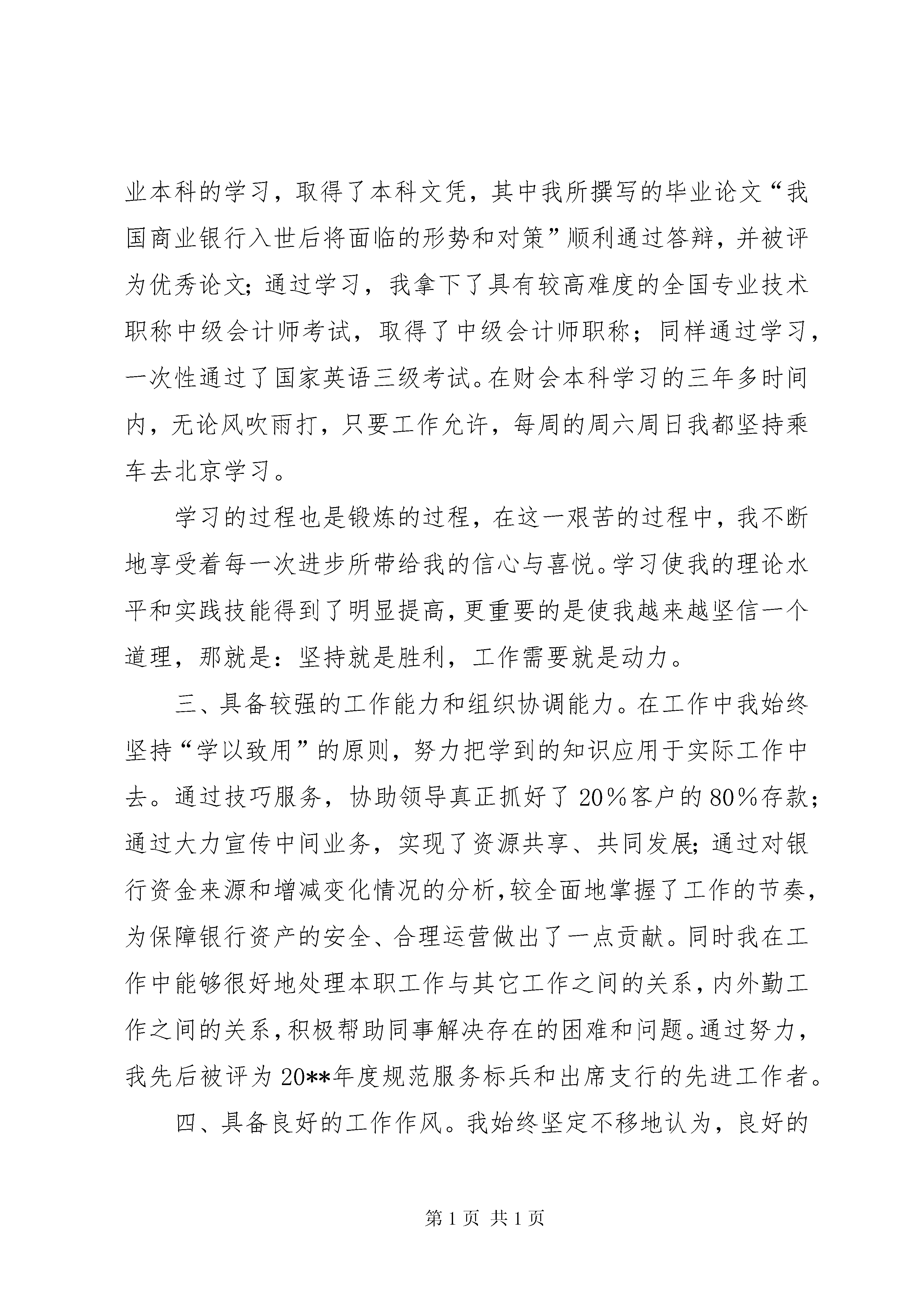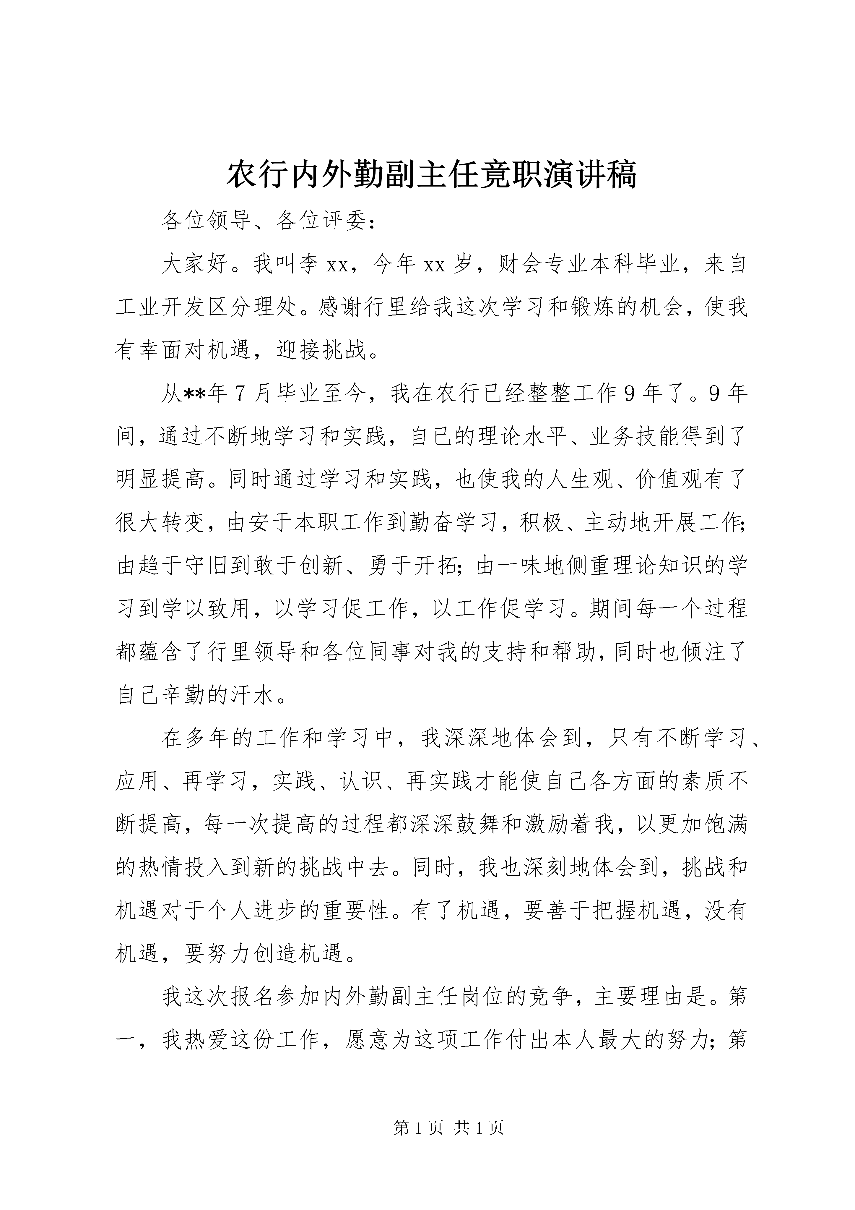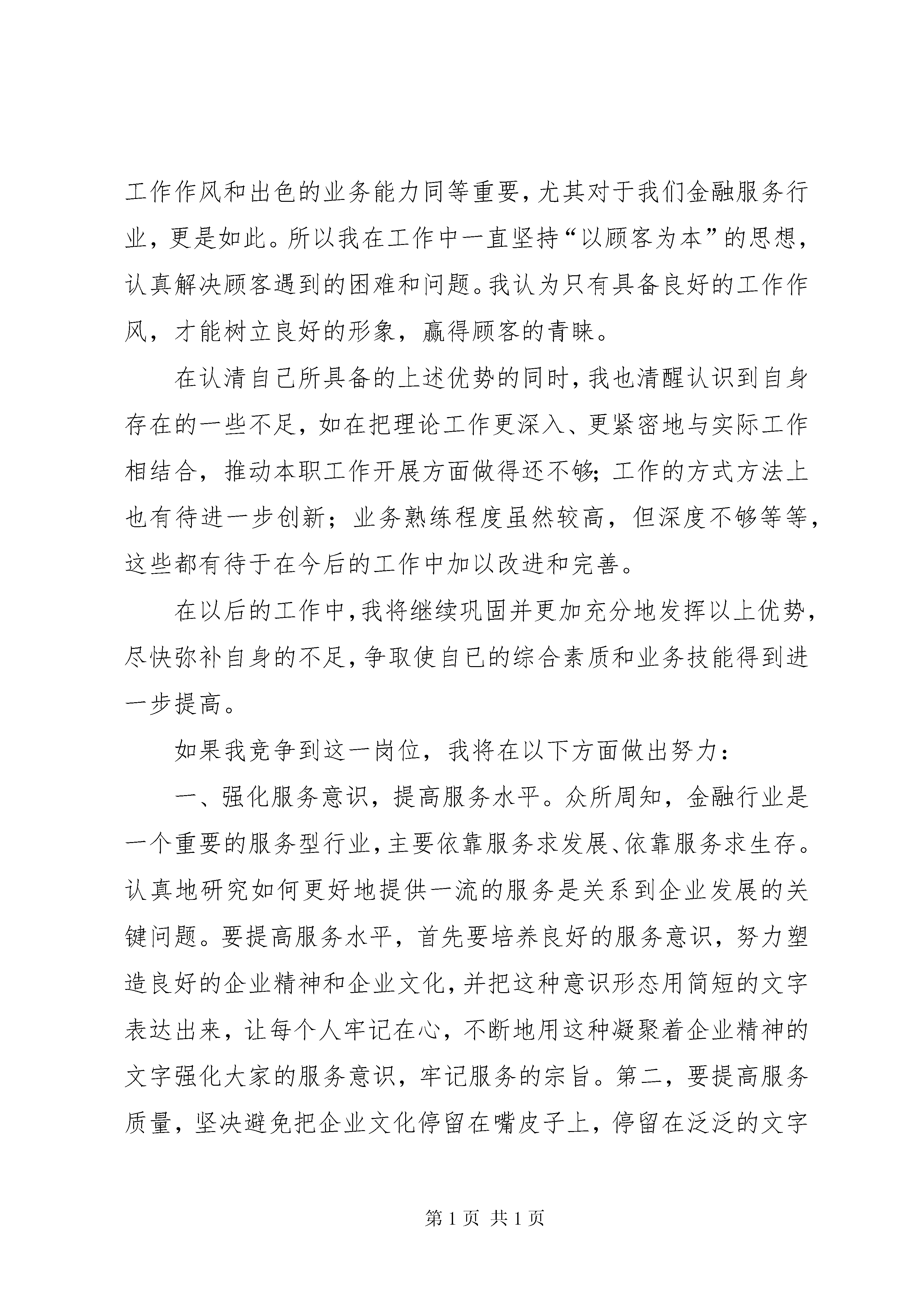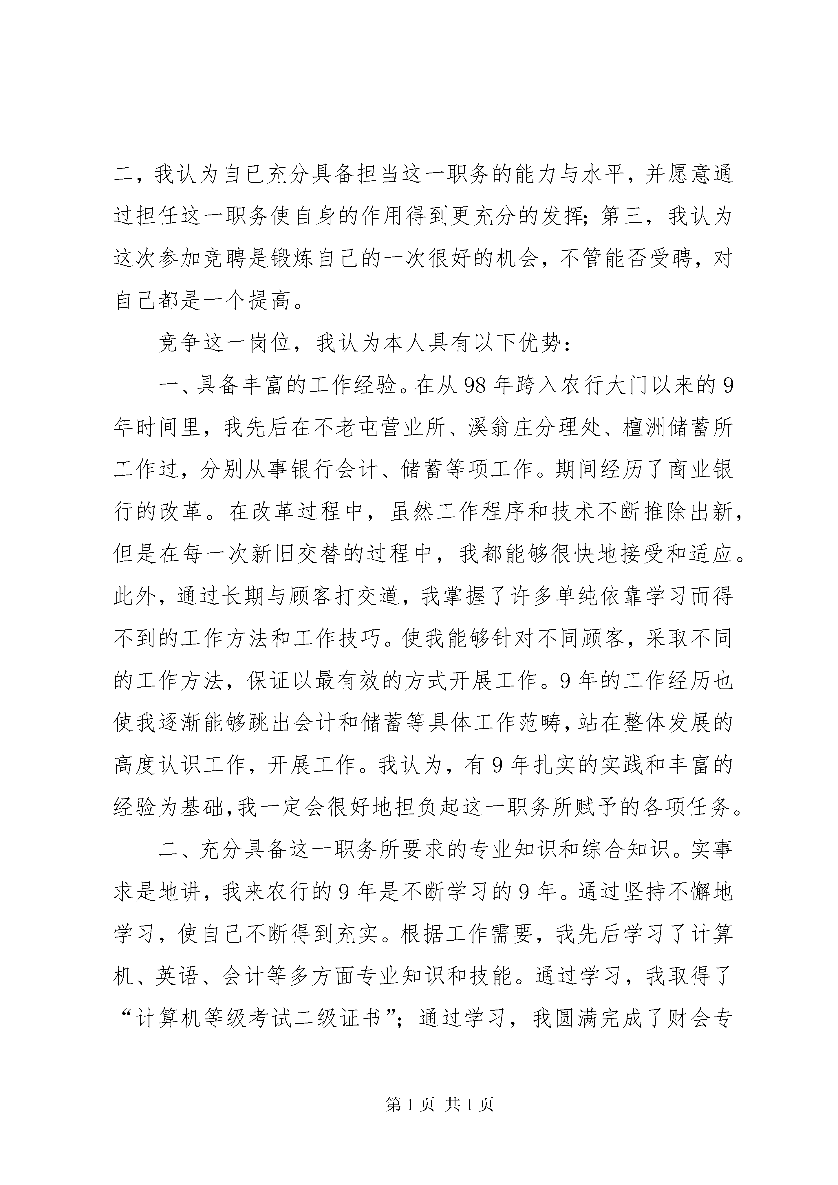 农行内外勤副主任竟职演讲稿各位领导、各位评委:大家好。我叫李xx,今年xx岁,财会专业本科毕业,来自工业开发区分理处。感谢行里给我这次学习和锻炼的机会,使我有幸面对机遇,迎接挑战。从**年7月毕业至今,我在农行已经整整工作9年了。9年间,通过不断地学习和实践,自已的理论水平、业务技能得到了明显提高。同时通过学习和实践,也使我的人生观、价值观有了很大转变,由安于本职工作到勤奋学习,积极、主动地开展工作;由趋于守旧到敢于创新、勇于开拓;由一味地侧重理论知识的学习到学以致用,以学习促工作,以工作促学习。期间每一个过程都蕴含了行里领导和各位同事对我的支持和帮助,同时也倾注了自己辛勤的汗水。在多年的工作和学习中,我深深地体会到,只有不断学习、应用、再学习,实践、认识、再实践才能使自己各方面的素质不断提高,每一次提高的过程都深深鼓舞和激励着我,以更加饱满的热情投入到新的挑战中去。同时,我也深刻地体会到,挑战和机遇对于个人进步的重要性。有了机遇,要善于把握机遇,没有机遇,要努力创造机遇。我这次报名参加内外勤副主任岗位的竞争,主要理由是。第一,我热爱这份工作,愿意为这项工作付出本人最大的努力;第二,我认为自已充分具备担当这一职务的能力与水平,并愿意通过担任这一职务使自身的作用得到更充分的发挥;第三,我认为这次参加竞聘是锻炼自己的一次很好的机会,不管能否受聘,对自己都是一个提高。竞争这一岗位,我认为本人具有以下优势:一、具备丰富的工作经验。在从98年跨入农行大门以来的9年时间里,我先后在不老屯营业所、溪翁庄分理处、檀洲储蓄所工作过,分别从事银行会计、储蓄等项工作。期间经历了商业银行的改革。在改革过程中,虽然工作程序和技术不断推除出新,但是在每一次新旧交替的过程中,我都能够很快地接受和适应。此外,通过长期与顾客打交道,我掌握了许多单纯依靠学习而得不到的工作方法和工作技巧。使我能够针对不同顾客,采取不同的工作方法,保证以最有效的方式开展工作。9年的工作经历也使我逐渐能够跳出会计和储蓄等具体工作范畴,站在整体发展的高度认识工作,开展工作。我认为,有9年扎实的实践和丰富的经验为基础,我一定会很好地担负起这一职务所赋予的各项任务。二、充分具备这一职务所要求的专业知识和综合知识。实事求是地讲,我来农行的9年是不断学习的9年。通过坚持不懈地学习,使自己不断得到充实。根据工作需要,我先后学习了计算机、英语、会计等多方面专业知识和技能。通过学习,我取得了“计算机等级考试二级证书”;通过学习,我圆满完成了财会专业本科的学习,取得了本科文凭,其中我所撰写的毕业论文“我国商业银行入世后将面临的形势和对策”顺利通过答辩,并被评为优秀论文;通过学习,我拿下了具有较高难度的全国专业技术职称中级会计师考试,取得了中级会计师职称;同样通过学习,一次性通过了国家英语三级考试。在财会本科学习的三年多时间内,无论风吹雨打,只要工作允许,每周的周六周日我都坚持乘车去北京学习。学习的过程也是锻炼的过程,在这一艰苦的过程中,我不断地享受着每一次进步所带给我的信心与喜悦。学习使我的理论水平和实践技能得到了明显提高,更重要的是使我越来越坚信一个道理,那就是:坚持就是胜利,工作需要就是动力。三、具备较强的工作能力和组织协调能力。在工作中我始终坚持“学以致用”的原则,努力把学到的知识应用于实际工作中去。通过技巧服务,协助领导真正抓好了20%客户的80%存款;通过大力宣传中间业务,实现了资源共享、共同发展;通过对银行资金来源和增减变化情况的分析,较全面地掌握了工作的节奏,为保障银行资产的安全、合理运营做出了一点贡献。同时我在工作中能够很好地处理本职工作与其它工作之间的关系,内外勤工作之间的关系,积极帮助同事解决存在的困难和问题。通过努力,我先后被评为20**年度规范服务标兵和出席支行的先进工作者。四、具备良好的工作作风。我始终坚定不移地认为,良好的工作作风和出色的业务能力同等重要,尤其对于我们金融服务行业,更是如此。所以我在工作中一直坚持“以顾客为本”的思想,认真解决顾客遇到的困难和问题。我认为只有具备良好的工作作风,才能树立良好的形象,赢得顾客的青睐。在认清自己所具备的上述优势的同时,我也清醒认识到自身存在的一些不足,如在把理论工作更深入、更紧密地与实际工作相结合,推动本职工作开展方面做得还不够;工作的方式方法上也有待进一步创新;业务熟练程度虽然较高,但深度不够等等,这些都有待于在今后的工作中加以改进和完善。在以后的工作中,我将继续巩固并更加充分地发挥以上优势,尽快弥补自身的不足,争取使自已的综合素质和业务技能得到进一步提高。如果我竞争到这一岗位,我将在以下方面做出努力:一、强化服务意识,提高服务水平。众所周知,金融行业是一个重要的服务型行业,主要依靠服务求发展、依靠服务