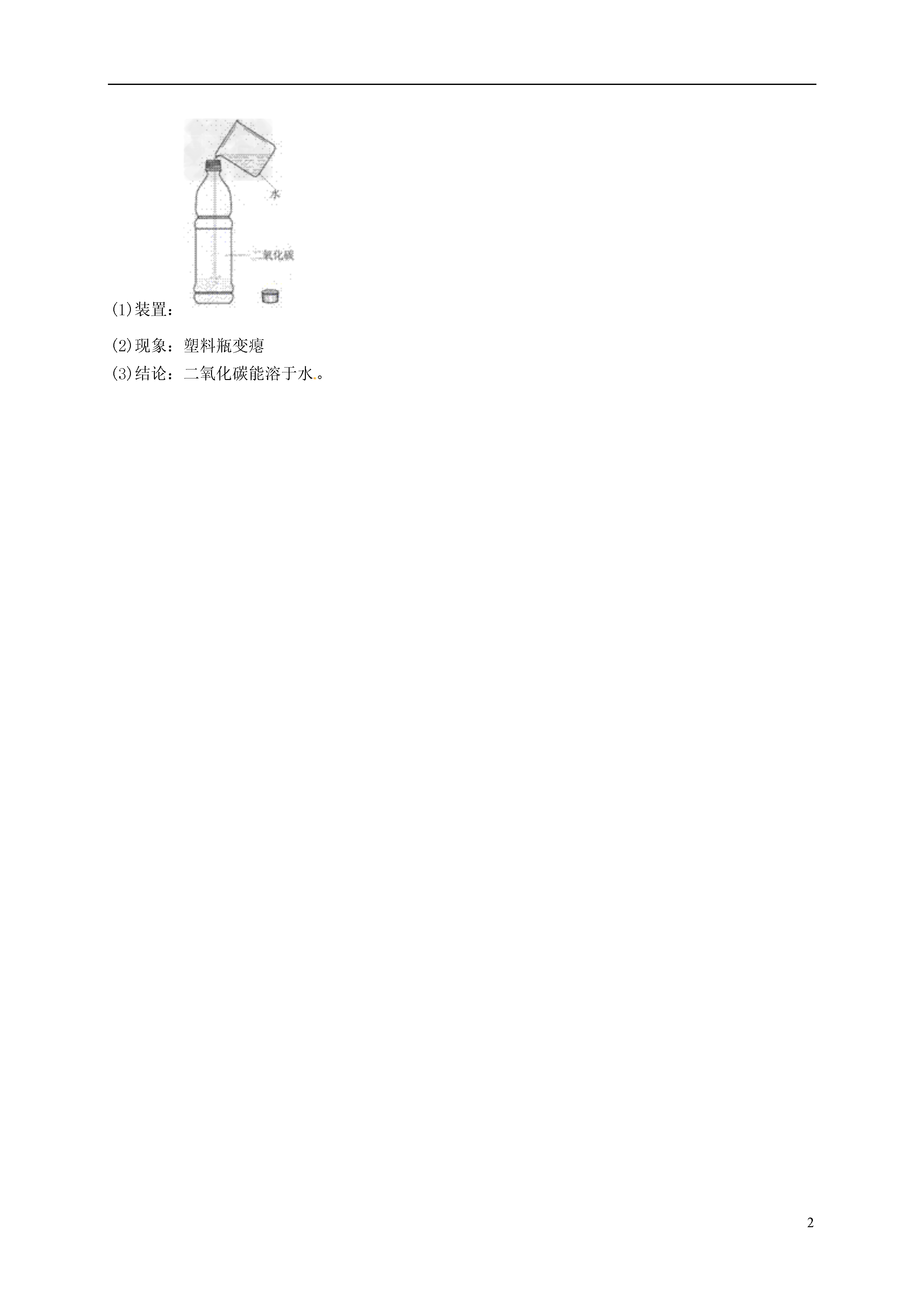 2二氧化碳的性质实验探究二氧化碳的三个性质实验:1.证明二氧化碳的密度比空气的大;二氧化碳既不燃烧也不支持燃烧2.二氧化碳溶于水显酸性3.二氧化碳能溶于水二氧化碳性质探究实验:1.证明二氧化碳的密度比空气的大;二氧化碳既不燃烧也不支持燃烧(1)装置:(2)现象:蜡烛由低到高依次熄灭结论:证明二氧化碳的密度比空气的大;二氧化碳既不燃烧也不支持燃烧2.二氧化碳溶于水显酸性(1)装置:(2)现象:1和4实验中的白花变红,2和3白花不变色(3)结论:二氧化碳不能使紫色石蕊试液变红,二氧化碳的水溶液能使紫色石蕊试液变红。(或二氧化碳溶于水显酸性)3.二氧化碳能溶于水(1)装置:(2)现象:塑料瓶变瘪(3)结论:二氧化碳能溶于水。