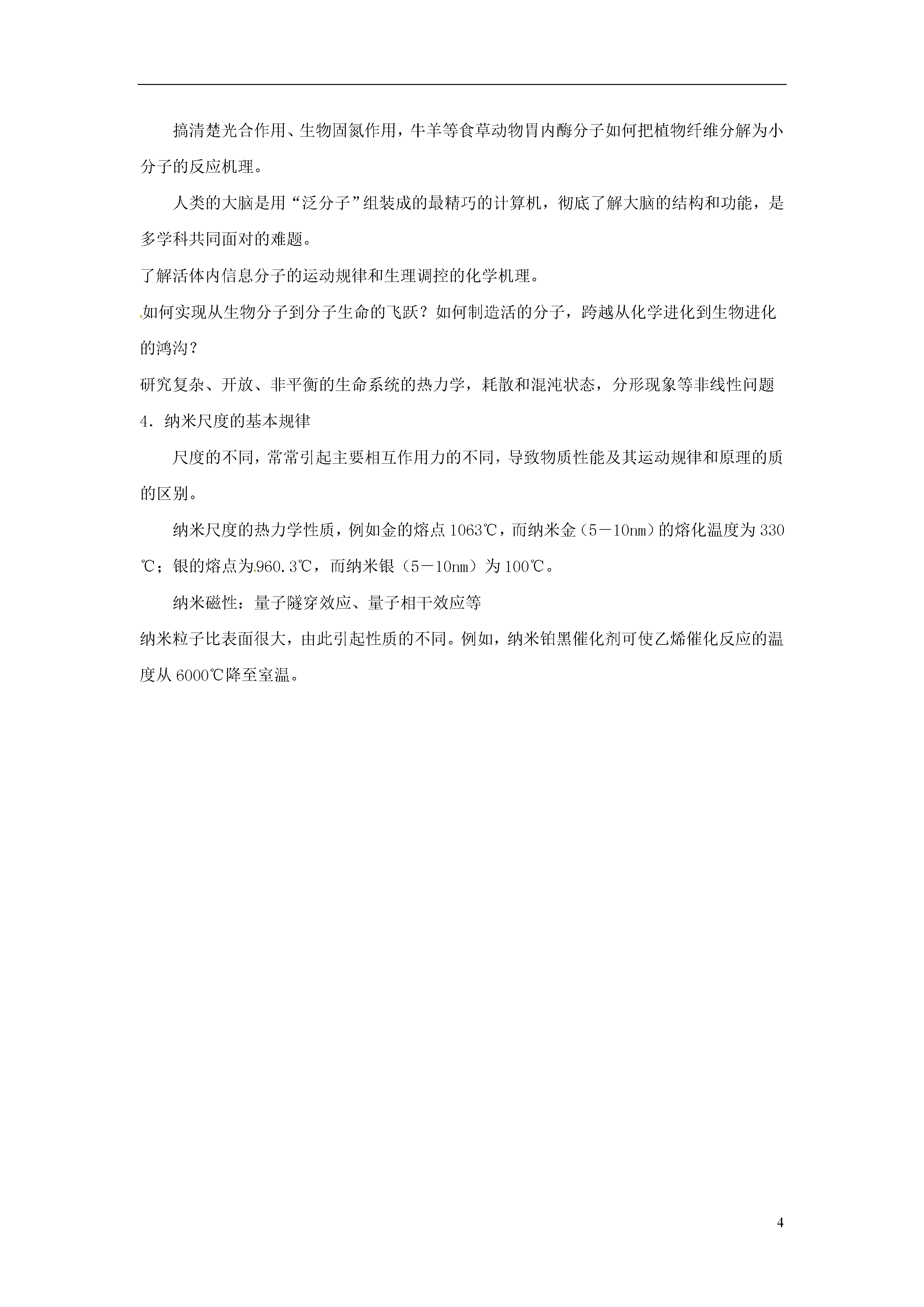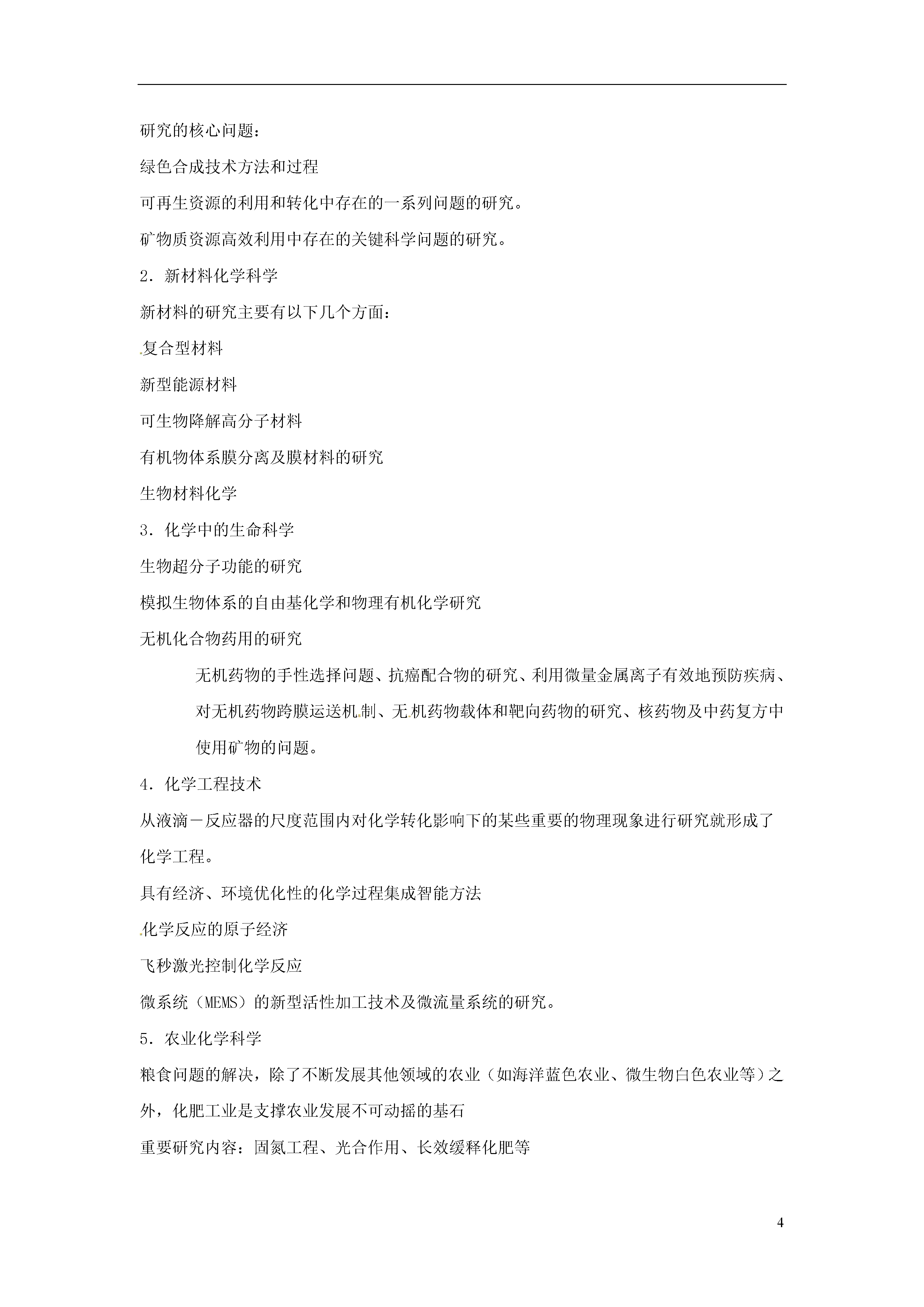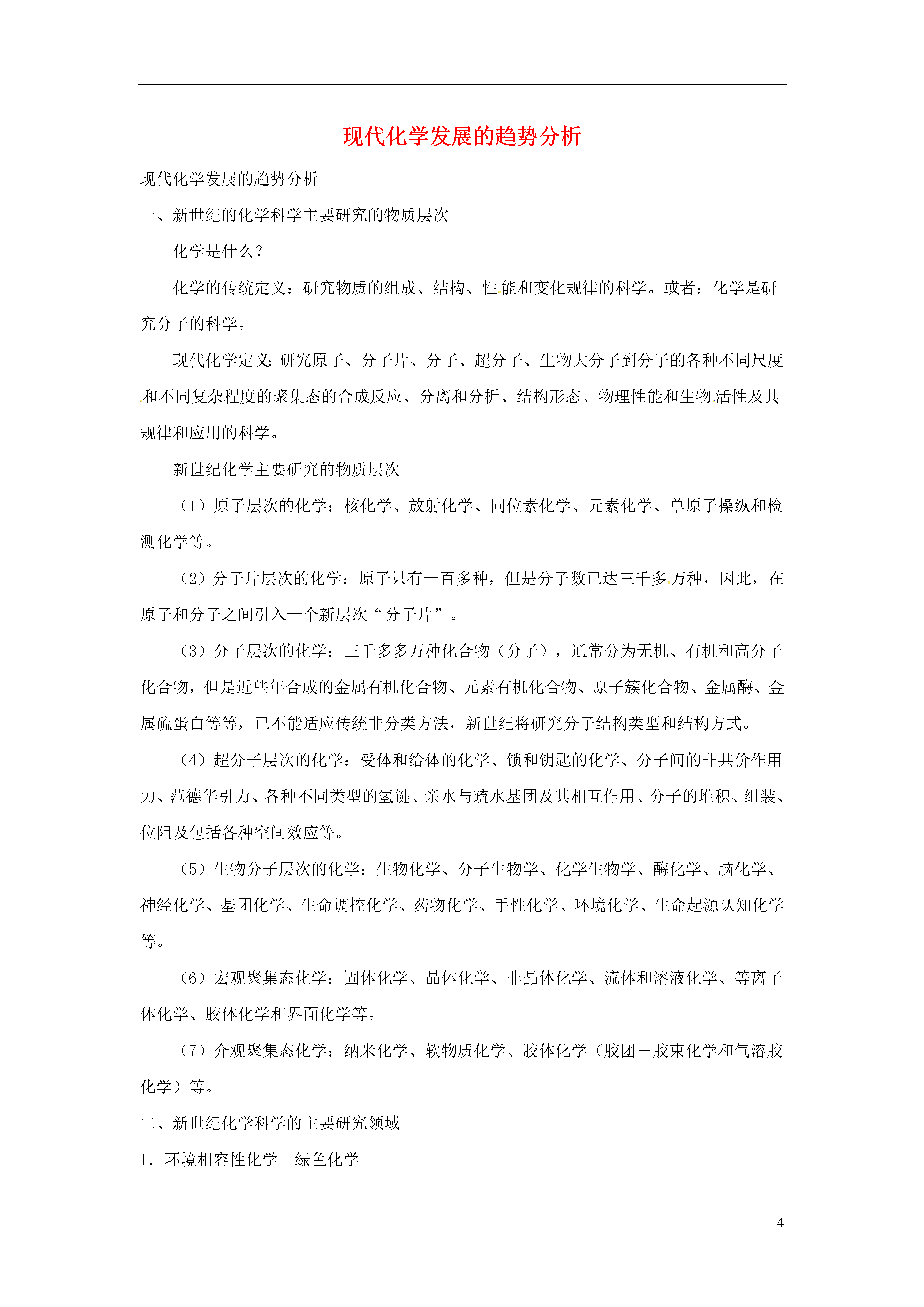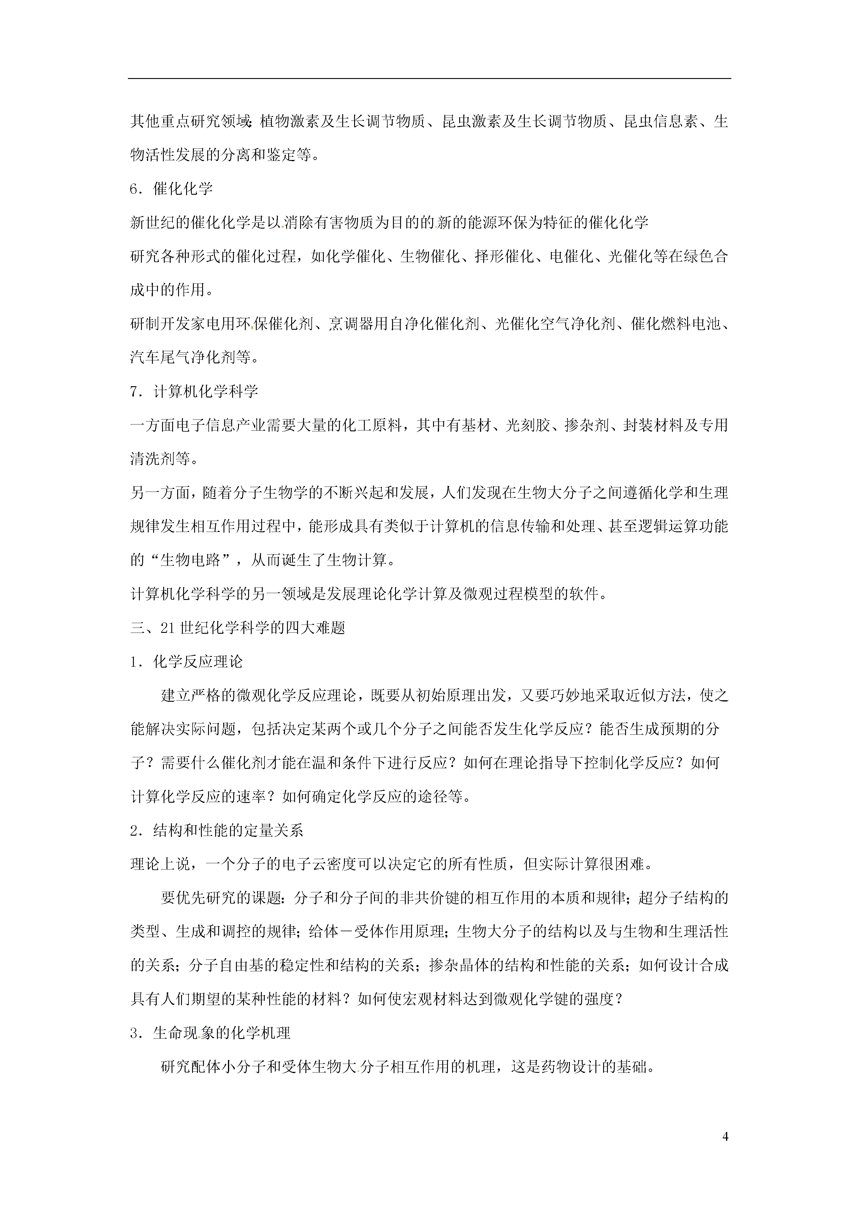4现代化学发展的趋势分析现代化学发展的趋势分析一、新世纪的化学科学主要研究的物质层次化学是什么?化学的传统定义:研究物质的组成、结构、性能和变化规律的科学。或者:化学是研究分子的科学。现代化学定义:研究原子、分子片、分子、超分子、生物大分子到分子的各种不同尺度和不同复杂程度的聚集态的合成反应、分离和分析、结构形态、物理性能和生物活性及其规律和应用的科学。新世纪化学主要研究的物质层次(1)原子层次的化学:核化学、放射化学、同位素化学、元素化学、单原子操纵和检测化学等。(2)分子片层次的化学:原子只有一百多种,但是分子数已达三千多万种,因此,在原子和分子之间引入一个新层次“分子片”。(3)分子层次的化学:三千多多万种化合物(分子),通常分为无机、有机和高分子化合物,但是近些年合成的金属有机化合物、元素有机化合物、原子簇化合物、金属酶、金属硫蛋白等等,已不能适应传统非分类方法,新世纪将研究分子结构类型和结构方式。(4)超分子层次的化学:受体和给体的化学、锁和钥匙的化学、分子间的非共价作用力、范德华引力、各种不同类型的氢键、亲水与疏水基团及其相互作用、分子的堆积、组装、位阻及包括各种空间效应等。(5)生物分子层次的化学:生物化学、分子生物学、化学生物学、酶化学、脑化学、神经化学、基团化学、生命调控化学、药物化学、手性化学、环境化学、生命起源认知化学等。(6)宏观聚集态化学:固体化学、晶体化学、非晶体化学、流体和溶液化学、等离子体化学、胶体化学和界面化学等。(7)介观聚集态化学:纳米化学、软物质化学、胶体化学(胶团-胶束化学和气溶胶化学)等。二、新世纪化学科学的主要研究领域1.环境相容性化学-绿色化学研究的核心问题:绿色合成技术方法和过程可再生资源的利用和转化中存在的一系列问题的研究。矿物质资源高效利用中存在的关键科学问题的研究。2.新材料化学科学新材料的研究主要有以下几个方面:复合型材料新型能源材料可生物降解高分子材料有机物体系膜分离及膜材料的研究生物材料化学3.化学中的生命科学生物超分子功能的研究模拟生物体系的自由基化学和物理有机化学研究无机化合物药用的研究无机药物的手性选择问题、抗癌配合物的研究、利用微量金属离子有效地预防疾病、对无机药物跨膜运送机制、无机药物载体和靶向药物的研究、核药物及中药复方中使用矿物的问题。4.化学工程技术从液滴-反应器的尺度范围内对化学转化影响下的某些重要的物理现象进行研究就形成了化学工程。具有经济、环境优化性的化学过程集成智能方法化学反应的原子经济飞秒激光控制化学反应微系统(MEMS)的新型活性加工技术及微流量系统的研究。5.农业化学科学粮食问题的解决,除了不断发展其他领域的农业(如海洋蓝色农业、微生物白色农业等)之外,化肥工业是支撑农业发展不可动摇的基石重要研究内容:固氮工程、光合作用、长效缓释化肥等其他重点研究领域:植物激素及生长调节物质、昆虫激素及生长调节物质、昆虫信息素、生物活性发展的分离和鉴定等。6.催化化学新世纪的催化化学是以消除有害物质为目的的新的能源环保为特征的催化化学研究各种形式的催化过程,如化学催化、生物催化、择形催化、电催化、光催化等在绿色合成中的作用。研制开发家电用环保催化剂、烹调器用自净化催化剂、光催化空气净化剂、催化燃料电池、汽车尾气净化剂等。7.计算机化学科学一方面电子信息产业需要大量的化工原料,其中有基材、光刻胶、掺杂剂、封装材料及专用清洗剂等。另一方面,随着分子生物学的不断兴起和发展,人们发现在生物大分子之间遵循化学和生理规律发生相互作用过程中,能形成具有类似于计算机的信息传输和处理、甚至逻辑运算功能的“生物电路”,从而诞生了生物计算。计算机化学科学的另一领域是发展理论化学计算及微观过程模型的软件。三、21世纪化学科学的四大难题1.化学反应理论建立严格的微观化学反应理论,既要从初始原理出发,又要巧妙地采取近似方法,使之能解决实际问题,包括决定某两个或几个分子之间能否发生化学反应?能否生成预期的分子?需要什么催化剂才能在温和条件下进行反应?如何在理论指导下控制化学反应?如何计算化学反应的速率?如何确定化学反应的途径等。2.结构和性能的定量关系理论上说,一个分子的电子云密度可以决定它的所有性质,但实际计算很困难。要优先研究的课题:分子和分子间的非共价键的相互作用的本质和规律;超分子结构的类型、生成和调控的规律;给体-受体作用原理;生物大分子的结构以及与生物和生理活性的关系;分子自由基的稳定性和结构的关系;掺杂晶体的结构和性能的关系;如何设计合成具有人们期望的某种性能的材料?如何使宏观材料达到微观化学键的强度?3.生命现象的化学机理研究配体小分子和