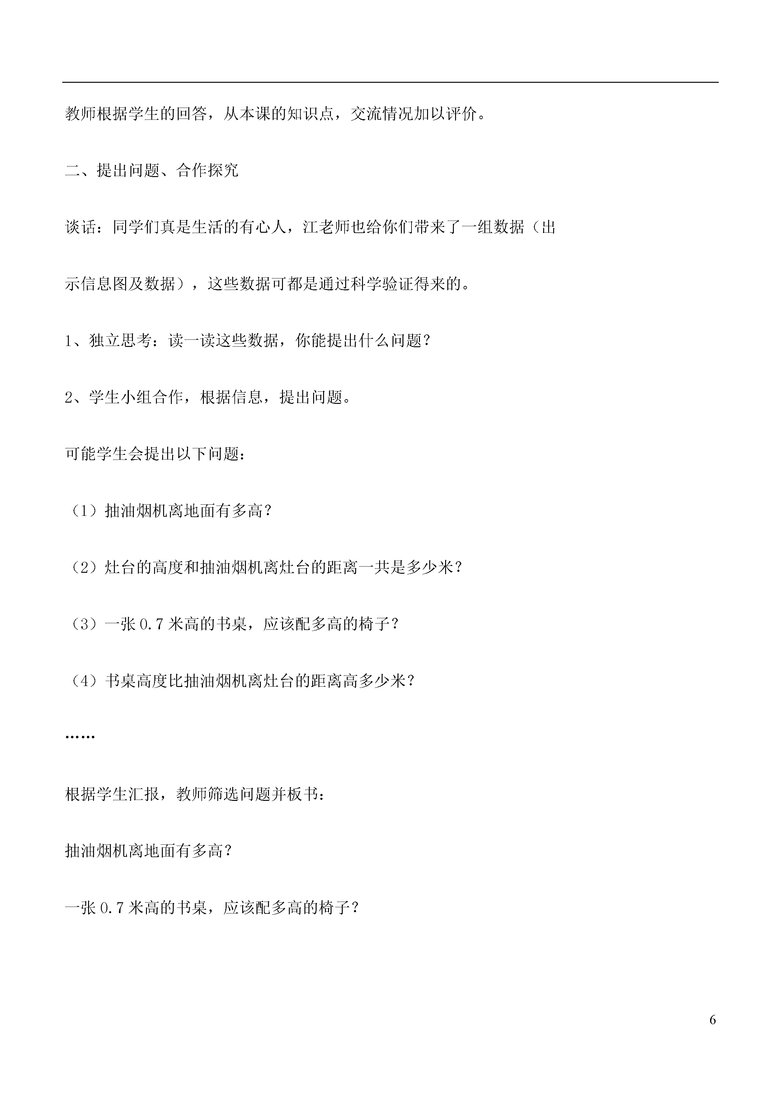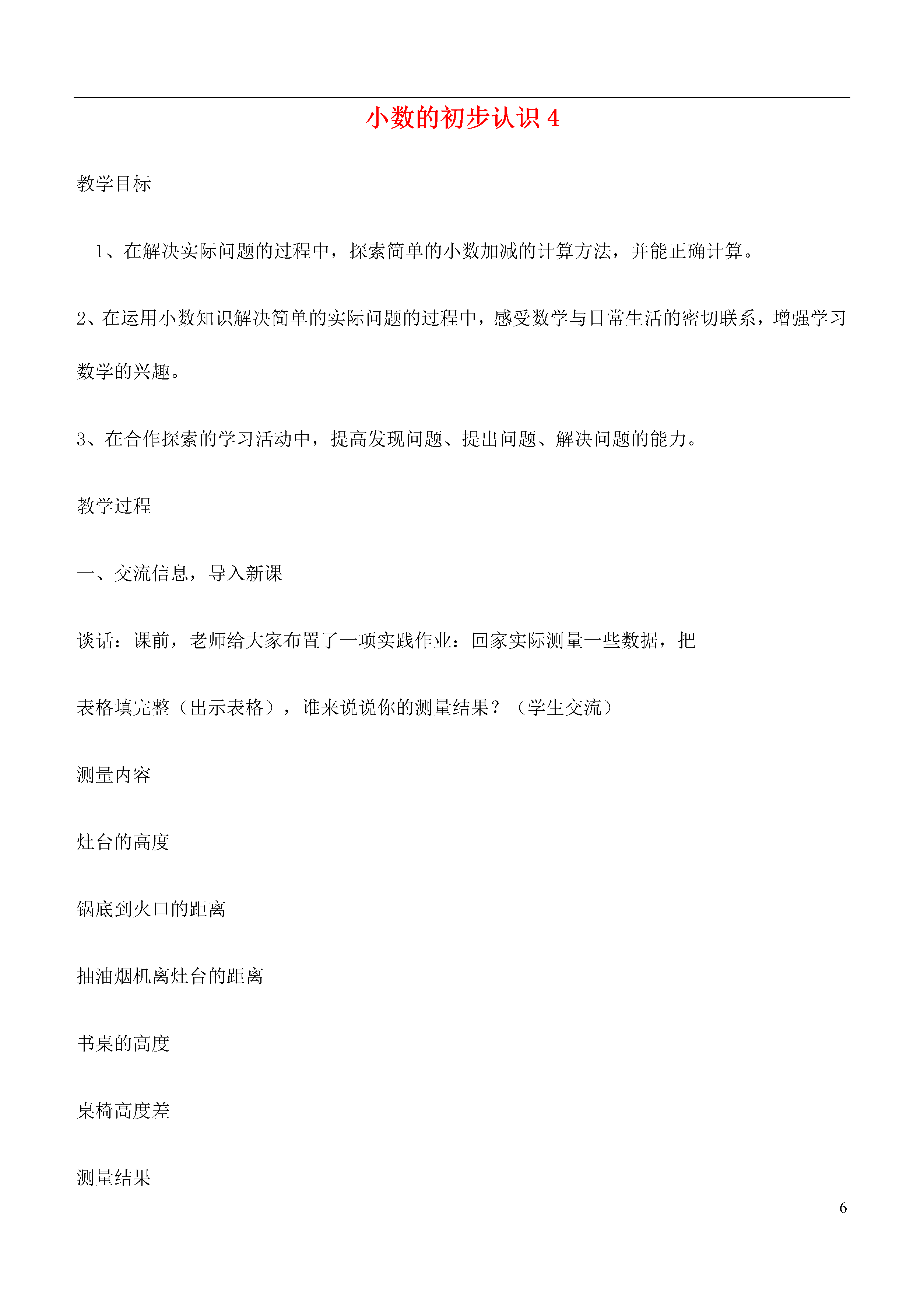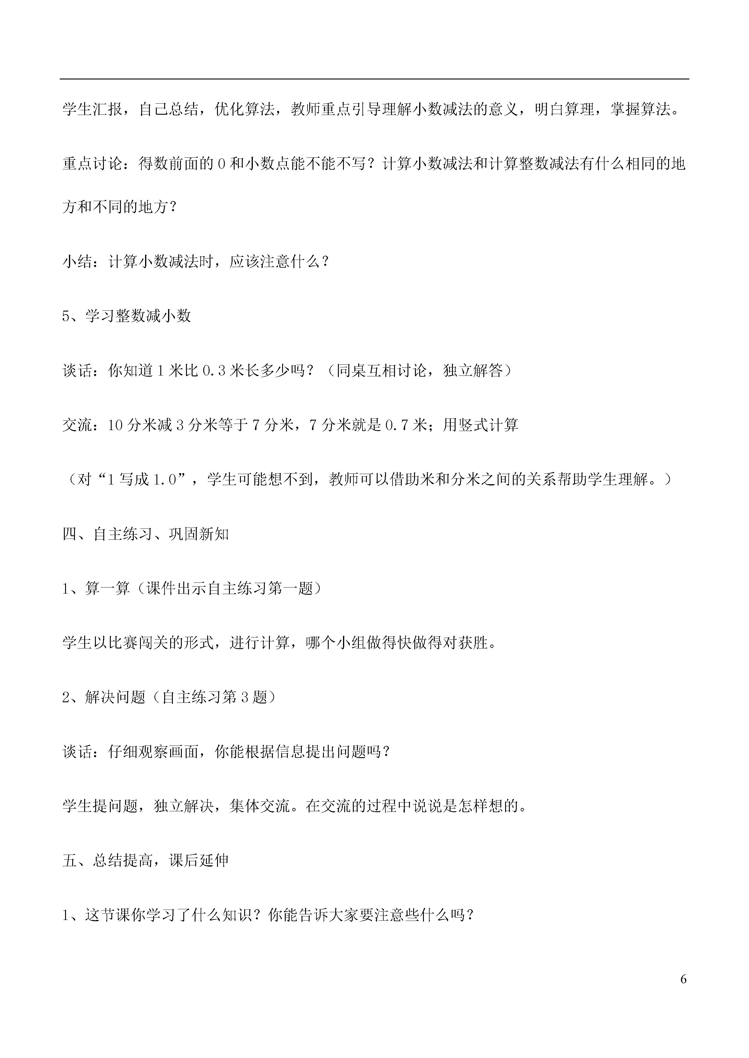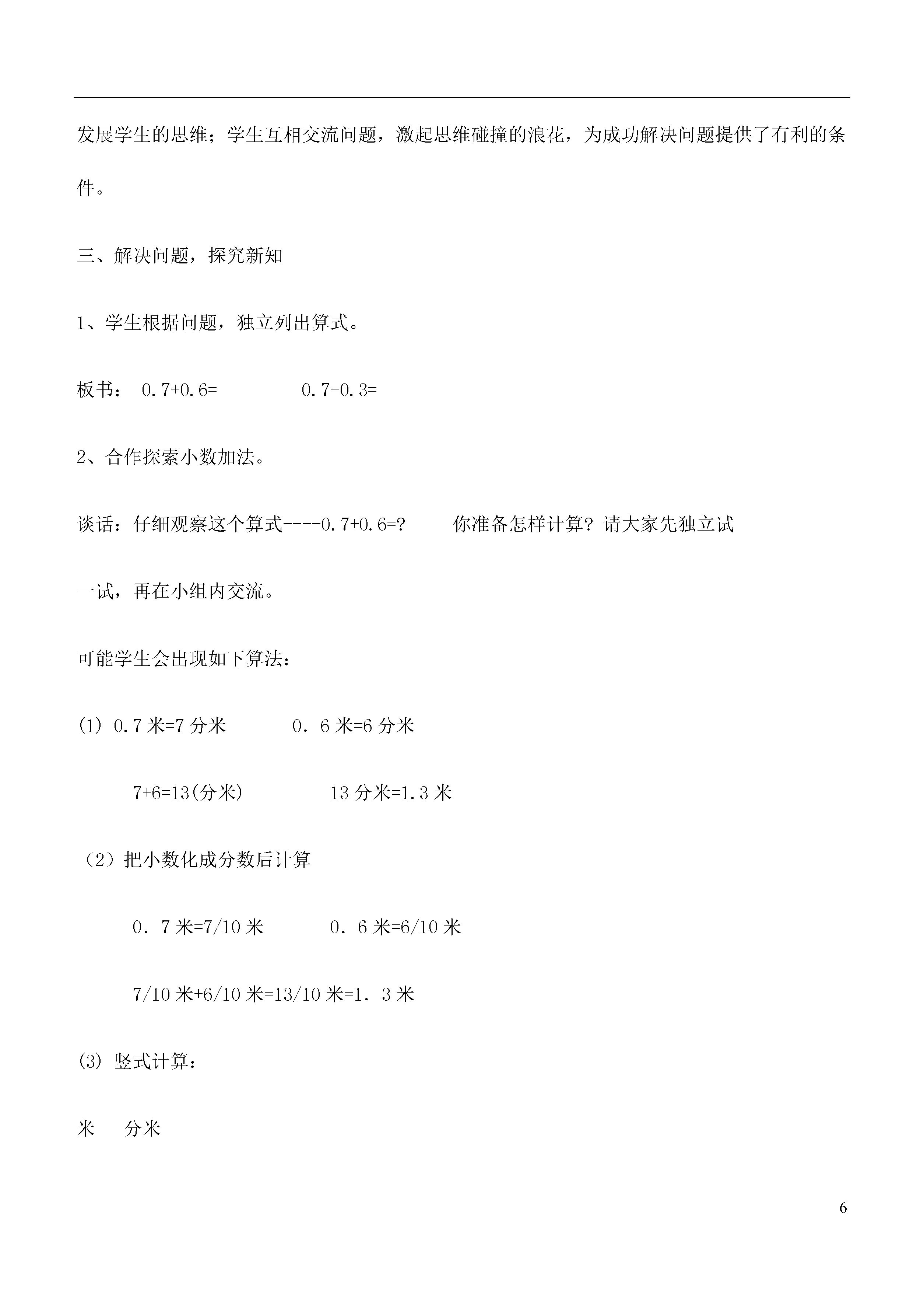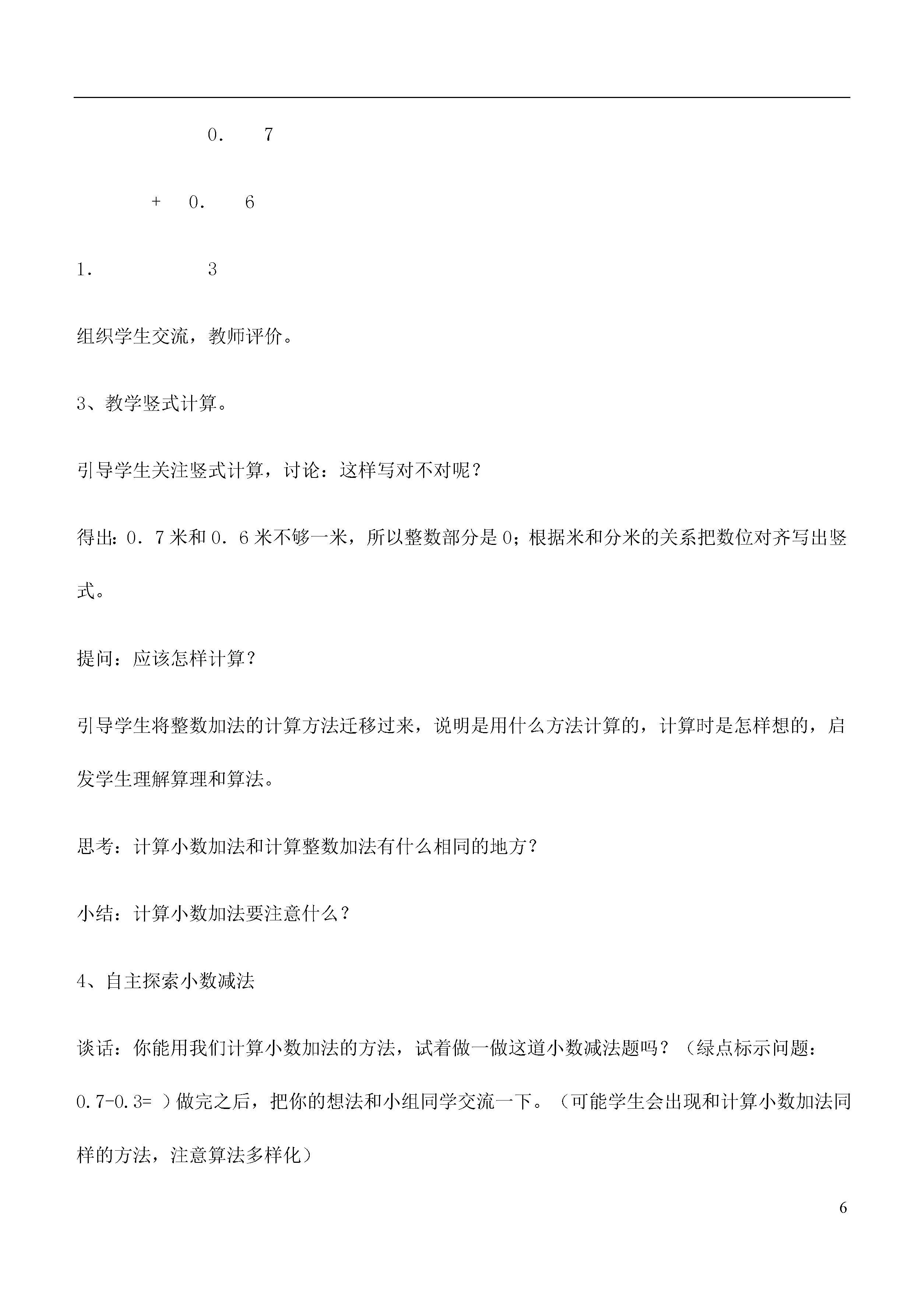 6小数的初步认识4教学目标1、在解决实际问题的过程中,探索简单的小数加减的计算方法,并能正确计算。2、在运用小数知识解决简单的实际问题的过程中,感受数学与日常生活的密切联系,增强学习数学的兴趣。3、在合作探索的学习活动中,提高发现问题、提出问题、解决问题的能力。教学过程一、交流信息,导入新课谈话:课前,老师给大家布置了一项实践作业:回家实际测量一些数据,把表格填完整(出示表格),谁来说说你的测量结果?(学生交流)测量内容灶台的高度锅底到火口的距离抽油烟机离灶台的距离书桌的高度桌椅高度差测量结果教师根据学生的回答,从本课的知识点,交流情况加以评价。二、提出问题、合作探究谈话:同学们真是生活的有心人,江老师也给你们带来了一组数据(出示信息图及数据),这些数据可都是通过科学验证得来的。1、独立思考:读一读这些数据,你能提出什么问题?2、学生小组合作,根据信息,提出问题。可能学生会提出以下问题:(1)抽油烟机离地面有多高?(2)灶台的高度和抽油烟机离灶台的距离一共是多少米?(3)一张0.7米高的书桌,应该配多高的椅子?(4)书桌高度比抽油烟机离灶台的距离高多少米?……根据学生汇报,教师筛选问题并板书:抽油烟机离地面有多高?一张0.7米高的书桌,应该配多高的椅子?发展学生的思维;学生互相交流问题,激起思维碰撞的浪花,为成功解决问题提供了有利的条件。三、解决问题,探究新知1、学生根据问题,独立列出算式。板书:0.7+0.6=0.7-0.3=2、合作探索小数加法。谈话:仔细观察这个算式----0.7+0.6=?你准备怎样计算?请大家先独立试一试,再在小组内交流。可能学生会出现如下算法:(1)0.7米=7分米0.6米=6分米7+6=13(分米)13分米=1.3米(2)把小数化成分数后计算0.7米=7/10米0.6米=6/10米7/10米+6/10米=13/10米=1.3米(3)竖式计算:米分米0.7+0.61.3组织学生交流,教师评价。3、教学竖式计算。引导学生关注竖式计算,讨论:这样写对不对呢?得出:0.7米和0.6米不够一米,所以整数部分是0;根据米和分米的关系把数位对齐写出竖式。提问:应该怎样计算?引导学生将整数加法的计算方法迁移过来,说明是用什么方法计算的,计算时是怎样想的,启发学生理解算理和算法。思考:计算小数加法和计算整数加法有什么相同的地方?小结:计算小数加法要注意什么?4、自主探索小数减法谈话:你能用我们计算小数加法的方法,试着做一做这道小数减法题吗?(绿点标示问题:0.7-0.3=)做完之后,把你的想法和小组同学交流一下。(可能学生会出现和计算小数加法同样的方法,注意算法多样化)学生汇报,自己总结,优化算法,教师重点引导理解小数减法的意义,明白算理,掌握算法。重点讨论:得数前面的0和小数点能不能不写?计算小数减法和计算整数减法有什么相同的地方和不同的地方?小结:计算小数减法时,应该注意什么?5、学习整数减小数谈话:你知道1米比0.3米长多少吗?(同桌互相讨论,独立解答)交流:10分米减3分米等于7分米,7分米就是0.7米;用竖式计算(对“1写成1.0”,学生可能想不到,教师可以借助米和分米之间的关系帮助学生理解。)四、自主练习、巩固新知1、算一算(课件出示自主练习第一题)学生以比赛闯关的形式,进行计算,哪个小组做得快做得对获胜。2、解决问题(自主练习第3题)谈话:仔细观察画面,你能根据信息提出问题吗?学生提问题,独立解决,集体交流。在交流的过程中说说是怎样想的。五、总结提高,课后延伸1、这节课你学习了什么知识?你能告诉大家要注意些什么吗?2、星期天,开展争当“小管家”活动,帮助爸爸妈妈到市场买菜或到超市买东西,并记录、计算家庭支出情况,下周向老师和同学汇报。[课后反思]