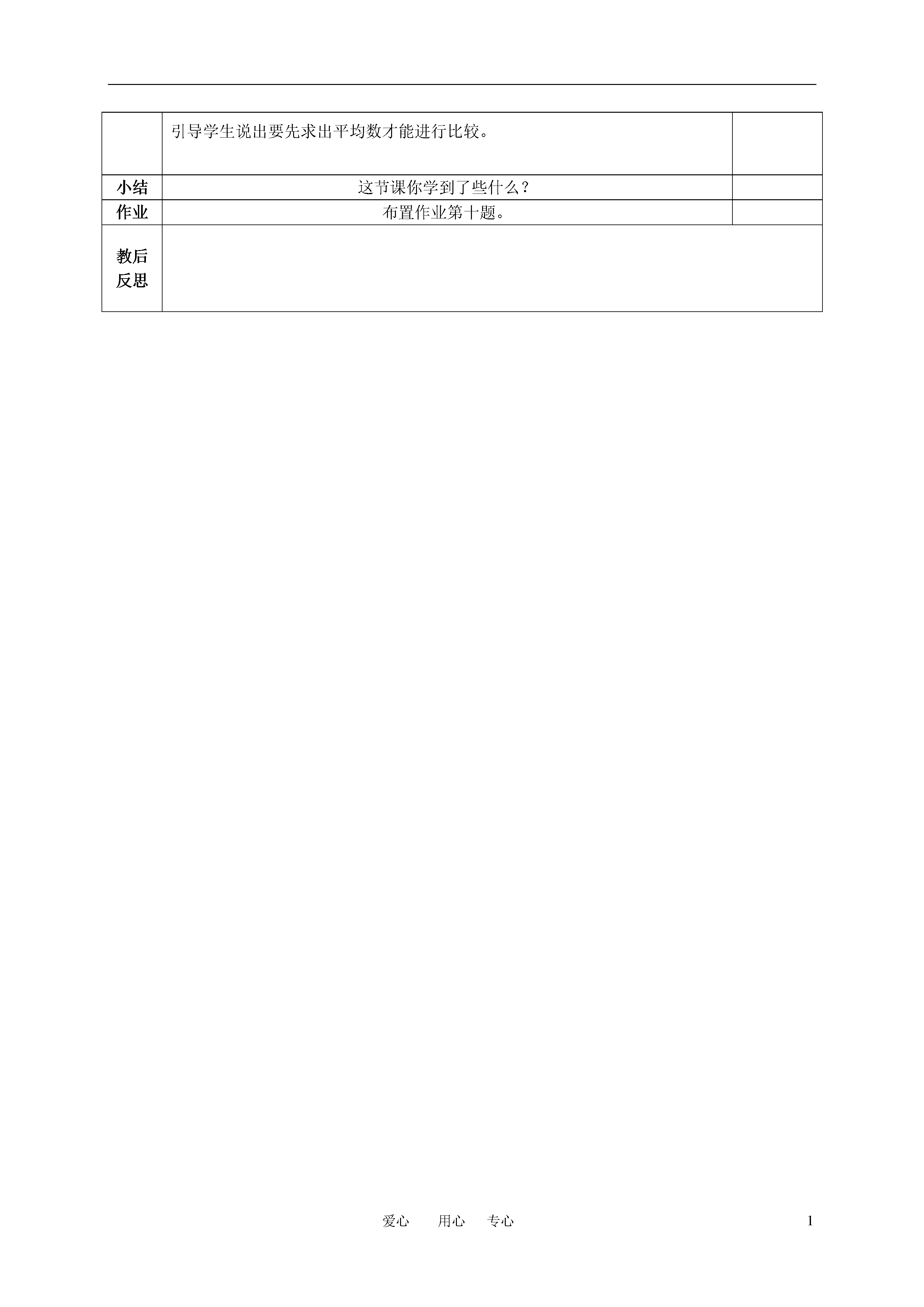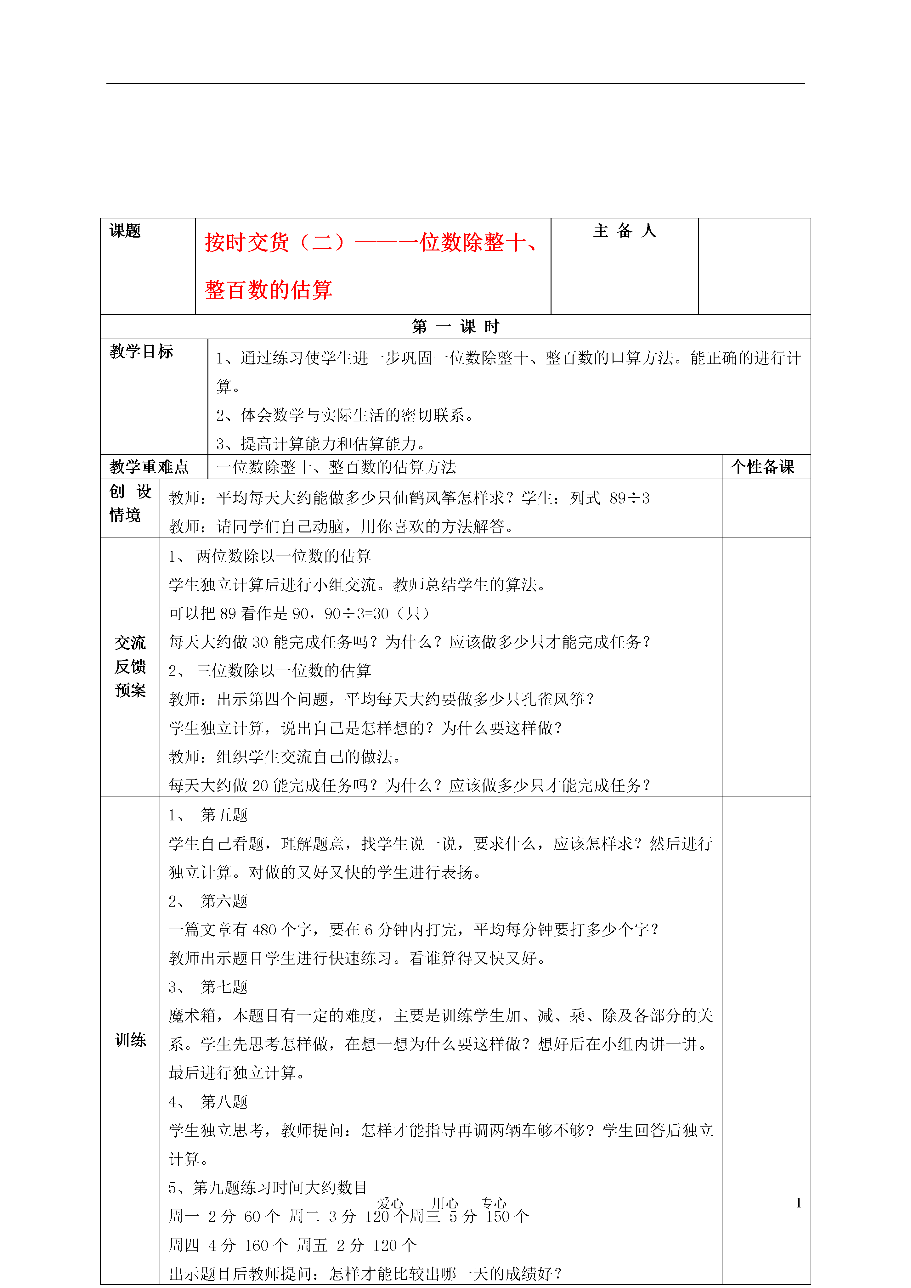 1爱心用心专心课题按时交货(二)——一位数除整十、整百数的估算主备人第一课时教学目标1、通过练习使学生进一步巩固一位数除整十、整百数的口算方法。能正确的进行计算。2、体会数学与实际生活的密切联系。3、提高计算能力和估算能力。教学重难点一位数除整十、整百数的估算方法个性备课创设情境教师:平均每天大约能做多少只仙鹤风筝怎样求?学生:列式89÷3教师:请同学们自己动脑,用你喜欢的方法解答。交流反馈预案两位数除以一位数的估算学生独立计算后进行小组交流。教师总结学生的算法。可以把89看作是90,90÷3=30(只)每天大约做30能完成任务吗?为什么?应该做多少只才能完成任务?三位数除以一位数的估算教师:出示第四个问题,平均每天大约要做多少只孔雀风筝?学生独立计算,说出自己是怎样想的?为什么要这样做?教师:组织学生交流自己的做法。每天大约做20能完成任务吗?为什么?应该做多少只才能完成任务?训练1、第五题学生自己看题,理解题意,找学生说一说,要求什么,应该怎样求?然后进行独立计算。对做的又好又快的学生进行表扬。2、第六题一篇文章有480个字,要在6分钟内打完,平均每分钟要打多少个字?教师出示题目学生进行快速练习。看谁算得又快又好。3、第七题魔术箱,本题目有一定的难度,主要是训练学生加、减、乘、除及各部分的关系。学生先思考怎样做,在想一想为什么要这样做?想好后在小组内讲一讲。最后进行独立计算。4、第八题学生独立思考,教师提问:怎样才能指导再调两辆车够不够?学生回答后独立计算。5、第九题练习时间大约数目周一2分60个周二3分120个周三5分150个周四4分160个周五2分120个出示题目后教师提问:怎样才能比较出哪一天的成绩好?引导学生说出要先求出平均数才能进行比较。小结这节课你学到了些什么?作业布置作业第十题。教后反思