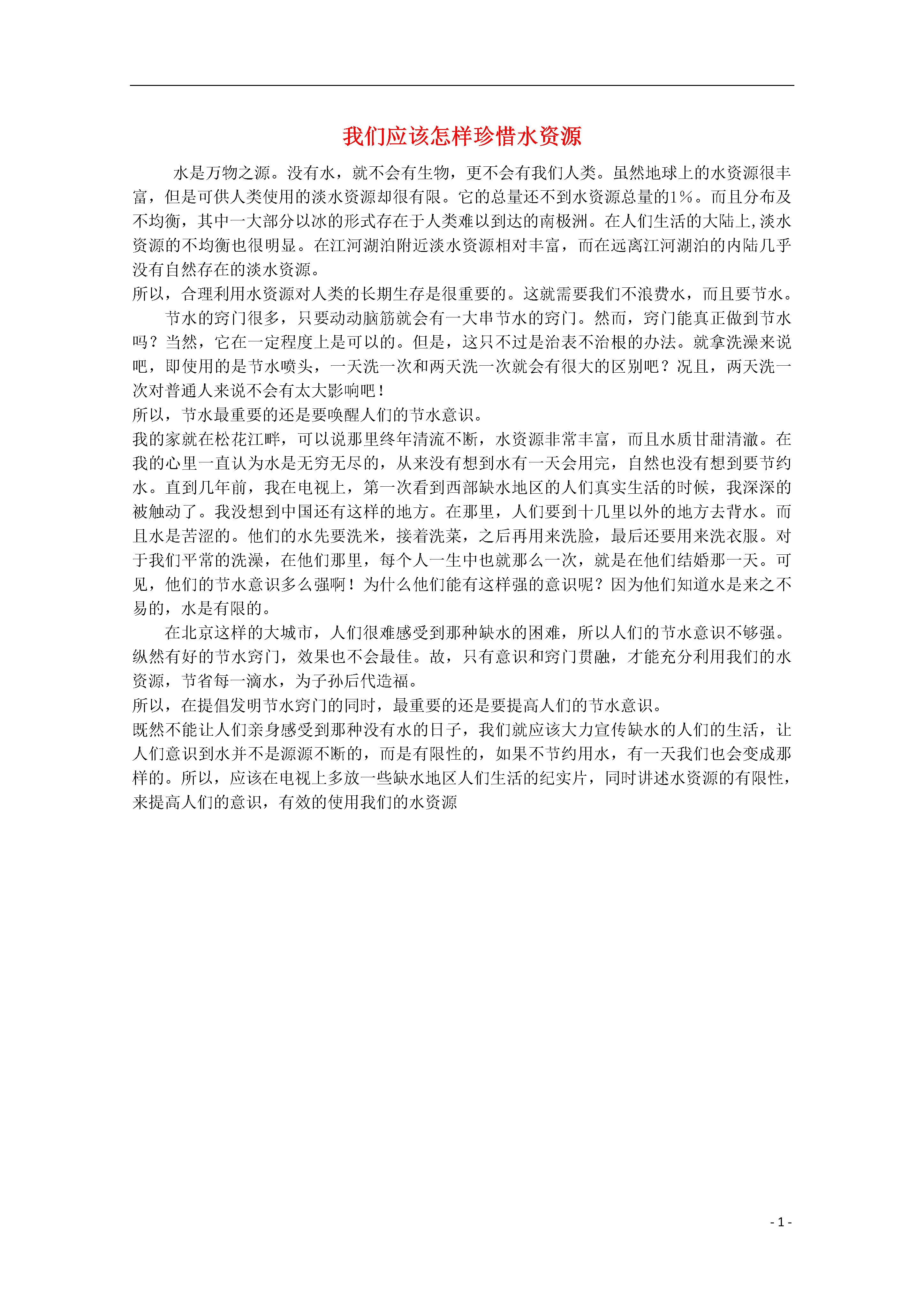 -1-我们应该怎样珍惜水资源水是万物之源。没有水,就不会有生物,更不会有我们人类。虽然地球上的水资源很丰富,但是可供人类使用的淡水资源却很有限。它的总量还不到水资源总量的1%。而且分布及不均衡,其中一大部分以冰的形式存在于人类难以到达的南极洲。在人们生活的大陆上,淡水资源的不均衡也很明显。在江河湖泊附近淡水资源相对丰富,而在远离江河湖泊的内陆几乎没有自然存在的淡水资源。所以,合理利用水资源对人类的长期生存是很重要的。这就需要我们不浪费水,而且要节水。节水的窍门很多,只要动动脑筋就会有一大串节水的窍门。然而,窍门能真正做到节水吗?当然,它在一定程度上是可以的。但是,这只不过是治表不治根的办法。就拿洗澡来说吧,即使用的是节水喷头,一天洗一次和两天洗一次就会有很大的区别吧?况且,两天洗一次对普通人来说不会有太大影响吧!所以,节水最重要的还是要唤醒人们的节水意识。我的家就在松花江畔,可以说那里终年清流不断,水资源非常丰富,而且水质甘甜清澈。在我的心里一直认为水是无穷无尽的,从来没有想到水有一天会用完,自然也没有想到要节约水。直到几年前,我在电视上,第一次看到西部缺水地区的人们真实生活的时候,我深深的被触动了。我没想到中国还有这样的地方。在那里,人们要到十几里以外的地方去背水。而且水是苦涩的。他们的水先要洗米,接着洗菜,之后再用来洗脸,最后还要用来洗衣服。对于我们平常的洗澡,在他们那里,每个人一生中也就那么一次,就是在他们结婚那一天。可见,他们的节水意识多么强啊!为什么他们能有这样强的意识呢?因为他们知道水是来之不易的,水是有限的。在北京这样的大城市,人们很难感受到那种缺水的困难,所以人们的节水意识不够强。纵然有好的节水窍门,效果也不会最佳。故,只有意识和窍门贯融,才能充分利用我们的水资源,节省每一滴水,为子孙后代造福。所以,在提倡发明节水窍门的同时,最重要的还是要提高人们的节水意识。既然不能让人们亲身感受到那种没有水的日子,我们就应该大力宣传缺水的人们的生活,让人们意识到水并不是源源不断的,而是有限性的,如果不节约用水,有一天我们也会变成那样的。所以,应该在电视上多放一些缺水地区人们生活的纪实片,同时讲述水资源的有限性,来提高人们的意识,有效的使用我们的水资源