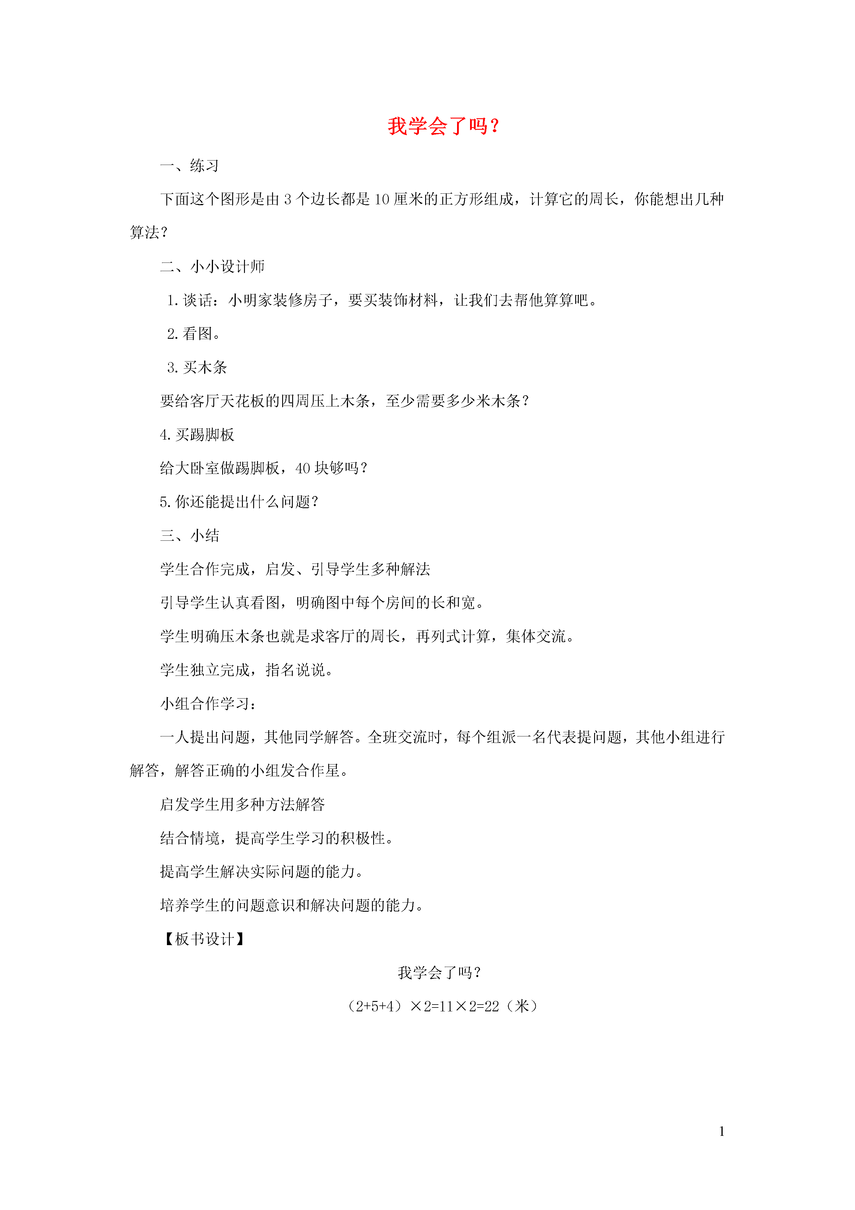 1我学会了吗?一、练习下面这个图形是由3个边长都是10厘米的正方形组成,计算它的周长,你能想出几种算法?二、小小设计师1.谈话:小明家装修房子,要买装饰材料,让我们去帮他算算吧。2.看图。3.买木条要给客厅天花板的四周压上木条,至少需要多少米木条?4.买踢脚板给大卧室做踢脚板,40块够吗?5.你还能提出什么问题?三、小结学生合作完成,启发、引导学生多种解法引导学生认真看图,明确图中每个房间的长和宽。学生明确压木条也就是求客厅的周长,再列式计算,集体交流。学生独立完成,指名说说。小组合作学习:一人提出问题,其他同学解答。全班交流时,每个组派一名代表提问题,其他小组进行解答,解答正确的小组发合作星。启发学生用多种方法解答结合情境,提高学生学习的积极性。提高学生解决实际问题的能力。培养学生的问题意识和解决问题的能力。【板书设计】我学会了吗?(2+5+4)×2=11×2=22(米)