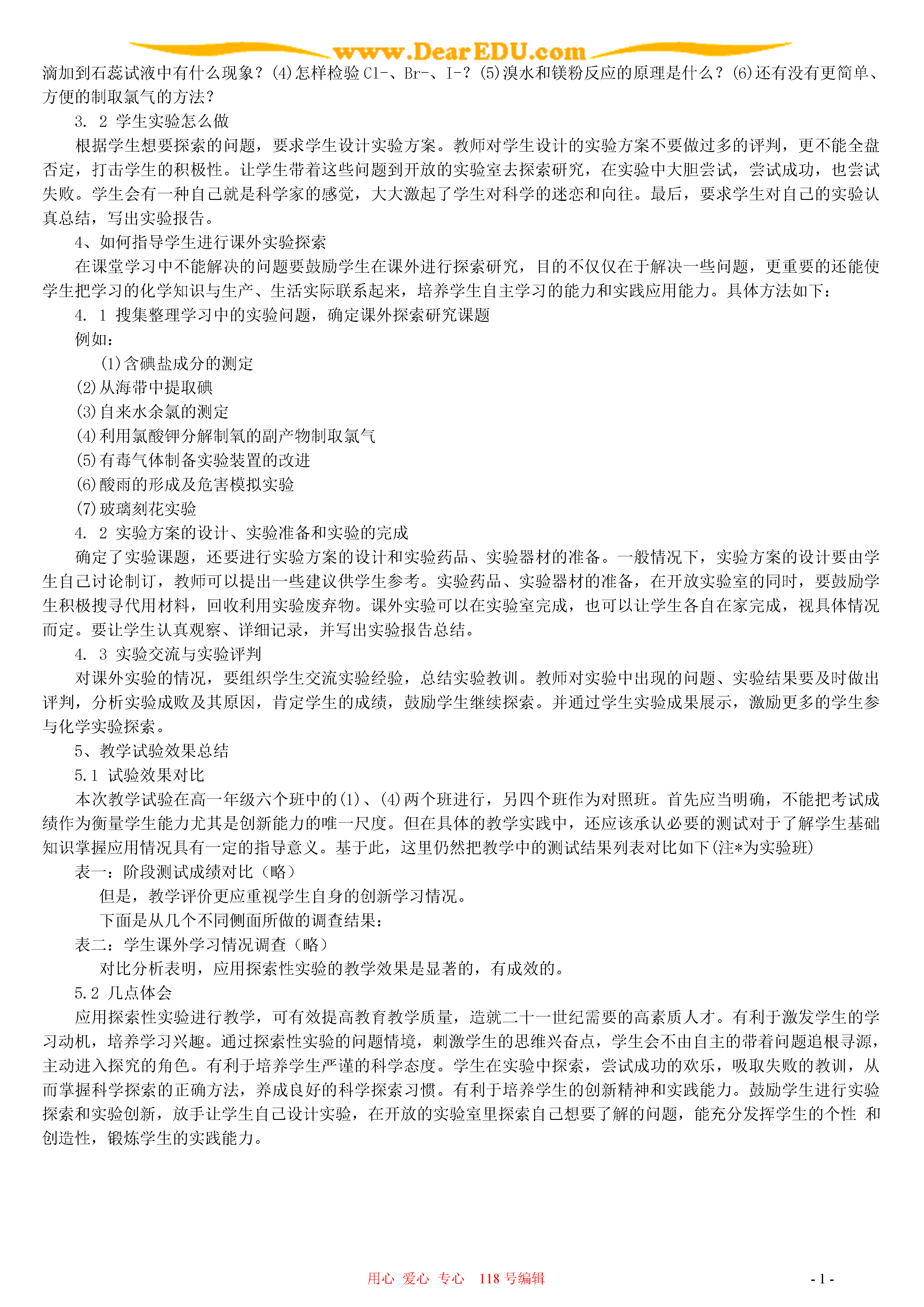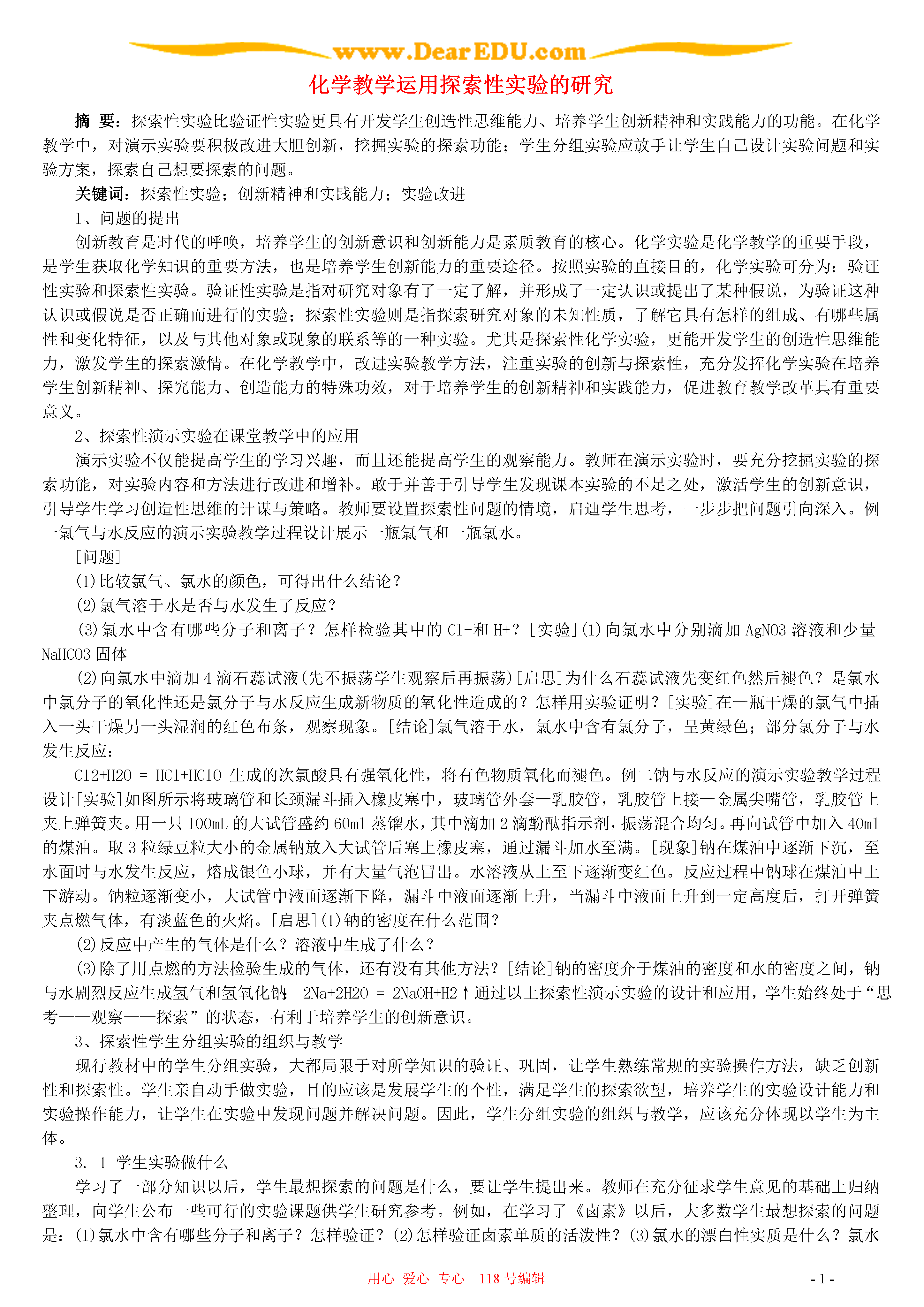用心爱心专心118号编辑-1-化学教学运用探索性实验的研究摘要:探索性实验比验证性实验更具有开发学生创造性思维能力、培养学生创新精神和实践能力的功能。在化学教学中,对演示实验要积极改进大胆创新,挖掘实验的探索功能;学生分组实验应放手让学生自己设计实验问题和实验方案,探索自己想要探索的问题。关键词:探索性实验;创新精神和实践能力;实验改进1、问题的提出创新教育是时代的呼唤,培养学生的创新意识和创新能力是素质教育的核心。化学实验是化学教学的重要手段,是学生获取化学知识的重要方法,也是培养学生创新能力的重要途径。按照实验的直接目的,化学实验可分为:验证性实验和探索性实验。验证性实验是指对研究对象有了一定了解,并形成了一定认识或提出了某种假说,为验证这种认识或假说是否正确而进行的实验;探索性实验则是指探索研究对象的未知性质,了解它具有怎样的组成、有哪些属性和变化特征,以及与其他对象或现象的联系等的一种实验。尤其是探索性化学实验,更能开发学生的创造性思维能力,激发学生的探索激情。在化学教学中,改进实验教学方法,注重实验的创新与探索性,充分发挥化学实验在培养学生创新精神、探究能力、创造能力的特殊功效,对于培养学生的创新精神和实践能力,促进教育教学改革具有重要意义。2、探索性演示实验在课堂教学中的应用演示实验不仅能提高学生的学习兴趣,而且还能提高学生的观察能力。教师在演示实验时,要充分挖掘实验的探索功能,对实验内容和方法进行改进和增补。敢于并善于引导学生发现课本实验的不足之处,激活学生的创新意识,引导学生学习创造性思维的计谋与策略。教师要设置探索性问题的情境,启迪学生思考,一步步把问题引向深入。例一氯气与水反应的演示实验教学过程设计展示一瓶氯气和一瓶氯水。[问题](1)比较氯气、氯水的颜色,可得出什么结论?(2)氯气溶于水是否与水发生了反应?(3)氯水中含有哪些分子和离子?怎样检验其中的Cl-和H+?[实验](1)向氯水中分别滴加AgNO3溶液和少量NaHCO3固体(2)向氯水中滴加4滴石蕊试液(先不振荡学生观察后再振荡)[启思]为什么石蕊试液先变红色然后褪色?是氯水中氯分子的氧化性还是氯分子与水反应生成新物质的氧化性造成的?怎样用实验证明?[实验]在一瓶干燥的氯气中插入一头干燥另一头湿润的红色布条,观察现象。[结论]氯气溶于水,氯水中含有氯分子,呈黄绿色;部分氯分子与水发生反应:Cl2+H2O=HCl+HClO生成的次氯酸具有强氧化性,将有色物质氧化而褪色。例二钠与水反应的演示实验教学过程设计[实验]如图所示将玻璃管和长颈漏斗插入橡皮塞中,玻璃管外套一乳胶管,乳胶管上接一金属尖嘴管,乳胶管上夹上弹簧夹。用一只100mL的大试管盛约60ml蒸馏水,其中滴加2滴酚酞指示剂,振荡混合均匀。再向试管中加入40ml的煤油。取3粒绿豆粒大小的金属钠放入大试管后塞上橡皮塞,通过漏斗加水至满。[现象]钠在煤油中逐渐下沉,至水面时与水发生反应,熔成银色小球,并有大量气泡冒出。水溶液从上至下逐渐变红色。反应过程中钠球在煤油中上下游动。钠粒逐渐变小,大试管中液面逐渐下降,漏斗中液面逐渐上升,当漏斗中液面上升到一定高度后,打开弹簧夹点燃气体,有淡蓝色的火焰。[启思](1)钠的密度在什么范围?(2)反应中产生的气体是什么?溶液中生成了什么?(3)除了用点燃的方法检验生成的气体,还有没有其他方法?[结论]钠的密度介于煤油的密度和水的密度之间,钠与水剧烈反应生成氢气和氢氧化钠:2Na+2H2O=2NaOH+H2↑通过以上探索性演示实验的设计和应用,学生始终处于“思考——观察——探索”的状态,有利于培养学生的创新意识。3、探索性学生分组实验的组织与教学现行教材中的学生分组实验,大都局限于对所学知识的验证、巩固,让学生熟练常规的实验操作方法,缺乏创新性和探索性。学生亲自动手做实验,目的应该是发展学生的个性,满足学生的探索欲望,培养学生的实验设计能力和实验操作能力,让学生在实验中发现问题并解决问题。因此,学生分组实验的组织与教学,应该充分体现以学生为主体。3.1学生实验做什么学习了一部分知识以后,学生最想探索的问题是什么,要让学生提出来。教师在充分征求学生意见的基础上归纳整理,向学生公布一些可行的实验课题供学生研究参考。例如,在学习了《卤素》以后,大多数学生最想探索的问题是:(1)氯水中含有哪些分子和离子?怎样验证?(2)怎样验证卤素单质的活泼性?(3)氯水的漂白性实质是什么?氯水滴加到石蕊试液中有什么现象?(4)怎样检验Cl-、Br-、I-?(5)溴水和镁粉反应的原理是什么?(6)还有没有更简单、方便的制取氯气的方法?3.2学生实验怎么做根据学生想要探索的问题,要求学生设计实验方案。教师对学生设计的实验方案不要做过多的评判,更不能全盘否定,打击学生的积极性。让学