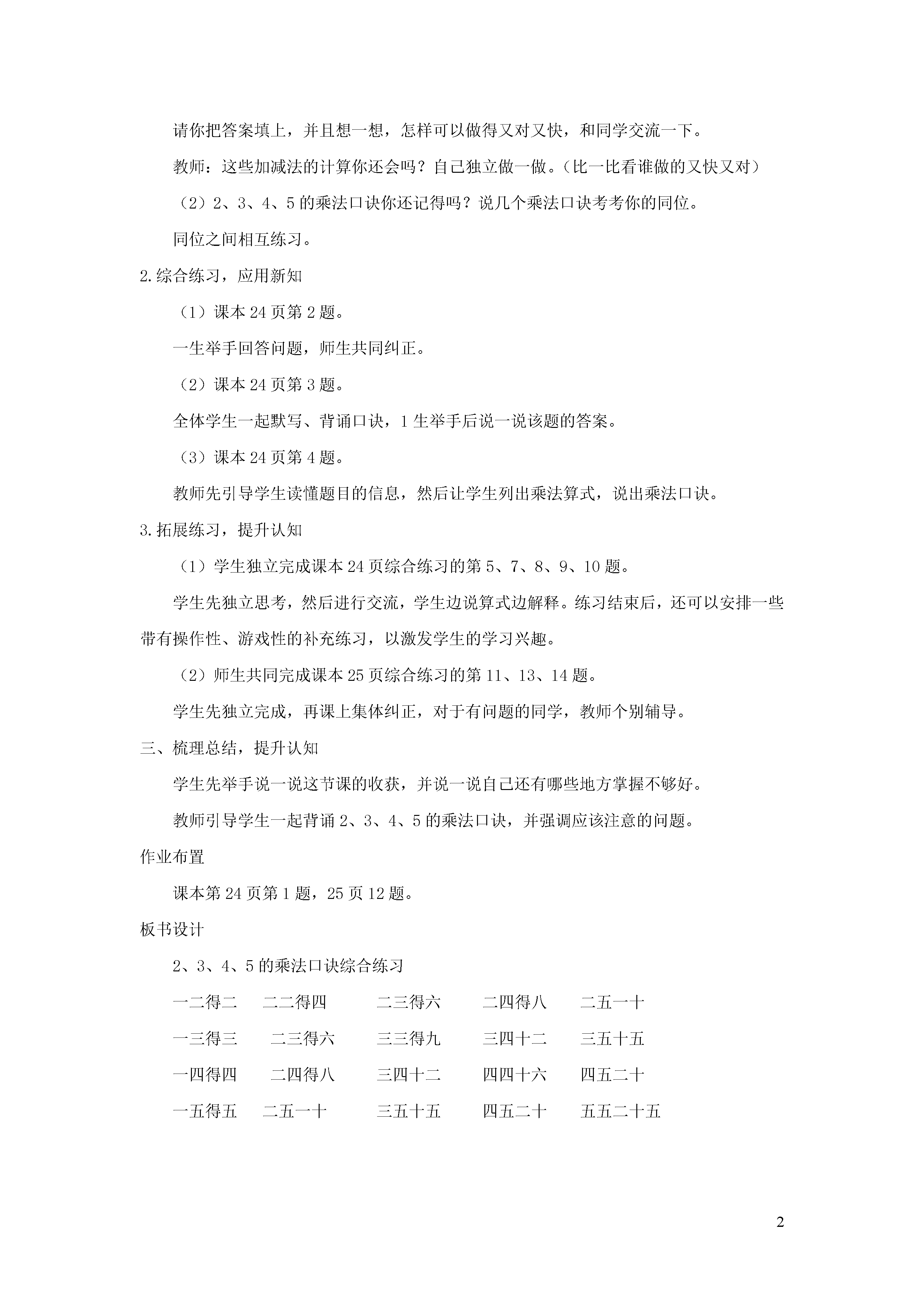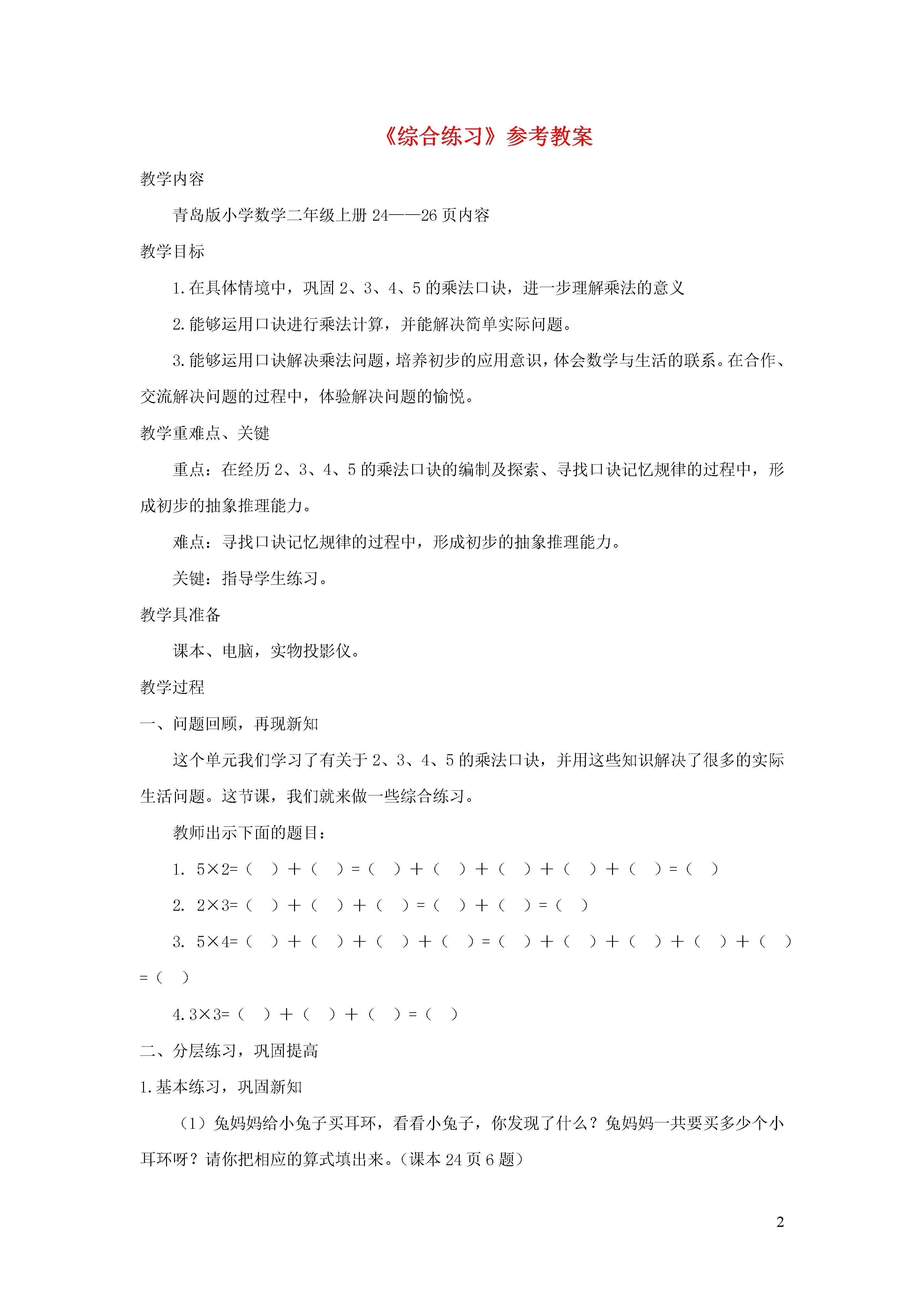 2《综合练习》参考教案教学内容青岛版小学数学二年级上册24——26页内容教学目标1.在具体情境中,巩固2、3、4、5的乘法口诀,进一步理解乘法的意义2.能够运用口诀进行乘法计算,并能解决简单实际问题。3.能够运用口诀解决乘法问题,培养初步的应用意识,体会数学与生活的联系。在合作、交流解决问题的过程中,体验解决问题的愉悦。教学重难点、关键重点:在经历2、3、4、5的乘法口诀的编制及探索、寻找口诀记忆规律的过程中,形成初步的抽象推理能力。难点:寻找口诀记忆规律的过程中,形成初步的抽象推理能力。关键:指导学生练习。教学具准备课本、电脑,实物投影仪。教学过程一、问题回顾,再现新知这个单元我们学习了有关于2、3、4、5的乘法口诀,并用这些知识解决了很多的实际生活问题。这节课,我们就来做一些综合练习。教师出示下面的题目:1.5×2=()+()=()+()+()+()+()=()2.2×3=()+()+()=()+()=()3.5×4=()+()+()+()=()+()+()+()+()=()4.3×3=()+()+()=()二、分层练习,巩固提高1.基本练习,巩固新知(1)兔妈妈给小兔子买耳环,看看小兔子,你发现了什么?兔妈妈一共要买多少个小耳环呀?请你把相应的算式填出来。(课本24页6题)请你把答案填上,并且想一想,怎样可以做得又对又快,和同学交流一下。教师:这些加减法的计算你还会吗?自己独立做一做。(比一比看谁做的又快又对)(2)2、3、4、5的乘法口诀你还记得吗?说几个乘法口诀考考你的同位。同位之间相互练习。2.综合练习,应用新知(1)课本24页第2题。一生举手回答问题,师生共同纠正。(2)课本24页第3题。全体学生一起默写、背诵口诀,1生举手后说一说该题的答案。(3)课本24页第4题。教师先引导学生读懂题目的信息,然后让学生列出乘法算式,说出乘法口诀。3.拓展练习,提升认知(1)学生独立完成课本24页综合练习的第5、7、8、9、10题。学生先独立思考,然后进行交流,学生边说算式边解释。练习结束后,还可以安排一些带有操作性、游戏性的补充练习,以激发学生的学习兴趣。(2)师生共同完成课本25页综合练习的第11、13、14题。学生先独立完成,再课上集体纠正,对于有问题的同学,教师个别辅导。三、梳理总结,提升认知学生先举手说一说这节课的收获,并说一说自己还有哪些地方掌握不够好。教师引导学生一起背诵2、3、4、5的乘法口诀,并强调应该注意的问题。作业布置课本第1题,25页12题。板书设计2、3、4、5的乘法口诀综合练习一二得二二二得四二三得六二四得八二五一十一三得三二三得六三三得九三四十二三五十五一四得四二四得八三四十二四四十六四五二十一五得五二五一十三五十五四五二十五五二十五