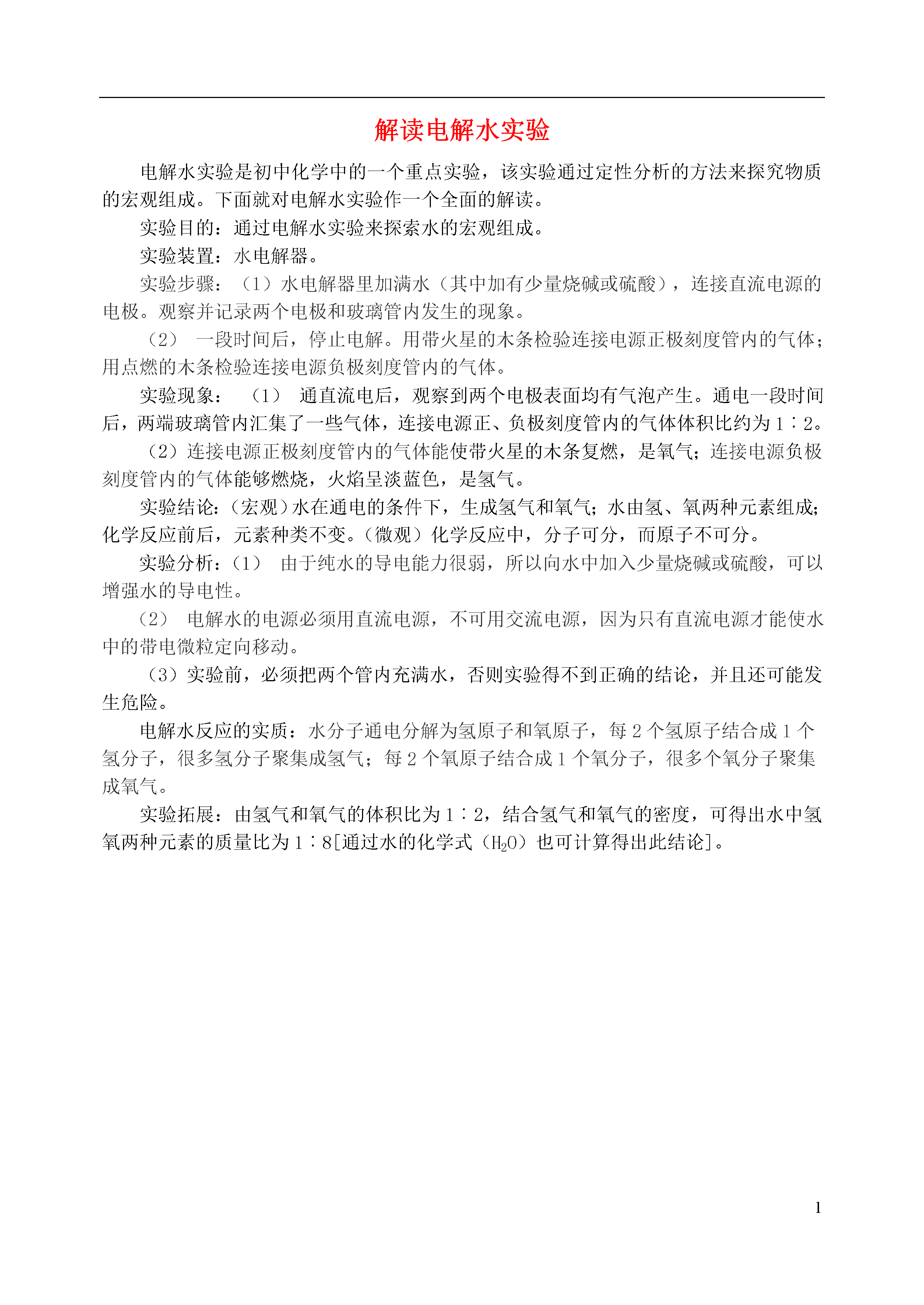 1解读电解水实验电解水实验是初中化学中的一个重点实验,该实验通过定性分析的方法来探究物质的宏观组成。下面就对电解水实验作一个全面的解读。实验目的:通过电解水实验来探索水的宏观组成。实验装置:水电解器。实验步骤:(1)水电解器里加满水(其中加有少量烧碱或硫酸),连接直流电源的电极。观察并记录两个电极和玻璃管内发生的现象。(2)一段时间后,停止电解。用带火星的木条检验连接电源正极刻度管内的气体;用点燃的木条检验连接电源负极刻度管内的气体。实验现象:(1)通直流电后,观察到两个电极表面均有气泡产生。通电一段时间后,两端玻璃管内汇集了一些气体,连接电源正、负极刻度管内的气体体积比约为1︰2。(2)连接电源正极刻度管内的气体能使带火星的木条复燃,是氧气;连接电源负极刻度管内的气体能够燃烧,火焰呈淡蓝色,是氢气。实验结论:(宏观)水在通电的条件下,生成氢气和氧气;水由氢、氧两种元素组成;化学反应前后,元素种类不变。(微观)化学反应中,分子可分,而原子不可分。实验分析:(1)由于纯水的导电能力很弱,所以向水中加入少量烧碱或硫酸,可以增强水的导电性。(2)电解水的电源必须用直流电源,不可用交流电源,因为只有直流电源才能使水中的带电微粒定向移动。(3)实验前,必须把两个管内充满水,否则实验得不到正确的结论,并且还可能发生危险。电解水反应的实质:水分子通电分解为氢原子和氧原子,每2个氢原子结合成1个氢分子,很多氢分子聚集成氢气;每2个氧原子结合成1个氧分子,很多个氧分子聚集成氧气。实验拓展:由氢气和氧气的体积比为1︰2,结合氢气和氧气的密度,可得出水中氢氧两种元素的质量比为1︰8[通过水的化学式(H2O)也可计算得出此结论]。