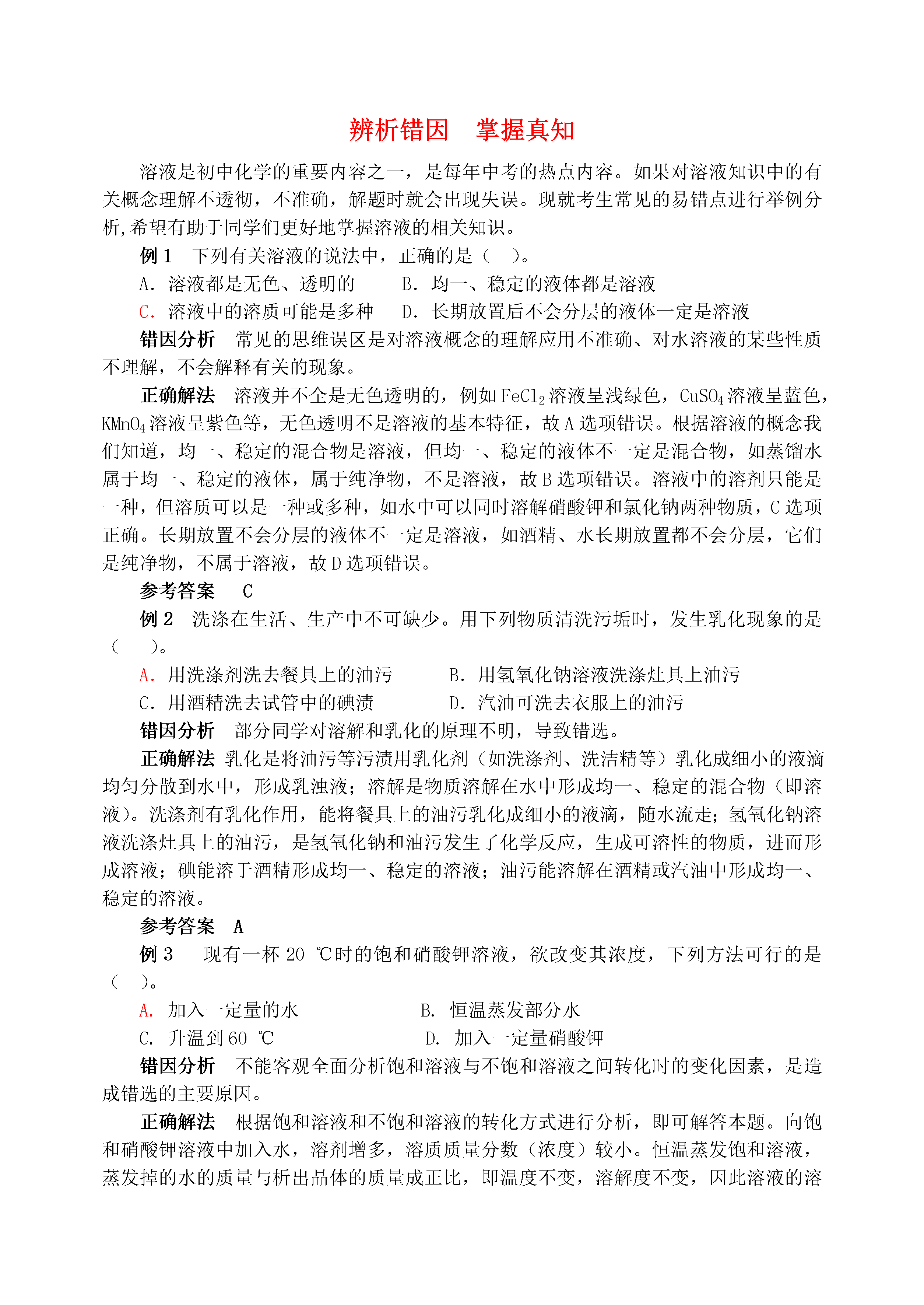 辨析错因掌握真知溶液是初中化学的重要内容之一,是每年中考的热点内容。如果对溶液知识中的有关概念理解不透彻,不准确,解题时就会出现失误。现就考生常见的易错点进行举例分析,希望有助于同学们更好地掌握溶液的相关知识。例1下列有关溶液的说法中,正确的是()。A.溶液都是无色、透明的B.均一、稳定的液体都是溶液C.溶液中的溶质可能是多种D.长期放置后不会分层的液体一定是溶液错因分析常见的思维误区是对溶液概念的理解应用不准确、对水溶液的某些性质不理解,不会解释有关的现象。正确解法溶液并不全是无色透明的,例如FeCl2溶液呈浅绿色,CuSO4溶液呈蓝色,KMnO4溶液呈紫色等,无色透明不是溶液的基本特征,故A选项错误。根据溶液的概念我们知道,均一、稳定的混合物是溶液,但均一、稳定的液体不一定是混合物,如蒸馏水属于均一、稳定的液体,属于纯净物,不是溶液,故B选项错误。溶液中的溶剂只能是一种,但溶质可以是一种或多种,如水中可以同时溶解硝酸钾和氯化钠两种物质,C选项正确。长期放置不会分层的液体不一定是溶液,如酒精、水长期放置都不会分层,它们是纯净物,不属于溶液,故D选项错误。参考答案C例2洗涤在生活、生产中不可缺少。用下列物质清洗污垢时,发生乳化现象的是()。A.用洗涤剂洗去餐具上的油污B.用氢氧化钠溶液洗涤灶具上油污C.用酒精洗去试管中的碘渍D.汽油可洗去衣服上的油污错因分析部分同学对溶解和乳化的原理不明,导致错选。正确解法乳化是将油污等污渍用乳化剂(如洗涤剂、洗洁精等)乳化成细小的液滴均匀分散到水中,形成乳浊液;溶解是物质溶解在水中形成均一、稳定的混合物(即溶液)。洗涤剂有乳化作用,能将餐具上的油污乳化成细小的液滴,随水流走;氢氧化钠溶液洗涤灶具上的油污,是氢氧化钠和油污发生了化学反应,生成可溶性的物质,进而形成溶液;碘能溶于酒精形成均一、稳定的溶液;油污能溶解在酒精或汽油中形成均一、稳定的溶液。参考答案A例3现有一杯20℃时的饱和硝酸钾溶液,欲改变其浓度,下列方法可行的是()。A.加入一定量的水B.恒温蒸发部分水C.升温到60℃D.加入一定量硝酸钾错因分析不能客观全面分析饱和溶液与不饱和溶液之间转化时的变化因素,是造成错选的主要原因。正确解法根据饱和溶液和不饱和溶液的转化方式进行分析,即可解答本题。向饱和硝酸钾溶液中加入水,溶剂增多,溶质质量分数(浓度)较小。恒温蒸发饱和溶液,蒸发掉的水的质量与析出晶体的质量成正比,即温度不变,溶解度不变,因此溶液的溶质质量分数(浓度)不变。硝酸钾的溶解度随温度的升高而增大,升高温度时硝酸钾饱和溶液变为不饱和溶液,但这一过程中溶液的组成不变,因此溶液的溶质质量分数(浓度)不变。向饱和硝酸钾溶液中加入硝酸钾,加入的硝酸钾不再溶解,因此溶液的溶质质量分数(浓度)不变。参考答案A