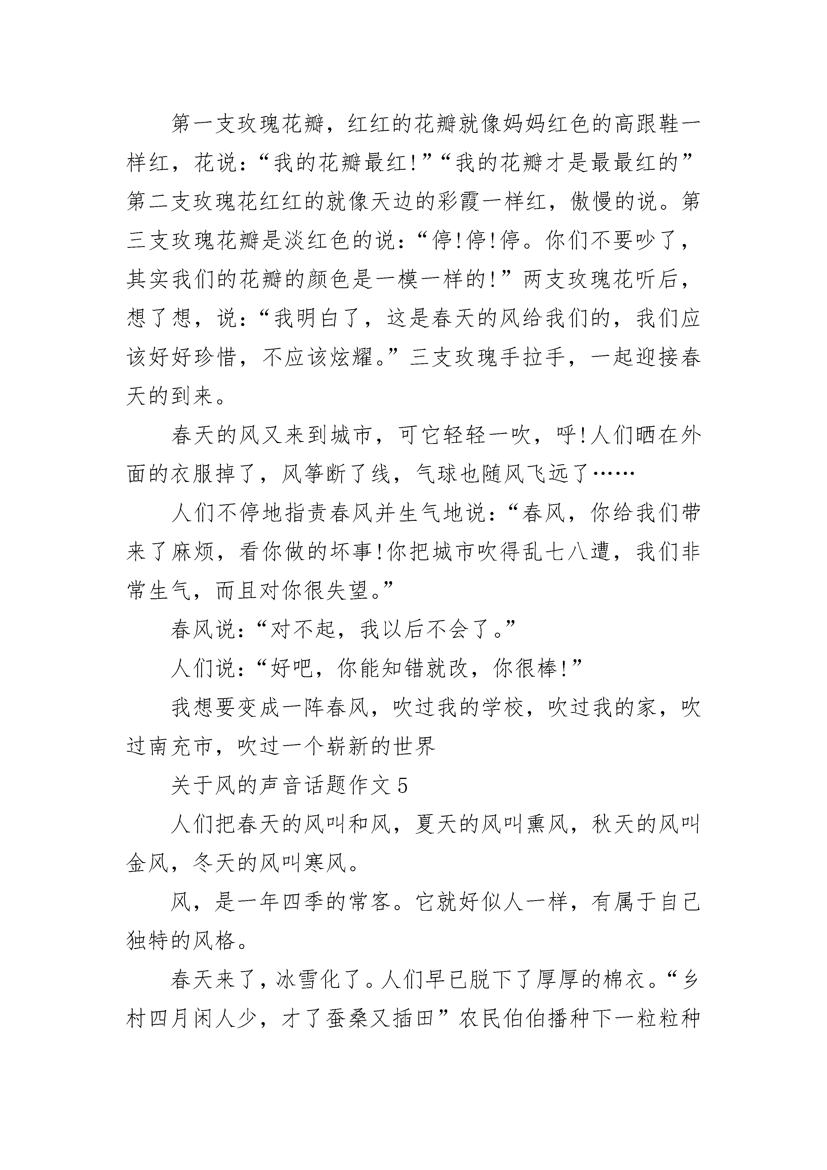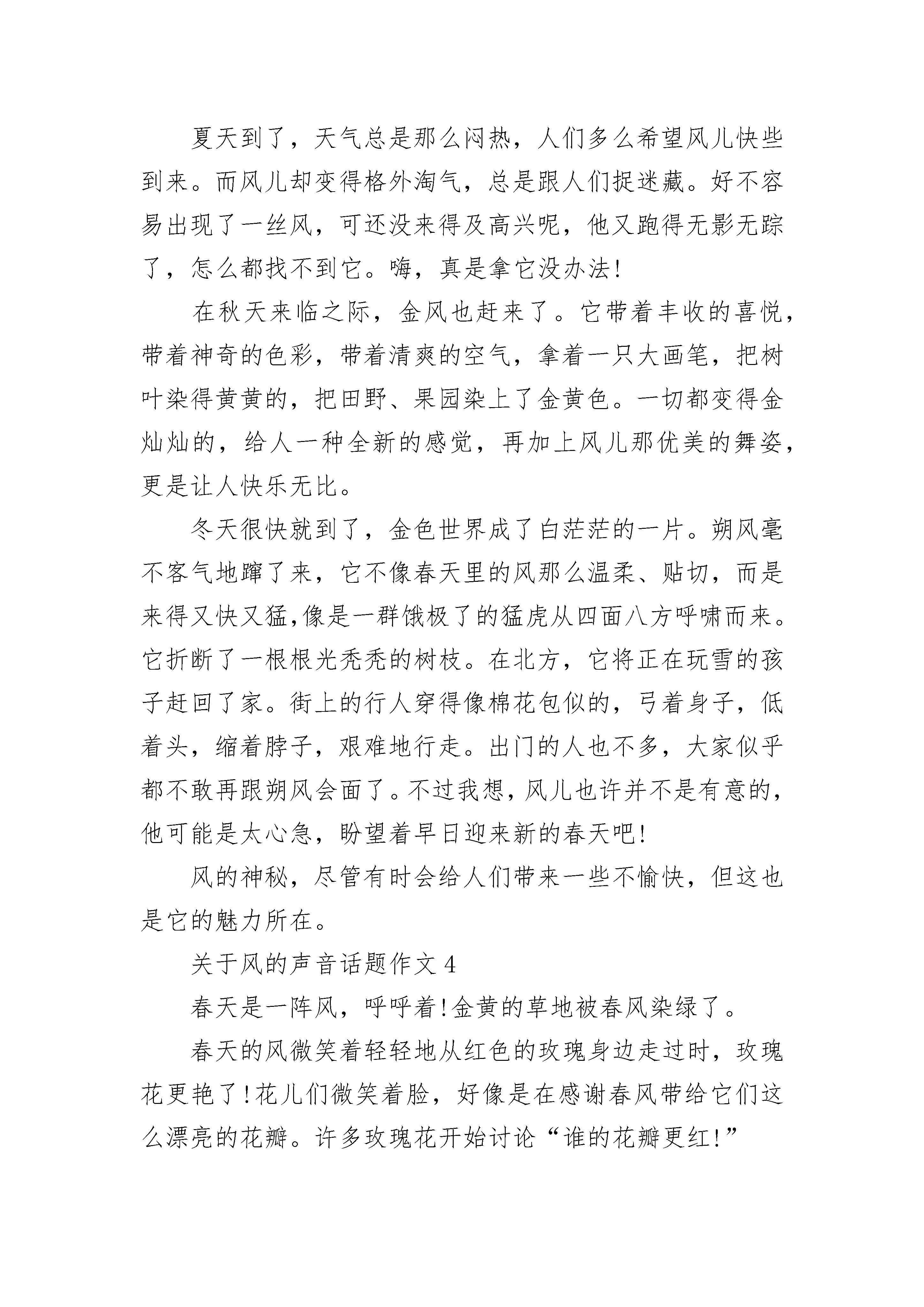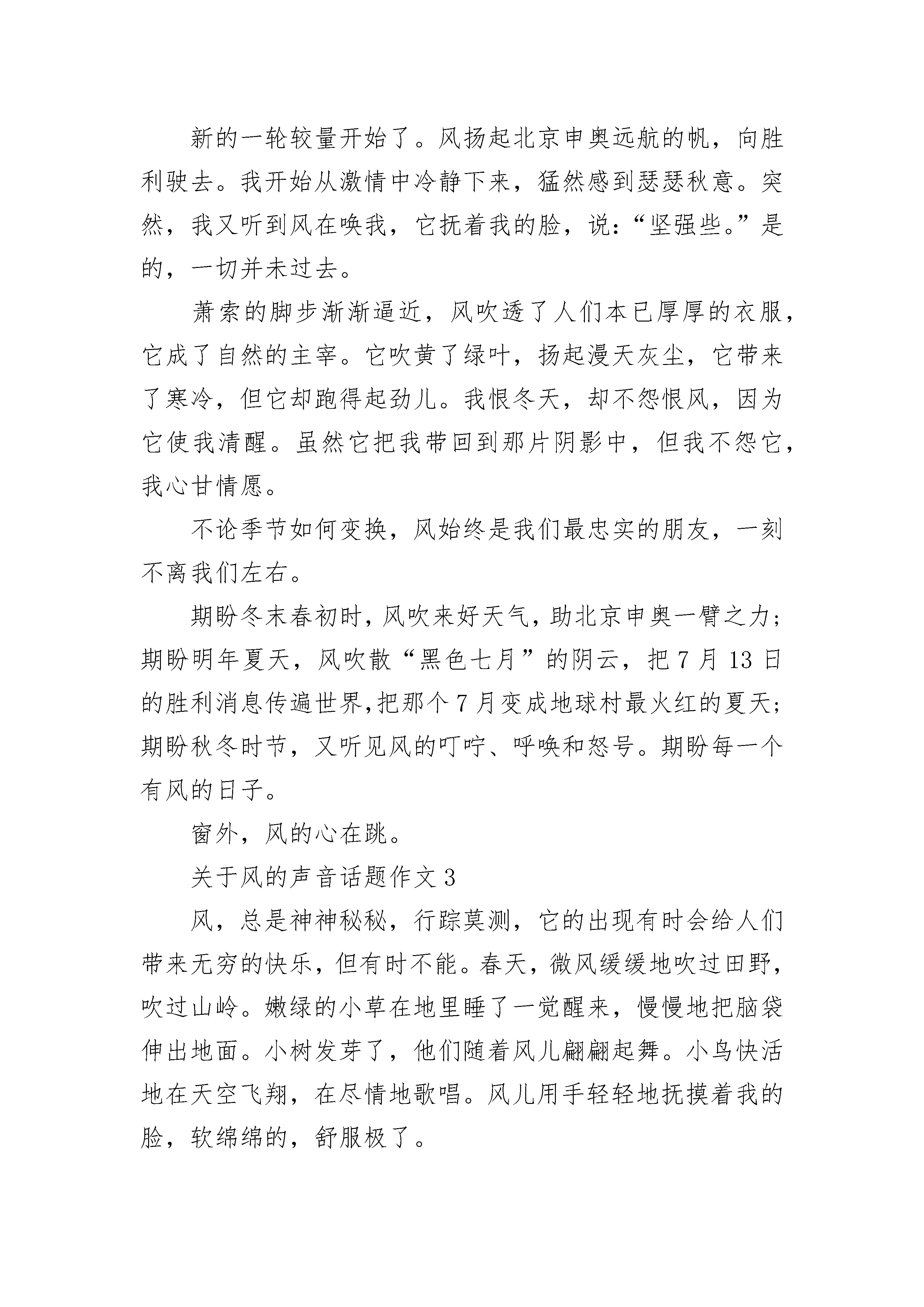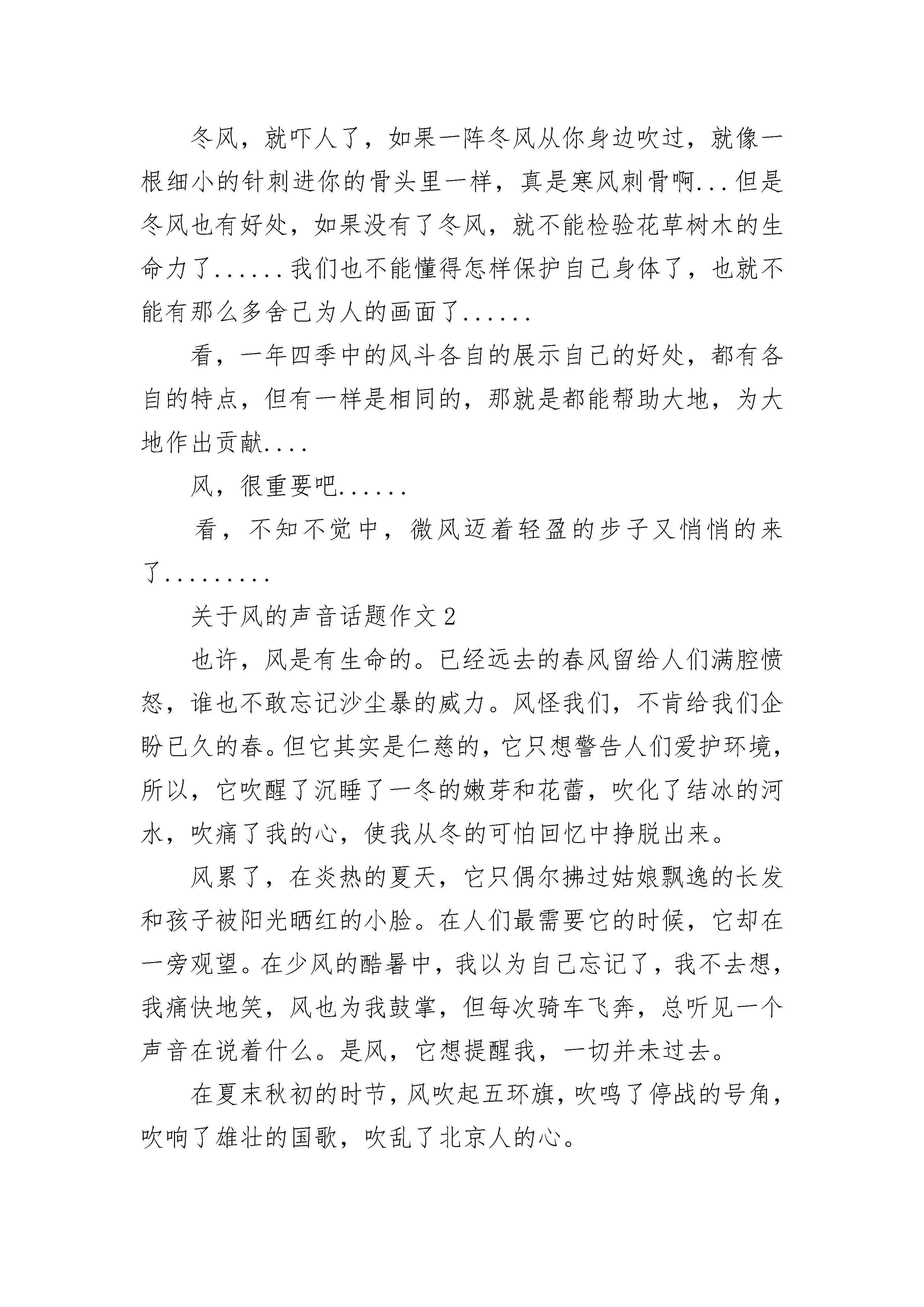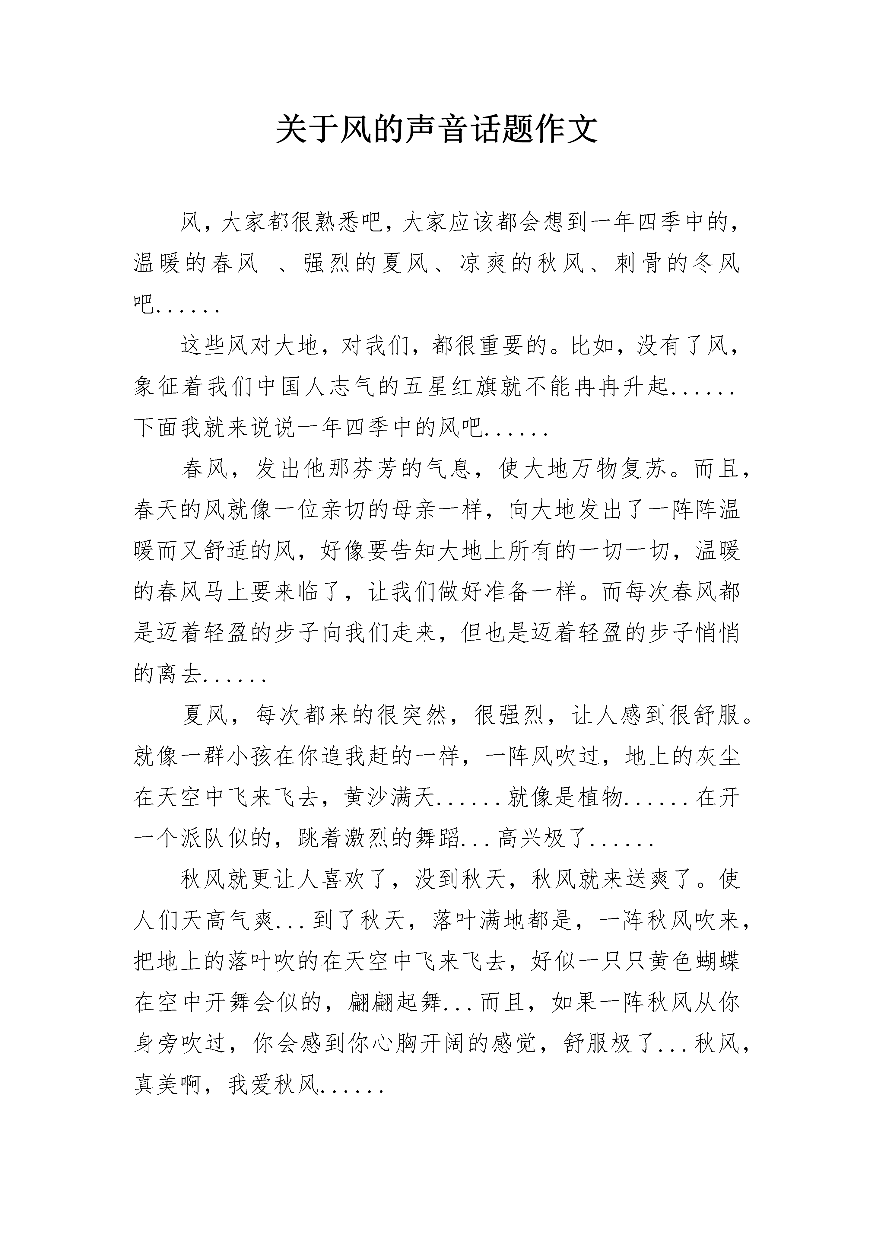 关于风的声音话题作文风,大家都很熟悉吧,大家应该都会想到一年四季中的,温暖的春风、强烈的夏风、凉爽的秋风、刺骨的冬风吧......这些风对大地,对我们,都很重要的。比如,没有了风,象征着我们中国人志气的五星红旗就不能冉冉升起......下面我就来说说一年四季中的风吧......春风,发出他那芬芳的气息,使大地万物复苏。而且,春天的风就像一位亲切的母亲一样,向大地发出了一阵阵温暖而又舒适的风,好像要告知大地上所有的一切一切,温暖的春风马上要来临了,让我们做好准备一样。而每次春风都是迈着轻盈的步子向我们走来,但也是迈着轻盈的步子悄悄的离去......夏风,每次都来的很突然,很强烈,让人感到很舒服。就像一群小孩在你追我赶的一样,一阵风吹过,地上的灰尘在天空中飞来飞去,黄沙满天......就像是植物......在开一个派队似的,跳着激烈的舞蹈...高兴极了......秋风就更让人喜欢了,没到秋天,秋风就来送爽了。使人们天高气爽...到了秋天,落叶满地都是,一阵秋风吹来,把地上的落叶吹的在天空中飞来飞去,好似一只只黄色蝴蝶在空中开舞会似的,翩翩起舞...而且,如果一阵秋风从你身旁吹过,你会感到你心胸开阔的感觉,舒服极了...秋风,真美啊,我爱秋风......冬风,就吓人了,如果一阵冬风从你身边吹过,就像一根细小的针刺进你的骨头里一样,真是寒风刺骨啊...但是冬风也有好处,如果没有了冬风,就不能检验花草树木的生命力了......我们也不能懂得怎样保护自己身体了,也就不能有那么多舍己为人的画面了......看,一年四季中的风斗各自的展示自己的好处,都有各自的特点,但有一样是相同的,那就是都能帮助大地,为大地作出贡献....风,很重要吧......看,不知不觉中,微风迈着轻盈的步子又悄悄的来了.........关于风的声音话题作文2也许,风是有生命的。已经远去的春风留给人们满腔愤怒,谁也不敢忘记沙尘暴的威力。风怪我们,不肯给我们企盼已久的春。但它其实是仁慈的,它只想警告人们爱护环境,所以,它吹醒了沉睡了一冬的嫩芽和花蕾,吹化了结冰的河水,吹痛了我的心,使我从冬的可怕回忆中挣脱出来。风累了,在炎热的夏天,它只偶尔拂过姑娘飘逸的长发和孩子被阳光晒红的小脸。在人们最需要它的时候,它却在一旁观望。在少风的酷暑中,我以为自己忘记了,我不去想,我痛快地笑,风也为我鼓掌,但每次骑车飞奔,总听见一个声音在说着什么。是风,它想提醒我,一切并未过去。在夏末秋初的时节,风吹起五环旗,吹鸣了停战的号角,吹响了雄壮的国歌,吹乱了北京人的心。新的一轮较量开始了。风扬起北京申奥远航的帆,向胜利驶去。我开始从激情中冷静下来,猛然感到瑟瑟秋意。突然,我又听到风在唤我,它抚着我的脸,说:“坚强些。”是的,一切并未过去。萧索的脚步渐渐逼近,风吹透了人们本已厚厚的衣服,它成了自然的主宰。它吹黄了绿叶,扬起漫天灰尘,它带来了寒冷,但它却跑得起劲儿。我恨冬天,却不怨恨风,因为它使我清醒。虽然它把我带回到那片阴影中,但我不怨它,我心甘情愿。不论季节如何变换,风始终是我们最忠实的朋友,一刻不离我们左右。期盼冬末春初时,风吹来好天气,助北京申奥一臂之力;期盼明年夏天,风吹散“黑色七月”的阴云,把7月13日的胜利消息传遍世界,把那个7月变成地球村最火红的夏天;期盼秋冬时节,又听见风的叮咛、呼唤和怒号。期盼每一个有风的日子。窗外,风的心在跳。关于风的声音话题作文3风,总是神神秘秘,行踪莫测,它的出现有时会给人们带来无穷的快乐,但有时不能。春天,微风缓缓地吹过田野,吹过山岭。嫩绿的小草在地里睡了一觉醒来,慢慢地把脑袋伸出地面。小树发芽了,他们随着风儿翩翩起舞。小鸟快活地在天空飞翔,在尽情地歌唱。风儿用手轻轻地抚摸着我的脸,软绵绵的,舒服极了。夏天到了,天气总是那么闷热,人们多么希望风儿快些到来。而风儿却变得格外淘气,总是跟人们捉迷藏。好不容易出现了一丝风,可还没来得及高兴呢,他又跑得无影无踪了,怎么都找不到它。嗨,真是拿它没办法!在秋天来临之际,金风也赶来了。它带着丰收的喜悦,带着神奇的色彩,带着清爽的空气,拿着一只大画笔,把树叶染得黄黄的,把田野、果园染上了金黄色。一切都变得金灿灿的,给人一种全新的感觉,再加上风儿那优美的舞姿,更是让人快乐无比。冬天很快就到了,金色世界成了白茫茫的一片。朔风毫不客气地蹿了来,它不像春天里的风那么温柔、贴切,而是来得又快又猛,像是一群饿极了的猛虎从四面八方呼啸而来。它折断了一根根光秃秃的树枝。在北方,它将正在玩雪的孩子赶回了家。街上的行人穿得像棉花包似的,弓着身子,低着头,缩着脖子,艰难地行走。出门的人也不多,大家似乎都不敢再跟朔风会面了。不过我想,风儿也许并不是有意的,他可能是太心急,盼望着早日迎来新的春天吧!风的神秘,尽管有时会给人们带来一些不愉快,但这也