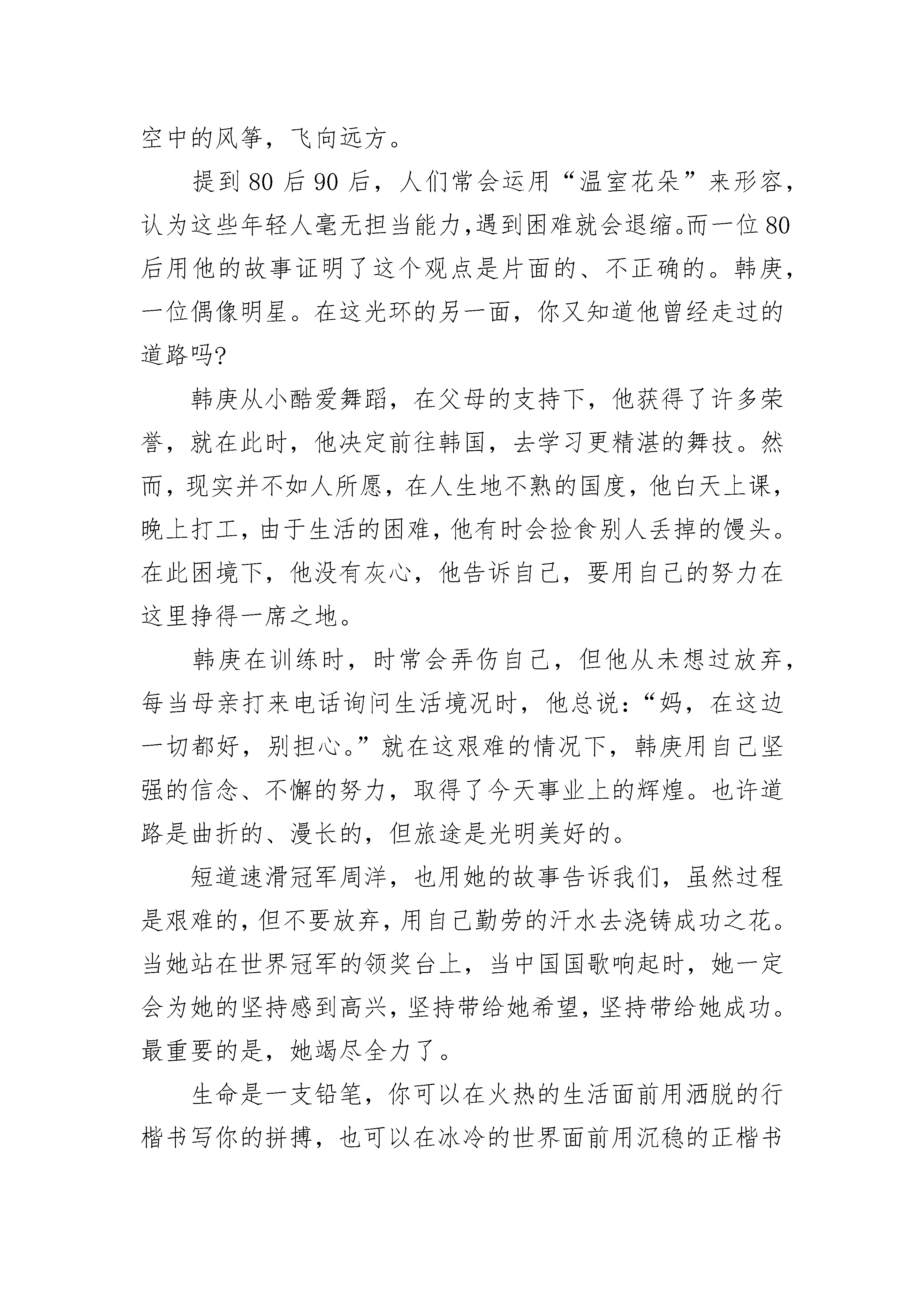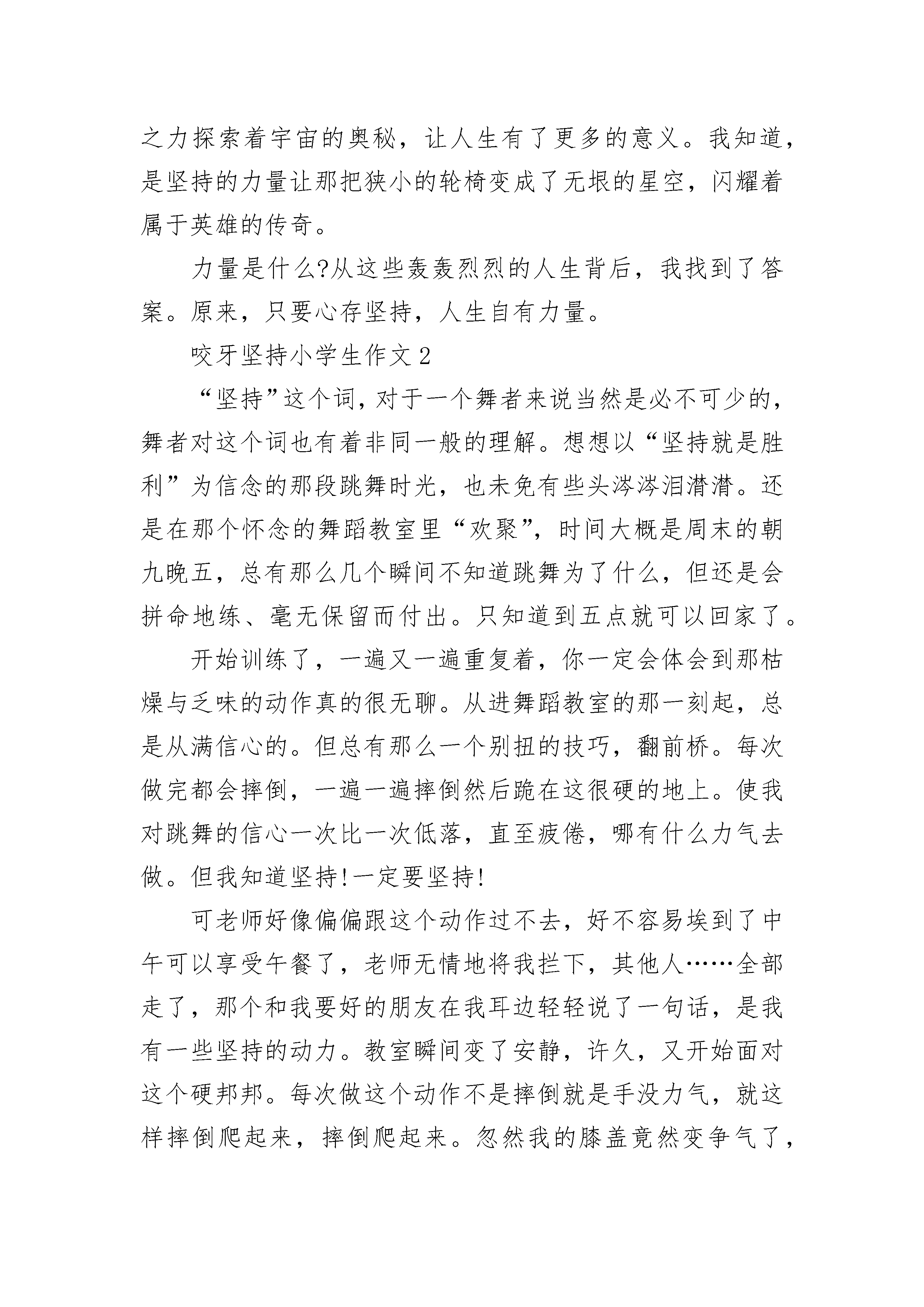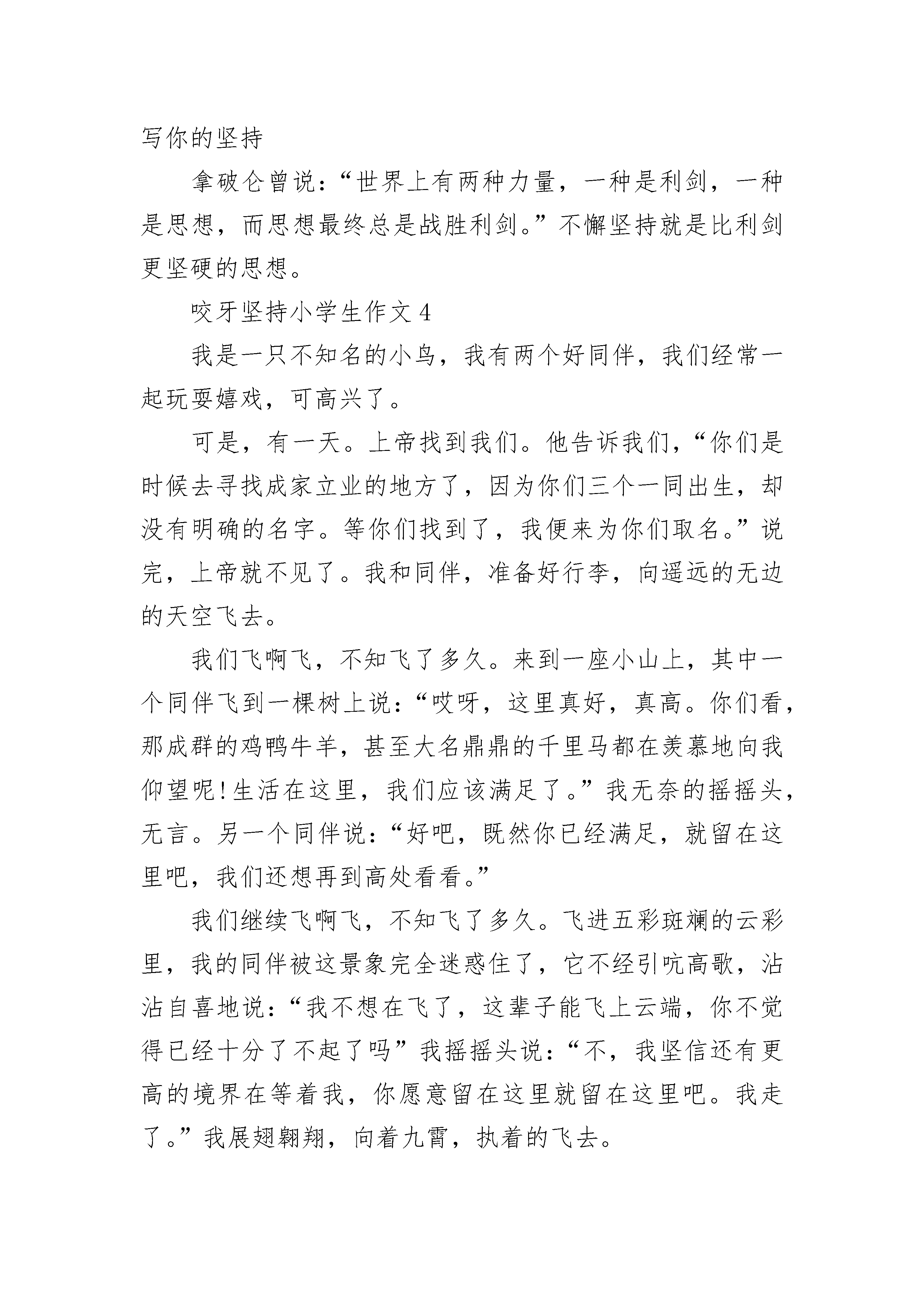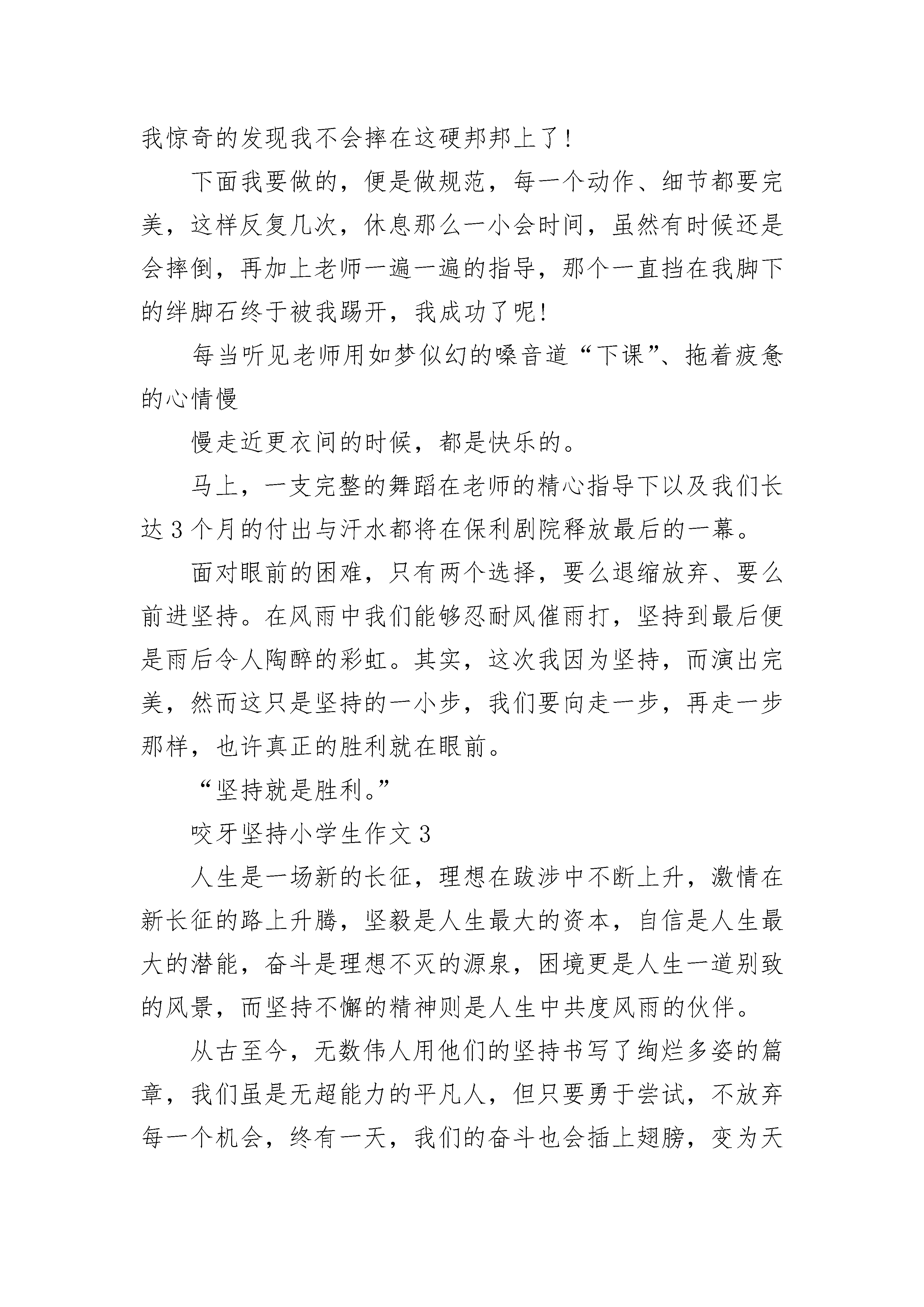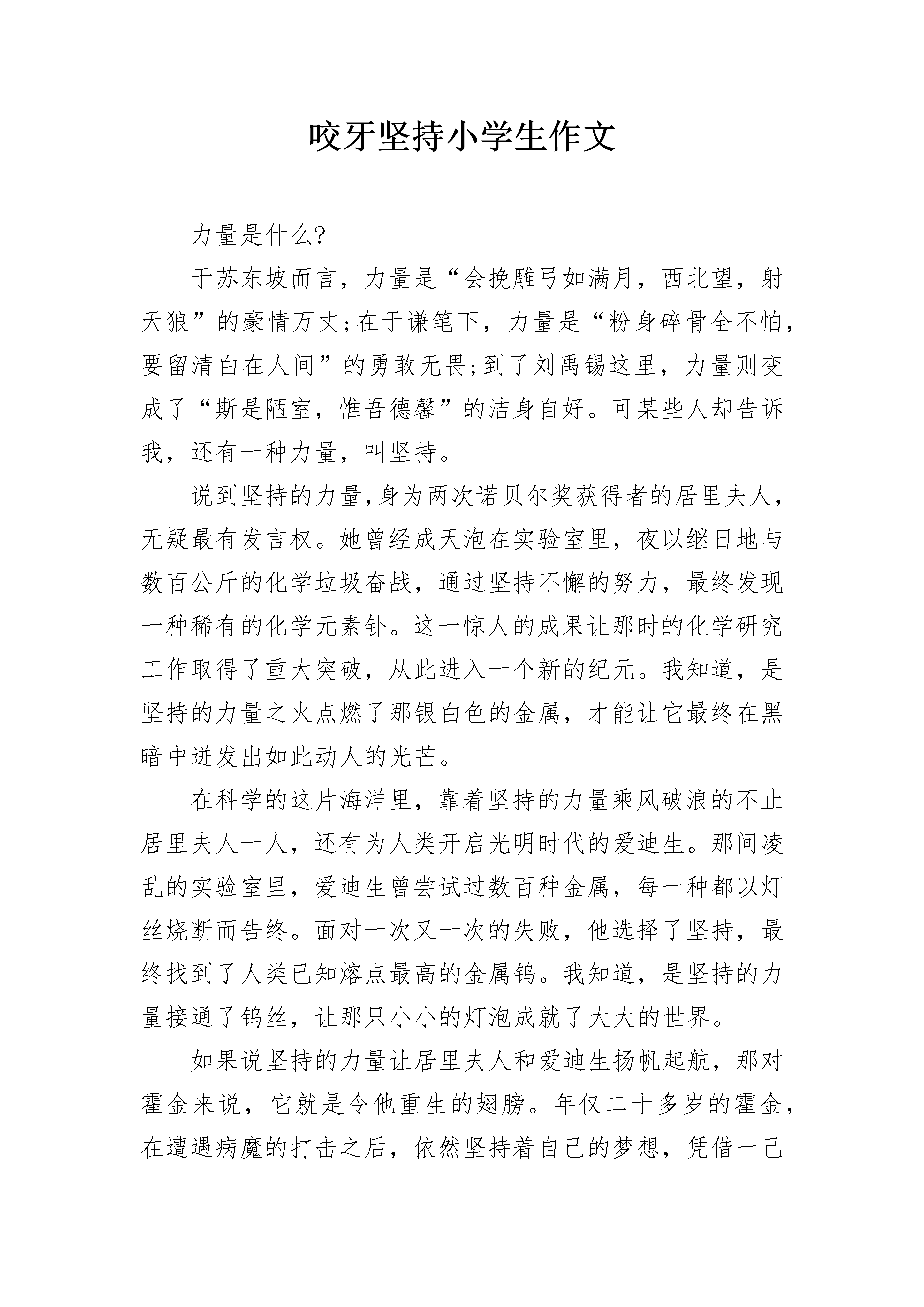 咬牙坚持小学生作文力量是什么?于苏东坡而言,力量是“会挽雕弓如满月,西北望,射天狼”的豪情万丈;在于谦笔下,力量是“粉身碎骨全不怕,要留清白在人间”的勇敢无畏;到了刘禹锡这里,力量则变成了“斯是陋室,惟吾德馨”的洁身自好。可某些人却告诉我,还有一种力量,叫坚持。说到坚持的力量,身为两次诺贝尔奖获得者的居里夫人,无疑最有发言权。她曾经成天泡在实验室里,夜以继日地与数百公斤的化学垃圾奋战,通过坚持不懈的努力,最终发现一种稀有的化学元素钋。这一惊人的成果让那时的化学研究工作取得了重大突破,从此进入一个新的纪元。我知道,是坚持的力量之火点燃了那银白色的金属,才能让它最终在黑暗中迸发出如此动人的光芒。在科学的这片海洋里,靠着坚持的力量乘风破浪的不止居里夫人一人,还有为人类开启光明时代的爱迪生。那间凌乱的实验室里,爱迪生曾尝试过数百种金属,每一种都以灯丝烧断而告终。面对一次又一次的失败,他选择了坚持,最终找到了人类已知熔点最高的金属钨。我知道,是坚持的力量接通了钨丝,让那只小小的灯泡成就了大大的世界。如果说坚持的力量让居里夫人和爱迪生扬帆起航,那对霍金来说,它就是令他重生的翅膀。年仅二十多岁的霍金,在遭遇病魔的打击之后,依然坚持着自己的梦想,凭借一己之力探索着宇宙的奥秘,让人生有了更多的意义。我知道,是坚持的力量让那把狭小的轮椅变成了无垠的星空,闪耀着属于英雄的传奇。力量是什么?从这些轰轰烈烈的人生背后,我找到了答案。原来,只要心存坚持,人生自有力量。咬牙坚持小学生作文2“坚持”这个词,对于一个舞者来说当然是必不可少的,舞者对这个词也有着非同一般的理解。想想以“坚持就是胜利”为信念的那段跳舞时光,也未免有些头涔涔泪潸潸。还是在那个怀念的舞蹈教室里“欢聚”,时间大概是周末的朝九晚五,总有那么几个瞬间不知道跳舞为了什么,但还是会拼命地练、毫无保留而付出。只知道到五点就可以回家了。开始训练了,一遍又一遍重复着,你一定会体会到那枯燥与乏味的动作真的很无聊。从进舞蹈教室的那一刻起,总是从满信心的。但总有那么一个别扭的技巧,翻前桥。每次做完都会摔倒,一遍一遍摔倒然后跪在这很硬的地上。使我对跳舞的信心一次比一次低落,直至疲倦,哪有什么力气去做。但我知道坚持!一定要坚持!可老师好像偏偏跟这个动作过不去,好不容易埃到了中午可以享受午餐了,老师无情地将我拦下,其他人……全部走了,那个和我要好的朋友在我耳边轻轻说了一句话,是我有一些坚持的动力。教室瞬间变了安静,许久,又开始面对这个硬邦邦。每次做这个动作不是摔倒就是手没力气,就这样摔倒爬起来,摔倒爬起来。忽然我的膝盖竟然变争气了,我惊奇的发现我不会摔在这硬邦邦上了!下面我要做的,便是做规范,每一个动作、细节都要完美,这样反复几次,休息那么一小会时间,虽然有时候还是会摔倒,再加上老师一遍一遍的指导,那个一直挡在我脚下的绊脚石终于被我踢开,我成功了呢!每当听见老师用如梦似幻的嗓音道“下课”、拖着疲惫的心情慢慢走近更衣间的时候,都是快乐的。马上,一支完整的舞蹈在老师的精心指导下以及我们长达3个月的付出与汗水都将在保利剧院释放最后的一幕。面对眼前的困难,只有两个选择,要么退缩放弃、要么前进坚持。在风雨中我们能够忍耐风催雨打,坚持到最后便是雨后令人陶醉的彩虹。其实,这次我因为坚持,而演出完美,然而这只是坚持的一小步,我们要向走一步,再走一步那样,也许真正的胜利就在眼前。“坚持就是胜利。”咬牙坚持小学生作文3人生是一场新的长征,理想在跋涉中不断上升,激情在新长征的路上升腾,坚毅是人生最大的资本,自信是人生最大的潜能,奋斗是理想不灭的源泉,困境更是人生一道别致的风景,而坚持不懈的精神则是人生中共度风雨的伙伴。从古至今,无数伟人用他们的坚持书写了绚烂多姿的篇章,我们虽是无超能力的平凡人,但只要勇于尝试,不放弃每一个机会,终有一天,我们的奋斗也会插上翅膀,变为天空中的风筝,飞向远方。提到80后90后,人们常会运用“温室花朵”来形容,认为这些年轻人毫无担当能力,遇到困难就会退缩。而一位80后用他的故事证明了这个观点是片面的、不正确的。韩庚,一位偶像明星。在这光环的另一面,你又知道他曾经走过的道路吗?韩庚从小酷爱舞蹈,在父母的支持下,他获得了许多荣誉,就在此时,他决定前往韩国,去学习更精湛的舞技。然而,现实并不如人所愿,在人生地不熟的国度,他白天上课,晚上打工,由于生活的困难,他有时会捡食别人丢掉的馒头。在此困境下,他没有灰心,他告诉自己,要用自己的努力在这里挣得一席之地。韩庚在训练时,时常会弄伤自己,但他从未想过放弃,每当母亲打来电话询问生活境况时,他总说:“妈,在这边一切都好,别担心。”就在这艰难的情况下,韩庚用自己坚强的信念、不懈的努力,取得了今天事业上的辉煌。也许道路是曲折的、漫长的,但旅途是光明美好的。短道速滑冠军周洋