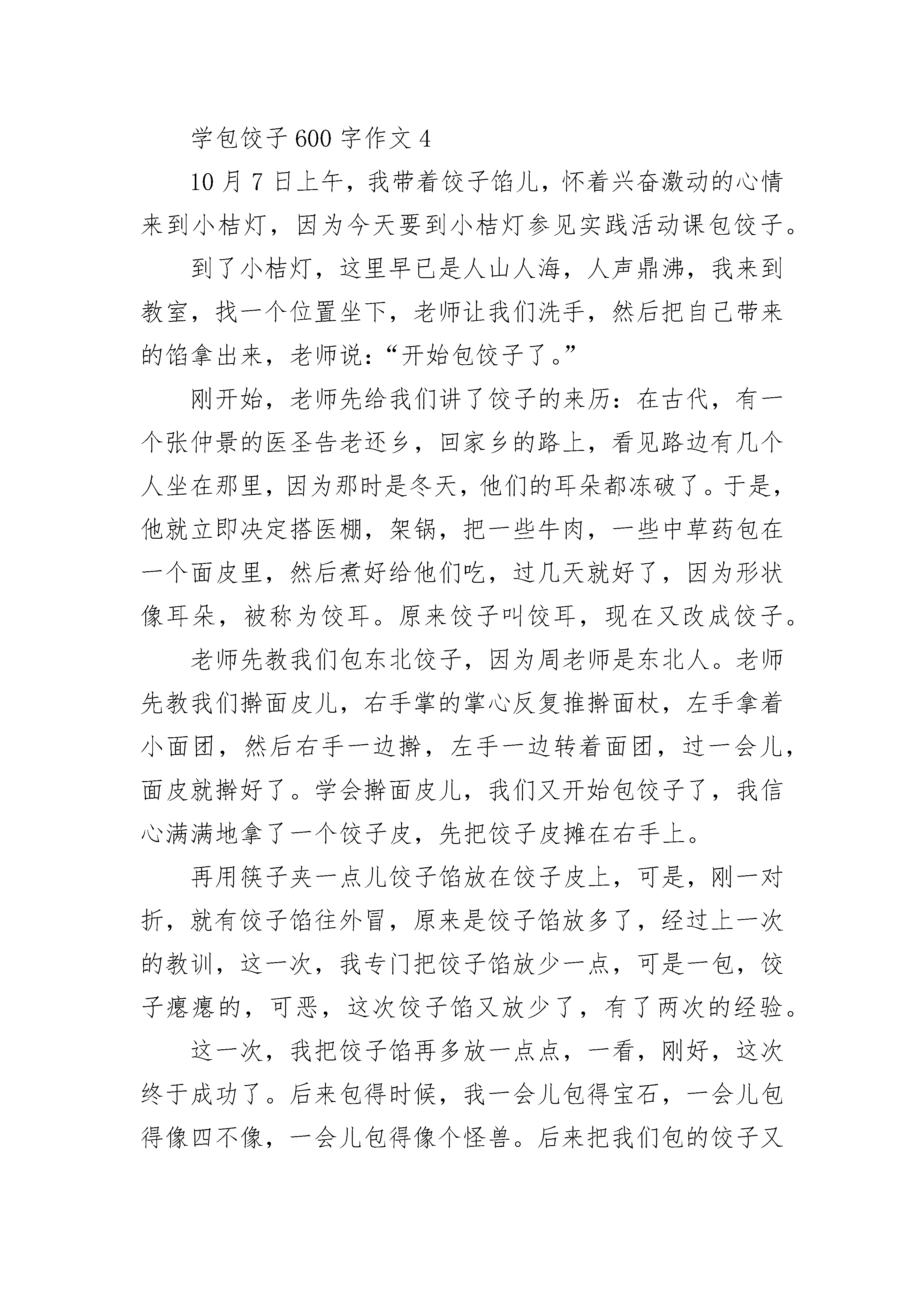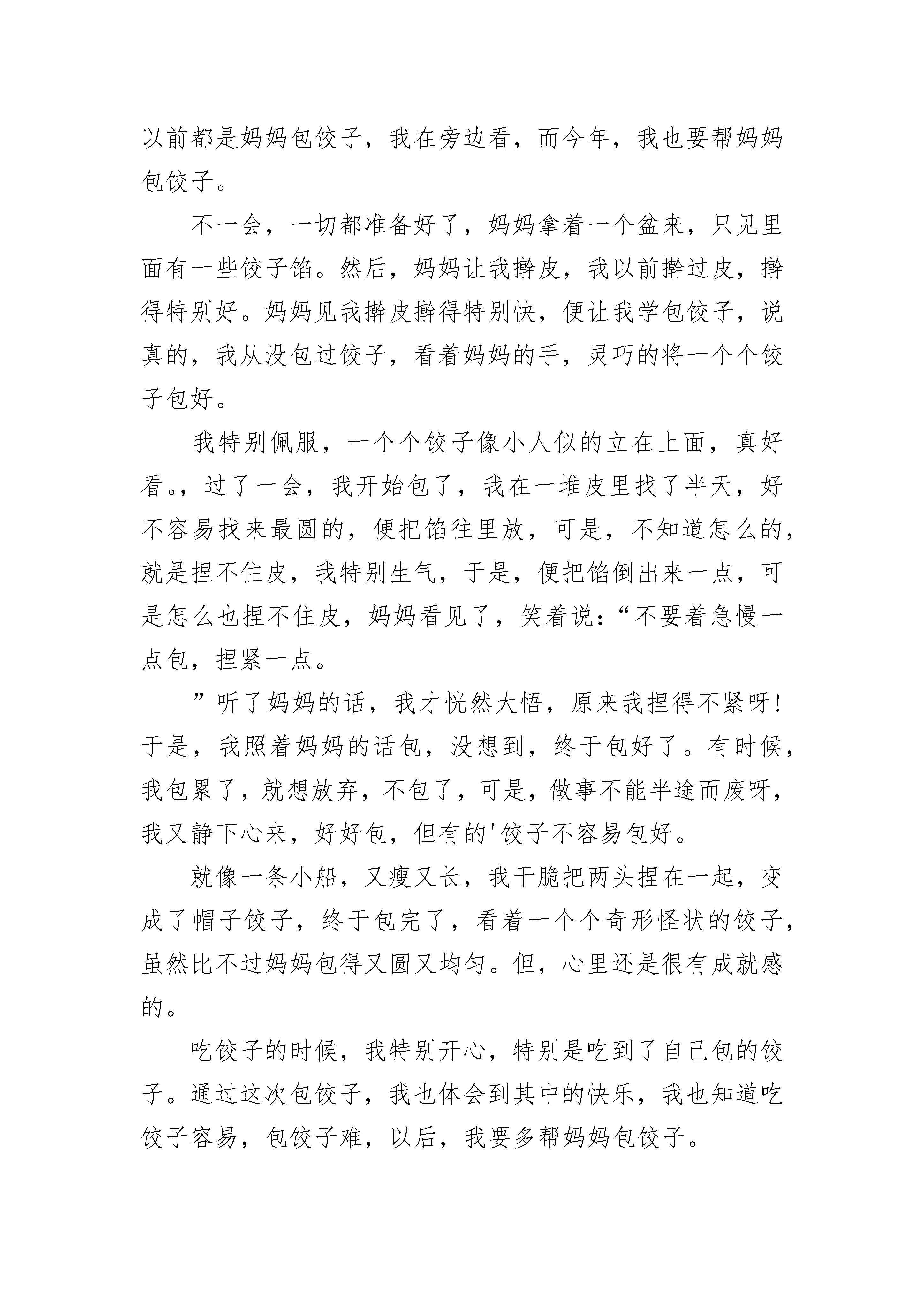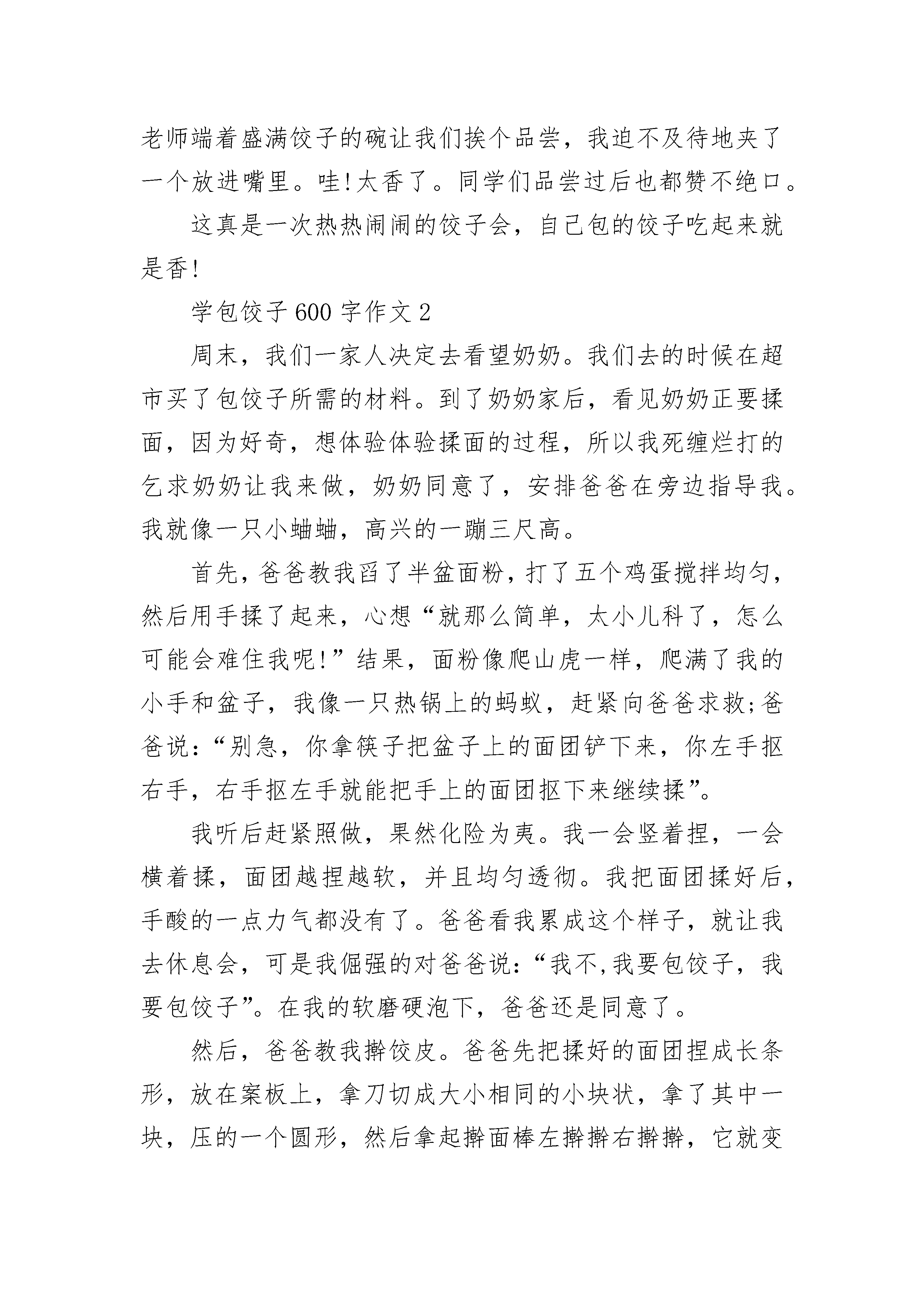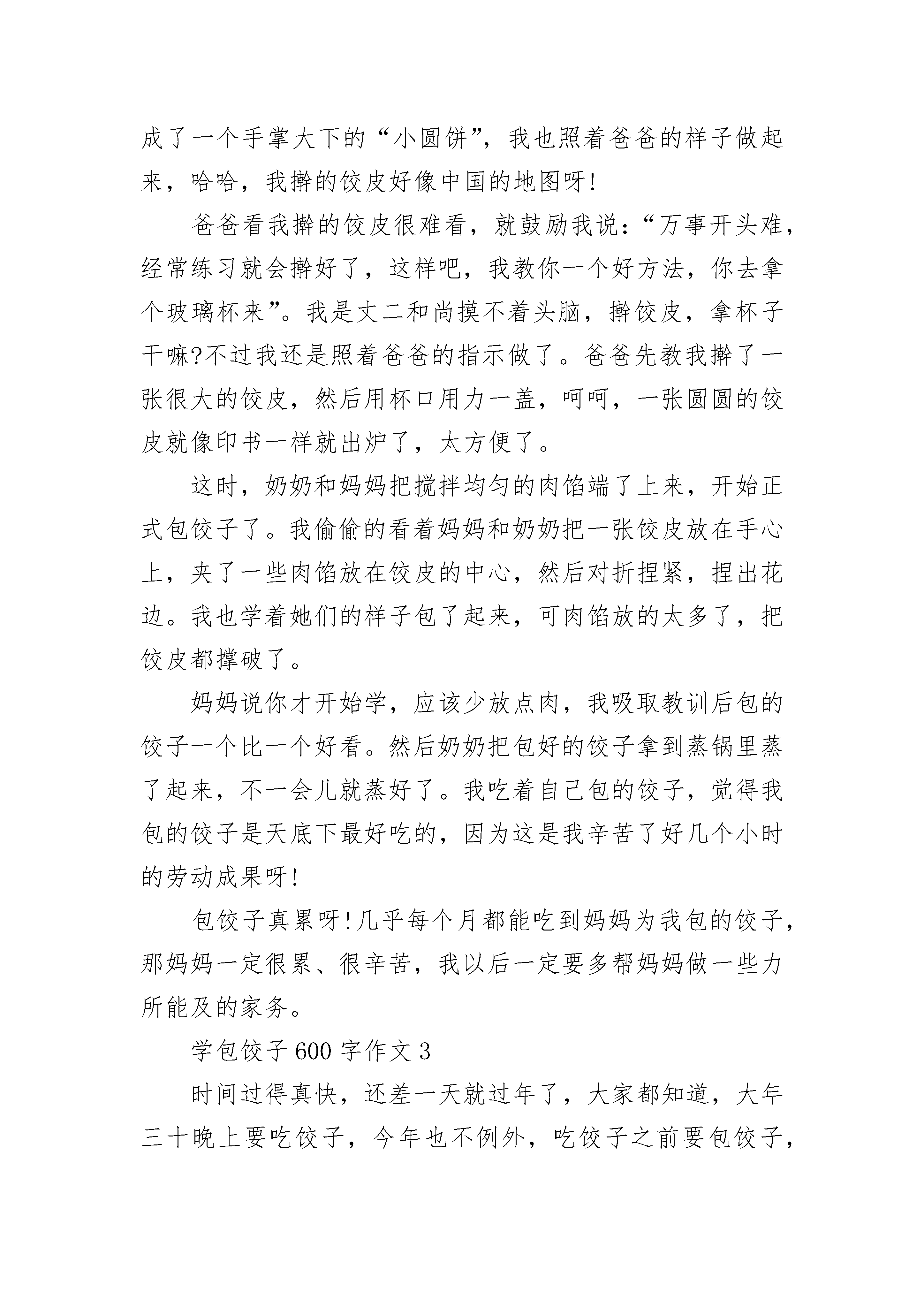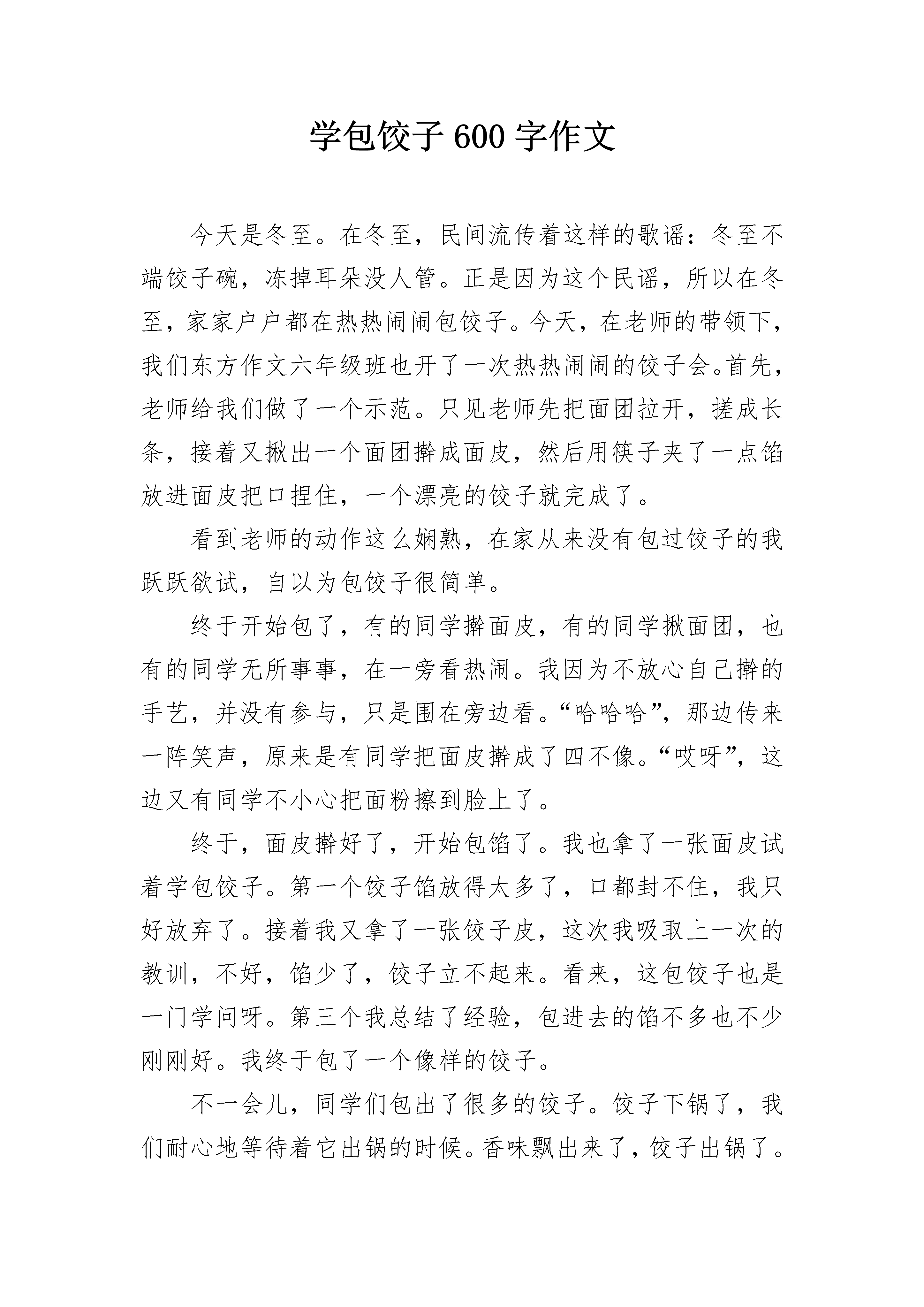 学包饺子600字作文今天是冬至。在冬至,民间流传着这样的歌谣:冬至不端饺子碗,冻掉耳朵没人管。正是因为这个民谣,所以在冬至,家家户户都在热热闹闹包饺子。今天,在老师的带领下,我们东方作文六年级班也开了一次热热闹闹的饺子会。首先,老师给我们做了一个示范。只见老师先把面团拉开,搓成长条,接着又揪出一个面团擀成面皮,然后用筷子夹了一点馅放进面皮把口捏住,一个漂亮的饺子就完成了。看到老师的动作这么娴熟,在家从来没有包过饺子的我跃跃欲试,自以为包饺子很简单。终于开始包了,有的同学擀面皮,有的同学揪面团,也有的同学无所事事,在一旁看热闹。我因为不放心自己擀的手艺,并没有参与,只是围在旁边看。“哈哈哈”,那边传来一阵笑声,原来是有同学把面皮擀成了四不像。“哎呀”,这边又有同学不小心把面粉擦到脸上了。终于,面皮擀好了,开始包馅了。我也拿了一张面皮试着学包饺子。第一个饺子馅放得太多了,口都封不住,我只好放弃了。接着我又拿了一张饺子皮,这次我吸取上一次的教训,不好,馅少了,饺子立不起来。看来,这包饺子也是一门学问呀。第三个我总结了经验,包进去的馅不多也不少刚刚好。我终于包了一个像样的饺子。不一会儿,同学们包出了很多的饺子。饺子下锅了,我们耐心地等待着它出锅的时候。香味飘出来了,饺子出锅了。老师端着盛满饺子的碗让我们挨个品尝,我迫不及待地夹了一个放进嘴里。哇!太香了。同学们品尝过后也都赞不绝口。这真是一次热热闹闹的饺子会,自己包的饺子吃起来就是香!学包饺子600字作文2周末,我们一家人决定去看望奶奶。我们去的时候在超市买了包饺子所需的材料。到了奶奶家后,看见奶奶正要揉面,因为好奇,想体验体验揉面的过程,所以我死缠烂打的乞求奶奶让我来做,奶奶同意了,安排爸爸在旁边指导我。我就像一只小蛐蛐,高兴的一蹦三尺高。首先,爸爸教我舀了半盆面粉,打了五个鸡蛋搅拌均匀,然后用手揉了起来,心想“就那么简单,太小儿科了,怎么可能会难住我呢!”结果,面粉像爬山虎一样,爬满了我的小手和盆子,我像一只热锅上的蚂蚁,赶紧向爸爸求救;爸爸说:“别急,你拿筷子把盆子上的面团铲下来,你左手抠右手,右手抠左手就能把手上的面团抠下来继续揉”。我听后赶紧照做,果然化险为夷。我一会竖着捏,一会横着揉,面团越捏越软,并且均匀透彻。我把面团揉好后,手酸的一点力气都没有了。爸爸看我累成这个样子,就让我去休息会,可是我倔强的对爸爸说:“我不,我要包饺子,我要包饺子”。在我的软磨硬泡下,爸爸还是同意了。然后,爸爸教我擀饺皮。爸爸先把揉好的面团捏成长条形,放在案板上,拿刀切成大小相同的小块状,拿了其中一块,压的一个圆形,然后拿起擀面棒左擀擀右擀擀,它就变成了一个手掌大下的“小圆饼”,我也照着爸爸的样子做起来,哈哈,我擀的饺皮好像中国的地图呀!爸爸看我擀的饺皮很难看,就鼓励我说:“万事开头难,经常练习就会擀好了,这样吧,我教你一个好方法,你去拿个玻璃杯来”。我是丈二和尚摸不着头脑,擀饺皮,拿杯子干嘛?不过我还是照着爸爸的指示做了。爸爸先教我擀了一张很大的饺皮,然后用杯口用力一盖,呵呵,一张圆圆的饺皮就像印书一样就出炉了,太方便了。这时,奶奶和妈妈把搅拌均匀的肉馅端了上来,开始正式包饺子了。我偷偷的看着妈妈和奶奶把一张饺皮放在手心上,夹了一些肉馅放在饺皮的中心,然后对折捏紧,捏出花边。我也学着她们的样子包了起来,可肉馅放的太多了,把饺皮都撑破了。妈妈说你才开始学,应该少放点肉,我吸取教训后包的饺子一个比一个好看。然后奶奶把包好的饺子拿到蒸锅里蒸了起来,不一会儿就蒸好了。我吃着自己包的饺子,觉得我包的饺子是天底下最好吃的,因为这是我辛苦了好几个小时的劳动成果呀!包饺子真累呀!几乎每个月都能吃到妈妈为我包的饺子,那妈妈一定很累、很辛苦,我以后一定要多帮妈妈做一些力所能及的家务。学包饺子600字作文3时间过得真快,还差一天就过年了,大家都知道,大年三十晚上要吃饺子,今年也不例外,吃饺子之前要包饺子,以前都是妈妈包饺子,我在旁边看,而今年,我也要帮妈妈包饺子。不一会,一切都准备好了,妈妈拿着一个盆来,只见里面有一些饺子馅。然后,妈妈让我擀皮,我以前擀过皮,擀得特别好。妈妈见我擀皮擀得特别快,便让我学包饺子,说真的,我从没包过饺子,看着妈妈的手,灵巧的将一个个饺子包好。我特别佩服,一个个饺子像小人似的立在上面,真好看。,过了一会,我开始包了,我在一堆皮里找了半天,好不容易找来最圆的,便把馅往里放,可是,不知道怎么的,就是捏不住皮,我特别生气,于是,便把馅倒出来一点,可是怎么也捏不住皮,妈妈看见了,笑着说:“不要着急慢一点包,捏紧一点。”听了妈妈的话,我才恍然大悟,原来我捏得不紧呀!于是,我照着妈妈的话包,没想到,终于包好了。有时候,我包累了,就想放弃,不包了,可是,做事不能半途而废呀,我又静下心来,好好包,但有