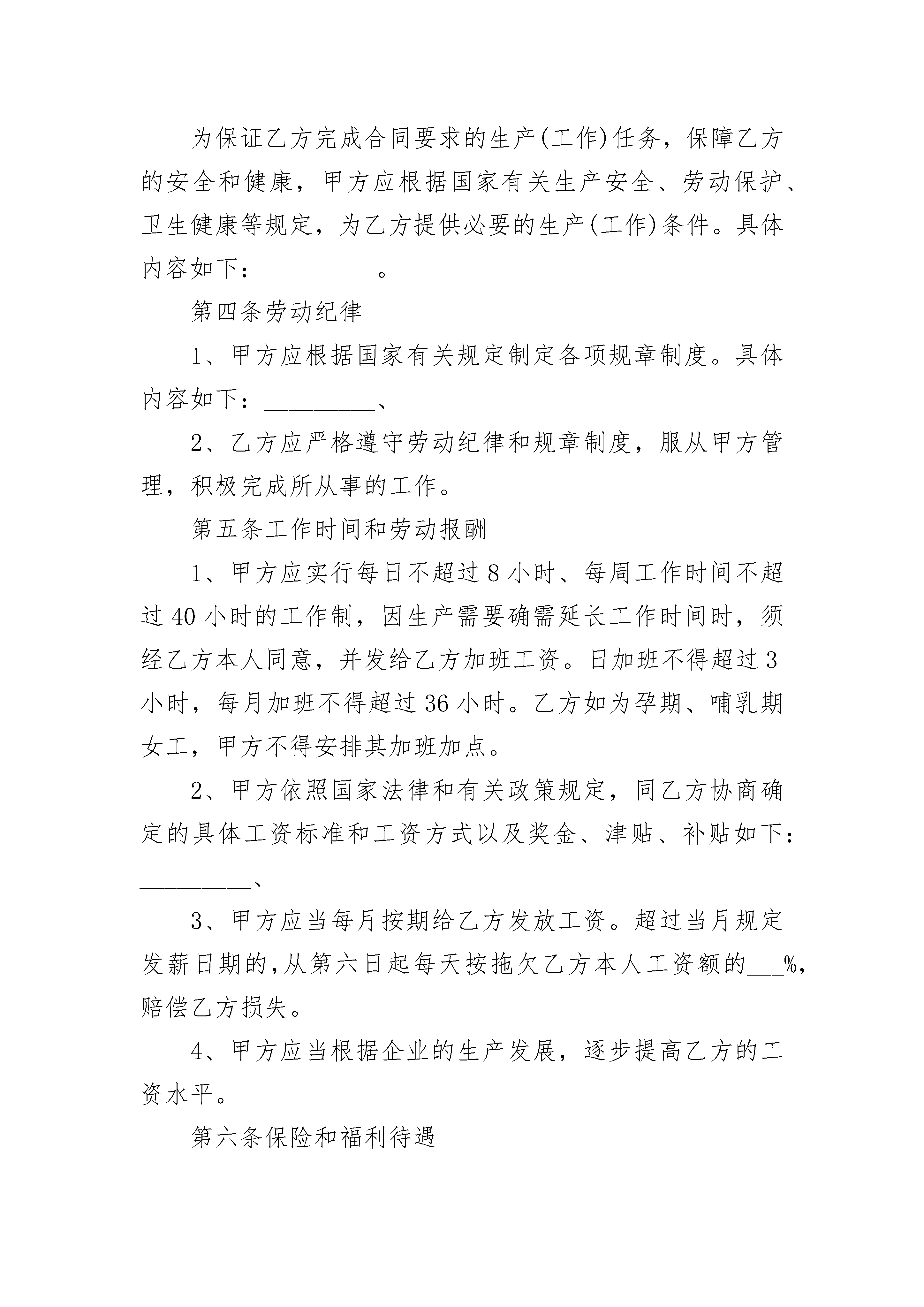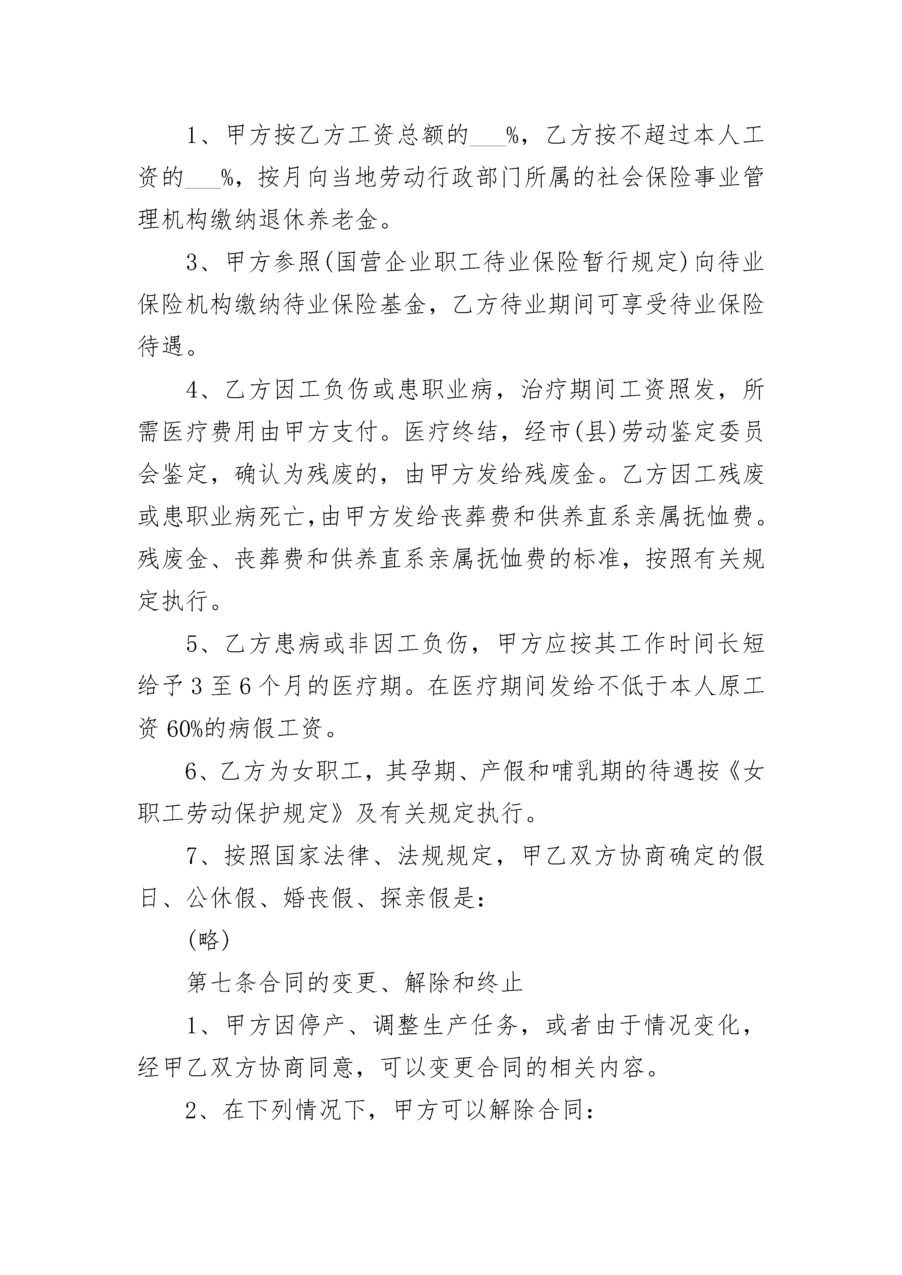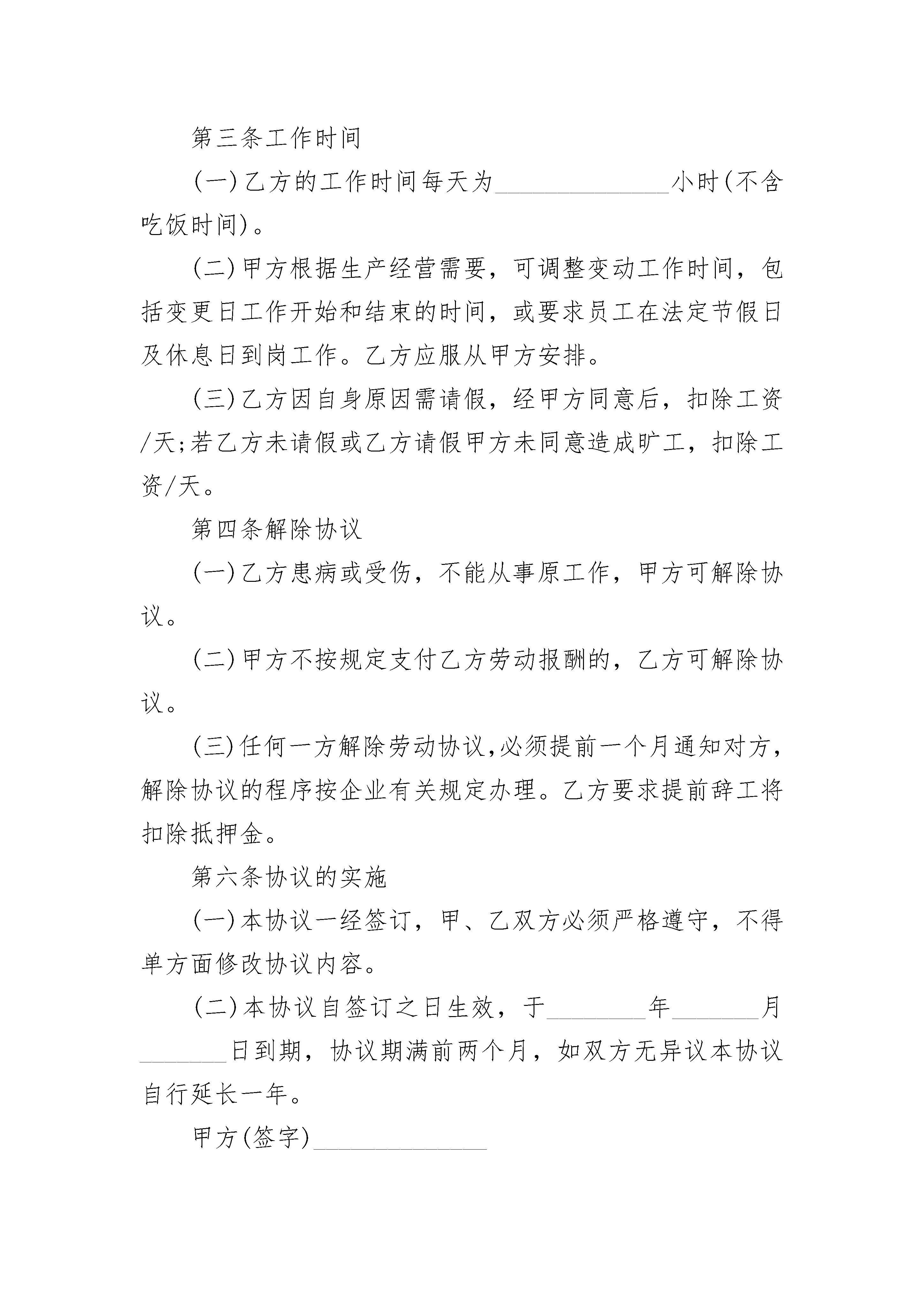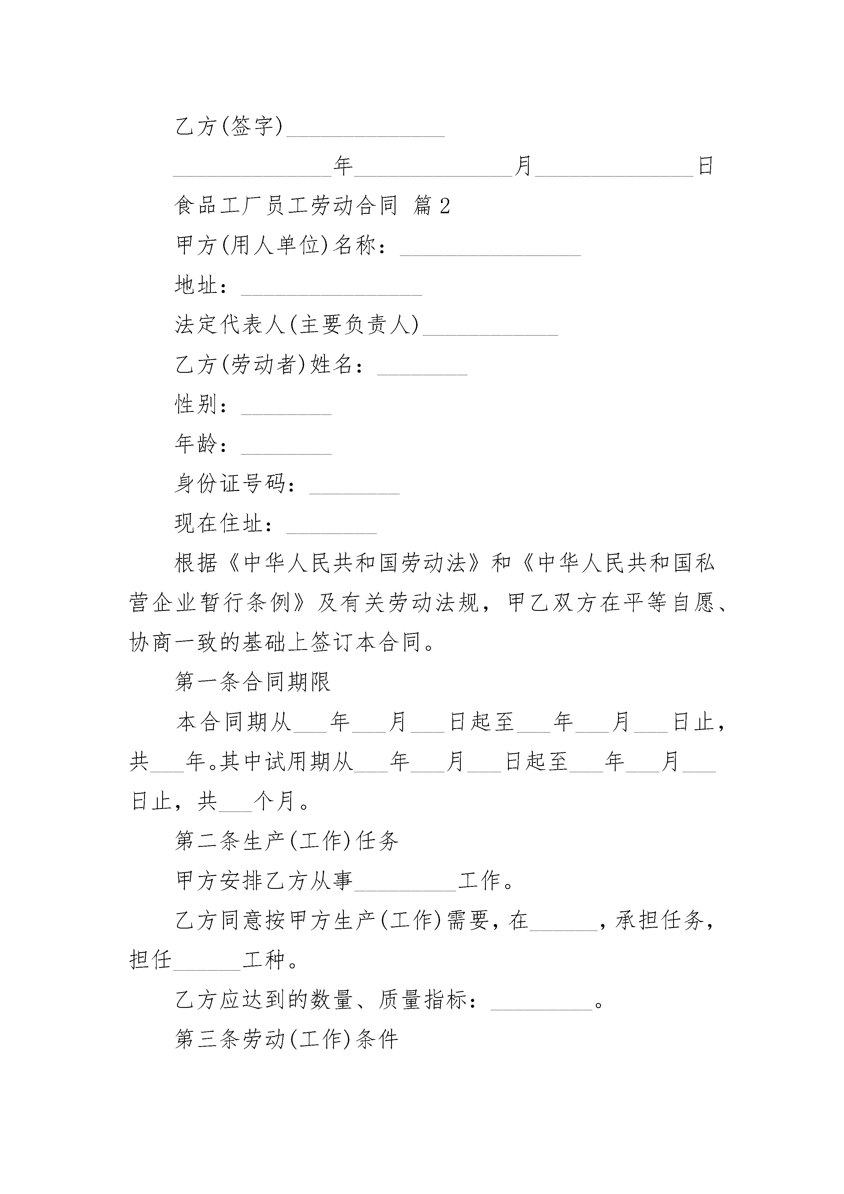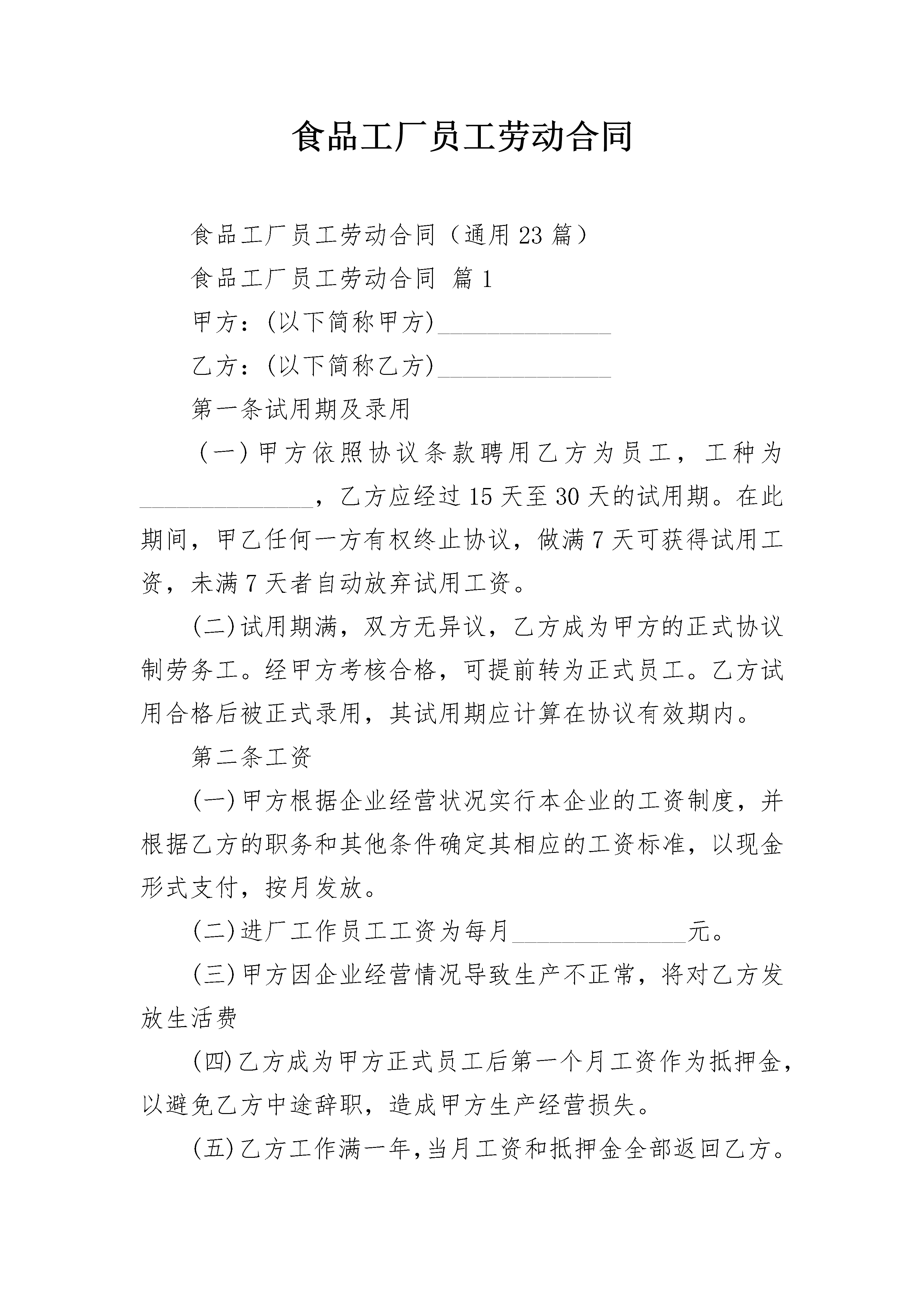食品工厂员工劳动合同食品工厂员工劳动合同(通用23篇)食品工厂员工劳动合同篇1甲方:(以下简称甲方)______________乙方:(以下简称乙方)______________第一条试用期及录用(一)甲方依照协议条款聘用乙方为员工,工种为______________,乙方应经过15天至30天的试用期。在此期间,甲乙任何一方有权终止协议,做满7天可获得试用工资,未满7天者自动放弃试用工资。(二)试用期满,双方无异议,乙方成为甲方的正式协议制劳务工。经甲方考核合格,可提前转为正式员工。乙方试用合格后被正式录用,其试用期应计算在协议有效期内。第二条工资(一)甲方根据企业经营状况实行本企业的工资制度,并根据乙方的职务和其他条件确定其相应的工资标准,以现金形式支付,按月发放。(二)进厂工作员工工资为每月______________元。(三)甲方因企业经营情况导致生产不正常,将对乙方发放生活费(四)乙方成为甲方正式员工后第一个月工资作为抵押金,以避免乙方中途辞职,造成甲方生产经营损失。(五)乙方工作满一年,当月工资和抵押金全部返回乙方。第三条工作时间(一)乙方的工作时间每天为______________小时(不含吃饭时间)。(二)甲方根据生产经营需要,可调整变动工作时间,包括变更日工作开始和结束的时间,或要求员工在法定节假日及休息日到岗工作。乙方应服从甲方安排。(三)乙方因自身原因需请假,经甲方同意后,扣除工资/天;若乙方未请假或乙方请假甲方未同意造成旷工,扣除工资/天。第四条解除协议(一)乙方患病或受伤,不能从事原工作,甲方可解除协议。(二)甲方不按规定支付乙方劳动报酬的,乙方可解除协议。(三)任何一方解除劳动协议,必须提前一个月通知对方,解除协议的程序按企业有关规定办理。乙方要求提前辞工将扣除抵押金。第六条协议的实施(一)本协议一经签订,甲、乙双方必须严格遵守,不得单方面修改协议内容。(二)本协议自签订之日生效,于________年_______月_______日到期,协议期满前两个月,如双方无异议本协议自行延长一年。甲方(签字)______________乙方(签字)____________________________年______________月______________日食品工厂员工劳动合同篇2甲方(用人单位)名称:________________地址:________________法定代表人(主要负责人)____________乙方(劳动者)姓名:________性别:________年龄:________身份证号码:________现在住址:________根据《中华人民共和国劳动法》和《中华人民共和国私营企业暂行条例》及有关劳动法规,甲乙双方在平等自愿、协商一致的基础上签订本合同。第一条合同期限本合同期从___年___月___日起至___年___月___日止,共___年。其中试用期从___年___月___日起至___年___月___日止,共___个月。第二条生产(工作)任务甲方安排乙方从事_________工作。乙方同意按甲方生产(工作)需要,在______,承担任务,担任______工种。乙方应达到的数量、质量指标:_________。第三条劳动(工作)条件为保证乙方完成合同要求的生产(工作)任务,保障乙方的安全和健康,甲方应根据国家有关生产安全、劳动保护、卫生健康等规定,为乙方提供必要的生产(工作)条件。具体内容如下:_________。第四条劳动纪律1、甲方应根据国家有关规定制定各项规章制度。具体内容如下:_________、2、乙方应严格遵守劳动纪律和规章制度,服从甲方管理,积极完成所从事的工作。第五条工作时间和劳动报酬1、甲方应实行每日不超过8小时、每周工作时间不超过40小时的工作制,因生产需要确需延长工作时间时,须经乙方本人同意,并发给乙方加班工资。日加班不得超过3小时,每月加班不得超过36小时。乙方如为孕期、哺乳期女工,甲方不得安排其加班加点。2、甲方依照国家法律和有关政策规定,同乙方协商确定的具体工资标准和工资方式以及奖金、津贴、补贴如下:_________、3、甲方应当每月按期给乙方发放工资。超过当月规定发薪日期的,从第六日起每天按拖欠乙方本人工资额的___%,赔偿乙方损失。4、甲方应当根据企业的生产发展,逐步提高乙方的工资水平。第六条保险和福利待遇1、甲方按乙方工资总额的___%,乙方按不超过本人工资的___%,按月向当地劳动行政部门所属的社会保险事业管理机构缴纳退休养老金。3、甲方参照(国营企业职工待业保险暂行规定)向待业保险机构缴纳待业保险基金,乙方待业期间可享受待业保险待遇。4、乙方因工负伤或患职业病,治疗期间工资照发,所需医疗费用由甲方支付。医疗终结,经市(县)劳动鉴定委员会鉴定