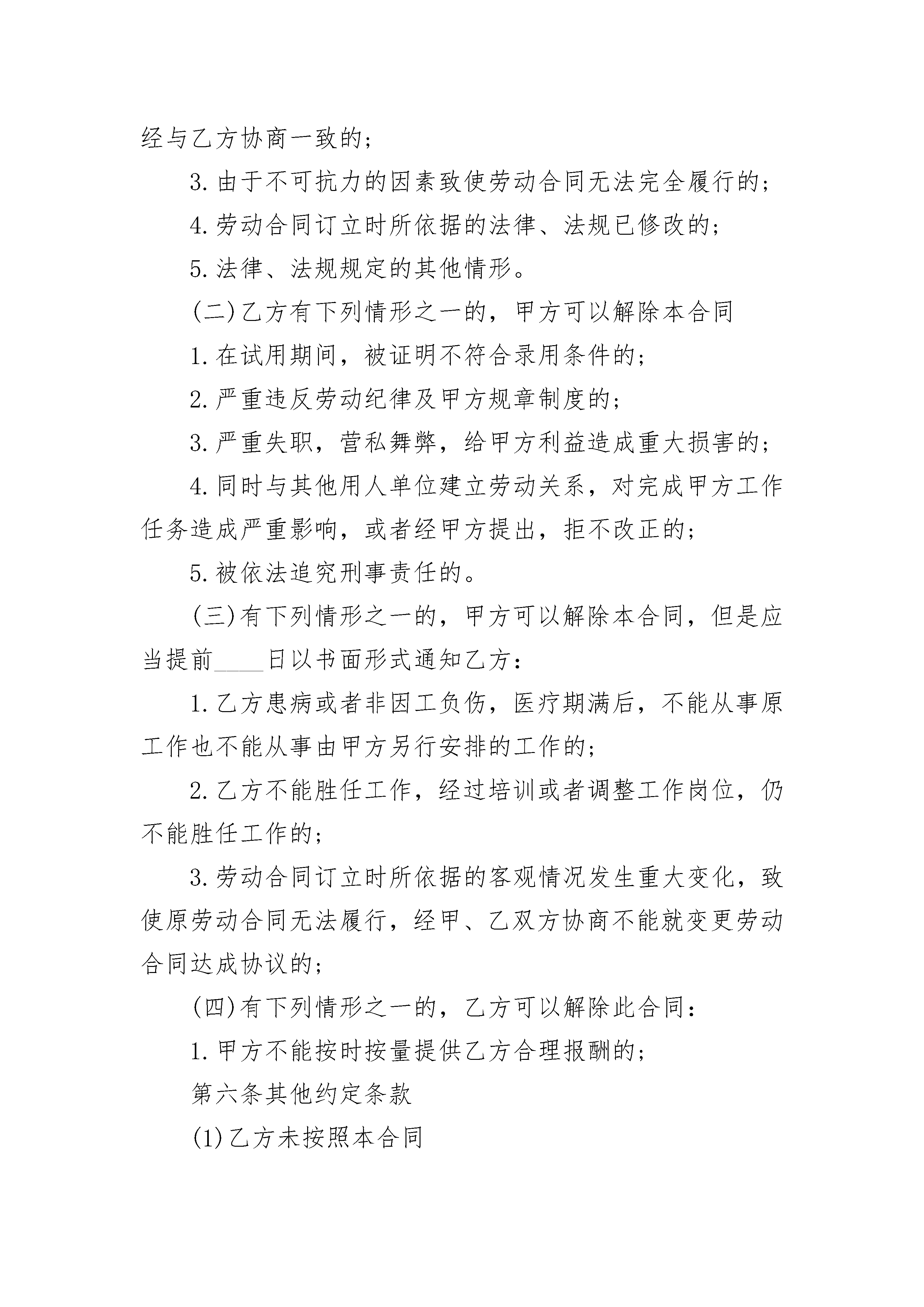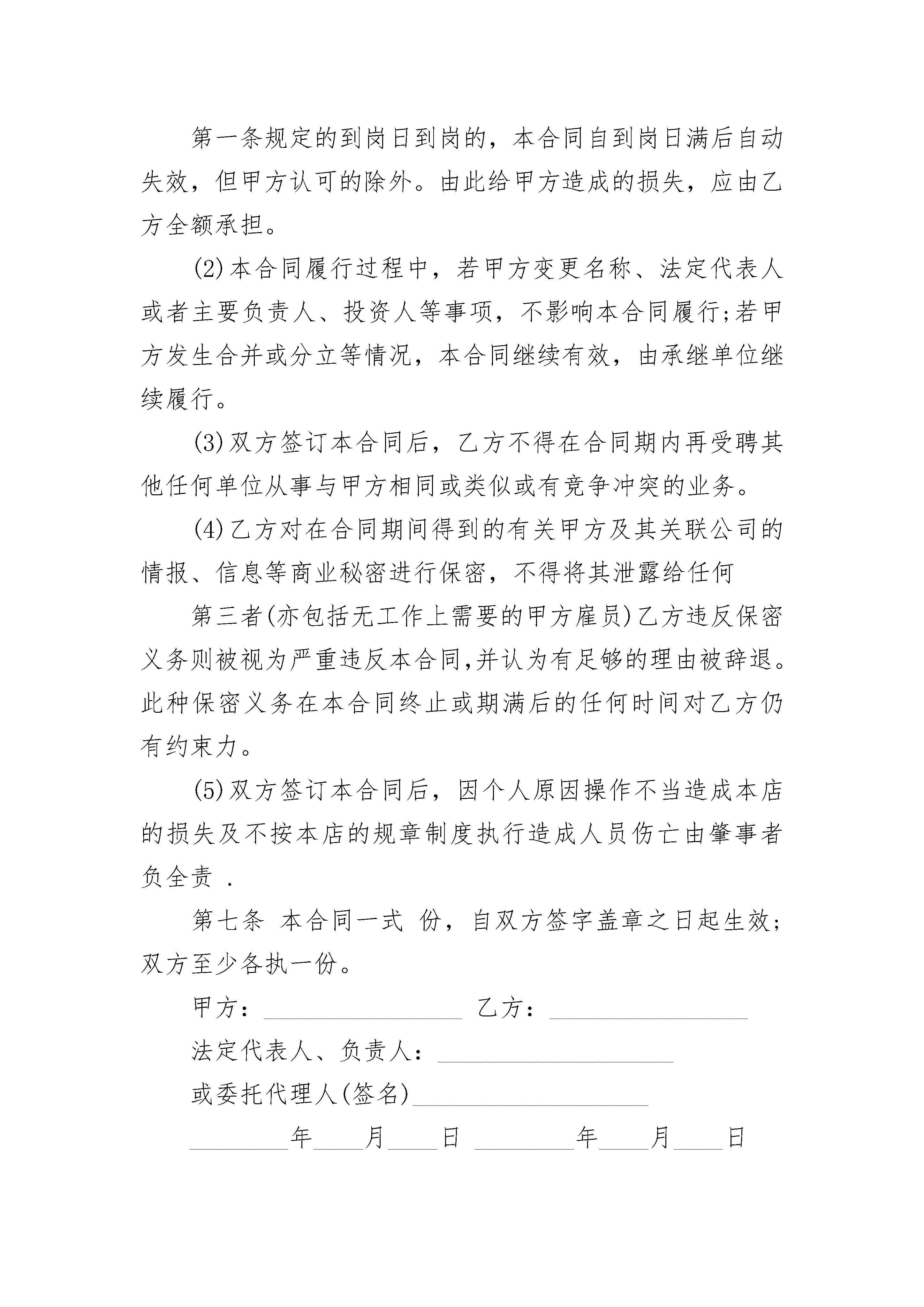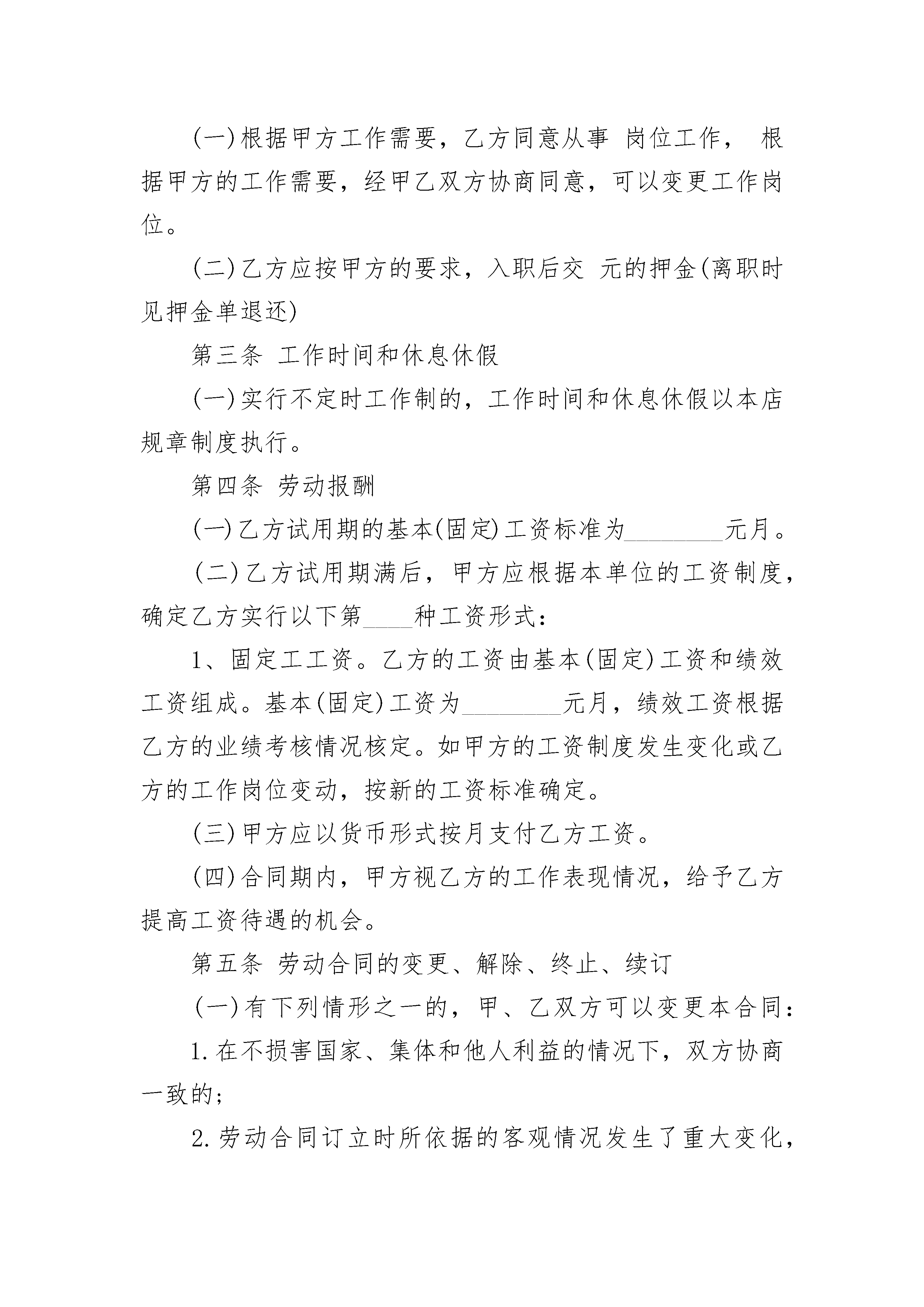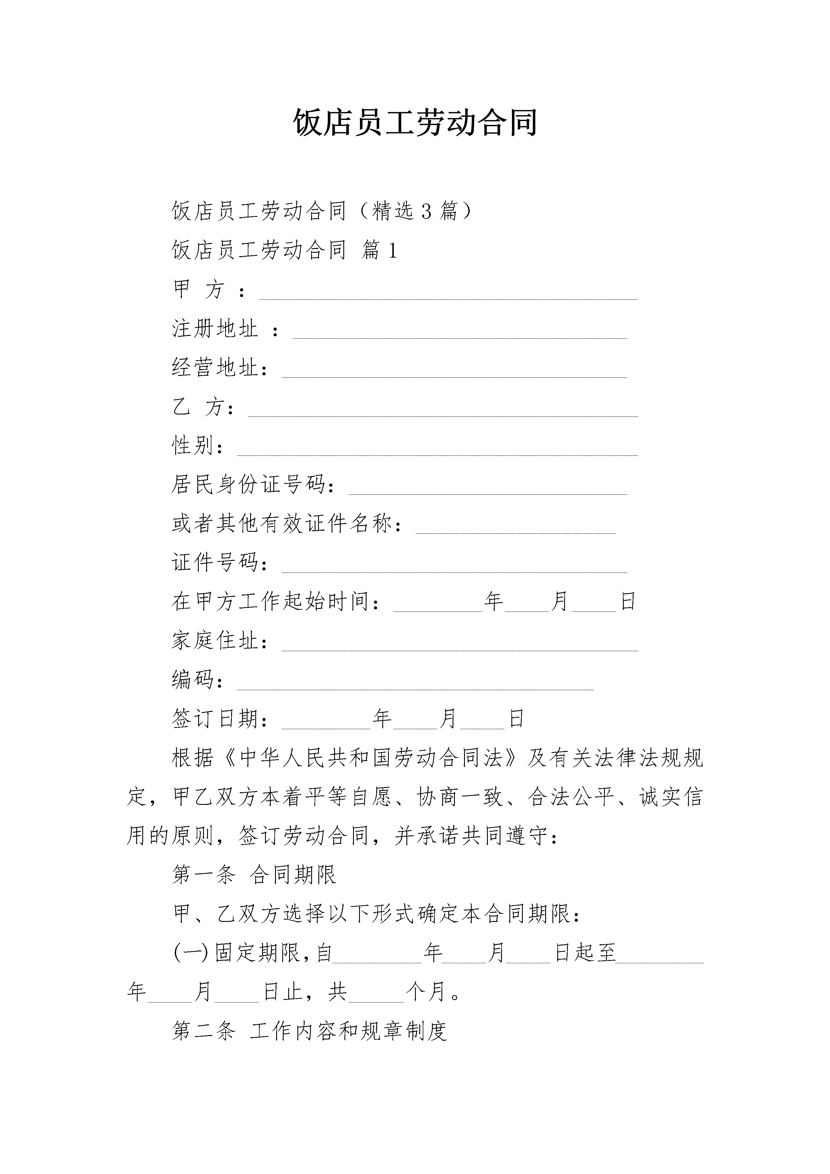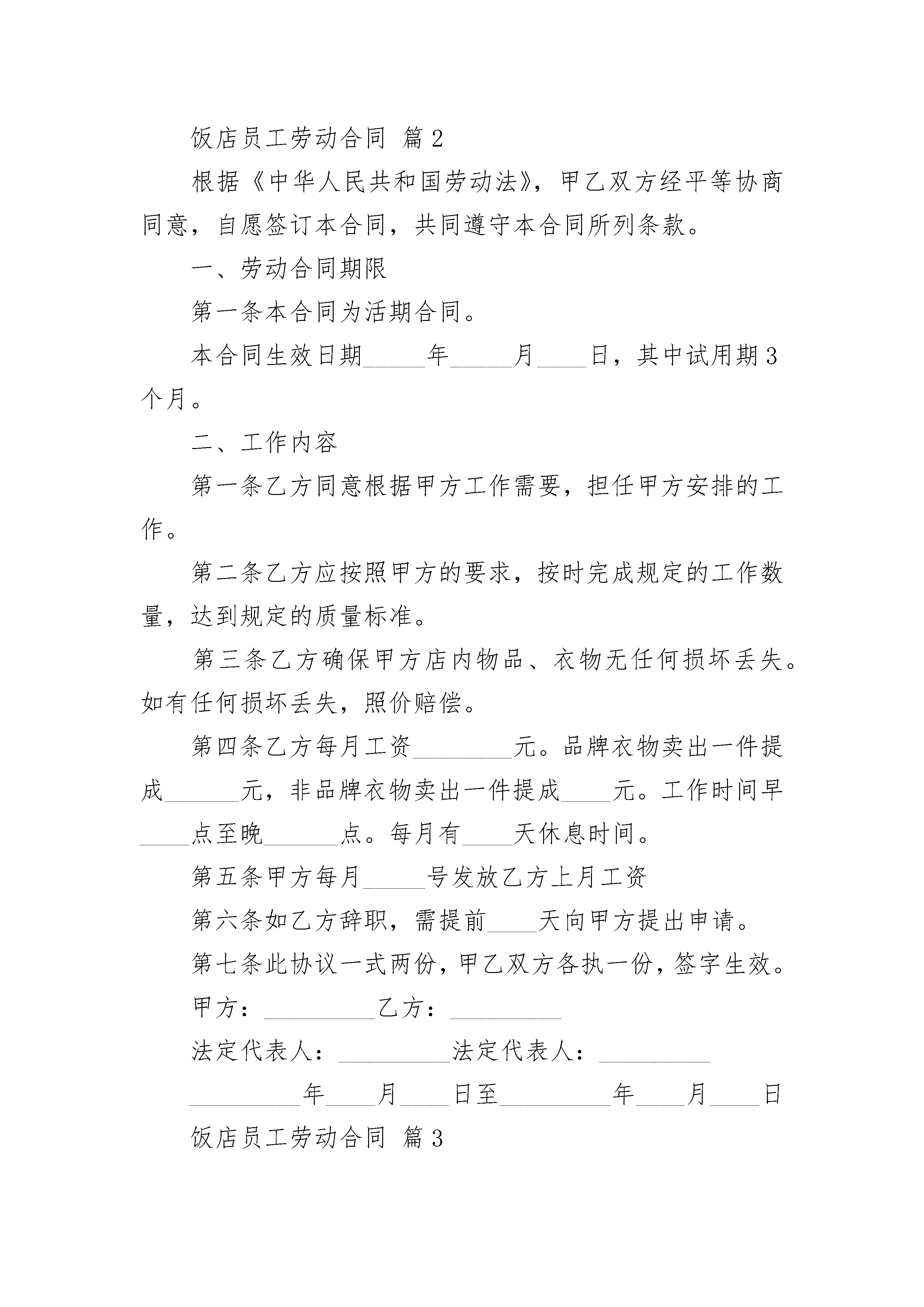 饭店员工劳动合同饭店员工劳动合同(精选3篇)饭店员工劳动合同篇1甲方:__________________________________注册地址:______________________________经营地址:_______________________________乙方:___________________________________性别:____________________________________居民身份证号码:_________________________或者其他有效证件名称:__________________证件号码:_______________________________在甲方工作起始时间:________年____月____日家庭住址:________________________________编码:________________________________签订日期:________年____月____日根据《中华人民共和国劳动合同法》及有关法律法规规定,甲乙双方本着平等自愿、协商一致、合法公平、诚实信用的原则,签订劳动合同,并承诺共同遵守:第一条合同期限甲、乙双方选择以下形式确定本合同期限:(一)固定期限,自________年____月____日起至________年____月____日止,共_____个月。第二条工作内容和规章制度(一)根据甲方工作需要,乙方同意从事岗位工作,根据甲方的工作需要,经甲乙双方协商同意,可以变更工作岗位。(二)乙方应按甲方的要求,入职后交元的押金(离职时见押金单退还)第三条工作时间和休息休假(一)实行不定时工作制的,工作时间和休息休假以本店规章制度执行。第四条劳动报酬(一)乙方试用期的基本(固定)工资标准为________元月。(二)乙方试用期满后,甲方应根据本单位的工资制度,确定乙方实行以下第____种工资形式:1、固定工工资。乙方的工资由基本(固定)工资和绩效工资组成。基本(固定)工资为________元月,绩效工资根据乙方的业绩考核情况核定。如甲方的工资制度发生变化或乙方的工作岗位变动,按新的工资标准确定。(三)甲方应以货币形式按月支付乙方工资。(四)合同期内,甲方视乙方的工作表现情况,给予乙方提高工资待遇的机会。第五条劳动合同的变更、解除、终止、续订(一)有下列情形之一的,甲、乙双方可以变更本合同:1.在不损害国家、集体和他人利益的情况下,双方协商一致的;2.劳动合同订立时所依据的客观情况发生了重大变化,经与乙方协商一致的;3.由于不可抗力的因素致使劳动合同无法完全履行的;4.劳动合同订立时所依据的法律、法规已修改的;5.法律、法规规定的其他情形。(二)乙方有下列情形之一的,甲方可以解除本合同1.在试用期间,被证明不符合录用条件的;2.严重违反劳动纪律及甲方规章制度的;3.严重失职,营私舞弊,给甲方利益造成重大损害的;4.同时与其他用人单位建立劳动关系,对完成甲方工作任务造成严重影响,或者经甲方提出,拒不改正的;5.被依法追究刑事责任的。(三)有下列情形之一的,甲方可以解除本合同,但是应当提前____日以书面形式通知乙方:1.乙方患病或者非因工负伤,医疗期满后,不能从事原工作也不能从事由甲方另行安排的工作的;2.乙方不能胜任工作,经过培训或者调整工作岗位,仍不能胜任工作的;3.劳动合同订立时所依据的客观情况发生重大变化,致使原劳动合同无法履行,经甲、乙双方协商不能就变更劳动合同达成协议的;(四)有下列情形之一的,乙方可以解除此合同:1.甲方不能按时按量提供乙方合理报酬的;第六条其他约定条款(1)乙方未按照本合同第一条规定的到岗日到岗的,本合同自到岗日满后自动失效,但甲方认可的除外。由此给甲方造成的损失,应由乙方全额承担。(2)本合同履行过程中,若甲方变更名称、法定代表人或者主要负责人、投资人等事项,不影响本合同履行;若甲方发生合并或分立等情况,本合同继续有效,由承继单位继续履行。(3)双方签订本合同后,乙方不得在合同期内再受聘其他任何单位从事与甲方相同或类似或有竞争冲突的业务。(4)乙方对在合同期间得到的有关甲方及其关联公司的情报、信息等商业秘密进行保密,不得将其泄露给任何第三者(亦包括无工作上需要的甲方雇员)乙方违反保密义务则被视为严重违反本合同,并认为有足够的理由被辞退。此种保密义务在本合同终止或期满后的任何时间对乙方仍有约束力。(5)双方签订本合同后,因个人原因操作不当造成本店的损失及不按本店的规章制度执行造成人员伤亡由肇事者负全责.第七条本合同一式份,自双方签字盖章之日起生效;双方至少各执一份。甲方:________________乙方:________________法定代表人、负责人:____________
