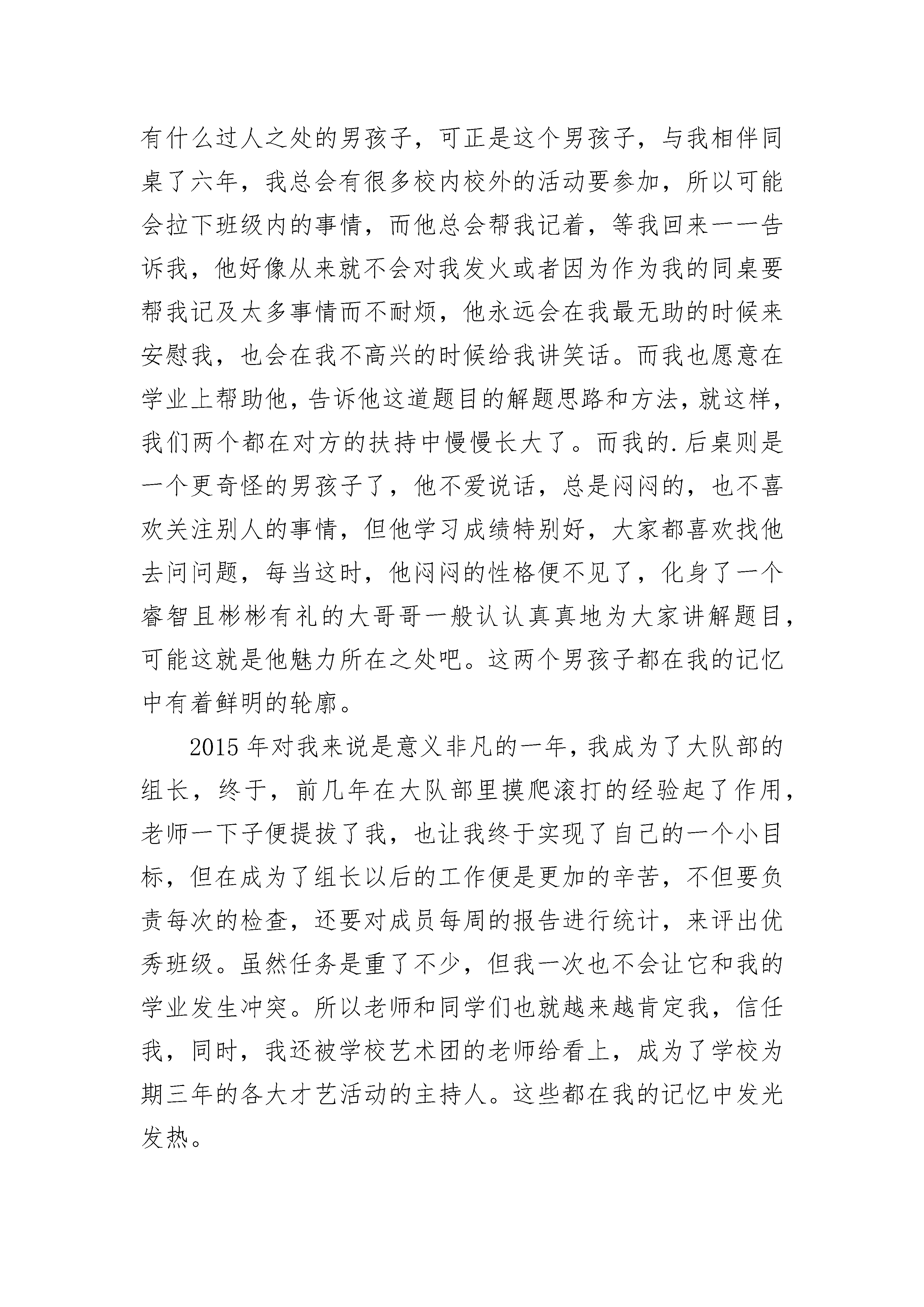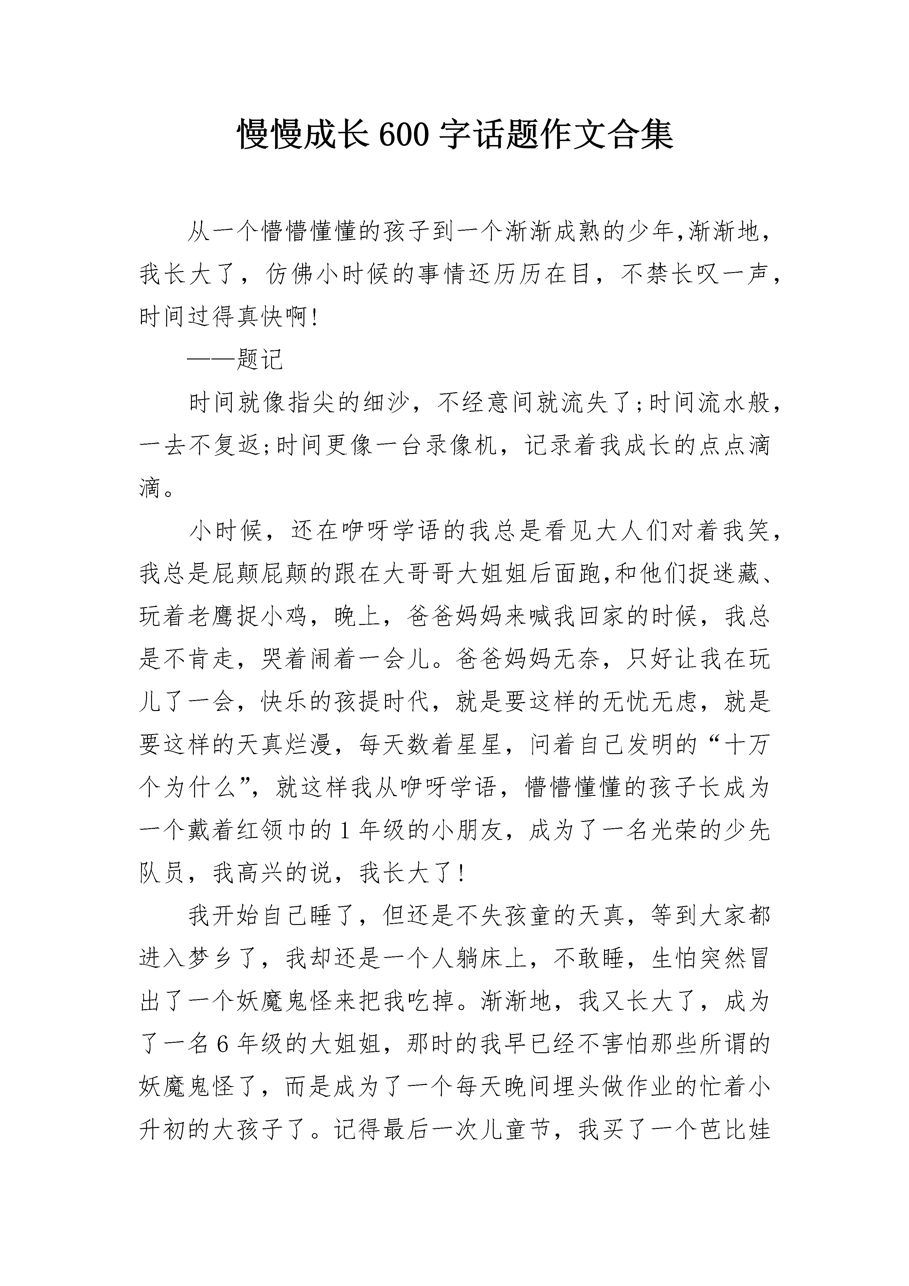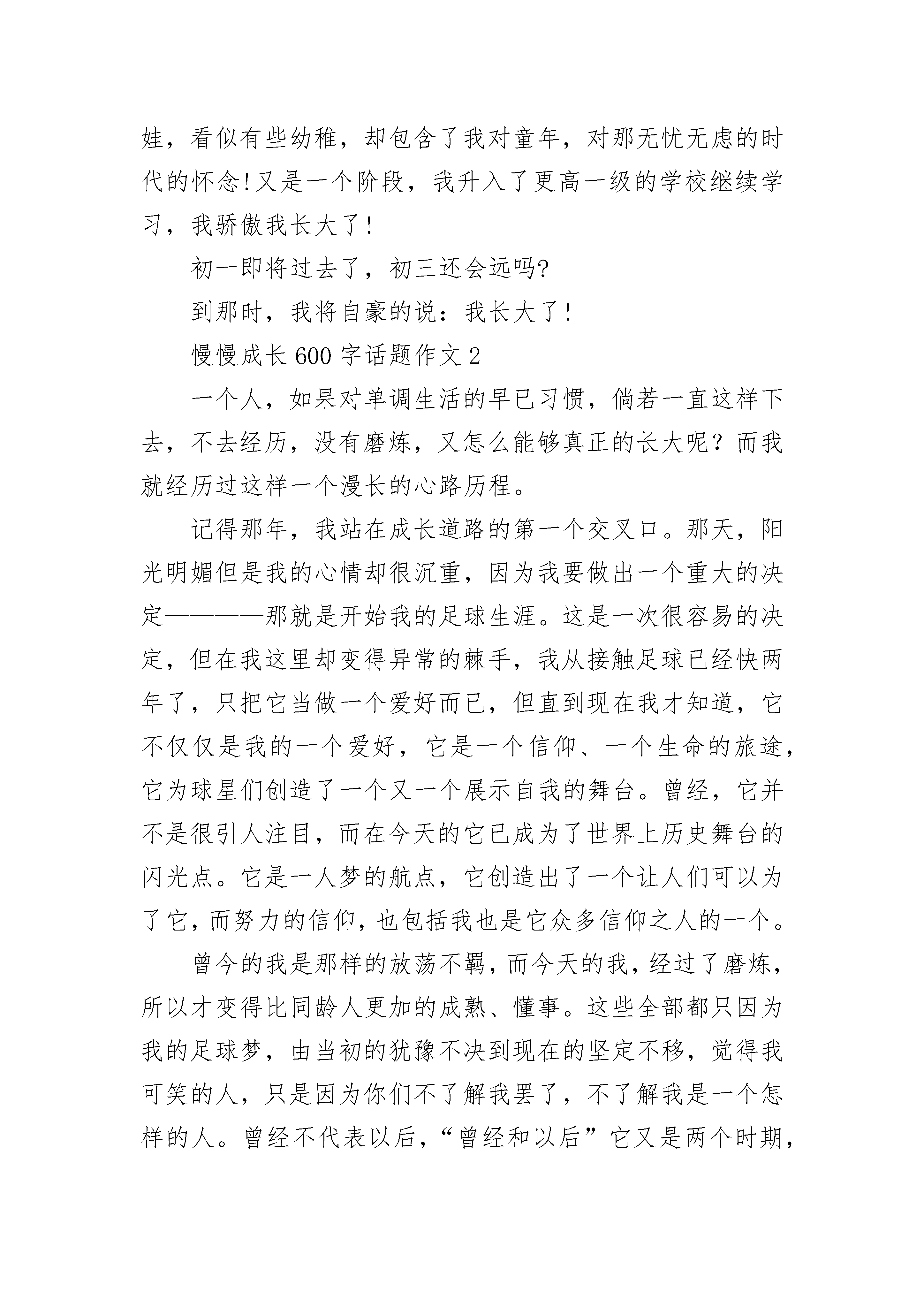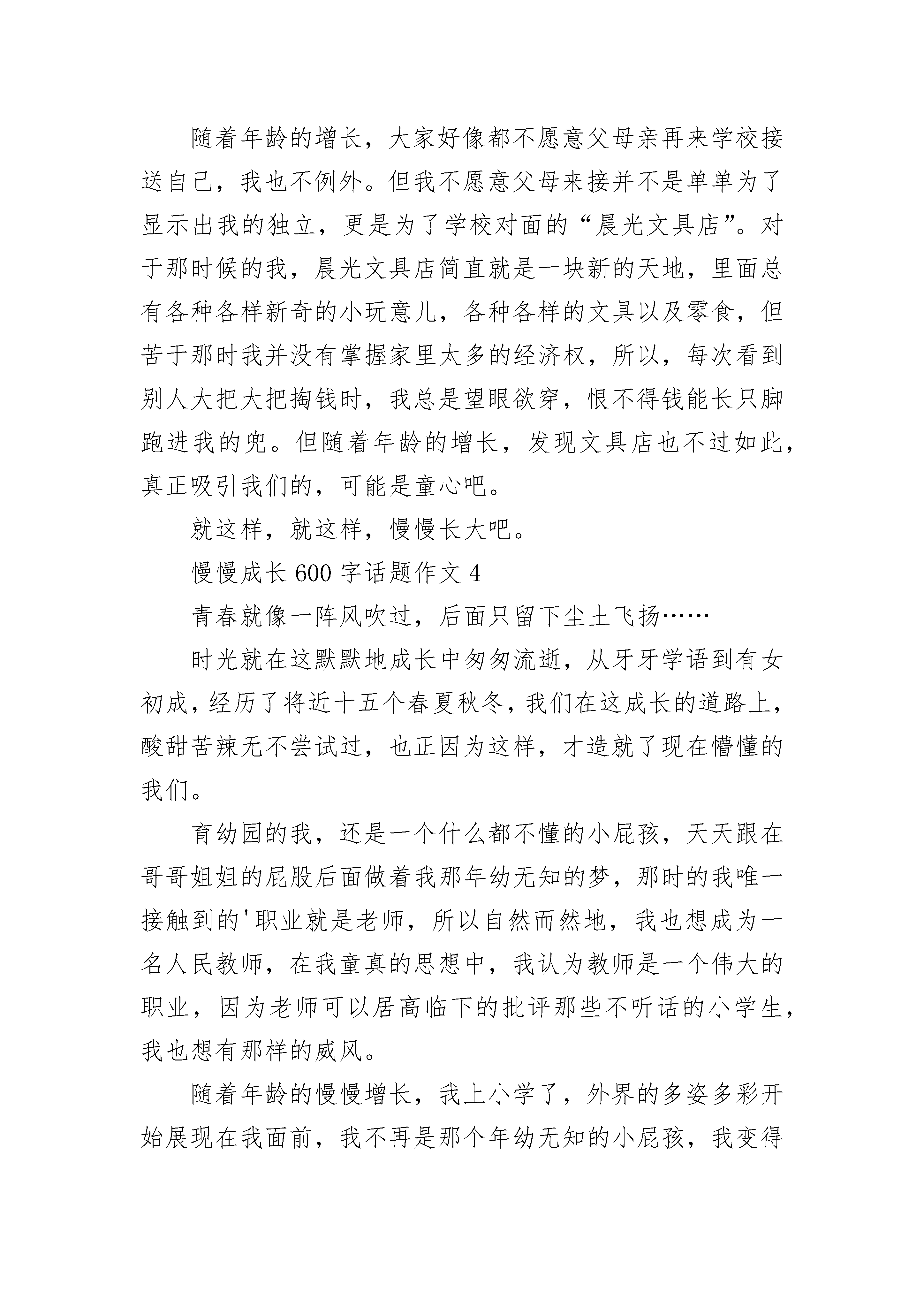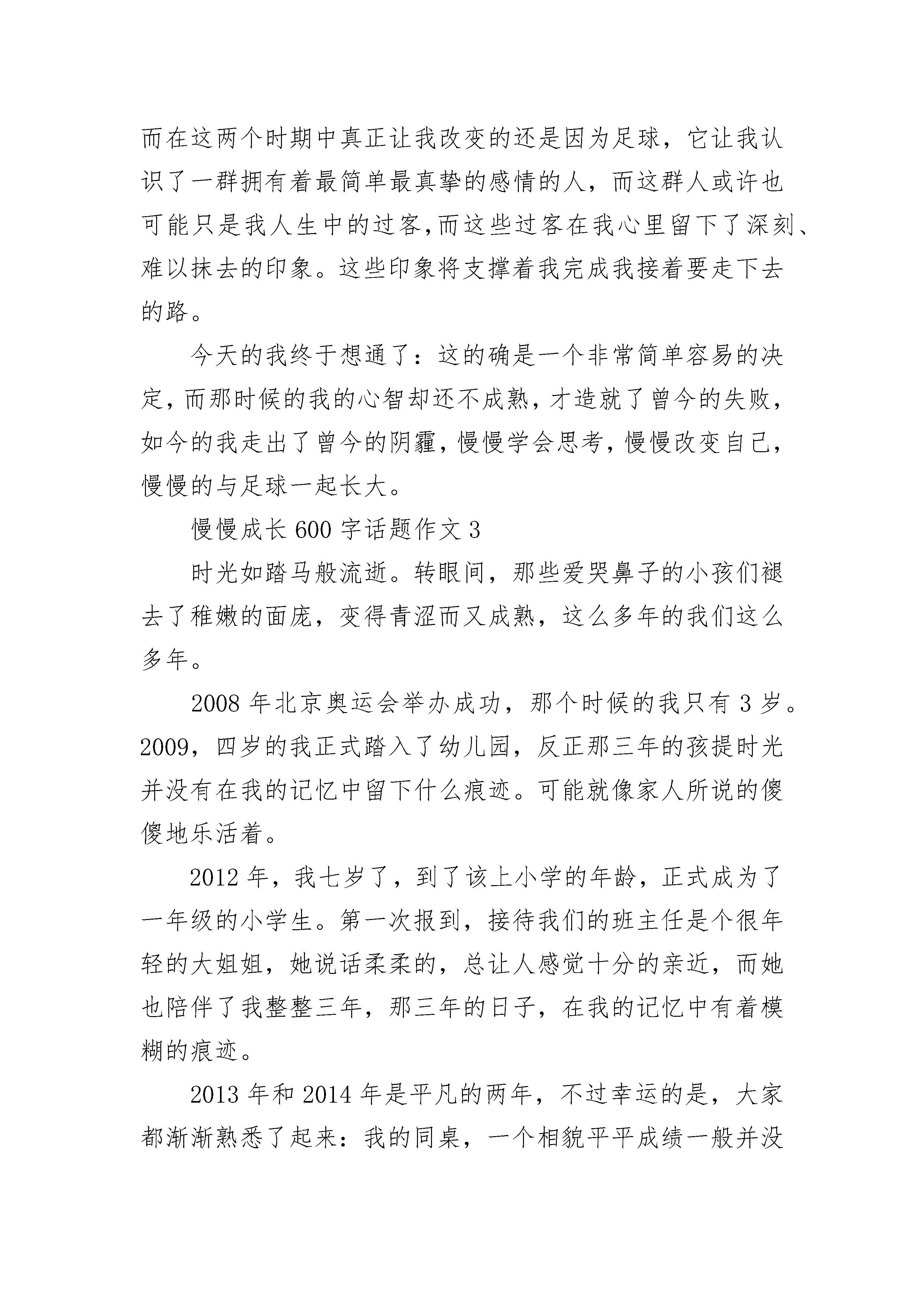 慢慢成长600字话题作文合集从一个懵懵懂懂的孩子到一个渐渐成熟的少年,渐渐地,我长大了,仿佛小时候的事情还历历在目,不禁长叹一声,时间过得真快啊!——题记时间就像指尖的细沙,不经意间就流失了;时间流水般,一去不复返;时间更像一台录像机,记录着我成长的点点滴滴。小时候,还在咿呀学语的我总是看见大人们对着我笑,我总是屁颠屁颠的跟在大哥哥大姐姐后面跑,和他们捉迷藏、玩着老鹰捉小鸡,晚上,爸爸妈妈来喊我回家的时候,我总是不肯走,哭着闹着一会儿。爸爸妈妈无奈,只好让我在玩儿了一会,快乐的孩提时代,就是要这样的无忧无虑,就是要这样的天真烂漫,每天数着星星,问着自己发明的“十万个为什么”,就这样我从咿呀学语,懵懵懂懂的孩子长成为一个戴着红领巾的1年级的小朋友,成为了一名光荣的少先队员,我高兴的说,我长大了!我开始自己睡了,但还是不失孩童的天真,等到大家都进入梦乡了,我却还是一个人躺床上,不敢睡,生怕突然冒出了一个妖魔鬼怪来把我吃掉。渐渐地,我又长大了,成为了一名6年级的大姐姐,那时的我早已经不害怕那些所谓的妖魔鬼怪了,而是成为了一个每天晚间埋头做作业的忙着小升初的大孩子了。记得最后一次儿童节,我买了一个芭比娃娃,看似有些幼稚,却包含了我对童年,对那无忧无虑的时代的怀念!又是一个阶段,我升入了更高一级的学校继续学习,我骄傲我长大了!初一即将过去了,初三还会远吗?到那时,我将自豪的说:我长大了!慢慢成长600字话题作文2一个人,如果对单调生活的早已习惯,倘若一直这样下去,不去经历,没有磨炼,又怎么能够真正的长大呢?而我就经历过这样一个漫长的心路历程。记得那年,我站在成长道路的第一个交叉口。那天,阳光明媚但是我的心情却很沉重,因为我要做出一个重大的决定————那就是开始我的足球生涯。这是一次很容易的决定,但在我这里却变得异常的棘手,我从接触足球已经快两年了,只把它当做一个爱好而已,但直到现在我才知道,它不仅仅是我的一个爱好,它是一个信仰、一个生命的旅途,它为球星们创造了一个又一个展示自我的舞台。曾经,它并不是很引人注目,而在今天的它已成为了世界上历史舞台的闪光点。它是一人梦的航点,它创造出了一个让人们可以为了它,而努力的信仰,也包括我也是它众多信仰之人的一个。曾今的我是那样的放荡不羁,而今天的我,经过了磨炼,所以才变得比同龄人更加的成熟、懂事。这些全部都只因为我的足球梦,由当初的犹豫不决到现在的坚定不移,觉得我可笑的人,只是因为你们不了解我罢了,不了解我是一个怎样的人。曾经不代表以后,“曾经和以后”它又是两个时期,而在这两个时期中真正让我改变的还是因为足球,它让我认识了一群拥有着最简单最真挚的感情的人,而这群人或许也可能只是我人生中的过客,而这些过客在我心里留下了深刻、难以抹去的印象。这些印象将支撑着我完成我接着要走下去的路。今天的我终于想通了:这的确是一个非常简单容易的决定,而那时候的我的心智却还不成熟,才造就了曾今的失败,如今的我走出了曾今的阴霾,慢慢学会思考,慢慢改变自己,慢慢的与足球一起长大。慢慢成长600字话题作文3时光如踏马般流逝。转眼间,那些爱哭鼻子的小孩们褪去了稚嫩的面庞,变得青涩而又成熟,这么多年的我们这么多年。2008年北京奥运会举办成功,那个时候的我只有3岁。2009,四岁的我正式踏入了幼儿园,反正那三年的孩提时光并没有在我的记忆中留下什么痕迹。可能就像家人所说的傻傻地乐活着。2012年,我七岁了,到了该上小学的年龄,正式成为了一年级的小学生。第一次报到,接待我们的班主任是个很年轻的大姐姐,她说话柔柔的,总让人感觉十分的亲近,而她也陪伴了我整整三年,那三年的日子,在我的记忆中有着模糊的痕迹。2013年和2014年是平凡的两年,不过幸运的是,大家都渐渐熟悉了起来:我的同桌,一个相貌平平成绩一般并没有什么过人之处的男孩子,可正是这个男孩子,与我相伴同桌了六年,我总会有很多校内校外的活动要参加,所以可能会拉下班级内的事情,而他总会帮我记着,等我回来一一告诉我,他好像从来就不会对我发火或者因为作为我的同桌要帮我记及太多事情而不耐烦,他永远会在我最无助的时候来安慰我,也会在我不高兴的时候给我讲笑话。而我也愿意在学业上帮助他,告诉他这道题目的解题思路和方法,就这样,我们两个都在对方的扶持中慢慢长大了。而我的.后桌则是一个更奇怪的男孩子了,他不爱说话,总是闷闷的,也不喜欢关注别人的事情,但他学习成绩特别好,大家都喜欢找他去问问题,每当这时,他闷闷的性格便不见了,化身了一个睿智且彬彬有礼的大哥哥一般认认真真地为大家讲解题目,可能这就是他魅力所在之处吧。这两个男孩子都在我的记忆中有着鲜明的轮廓。2015年对我来说是意义非凡的一年,我成为了大队部的组长,终于,前几年在大队部里摸爬滚打的经验起了作用,老师一下子便提拔了我,也让我终于实现了自己