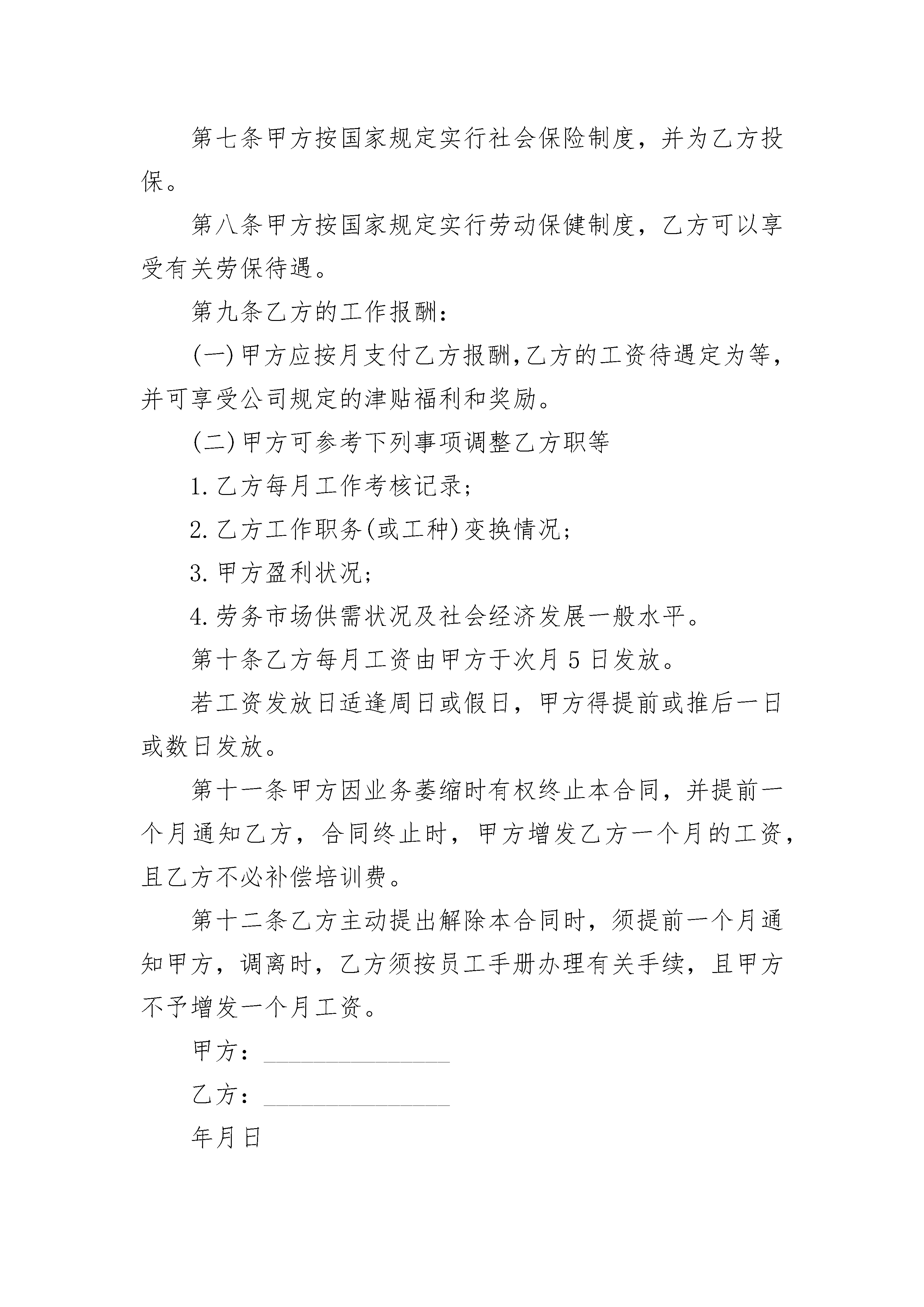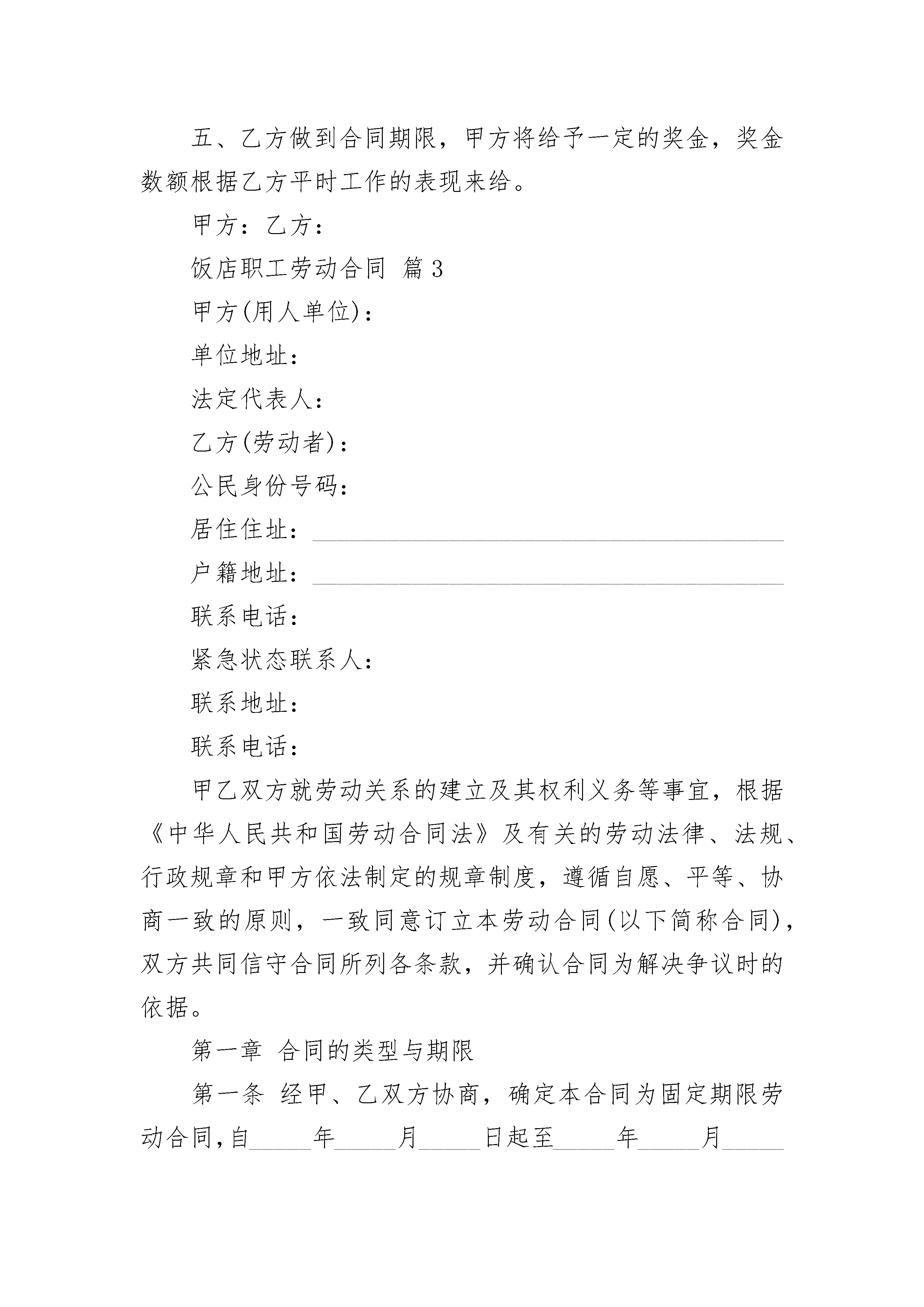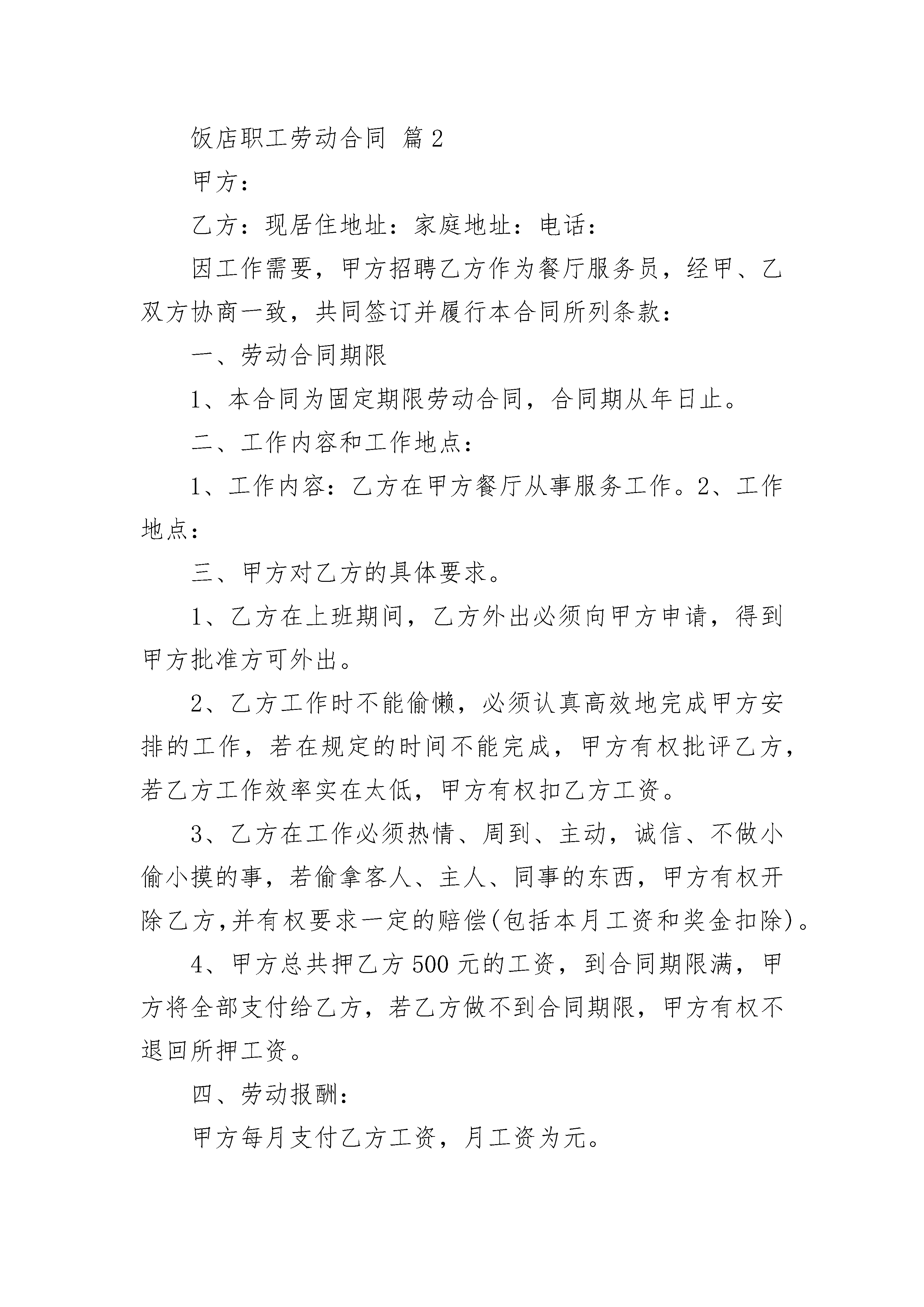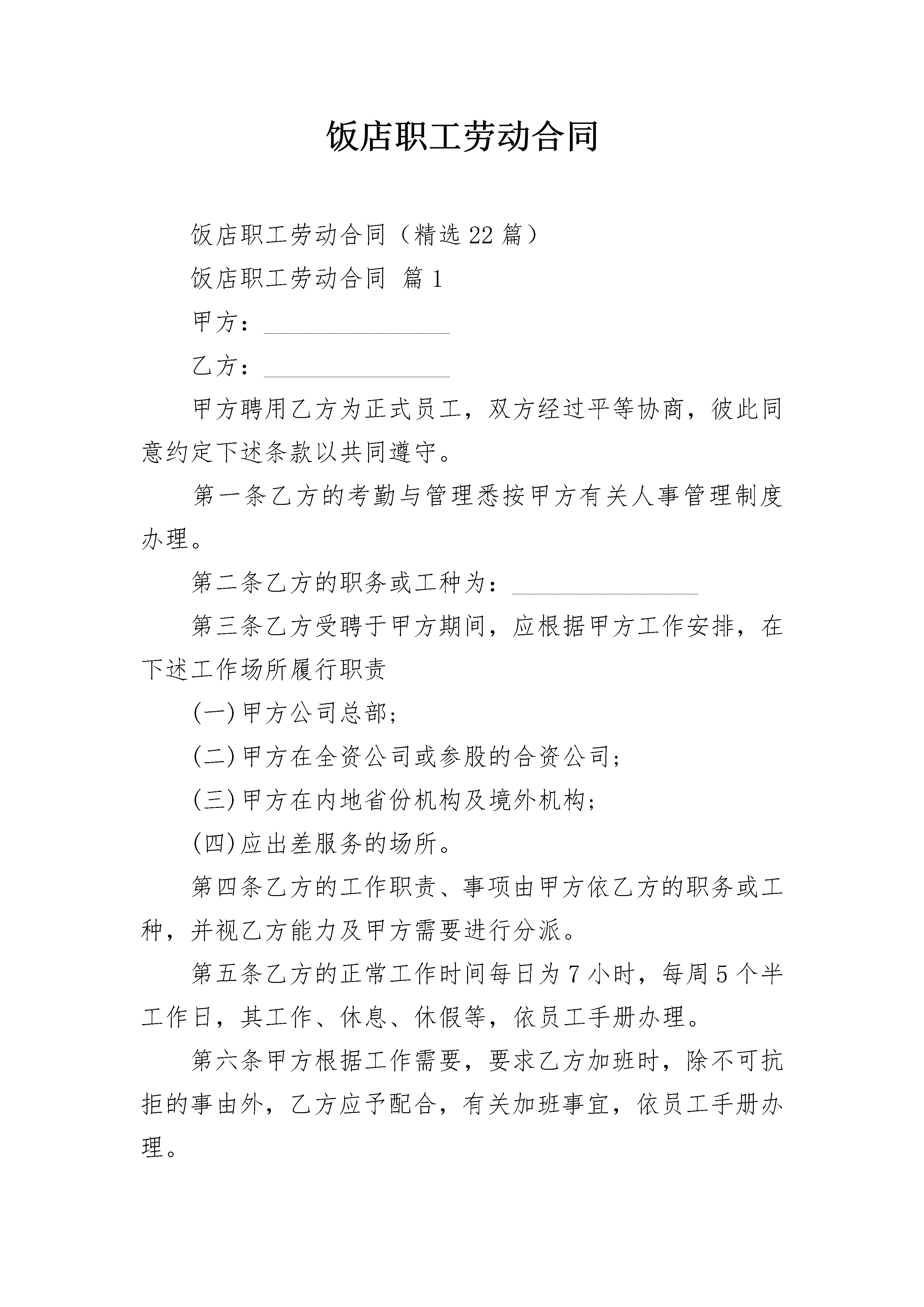 饭店职工劳动合同饭店职工劳动合同(精选22篇)饭店职工劳动合同篇1甲方:_______________乙方:_______________甲方聘用乙方为正式员工,双方经过平等协商,彼此同意约定下述条款以共同遵守。第一条乙方的考勤与管理悉按甲方有关人事管理制度办理。第二条乙方的职务或工种为:_______________第三条乙方受聘于甲方期间,应根据甲方工作安排,在下述工作场所履行职责(一)甲方公司总部;(二)甲方在全资公司或参股的合资公司;(三)甲方在内地省份机构及境外机构;(四)应出差服务的场所。第四条乙方的工作职责、事项由甲方依乙方的职务或工种,并视乙方能力及甲方需要进行分派。第五条乙方的正常工作时间每日为7小时,每周5个半工作日,其工作、休息、休假等,依员工手册办理。第六条甲方根据工作需要,要求乙方加班时,除不可抗拒的事由外,乙方应予配合,有关加班事宜,依员工手册办理。第七条甲方按国家规定实行社会保险制度,并为乙方投保。第八条甲方按国家规定实行劳动保健制度,乙方可以享受有关劳保待遇。第九条乙方的工作报酬:(一)甲方应按月支付乙方报酬,乙方的工资待遇定为等,并可享受公司规定的津贴福利和奖励。(二)甲方可参考下列事项调整乙方职等1.乙方每月工作考核记录;2.乙方工作职务(或工种)变换情况;3.甲方盈利状况;4.劳务市场供需状况及社会经济发展一般水平。第十条乙方每月工资由甲方于次月5日发放。若工资发放日适逢周日或假日,甲方得提前或推后一日或数日发放。第十一条甲方因业务萎缩时有权终止本合同,并提前一个月通知乙方,合同终止时,甲方增发乙方一个月的工资,且乙方不必补偿培训费。第十二条乙方主动提出解除本合同时,须提前一个月通知甲方,调离时,乙方须按员工手册办理有关手续,且甲方不予增发一个月工资。甲方:_______________乙方:_______________年月日饭店职工劳动合同篇2甲方:乙方:现居住地址:家庭地址:电话:因工作需要,甲方招聘乙方作为餐厅服务员,经甲、乙双方协商一致,共同签订并履行本合同所列条款:一、劳动合同期限1、本合同为固定期限劳动合同,合同期从年日止。二、工作内容和工作地点:1、工作内容:乙方在甲方餐厅从事服务工作。2、工作地点:三、甲方对乙方的具体要求。1、乙方在上班期间,乙方外出必须向甲方申请,得到甲方批准方可外出。2、乙方工作时不能偷懒,必须认真高效地完成甲方安排的工作,若在规定的时间不能完成,甲方有权批评乙方,若乙方工作效率实在太低,甲方有权扣乙方工资。3、乙方在工作必须热情、周到、主动,诚信、不做小偷小摸的事,若偷拿客人、主人、同事的东西,甲方有权开除乙方,并有权要求一定的赔偿(包括本月工资和奖金扣除)。4、甲方总共押乙方500元的工资,到合同期限满,甲方将全部支付给乙方,若乙方做不到合同期限,甲方有权不退回所押工资。四、劳动报酬:甲方每月支付乙方工资,月工资为元。五、乙方做到合同期限,甲方将给予一定的奖金,奖金数额根据乙方平时工作的表现来给。甲方:乙方:饭店职工劳动合同篇3甲方(用人单位):单位地址:法定代表人:乙方(劳动者):公民身份号码:居住住址:______________________________________户籍地址:______________________________________联系电话:紧急状态联系人:联系地址:联系电话:甲乙双方就劳动关系的建立及其权利义务等事宜,根据《中华人民共和国劳动合同法》及有关的劳动法律、法规、行政规章和甲方依法制定的规章制度,遵循自愿、平等、协商一致的原则,一致同意订立本劳动合同(以下简称合同),双方共同信守合同所列各条款,并确认合同为解决争议时的依据。第一章合同的类型与期限第一条经甲、乙双方协商,确定本合同为固定期限劳动合同,自_____年_____月_____日起至_____年_____月_____日止,共_____个月。第二条若乙方开始工作时间与合同订立时间不一致的,以乙方实际到岗之日为合同起始时间,乙方到岗后双方才正式建立劳动关系。第二章试用期第三条甲乙双方约定试用期自_____年_____月_____日起至_____年_____月_____日止,共_____个月,试用期月工资为人民币________元。若乙方实际到岗之日与试用期约定上岗之日不符的,试用期同时提前或顺延。第四条甲方录用乙方的条件为:1、学历文化:_________________________________________。2、身体状况:_________________________________________。3、工作技能:_________________________________________。4、团队精神:_________