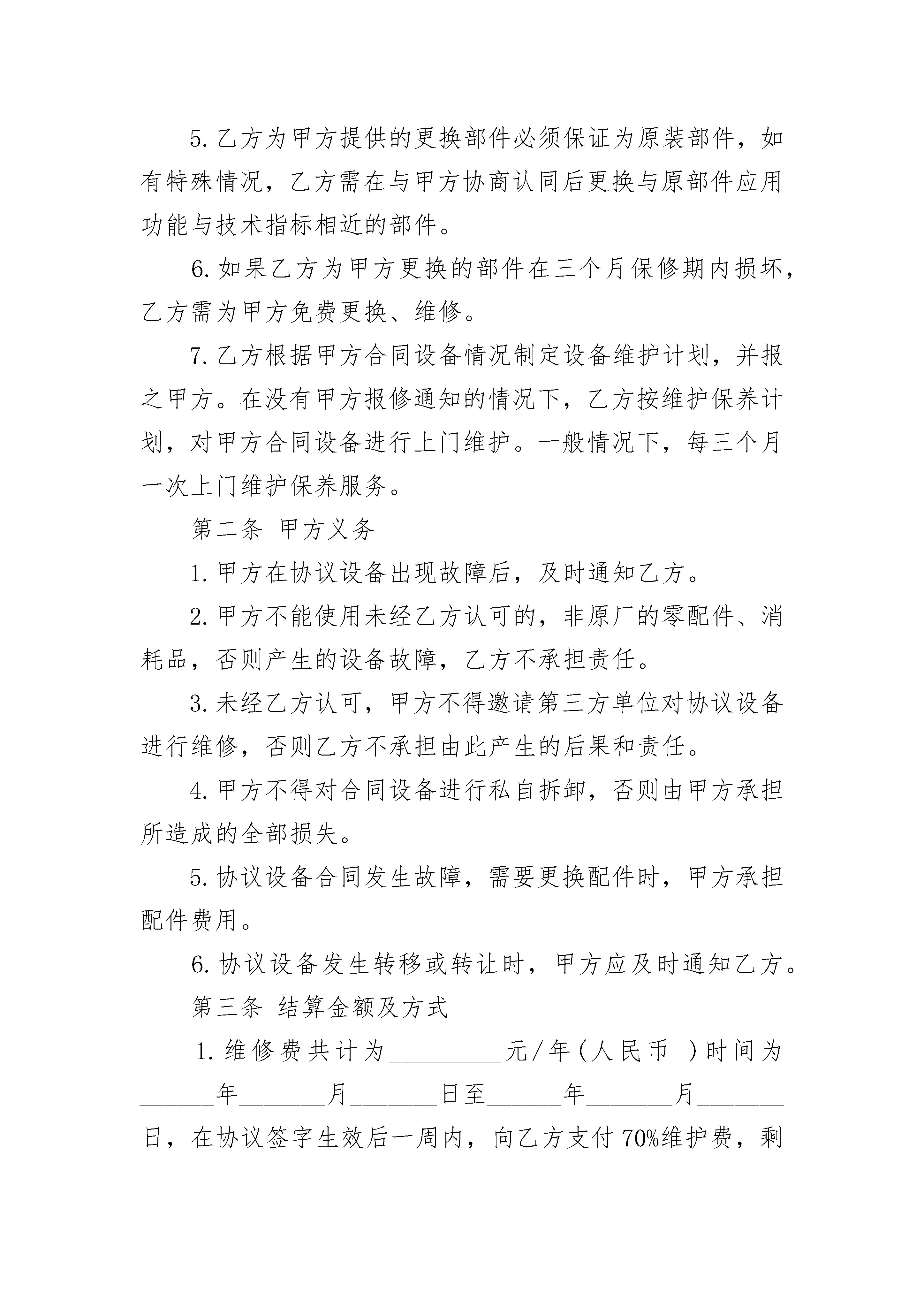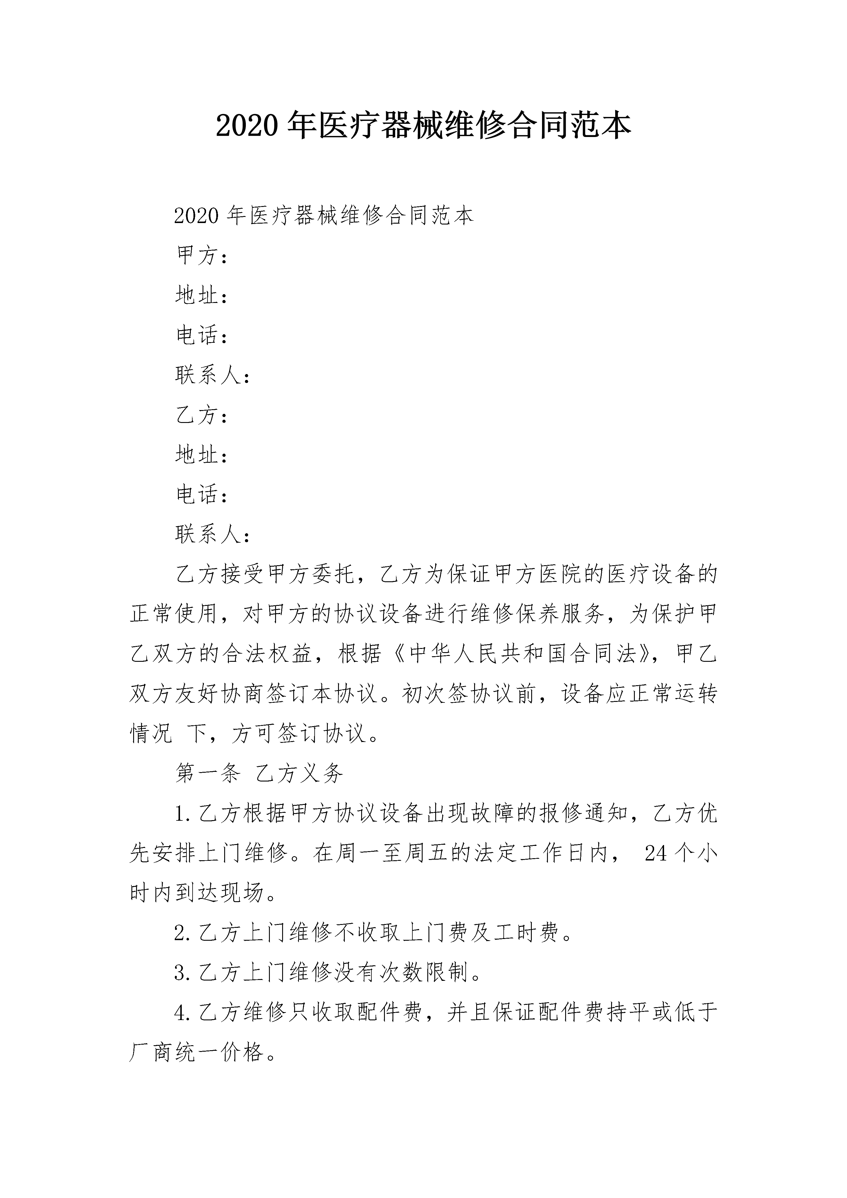 2020年医疗器械维修合同范本2020年医疗器械维修合同范本甲方:地址:电话:联系人:乙方:地址:电话:联系人:乙方接受甲方委托,乙方为保证甲方医院的医疗设备的正常使用,对甲方的协议设备进行维修保养服务,为保护甲乙双方的合法权益,根据《中华人民共和国合同法》,甲乙双方友好协商签订本协议。初次签协议前,设备应正常运转情况下,方可签订协议。第一条乙方义务1.乙方根据甲方协议设备出现故障的报修通知,乙方优先安排上门维修。在周一至周五的法定工作日内,24个小时内到达现场。2.乙方上门维修不收取上门费及工时费。3.乙方上门维修没有次数限制。4.乙方维修只收取配件费,并且保证配件费持平或低于厂商统一价格。5.乙方为甲方提供的更换部件必须保证为原装部件,如有特殊情况,乙方需在与甲方协商认同后更换与原部件应用功能与技术指标相近的部件。6.如果乙方为甲方更换的部件在三个月保修期内损坏,乙方需为甲方免费更换、维修。7.乙方根据甲方合同设备情况制定设备维护计划,并报之甲方。在没有甲方报修通知的情况下,乙方按维护保养计划,对甲方合同设备进行上门维护。一般情况下,每三个月一次上门维护保养服务。第二条甲方义务1.甲方在协议设备出现故障后,及时通知乙方。2.甲方不能使用未经乙方认可的,非原厂的零配件、消耗品,否则产生的设备故障,乙方不承担责任。3.未经乙方认可,甲方不得邀请第三方单位对协议设备进行维修,否则乙方不承担由此产生的后果和责任。4.甲方不得对合同设备进行私自拆卸,否则由甲方承担所造成的全部损失。5.协议设备合同发生故障,需要更换配件时,甲方承担配件费用。6.协议设备发生转移或转让时,甲方应及时通知乙方。第三条结算金额及方式1.维修费共计为_________元/年(人民币)时间为______年_______月_______日至______年_______月_______日,在协议签字生效后一周内,向乙方支付70%维护费,剩余30%在______年_______月_______日前一次性付清。第四条本合同有效期暂定为一年,一式两份,甲乙双方各执一份,自签字盖章之日起生效。甲方(盖章):_______________法定代表人(签字):_____________年_______月_______日乙方(盖章):_______________法定代表人(签字):_____________年_______月_______日