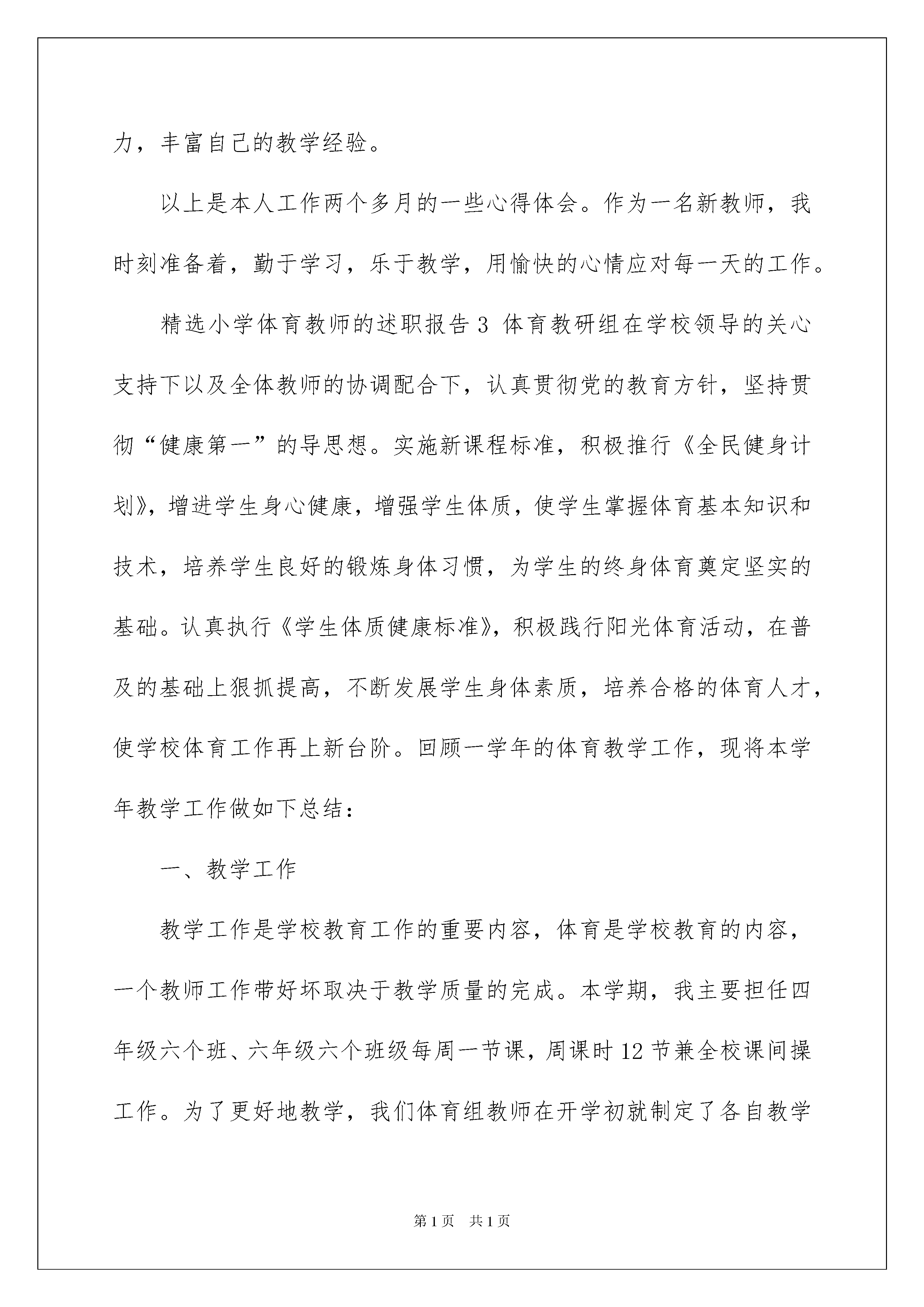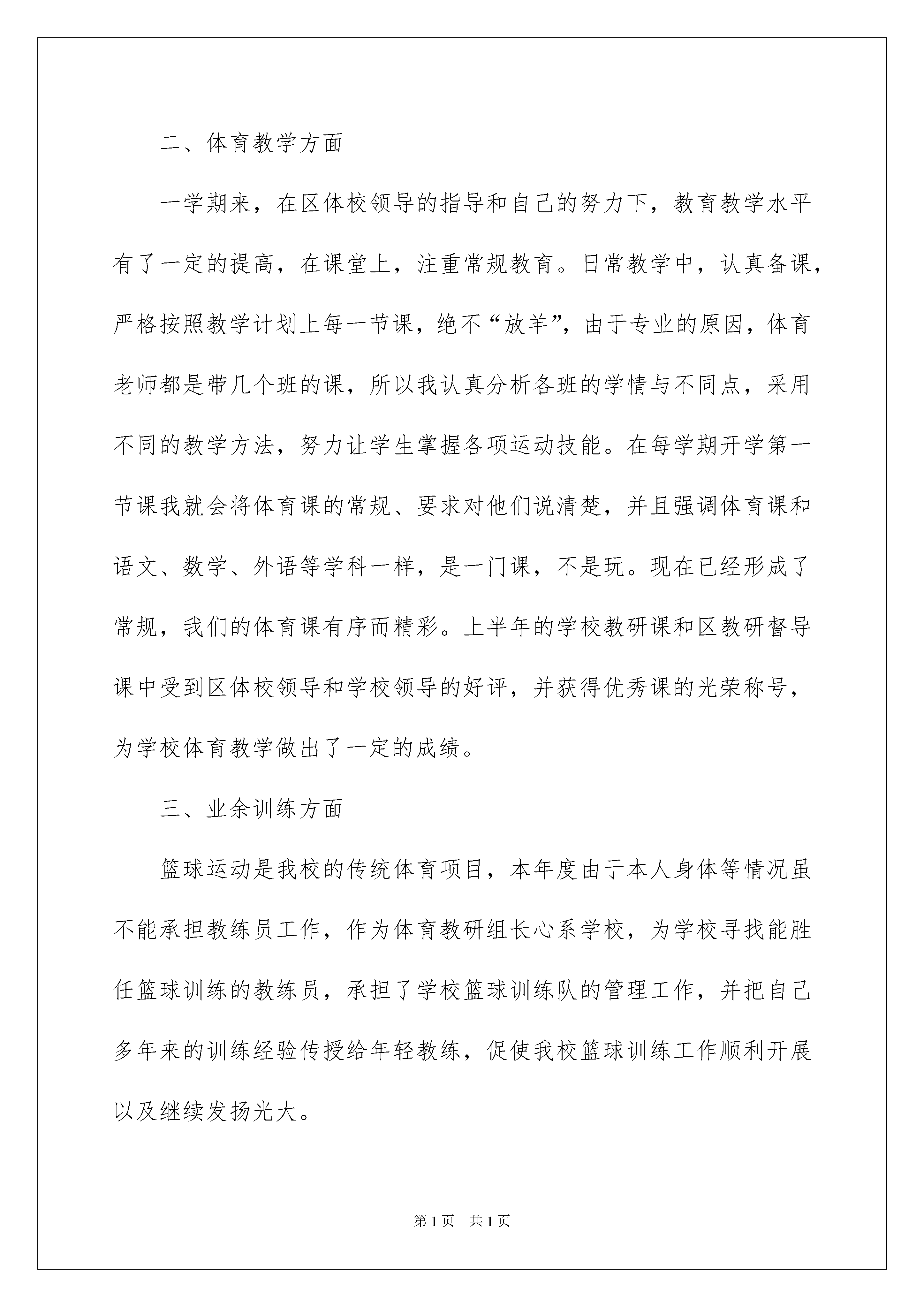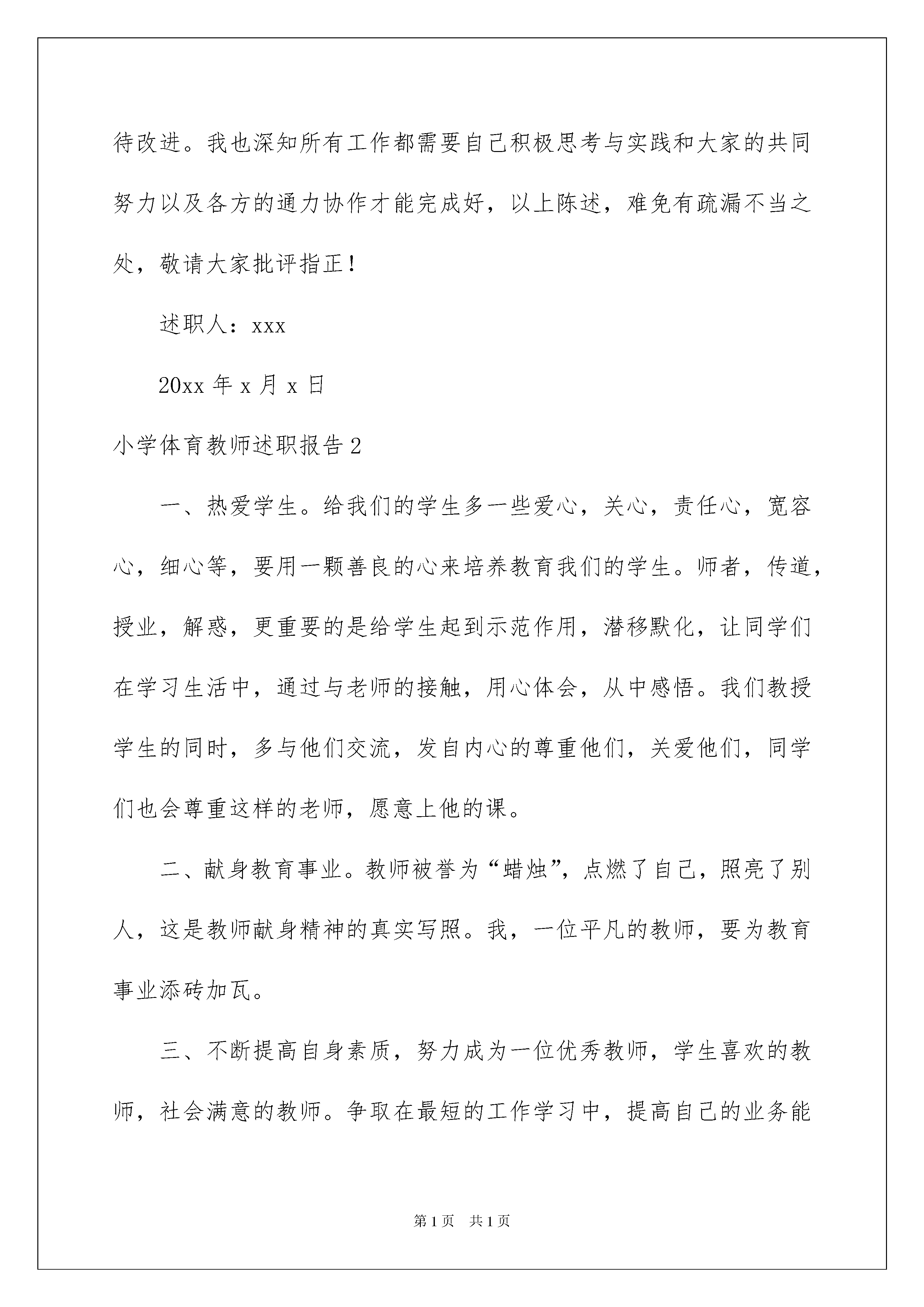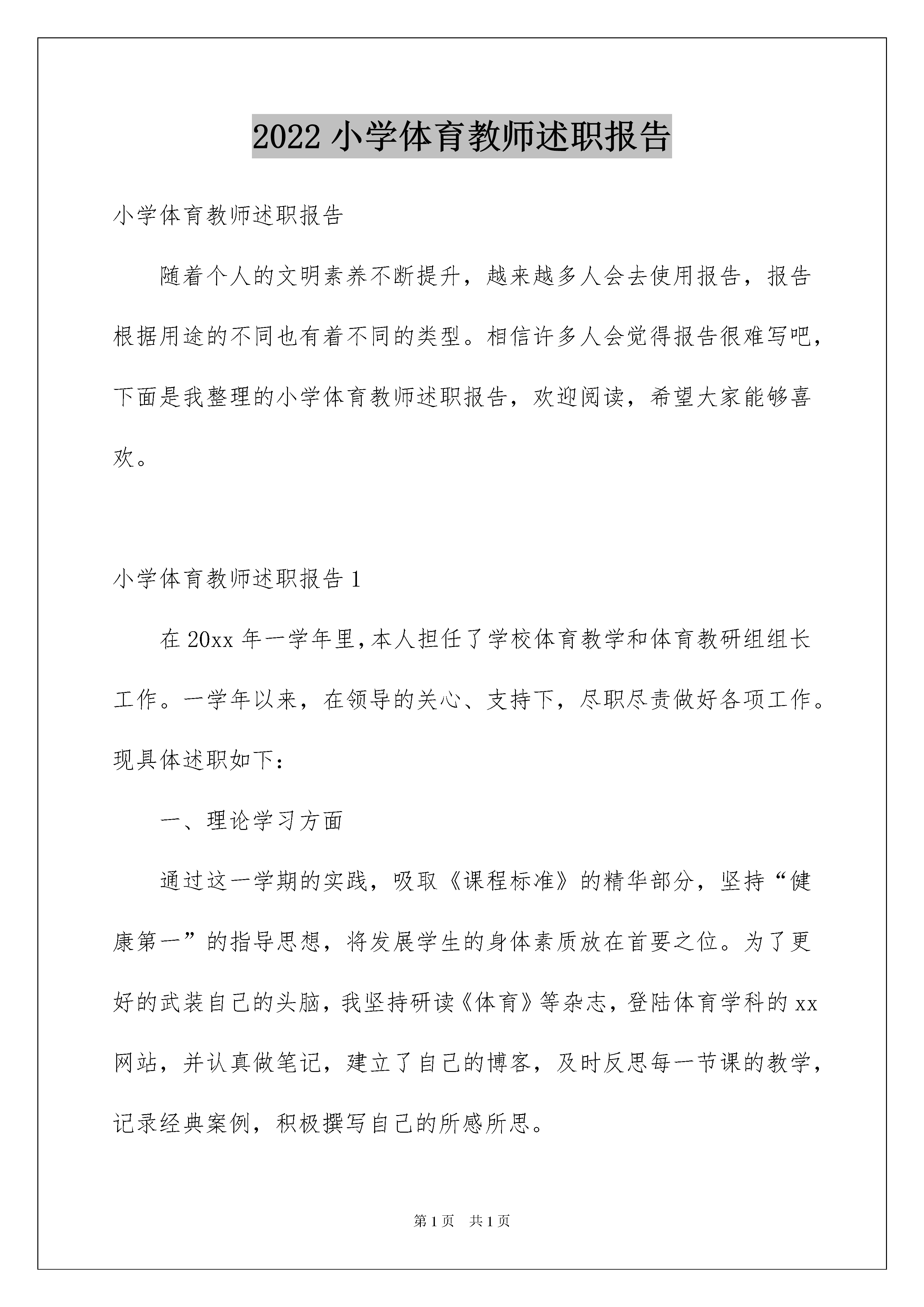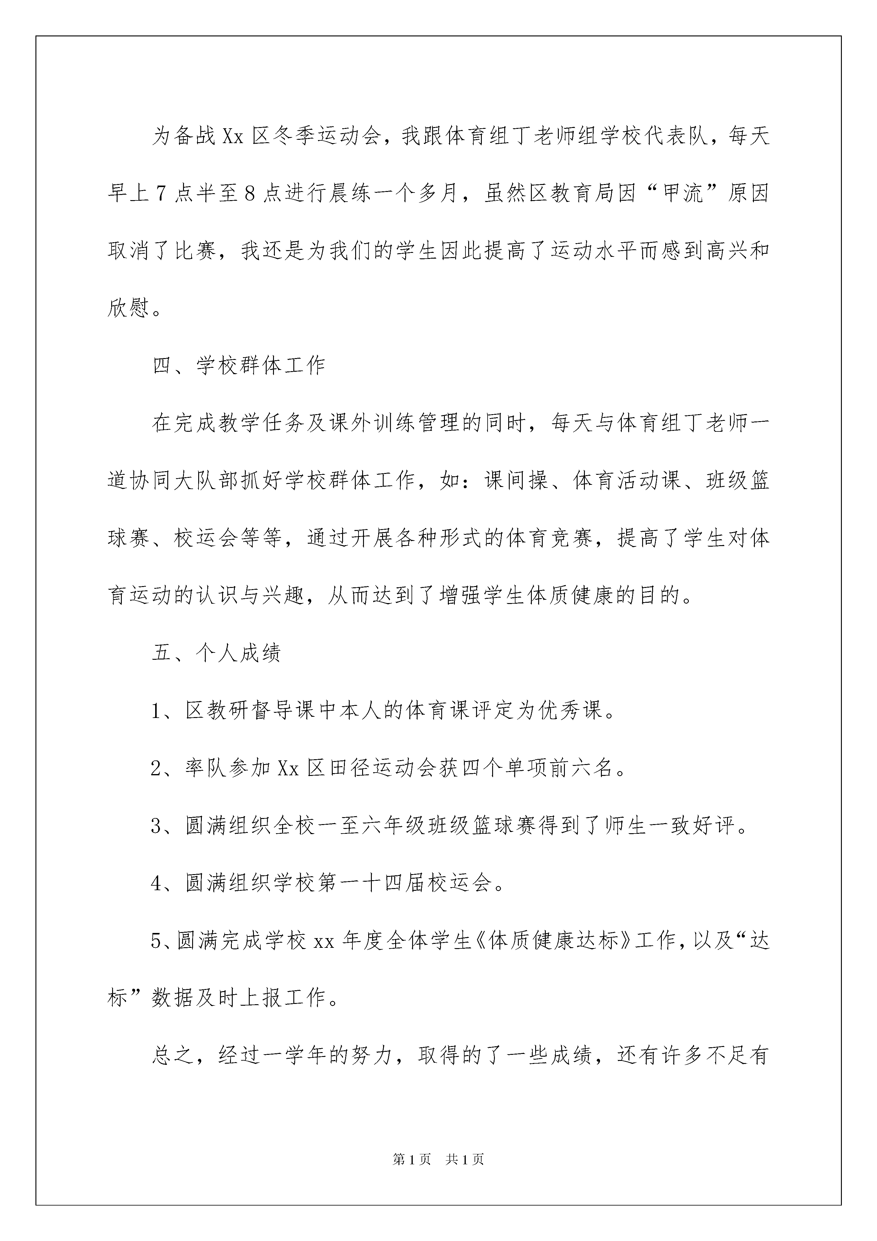 2022小学体育教师述职报告小学体育教师述职报告随着个人的文明素养不断提升,越来越多人会去使用报告,报告根据用途的不同也有着不同的类型。相信许多人会觉得报告很难写吧,下面是我整理的小学体育教师述职报告,欢迎阅读,希望大家能够喜欢。小学体育教师述职报告1在20xx年一学年里,本人担任了学校体育教学和体育教研组组长工作。一学年以来,在领导的关心、支持下,尽职尽责做好各项工作。现具体述职如下:一、理论学习方面通过这一学期的实践,吸取《课程标准》的精华部分,坚持“健康第一”的指导思想,将发展学生的身体素质放在首要之位。为了更好的武装自己的头脑,我坚持研读《体育》等杂志,登陆体育学科的xx网站,并认真做笔记,建立了自己的博客,及时反思每一节课的教学,记录经典案例,积极撰写自己的所感所思。二、体育教学方面一学期来,在区体校领导的指导和自己的努力下,教育教学水平有了一定的提高,在课堂上,注重常规教育。日常教学中,认真备课,严格按照教学计划上每一节课,绝不“放羊”,由于专业的原因,体育老师都是带几个班的课,所以我认真分析各班的学情与不同点,采用不同的教学方法,努力让学生掌握各项运动技能。在每学期开学第一节课我就会将体育课的常规、要求对他们说清楚,并且强调体育课和语文、数学、外语等学科一样,是一门课,不是玩。现在已经形成了常规,我们的体育课有序而精彩。上半年的学校教研课和区教研督导课中受到区体校领导和学校领导的好评,并获得优秀课的光荣称号,为学校体育教学做出了一定的成绩。三、业余训练方面篮球运动是我校的传统体育项目,本年度由于本人身体等情况虽不能承担教练员工作,作为体育教研组长心系学校,为学校寻找能胜任篮球训练的教练员,承担了学校篮球训练队的管理工作,并把自己多年来的训练经验传授给年轻教练,促使我校篮球训练工作顺利开展以及继续发扬光大。为备战Xx区冬季运动会,我跟体育组丁老师组学校代表队,每天早上7点半至8点进行晨练一个多月,虽然区教育局因“甲流”原因取消了比赛,我还是为我们的学生因此提高了运动水平而感到高兴和欣慰。四、学校群体工作在完成教学任务及课外训练管理的同时,每天与体育组丁老师一道协同大队部抓好学校群体工作,如:课间操、体育活动课、班级篮球赛、校运会等等,通过开展各种形式的体育竞赛,提高了学生对体育运动的认识与兴趣,从而达到了增强学生体质健康的目的。五、个人成绩1、区教研督导课中本人的体育课评定为优秀课。2、率队参加Xx区田径运动会获四个单项前六名。3、圆满组织全校一至六年级班级篮球赛得到了师生一致好评。4、圆满组织学校第一十四届校运会。5、圆满完成学校xx年度全体学生《体质健康达标》工作,以及“达标”数据及时上报工作。总之,经过一学年的努力,取得的了一些成绩,还有许多不足有待改进。我也深知所有工作都需要自己积极思考与实践和大家的共同努力以及各方的通力协作才能完成好,以上陈述,难免有疏漏不当之处,敬请大家批评指正!述职人:xxx20xx年x月x日小学体育教师述职报告2一、热爱学生。给我们的学生多一些爱心,关心,责任心,宽容心,细心等,要用一颗善良的心来培养教育我们的学生。师者,传道,授业,解惑,更重要的是给学生起到示范作用,潜移默化,让同学们在学习生活中,通过与老师的接触,用心体会,从中感悟。我们教授学生的同时,多与他们交流,发自内心的尊重他们,关爱他们,同学们也会尊重这样的老师,愿意上他的课。二、献身教育事业。教师被誉为“蜡烛”,点燃了自己,照亮了别人,这是教师献身精神的真实写照。我,一位平凡的教师,要为教育事业添砖加瓦。三、不断提高自身素质,努力成为一位优秀教师,学生喜欢的教师,社会满意的教师。争取在最短的工作学习中,提高自己的业务能力,丰富自己的教学经验。以上是本人工作两个多月的一些心得体会。作为一名新教师,我时刻准备着,勤于学习,乐于教学,用愉快的心情应对每一天的工作。精选小学体育教师的述职报告3体育教研组在学校领导的关心支持下以及全体教师的协调配合下,认真贯彻党的教育方针,坚持贯彻“健康第一”的导思想。实施新课程标准,积极推行《全民健身计划》,增进学生身心健康,增强学生体质,使学生掌握体育基本知识和技术,培养学生良好的锻炼身体习惯,为学生的终身体育奠定坚实的基础。认真执行《学生体质健康标准》,积极践行阳光体育活动,在普及的基础上狠抓提高,不断发展学生身体素质,培养合格的体育人才,使学校体育工作再上新台阶。回顾一学年的体育教学工作,现将本学年教学工作做如下总结:一、教学工作教学工作是学校教育工作的重要内容,体育是学校教育的内容,一个教师工作带好坏取决于教学质量的完成。本学期