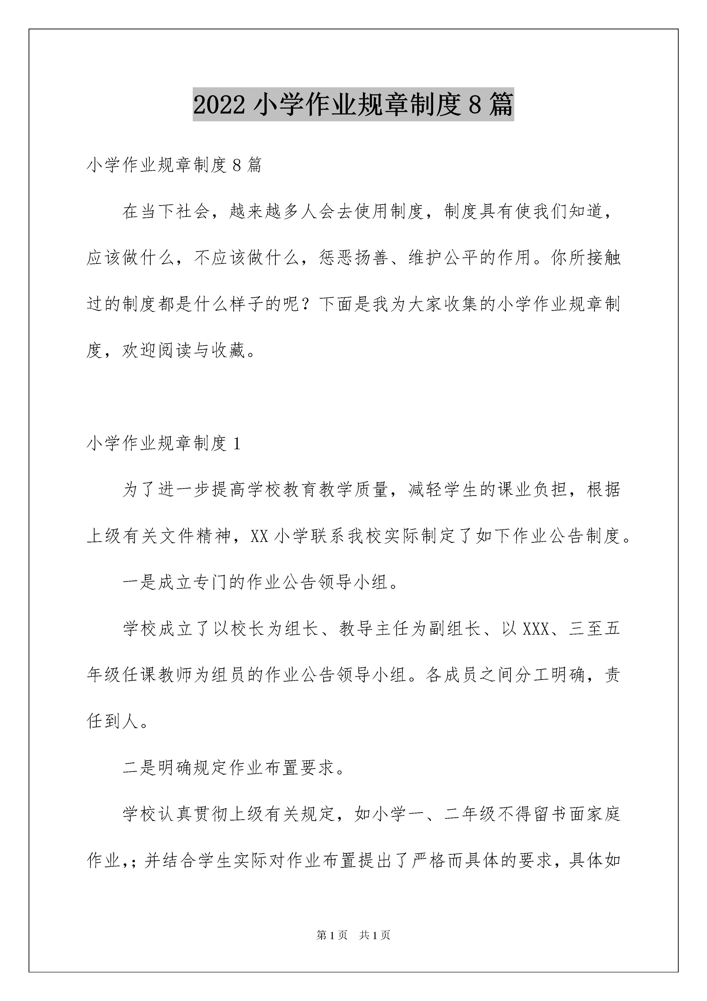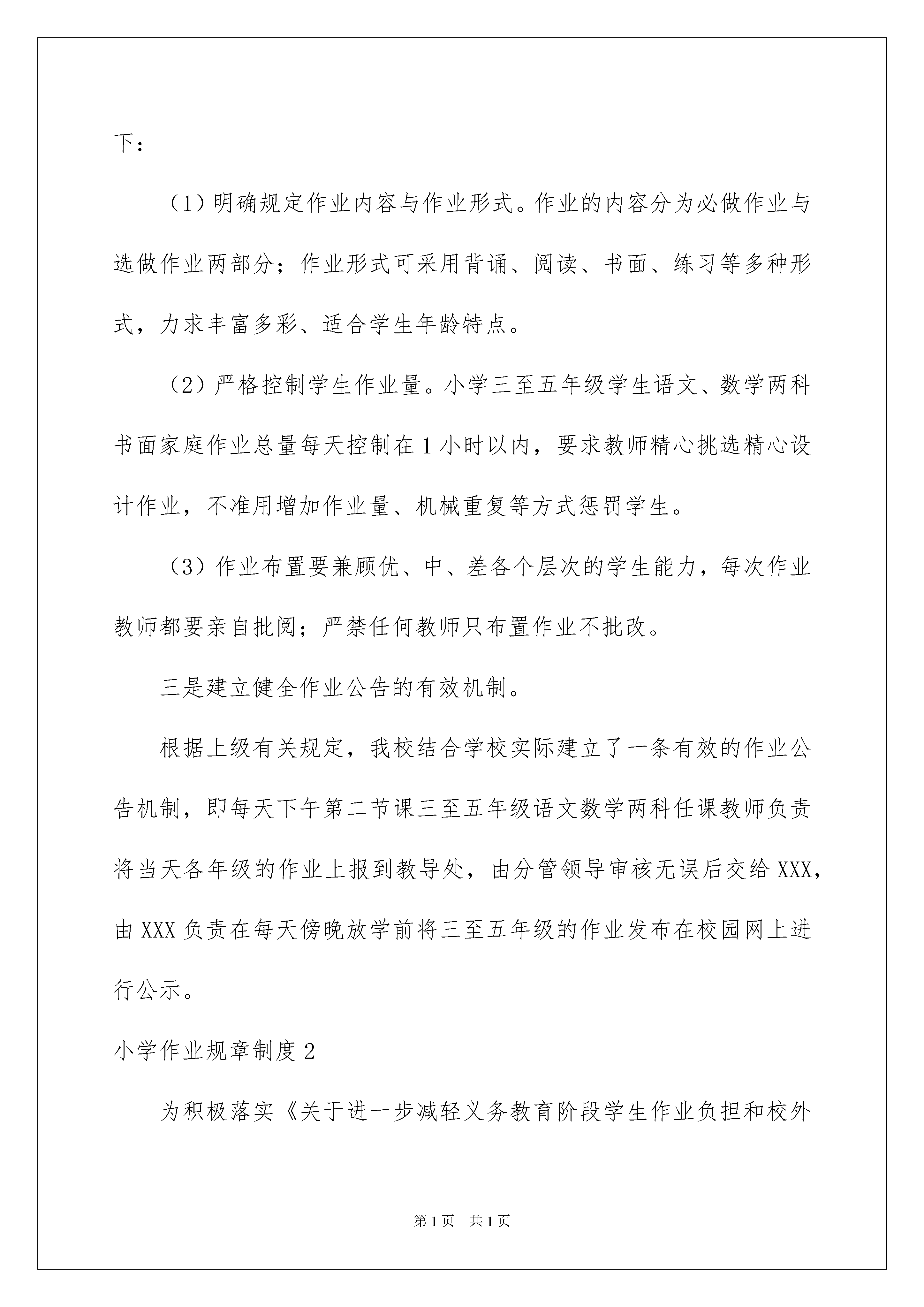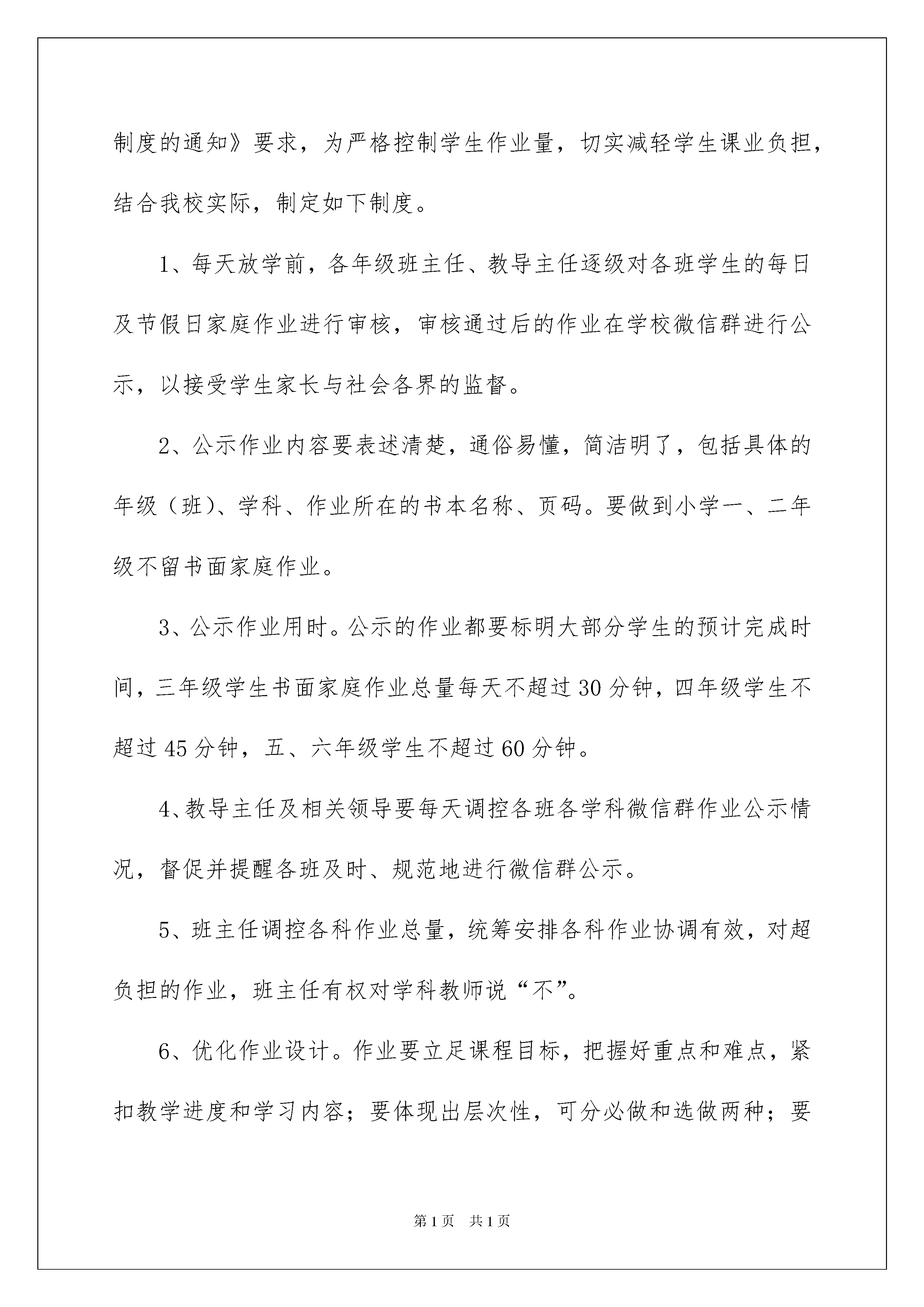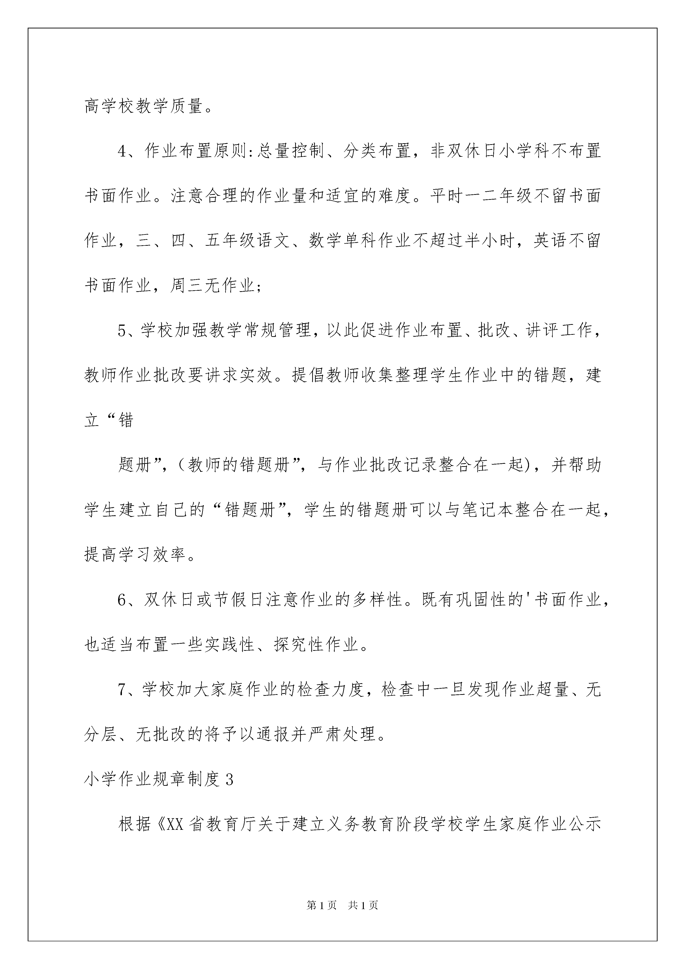 2022小学作业规章制度8篇小学作业规章制度8篇在当下社会,越来越多人会去使用制度,制度具有使我们知道,应该做什么,不应该做什么,惩恶扬善、维护公平的作用。你所接触过的制度都是什么样子的呢?下面是我为大家收集的小学作业规章制度,欢迎阅读与收藏。小学作业规章制度1为了进一步提高学校教育教学质量,减轻学生的课业负担,根据上级有关文件精神,XX小学联系我校实际制定了如下作业公告制度。一是成立专门的作业公告领导小组。学校成立了以校长为组长、教导主任为副组长、以XXX、三至五年级任课教师为组员的作业公告领导小组。各成员之间分工明确,责任到人。二是明确规定作业布置要求。学校认真贯彻上级有关规定,如小学一、二年级不得留书面家庭作业,;并结合学生实际对作业布置提出了严格而具体的要求,具体如下:(1)明确规定作业内容与作业形式。作业的内容分为必做作业与选做作业两部分;作业形式可采用背诵、阅读、书面、练习等多种形式,力求丰富多彩、适合学生年龄特点。(2)严格控制学生作业量。小学三至五年级学生语文、数学两科书面家庭作业总量每天控制在1小时以内,要求教师精心挑选精心设计作业,不准用增加作业量、机械重复等方式惩罚学生。(3)作业布置要兼顾优、中、差各个层次的学生能力,每次作业教师都要亲自批阅;严禁任何教师只布置作业不批改。三是建立健全作业公告的有效机制。根据上级有关规定,我校结合学校实际建立了一条有效的作业公告机制,即每天下午第二节课三至五年级语文数学两科任课教师负责将当天各年级的作业上报到教导处,由分管领导审核无误后交给XXX,由XXX负责在每天傍晚放学前将三至五年级的作业发布在校园网上进行公示。小学作业规章制度2为积极落实《关于进一步减轻义务教育阶段学生作业负担和校外培训负担的意见》,认真贯彻市、区教育局规范办学精神,真正实现“减负增效”,激发学生的生活乐趣和学习积极性,提高师生的生命质量,增强学校办学的透明度,进一步实现学校、家庭和社会的联动效应,最大限度地提高学校教育教学质量和学校特色、内涵发展。学校各学科教师要严格控制作业量,进一步提高学科作业的效能,学校对学科作业公示工作特作如下要求:1.学校认真听取学生和家长对学科的意见和建议,加强教师对学科作业设计的研究,改进作业的形式和分层要求,进一步提高学科教学质量,提高学生和家长对学校办学的满意度,提高教师从事教育工作的幸福指数。2.学校坚持学科集体备课制度,生成学科特色的作业,凸显集体备课中对课堂练习和课后作业的要求,每天由备课组长把作业设想告知同备课组教师后,各班级教师根据具体情况确定自己班级作业,每天下午放学前在学校校园网公示各班级每天的学科作业内容。3.学科作业公示制度实行业务校长亲自抓,分管主任亲自落实,真正把学科作业布置、作业批改、反馈等环节落到实处,实现学生学习的“日日清、周周清”,做好学科作业的过程性管理和研究,全面提高学校教学质量。4、作业布置原则:总量控制、分类布置,非双休日小学科不布置书面作业。注意合理的作业量和适宜的难度。平时一二年级不留书面作业,三、四、五年级语文、数学单科作业不超过半小时,英语不留书面作业,周三无作业;5、学校加强教学常规管理,以此促进作业布置、批改、讲评工作,教师作业批改要讲求实效。提倡教师收集整理学生作业中的错题,建立“错题册”,(教师的错题册”,与作业批改记录整合在一起),并帮助学生建立自己的“错题册”,学生的错题册可以与笔记本整合在一起,提高学习效率。6、双休日或节假日注意作业的多样性。既有巩固性的'书面作业,也适当布置一些实践性、探究性作业。7、学校加大家庭作业的检查力度,检查中一旦发现作业超量、无分层、无批改的将予以通报并严肃处理。小学作业规章制度3根据《XX省教育厅关于建立义务教育阶段学校学生家庭作业公示制度的通知》要求,为严格控制学生作业量,切实减轻学生课业负担,结合我校实际,制定如下制度。1、每天放学前,各年级班主任、教导主任逐级对各班学生的每日及节假日家庭作业进行审核,审核通过后的作业在学校微信群进行公示,以接受学生家长与社会各界的监督。2、公示作业内容要表述清楚,通俗易懂,简洁明了,包括具体的年级(班)、学科、作业所在的书本名称、页码。要做到小学一、二年级不留书面家庭作业。3、公示作业用时。公示的作业都要标明大部分学生的预计完成时间,三年级学生书面家庭作业总量每天不超过30分钟,四年级学生不超过45分钟,五、六年级学生不超过60分钟。4、教导主任及相关领导要每天调控各班各学科微信群作业公示情况,督促并提醒各班及时、规范地进行微信群公示。5、班主任调控各科作业总量,统筹安排各科作