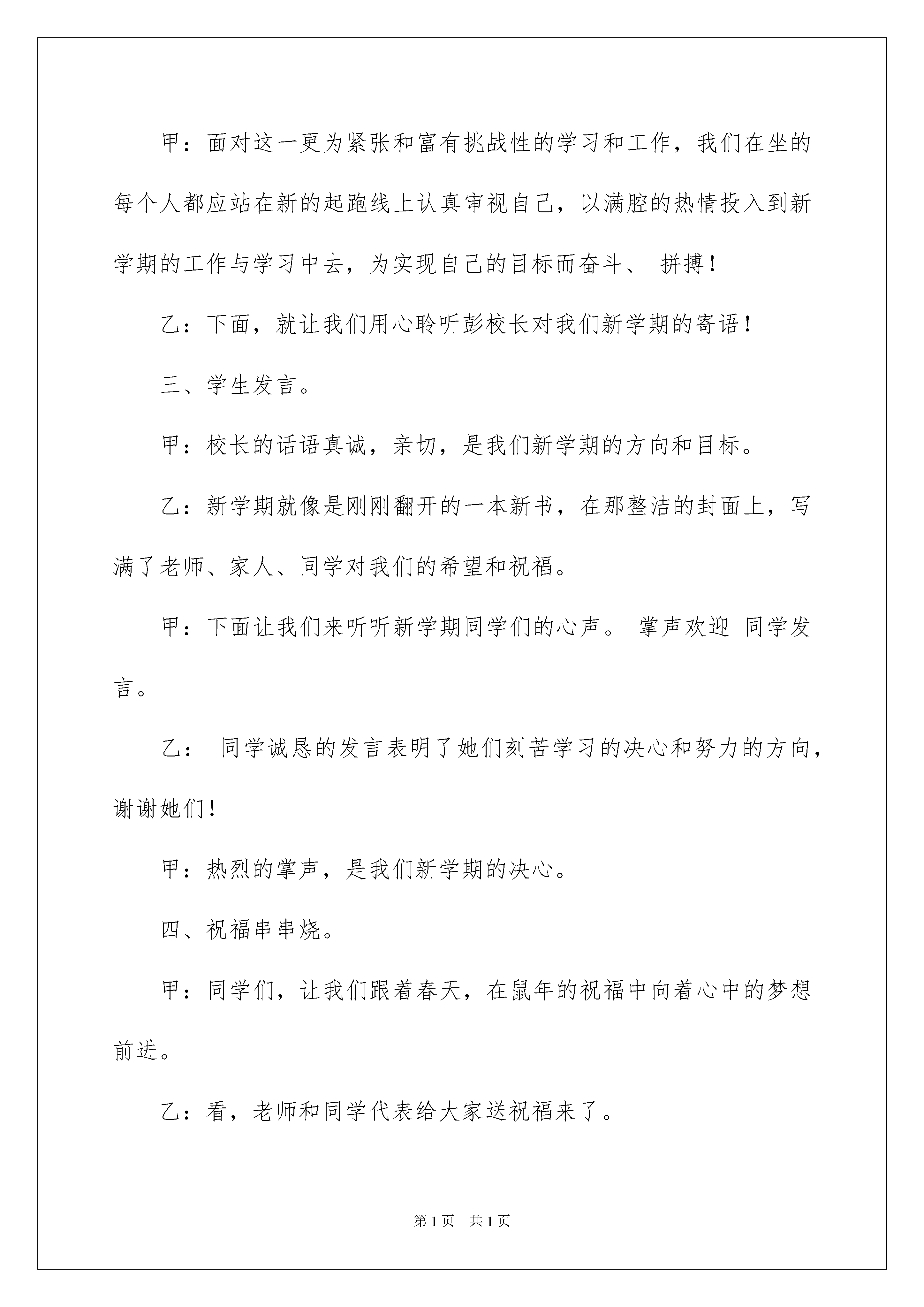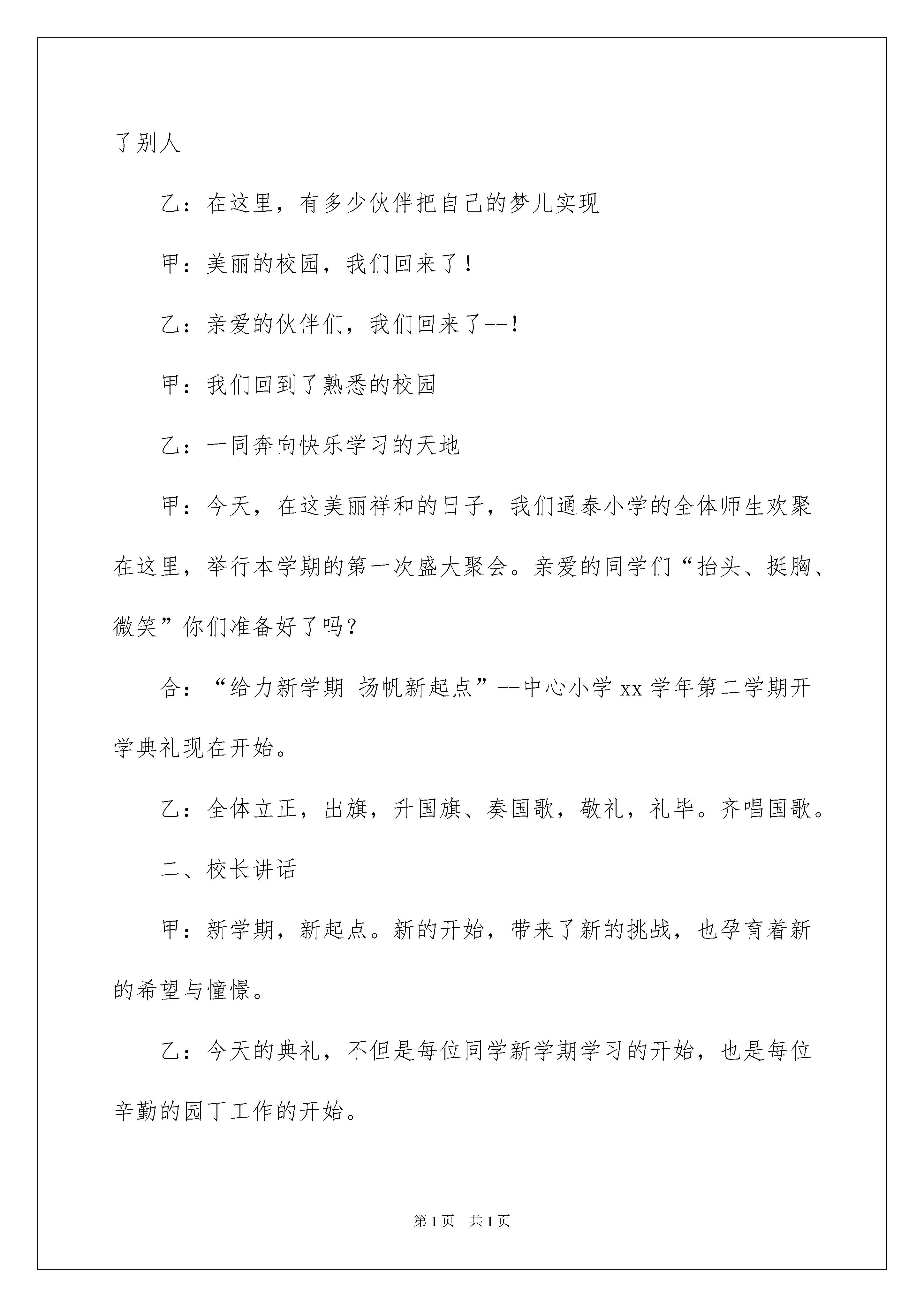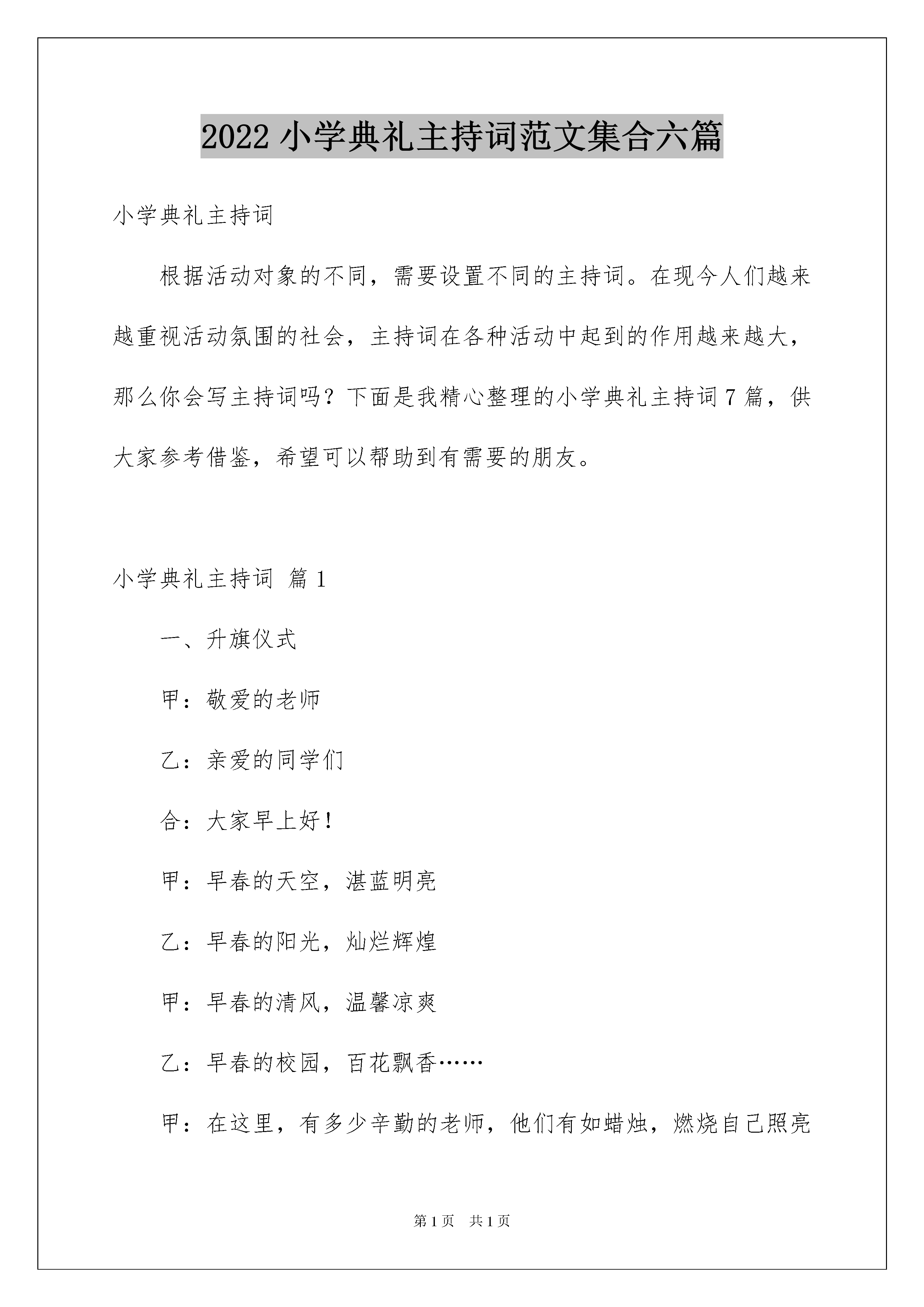 2022小学典礼主持词范文集合六篇小学典礼主持词根据活动对象的不同,需要设置不同的主持词。在现今人们越来越重视活动氛围的社会,主持词在各种活动中起到的作用越来越大,那么你会写主持词吗?下面是我精心整理的小学典礼主持词7篇,供大家参考借鉴,希望可以帮助到有需要的朋友。小学典礼主持词篇1一、升旗仪式甲:敬爱的老师乙:亲爱的同学们合:大家早上好!甲:早春的天空,湛蓝明亮乙:早春的阳光,灿烂辉煌甲:早春的清风,温馨凉爽乙:早春的校园,百花飘香……甲:在这里,有多少辛勤的老师,他们有如蜡烛,燃烧自己照亮了别人乙:在这里,有多少伙伴把自己的梦儿实现甲:美丽的校园,我们回来了!乙:亲爱的伙伴们,我们回来了--!甲:我们回到了熟悉的校园乙:一同奔向快乐学习的天地甲:今天,在这美丽祥和的日子,我们通泰小学的全体师生欢聚在这里,举行本学期的第一次盛大聚会。亲爱的同学们“抬头、挺胸、微笑”你们准备好了吗?合:“给力新学期扬帆新起点”--中心小学xx学年第二学期开学典礼现在开始。乙:全体立正,出旗,升国旗、奏国歌,敬礼,礼毕。齐唱国歌。二、校长讲话甲:新学期,新起点。新的开始,带来了新的挑战,也孕育着新的希望与憧憬。乙:今天的典礼,不但是每位同学新学期学习的开始,也是每位辛勤的园丁工作的开始。甲:面对这一更为紧张和富有挑战性的学习和工作,我们在坐的每个人都应站在新的起跑线上认真审视自己,以满腔的热情投入到新学期的工作与学习中去,为实现自己的目标而奋斗、拼搏!乙:下面,就让我们用心聆听彭校长对我们新学期的寄语!三、学生发言。甲:校长的话语真诚,亲切,是我们新学期的方向和目标。乙:新学期就像是刚刚翻开的一本新书,在那整洁的封面上,写满了老师、家人、同学对我们的希望和祝福。甲:下面让我们来听听新学期同学们的心声。掌声欢迎同学发言。乙:同学诚恳的发言表明了她们刻苦学习的决心和努力的方向,谢谢她们!甲:热烈的掌声,是我们新学期的决心。四、祝福串串烧。甲:同学们,让我们跟着春天,在鼠年的祝福中向着心中的梦想前进。乙:看,老师和同学代表给大家送祝福来了。[喜庆音乐背景]五、结束语甲:感谢同学们的祝福。同学们一个崭新的学期又展现在我们面前,这是我们生命中的一个起点,一个小站。乙:我们相信,在老师们的辛勤辅导下,通过我们全体同学的努力学习,努力实践,我们一定能在本学期内收获希望,收获明天!乙:如今起航的笛声已经拉响,同学们请大声回答我:信心准备好了吗?(生齐答)甲:努力准备好了吗?(生齐答)乙:快乐准备好了吗?(生齐答)甲:彼此的鼓励准备好了吗?(生齐答)乙:让我们一起呼喊:“新学期,我最棒!”甲:xx学年第二学期开学典礼到此结束!祝愿我们的老师,享受教育,采撷阳光!乙:祝愿我们的同学,学习进步,茁壮成长!合:通泰中心小学xx学年第二学期开学典礼到此结束,请同学们听音乐进教室。(放音乐《明天会更好》)小学典礼主持词篇2尊敬的各位老师们、同学们:生1:各位同学。生2:各位老师。合:早上好!生1:今天是20xx—20xx学年度第一学期开学的第一天。我们全校师生带着对暑假生活的美好记忆,生2:对新学期的向往,对美好未来的无限憧憬,生1:在这个明媚的早晨,在美丽的校园,一起开始这新学期的合:第一幕。一、新老师,新同学欢迎仪式生1:我宣布:小学20xx—20xx学年度第一学期开学典礼现在开始。(钟声响起。)生2:听,新学期的钟声已经响起来了,它在告诉我们上教实小的师生们:合:开学了生1:开学了!——走进这窗明几净的教室,我们曾在这尽情享受学习的乐趣,体验关爱与奋进的滋味;生2:开学了!轻轻地走到办公室的窗口,我们又看到辛勤耕耘的老师们正在作业本上批划,蓝色的字迹像绿色的田野,红色的批语如一簇簇鲜花……生1:这是一幅美丽的金秋的图画!生2:这里到处都充满了老师亲切的微笑,和同学们欢快的声音。生1:同学们,这学期我们学校的制定了新的德育教育主题——“提升修养迎世博,科学规划促发展。”生2:希望同学们在新的学期里善于计划,勤奋学习,多多动脑,学习礼仪,提升修养,做好世博会的东道主。(1)、新生进场生1:同时,在这个明媚的早晨,在我们可爱的校园里,又多了一张张稚嫩、灿烂的笑脸,他们就是一年级的小弟弟小妹妹们。生2:从今天起他们将和我们共度五年愉快的校园生活,并将和我们成为一群亲密无间的好伙伴。生1:下面让我们伸出双手用热烈的掌声来表达对一年级小朋友的热烈欢迎,请一年级小朋友进场。(新生进场进时全校共同鼓掌,并播放音乐)(2)、授牌仪式生2:一年级的小朋友们欢迎大家来到我们上交实小这个大家庭。生1:下面我们请上教实小校长为一年级各班