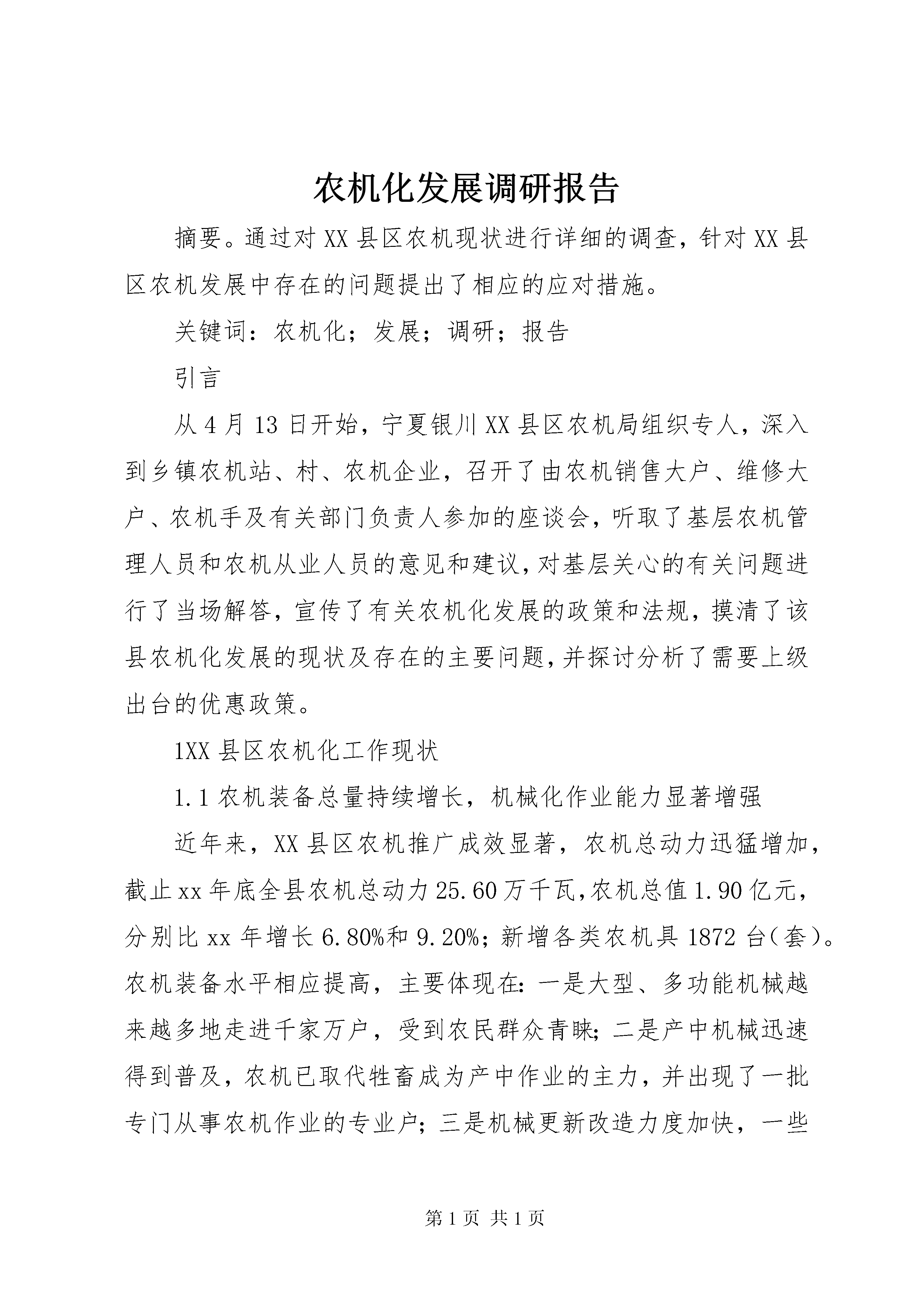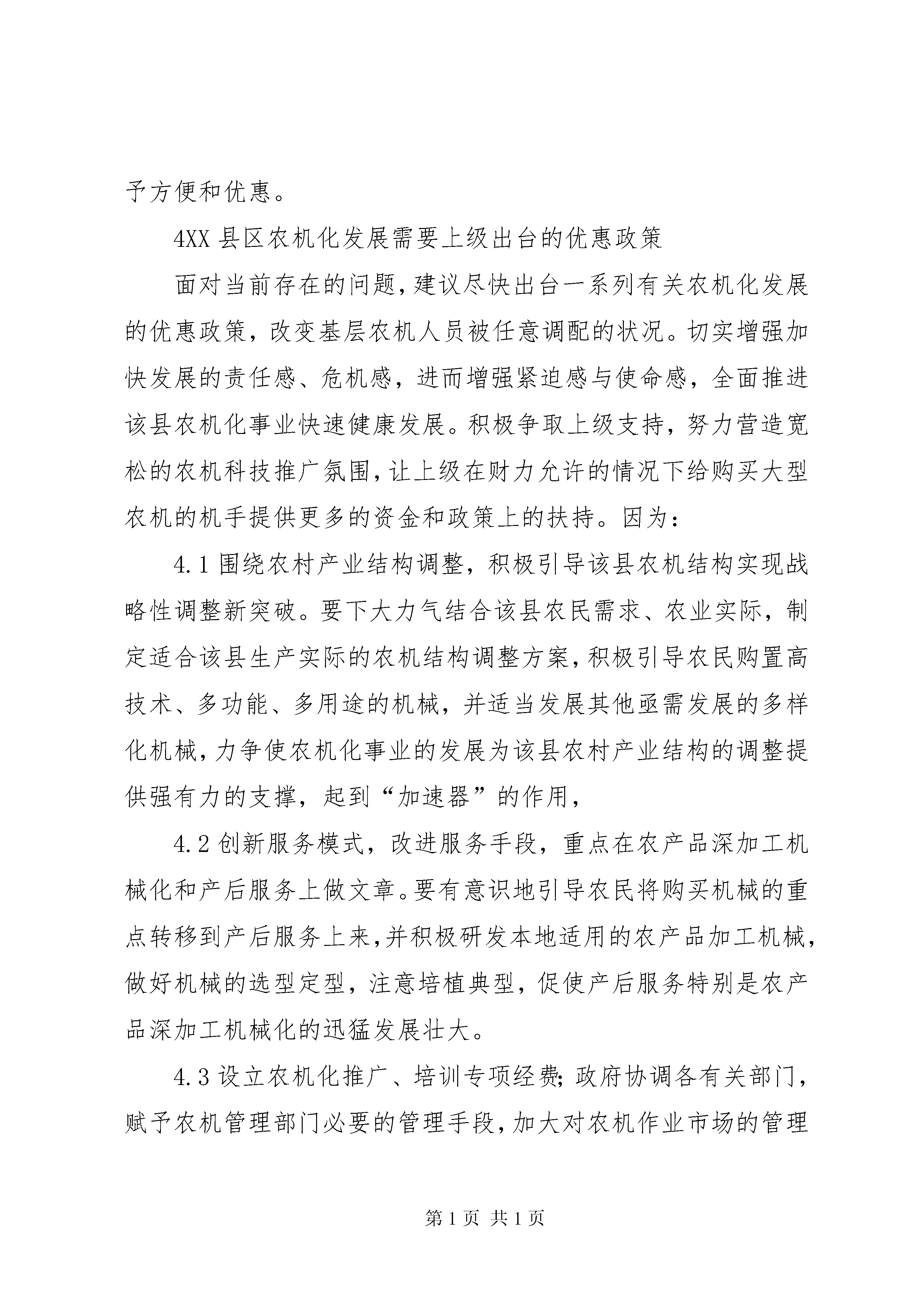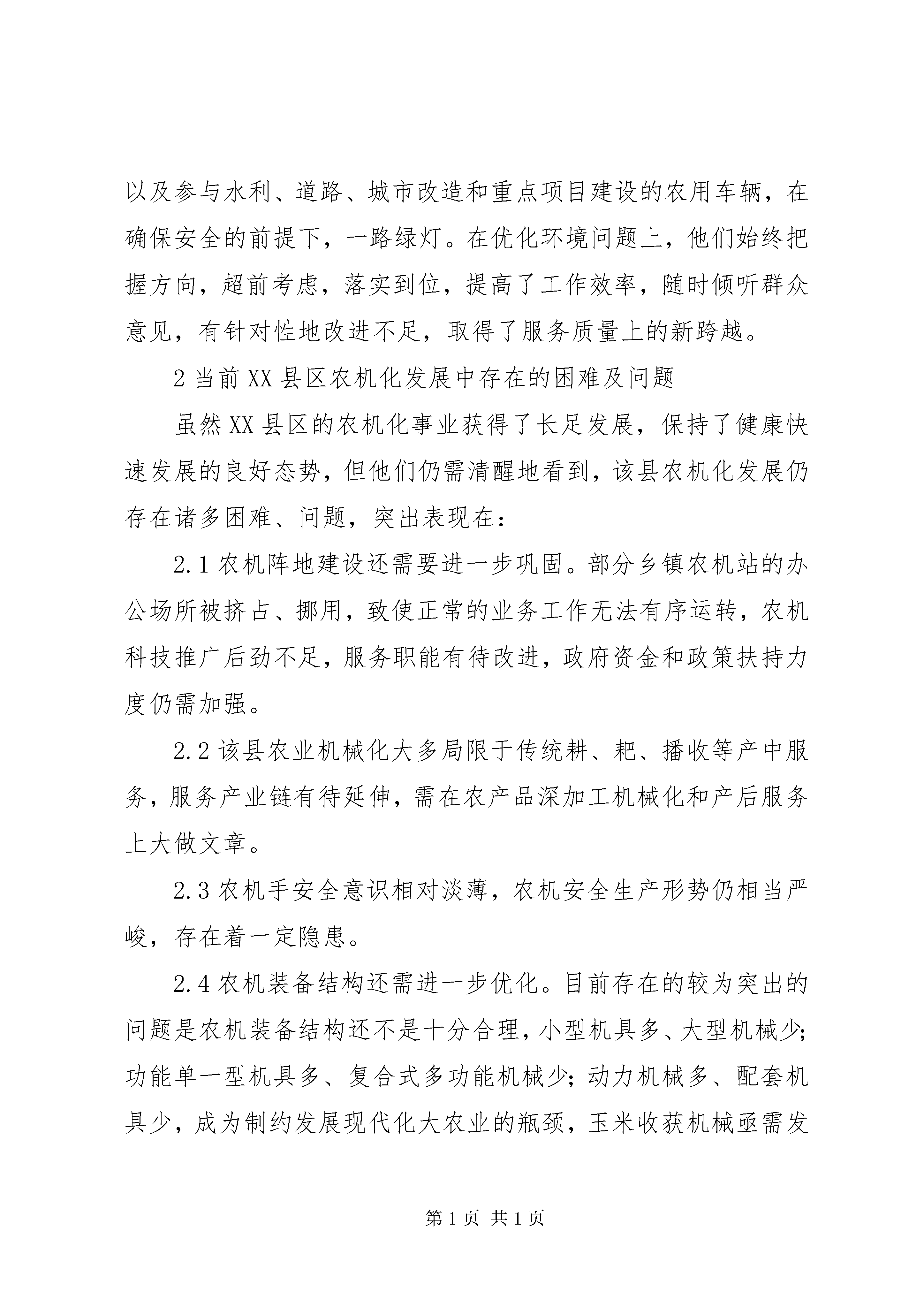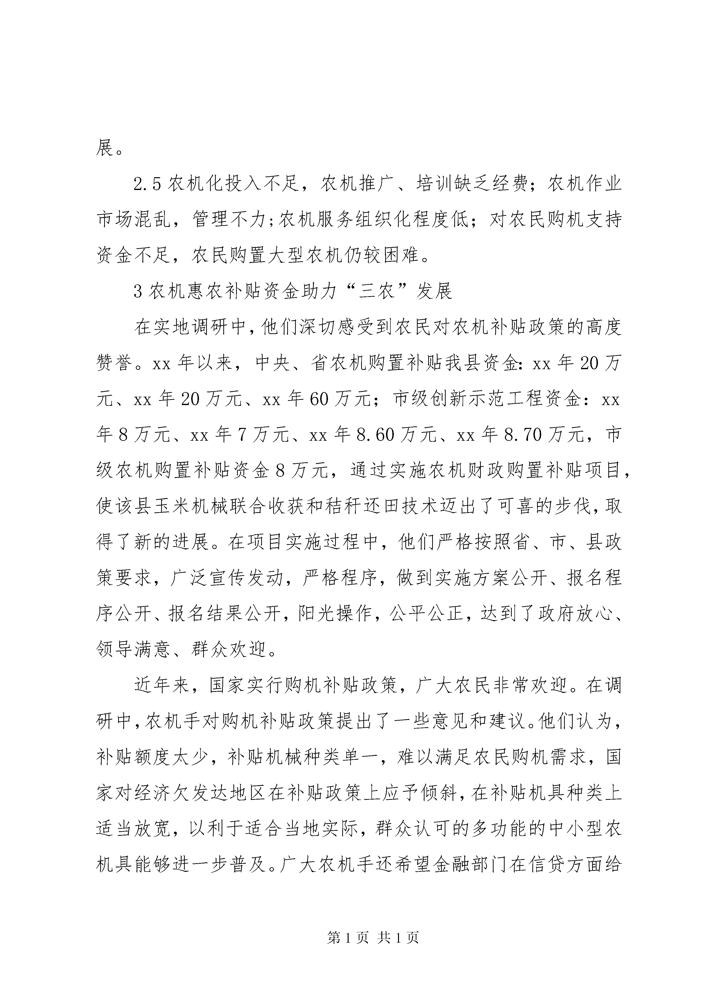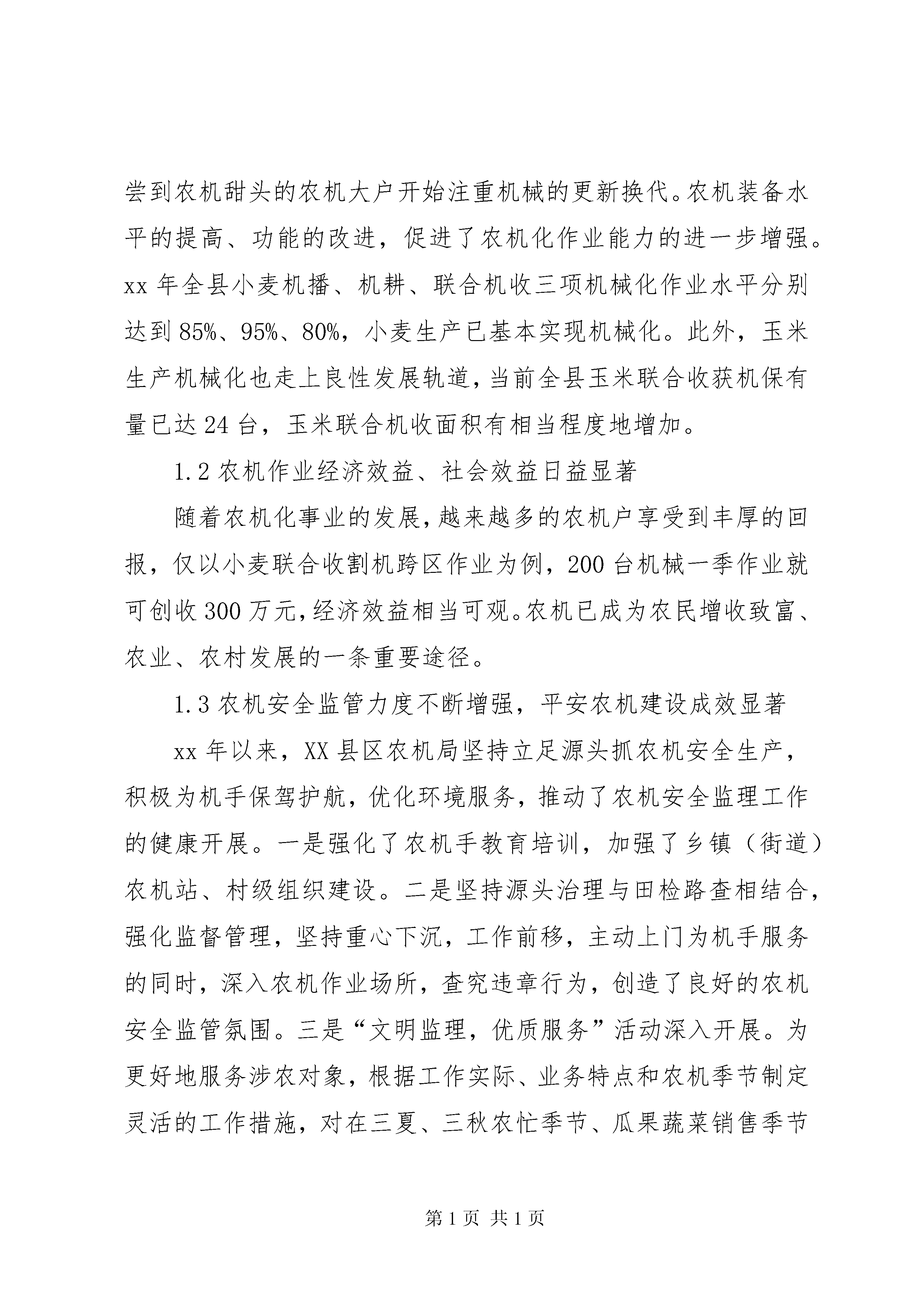 农机化发展调研报告摘要。通过对XX县区农机现状进行详细的调查,针对XX县区农机发展中存在的问题提出了相应的应对措施。关键词:农机化;发展;调研;报告引言从4月13日开始,宁夏银川XX县区农机局组织专人,深入到乡镇农机站、村、农机企业,召开了由农机销售大户、维修大户、农机手及有关部门负责人参加的座谈会,听取了基层农机管理人员和农机从业人员的意见和建议,对基层关心的有关问题进行了当场解答,宣传了有关农机化发展的政策和法规,摸清了该县农机化发展的现状及存在的主要问题,并探讨分析了需要上级出台的优惠政策。1XX县区农机化工作现状1.1农机装备总量持续增长,机械化作业能力显著增强近年来,XX县区农机推广成效显著,农机总动力迅猛增加,截止xx年底全县农机总动力25.60万千瓦,农机总值1.90亿元,分别比xx年增长6.80%和9.20%;新增各类农机具1872台(套)。农机装备水平相应提高,主要体现在:一是大型、多功能机械越来越多地走进千家万户,受到农民群众青睐;二是产中机械迅速得到普及,农机已取代牲畜成为产中作业的主力,并出现了一批专门从事农机作业的专业户;三是机械更新改造力度加快,一些尝到农机甜头的农机大户开始注重机械的更新换代。农机装备水平的提高、功能的改进,促进了农机化作业能力的进一步增强。xx年全县小麦机播、机耕、联合机收三项机械化作业水平分别达到85%、95%、80%,小麦生产已基本实现机械化。此外,玉米生产机械化也走上良性发展轨道,当前全县玉米联合收获机保有量已达24台,玉米联合机收面积有相当程度地增加。1.2农机作业经济效益、社会效益日益显著随着农机化事业的发展,越来越多的农机户享受到丰厚的回报,仅以小麦联合收割机跨区作业为例,200台机械一季作业就可创收300万元,经济效益相当可观。农机已成为农民增收致富、农业、农村发展的一条重要途径。1.3农机安全监管力度不断增强,平安农机建设成效显著xx年以来,XX县区农机局坚持立足源头抓农机安全生产,积极为机手保驾护航,优化环境服务,推动了农机安全监理工作的健康开展。一是强化了农机手教育培训,加强了乡镇(街道)农机站、村级组织建设。二是坚持源头治理与田检路查相结合,强化监督管理,坚持重心下沉,工作前移,主动上门为机手服务的同时,深入农机作业场所,查究违章行为,创造了良好的农机安全监管氛围。三是“文明监理,优质服务”活动深入开展。为更好地服务涉农对象,根据工作实际、业务特点和农机季节制定灵活的工作措施,对在三夏、三秋农忙季节、瓜果蔬菜销售季节以及参与水利、道路、城市改造和重点项目建设的农用车辆,在确保安全的前提下,一路绿灯。在优化环境问题上,他们始终把握方向,超前考虑,落实到位,提高了工作效率,随时倾听群众意见,有针对性地改进不足,取得了服务质量上的新跨越。2当前XX县区农机化发展中存在的困难及问题虽然XX县区的农机化事业获得了长足发展,保持了健康快速发展的良好态势,但他们仍需清醒地看到,该县农机化发展仍存在诸多困难、问题,突出表现在:2.1农机阵地建设还需要进一步巩固。部分乡镇农机站的办公场所被挤占、挪用,致使正常的业务工作无法有序运转,农机科技推广后劲不足,服务职能有待改进,政府资金和政策扶持力度仍需加强。2.2该县农业机械化大多局限于传统耕、耙、播收等产中服务,服务产业链有待延伸,需在农产品深加工机械化和产后服务上大做文章。2.3农机手安全意识相对淡薄,农机安全生产形势仍相当严峻,存在着一定隐患。2.4农机装备结构还需进一步优化。目前存在的较为突出的问题是农机装备结构还不是十分合理,小型机具多、大型机械少;功能单一型机具多、复合式多功能机械少;动力机械多、配套机具少,成为制约发展现代化大农业的瓶颈,玉米收获机械亟需发展。2.5农机化投入不足,农机推广、培训缺乏经费;农机作业市场混乱,管理不力;农机服务组织化程度低;对农民购机支持资金不足,农民购置大型农机仍较困难。3农机惠农补贴资金助力“三农”发展在实地调研中,他们深切感受到农民对农机补贴政策的高度赞誉。xx年以来,中央、省农机购置补贴我县资金:xx年20万元、xx年20万元、xx年60万元;市级创新示范工程资金:xx年8万元、xx年7万元、xx年8.60万元、xx年8.70万元,市级农机购置补贴资金8万元,通过实施农机财政购置补贴项目,使该县玉米机械联合收获和秸秆还田技术迈出了可喜的步伐,取得了新的进展。在项目实施过程中,他们严格按照省、市、县政策要求,广泛宣传发动,严格程序,做到实施方案公开、报名程序公开、报名结果公开,阳光操作,公平公正,达到了政府放心、领导满意、群众欢迎。近年来,国家实行购机补贴政策,广大农民非常欢迎。在调研中,农机手对购机补贴政策提出了一些意见和建议。他们认为,补贴额度太少,补