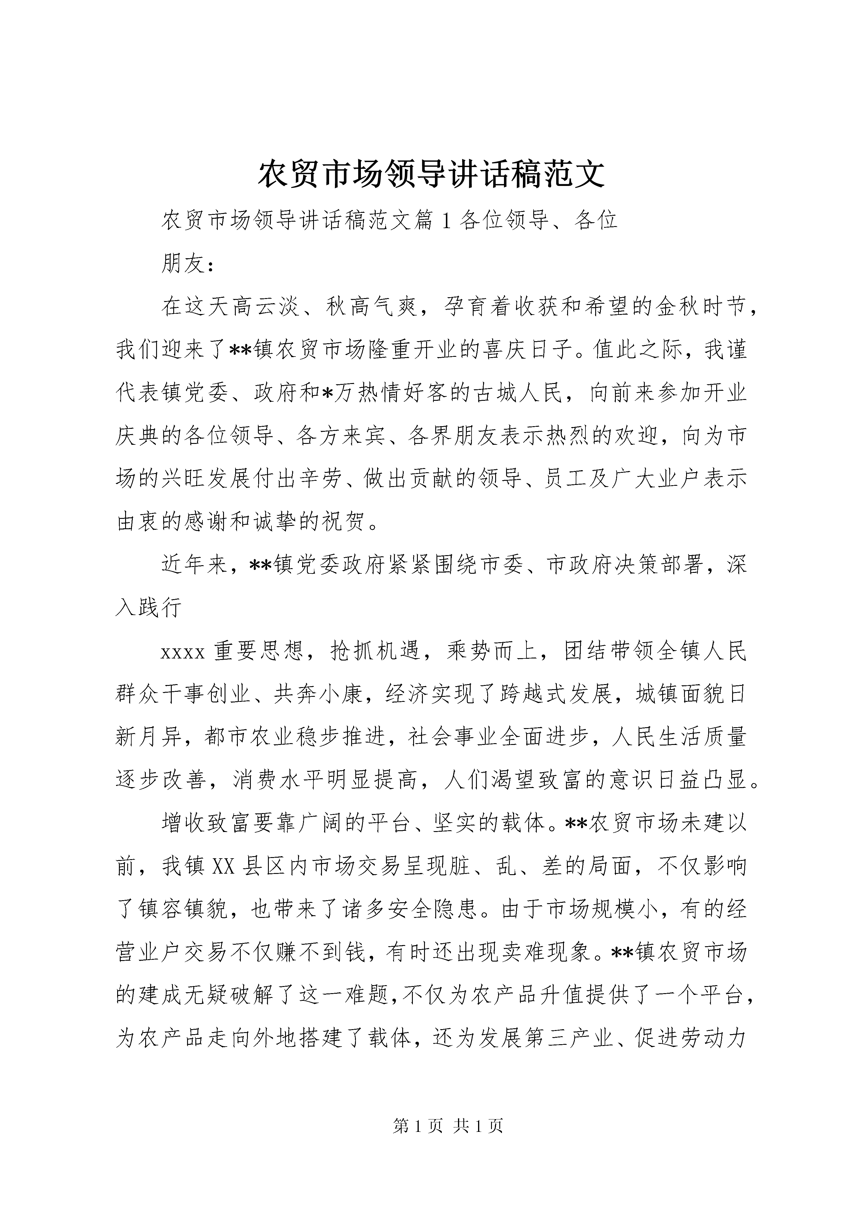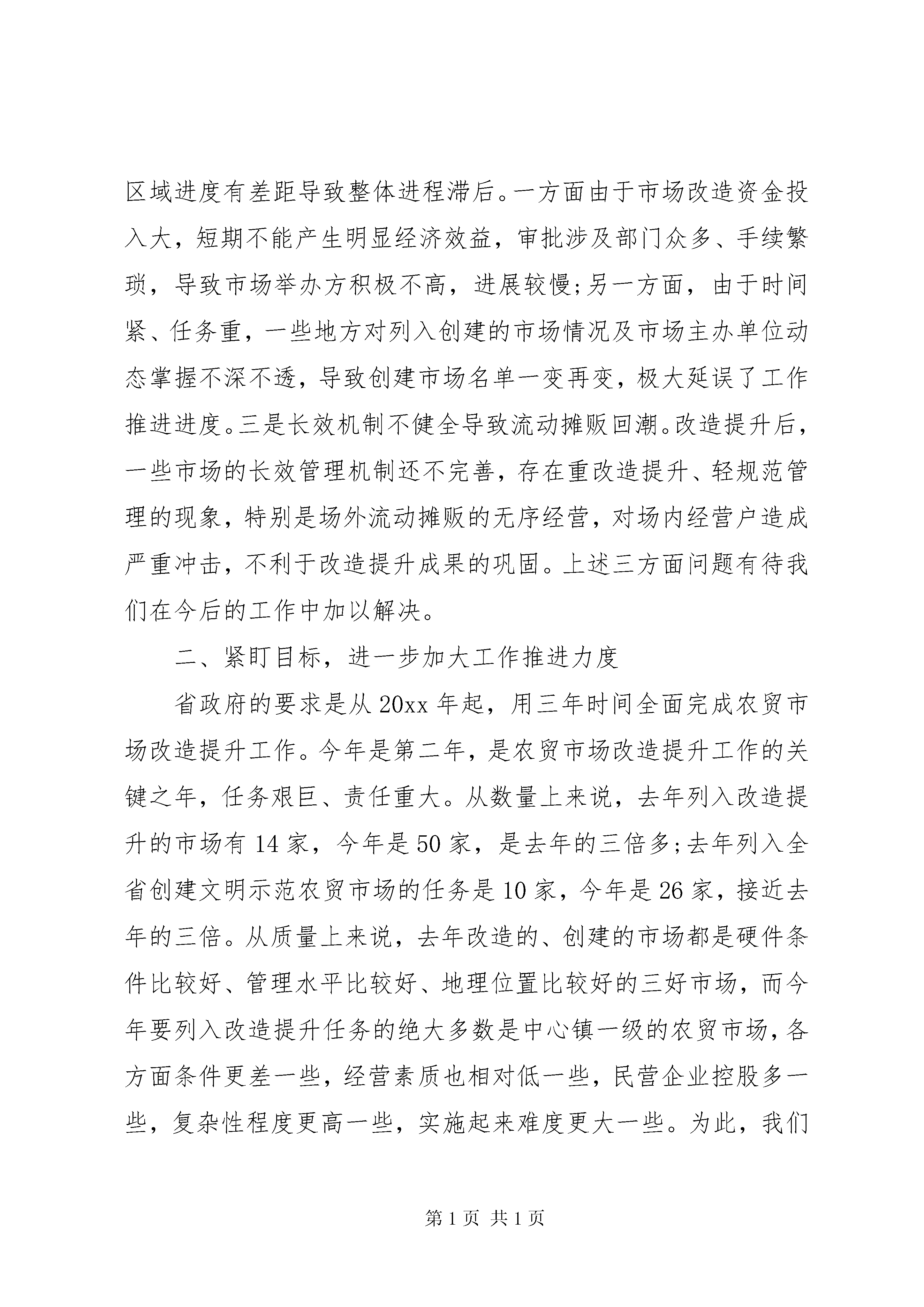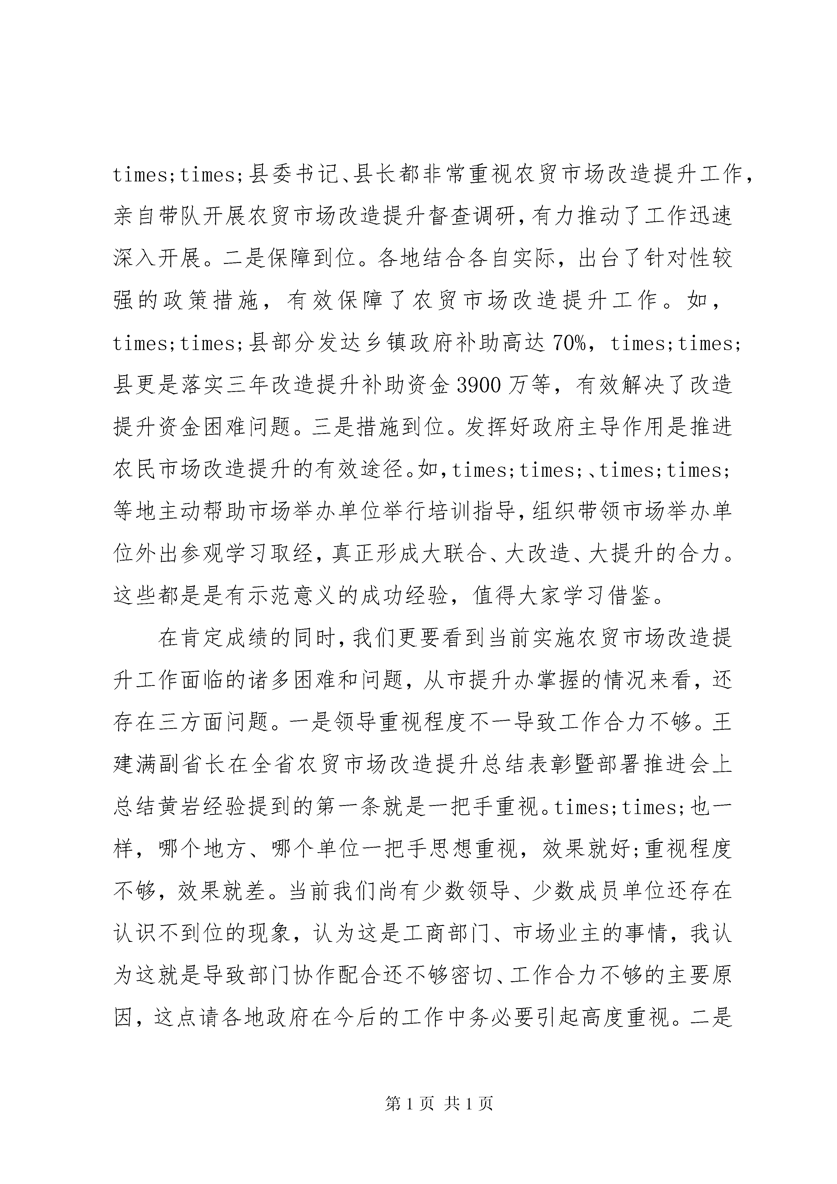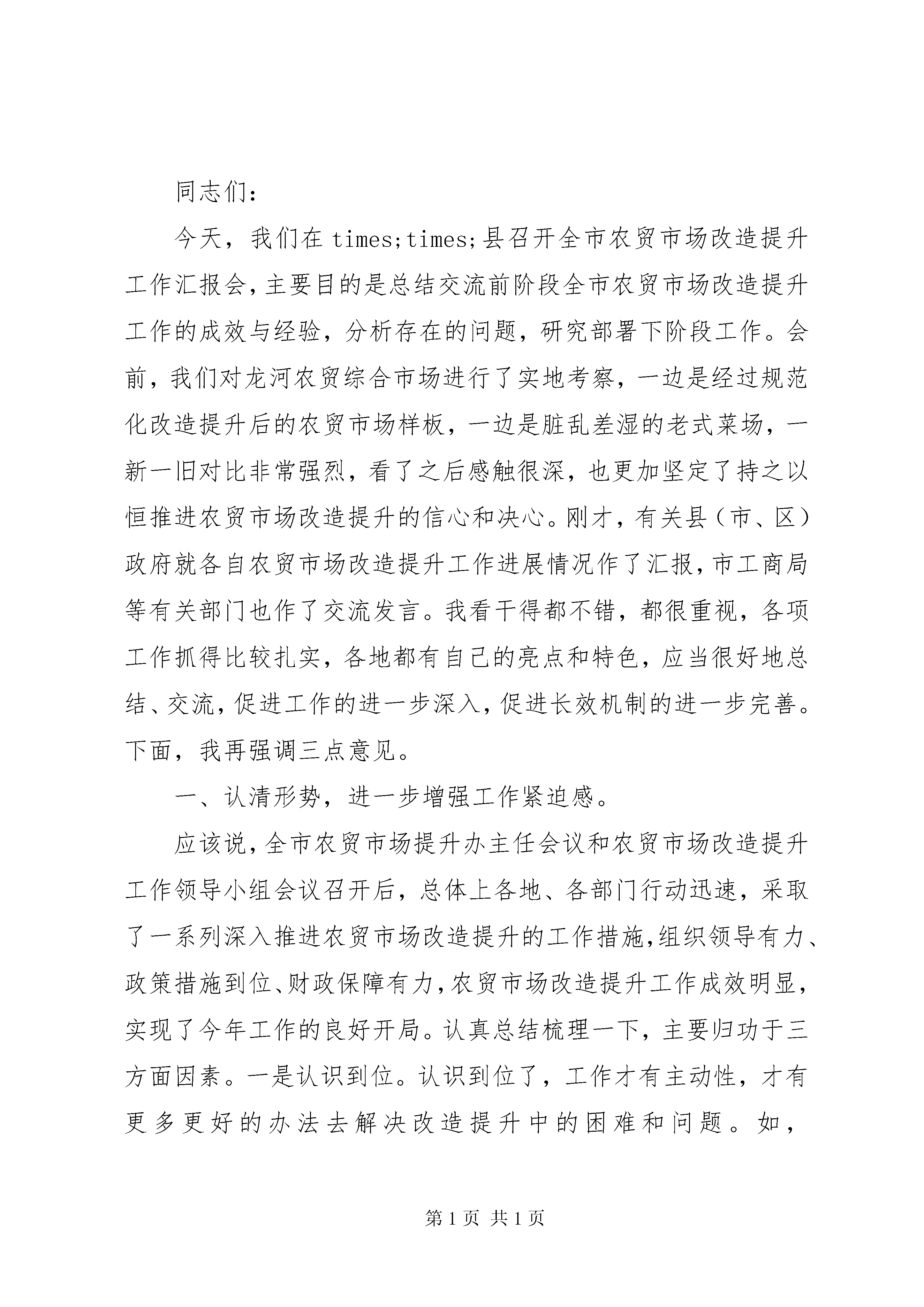 农贸市场领导讲话稿范文农贸市场领导讲话稿范文篇1各位领导、各位朋友:在这天高云淡、秋高气爽,孕育着收获和希望的金秋时节,我们迎来了**镇农贸市场隆重开业的喜庆日子。值此之际,我谨代表镇党委、政府和*万热情好客的古城人民,向前来参加开业庆典的各位领导、各方来宾、各界朋友表示热烈的欢迎,向为市场的兴旺发展付出辛劳、做出贡献的领导、员工及广大业户表示由衷的感谢和诚挚的祝贺。近年来,**镇党委政府紧紧围绕市委、市政府决策部署,深入践行xxxx重要思想,抢抓机遇,乘势而上,团结带领全镇人民群众干事创业、共奔小康,经济实现了跨越式发展,城镇面貌日新月异,都市农业稳步推进,社会事业全面进步,人民生活质量逐步改善,消费水平明显提高,人们渴望致富的意识日益凸显。增收致富要靠广阔的平台、坚实的载体。**农贸市场未建以前,我镇XX县区内市场交易呈现脏、乱、差的局面,不仅影响了镇容镇貌,也带来了诸多安全隐患。由于市场规模小,有的经营业户交易不仅赚不到钱,有时还出现卖难现象。**镇农贸市场的建成无疑破解了这一难题,不仅为农产品升值提供了一个平台,为农产品走向外地搭建了载体,还为发展第三产业、促进劳动力转移开辟了又一途径。我们知道,**镇有着得天独厚的地理气候条件,造就了一大批风味独特、优势明显的如**大葱、乔家脆萝卜、黄家烤肉、北套粉皮、大夫蛋鸡、阎家仔猪等品牌的农副产品,但在大批量外销方面还远远跟不上市场发展的要求,农副产品升值的空间很校今天,市场的建成并投入使用,是各方面共同努力的结果,是全镇人民的共同愿望。目前,虽然市场刚刚建成运行,但我们有理由相信,只要立足本地资源优势、产品优势、品牌优势、区位优势,立足诚信,立足公平,立足开拓,市场未来是广阔的,前景是美好的;我们也有理由相信,只要坚持农业产业化运作,坚持农副产品龙头带动,我们的农副产品一定会走向全盛走向全国,走出国门。可见今年我们提出打造特色市场,建设特色乡镇的城建新理念,也是符合上级决策的,是顺应时代潮流的。在此,希望市场管理者继续发扬艰苦奋斗的精神,奋力拼搏,为我镇农副产品购销、升值做出更大的贡献;也希望上级主管部门领导和社会各界继续关心、支持市场发展,为市场不断壮大、做大做强作出应有的努力。最后真诚地祝愿各位事业有成、万事如意。再次祝绣惠镇北关农贸市场开业大吉、奋勇腾飞、再创辉煌。谢谢大家。农贸市场领导讲话稿范文篇2同志们:今天,我们在times;times;县召开全市农贸市场改造提升工作汇报会,主要目的是总结交流前阶段全市农贸市场改造提升工作的成效与经验,分析存在的问题,研究部署下阶段工作。会前,我们对龙河农贸综合市场进行了实地考察,一边是经过规范化改造提升后的农贸市场样板,一边是脏乱差湿的老式菜场,一新一旧对比非常强烈,看了之后感触很深,也更加坚定了持之以恒推进农贸市场改造提升的信心和决心。刚才,有关县(市、区)政府就各自农贸市场改造提升工作进展情况作了汇报,市工商局等有关部门也作了交流发言。我看干得都不错,都很重视,各项工作抓得比较扎实,各地都有自己的亮点和特色,应当很好地总结、交流,促进工作的进一步深入,促进长效机制的进一步完善。下面,我再强调三点意见。一、认清形势,进一步增强工作紧迫感。应该说,全市农贸市场提升办主任会议和农贸市场改造提升工作领导小组会议召开后,总体上各地、各部门行动迅速,采取了一系列深入推进农贸市场改造提升的工作措施,组织领导有力、政策措施到位、财政保障有力,农贸市场改造提升工作成效明显,实现了今年工作的良好开局。认真总结梳理一下,主要归功于三方面因素。一是认识到位。认识到位了,工作才有主动性,才有更多更好的办法去解决改造提升中的困难和问题。如,times;times;县委书记、县长都非常重视农贸市场改造提升工作,亲自带队开展农贸市场改造提升督查调研,有力推动了工作迅速深入开展。二是保障到位。各地结合各自实际,出台了针对性较强的政策措施,有效保障了农贸市场改造提升工作。如,times;times;县部分发达乡镇政府补助高达70%,times;times;县更是落实三年改造提升补助资金3900万等,有效解决了改造提升资金困难问题。三是措施到位。发挥好政府主导作用是推进农民市场改造提升的有效途径。如,times;times;、times;times;等地主动帮助市场举办单位举行培训指导,组织带领市场举办单位外出参观学习取经,真正形成大联合、大改造、大提升的合力。这些都是是有示范意义的成功经验,值得大家学习借鉴。在肯定成绩的同时,我们更要看到当前实施农贸市场改造提升工作面临的诸多困难和问题,从市提升办掌握的情况来看,还存在三方面问题。一是领导重视程度不一导致工作合力不够。王建满副省长在全省农贸市场改造提升总结表彰暨部署推进会上总结黄岩经验