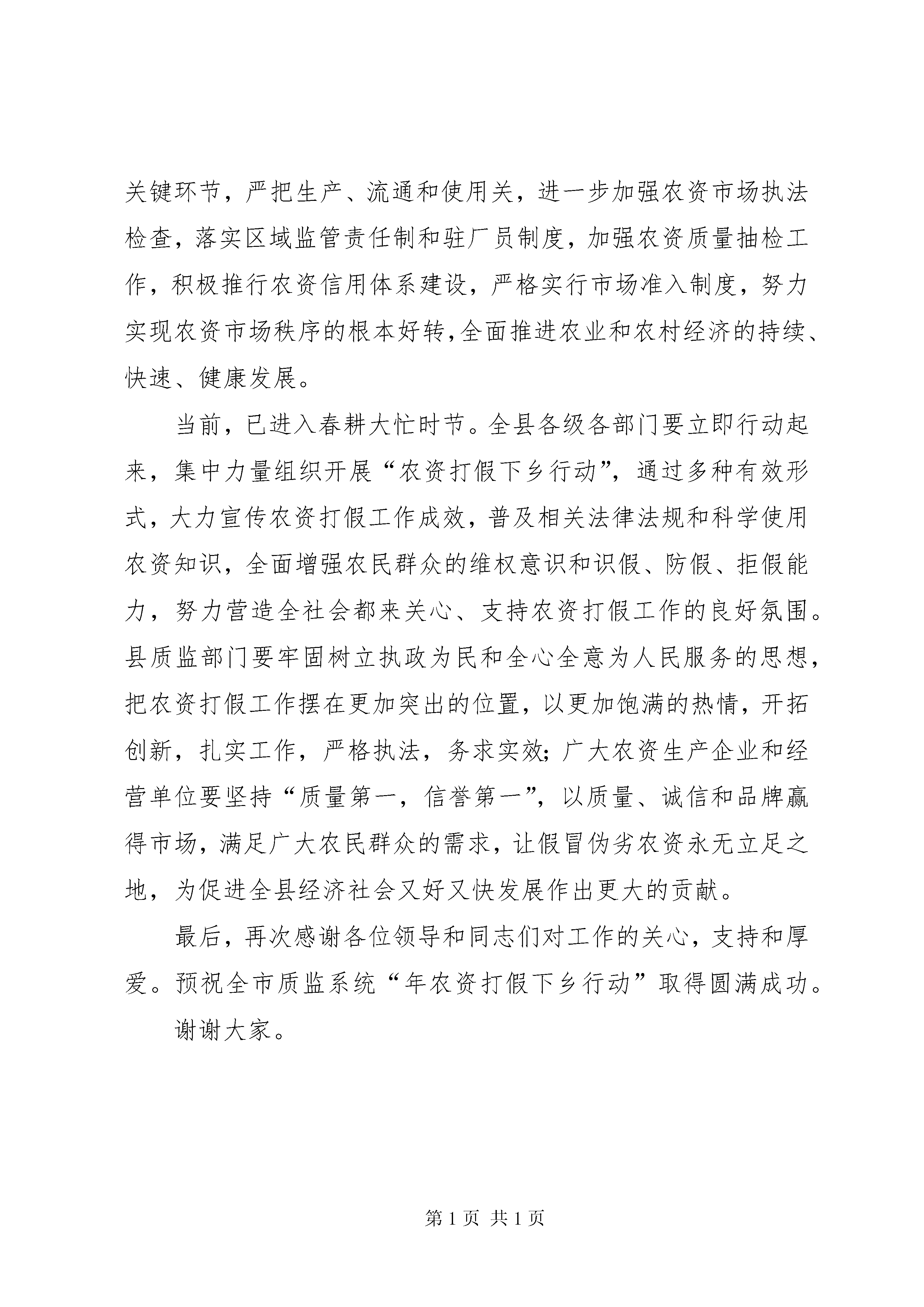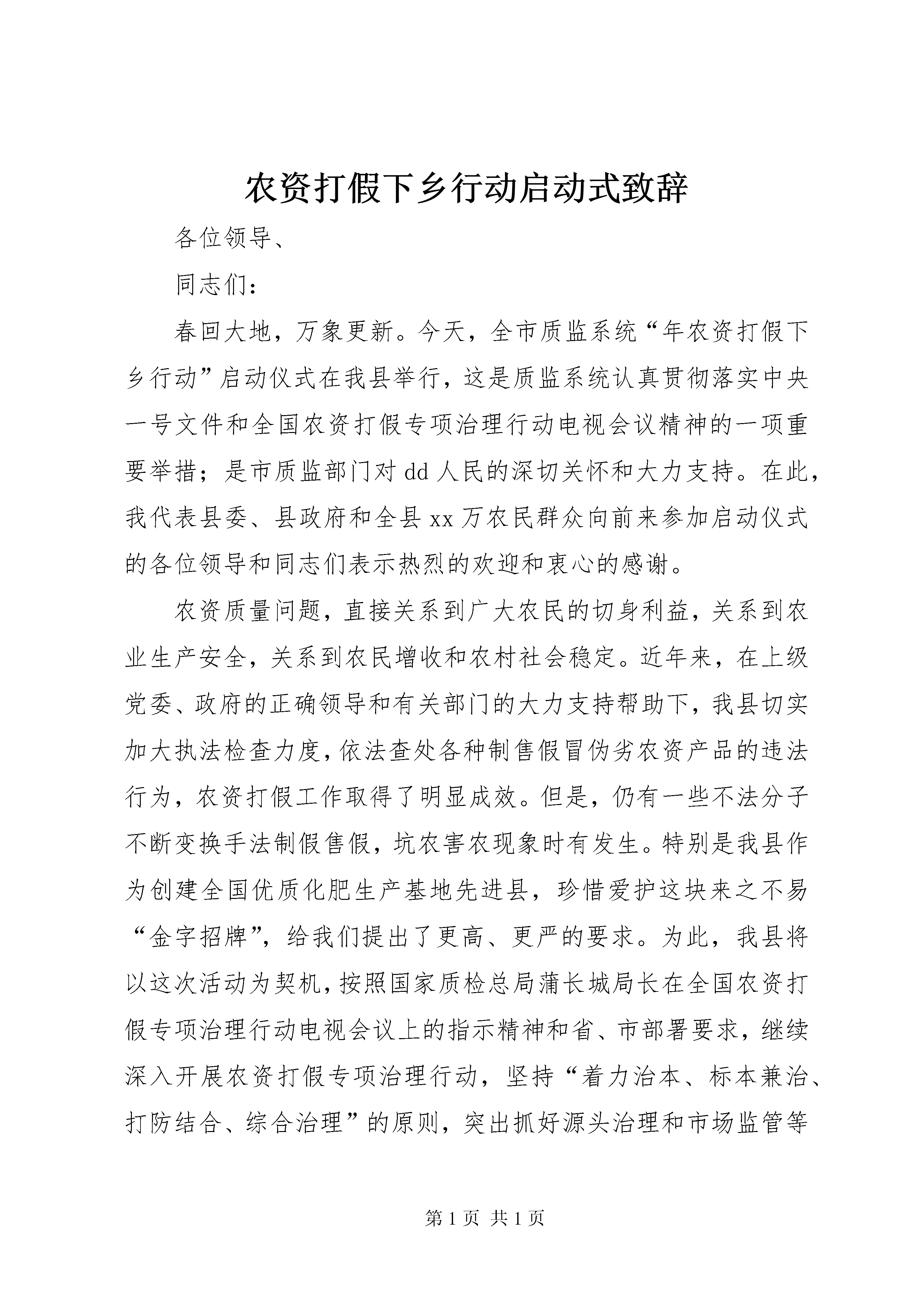 农资打假下乡行动启动式致辞各位领导、同志们:春回大地,万象更新。今天,全市质监系统“年农资打假下乡行动”启动仪式在我县举行,这是质监系统认真贯彻落实中央一号文件和全国农资打假专项治理行动电视会议精神的一项重要举措;是市质监部门对dd人民的深切关怀和大力支持。在此,我代表县委、县政府和全县xx万农民群众向前来参加启动仪式的各位领导和同志们表示热烈的欢迎和衷心的感谢。农资质量问题,直接关系到广大农民的切身利益,关系到农业生产安全,关系到农民增收和农村社会稳定。近年来,在上级党委、政府的正确领导和有关部门的大力支持帮助下,我县切实加大执法检查力度,依法查处各种制售假冒伪劣农资产品的违法行为,农资打假工作取得了明显成效。但是,仍有一些不法分子不断变换手法制假售假,坑农害农现象时有发生。特别是我县作为创建全国优质化肥生产基地先进县,珍惜爱护这块来之不易“金字招牌”,给我们提出了更高、更严的要求。为此,我县将以这次活动为契机,按照国家质检总局蒲长城局长在全国农资打假专项治理行动电视会议上的指示精神和省、市部署要求,继续深入开展农资打假专项治理行动,坚持“着力治本、标本兼治、打防结合、综合治理”的原则,突出抓好源头治理和市场监管等关键环节,严把生产、流通和使用关,进一步加强农资市场执法检查,落实区域监管责任制和驻厂员制度,加强农资质量抽检工作,积极推行农资信用体系建设,严格实行市场准入制度,努力实现农资市场秩序的根本好转,全面推进农业和农村经济的持续、快速、健康发展。当前,已进入春耕大忙时节。全县各级各部门要立即行动起来,集中力量组织开展“农资打假下乡行动”,通过多种有效形式,大力宣传农资打假工作成效,普及相关法律法规和科学使用农资知识,全面增强农民群众的维权意识和识假、防假、拒假能力,努力营造全社会都来关心、支持农资打假工作的良好氛围。县质监部门要牢固树立执政为民和全心全意为人民服务的思想,把农资打假工作摆在更加突出的位置,以更加饱满的热情,开拓创新,扎实工作,严格执法,务求实效;广大农资生产企业和经营单位要坚持“质量第一,信誉第一”,以质量、诚信和品牌赢得市场,满足广大农民群众的需求,让假冒伪劣农资永无立足之地,为促进全县经济社会又好又快发展作出更大的贡献。最后,再次感谢各位领导和同志们对工作的关心,支持和厚爱。预祝全市质监系统“年农资打假下乡行动”取得圆满成功。谢谢大家。