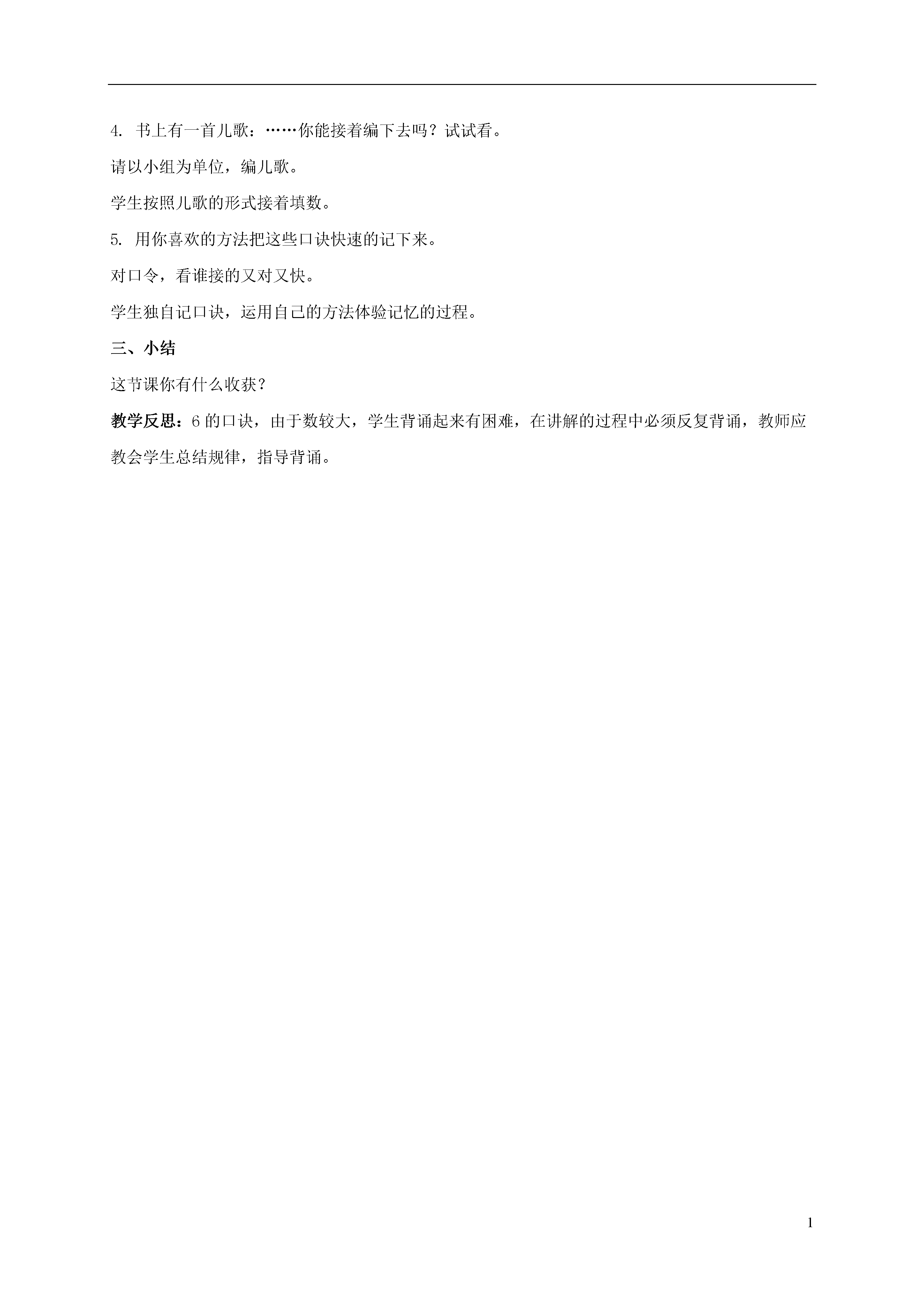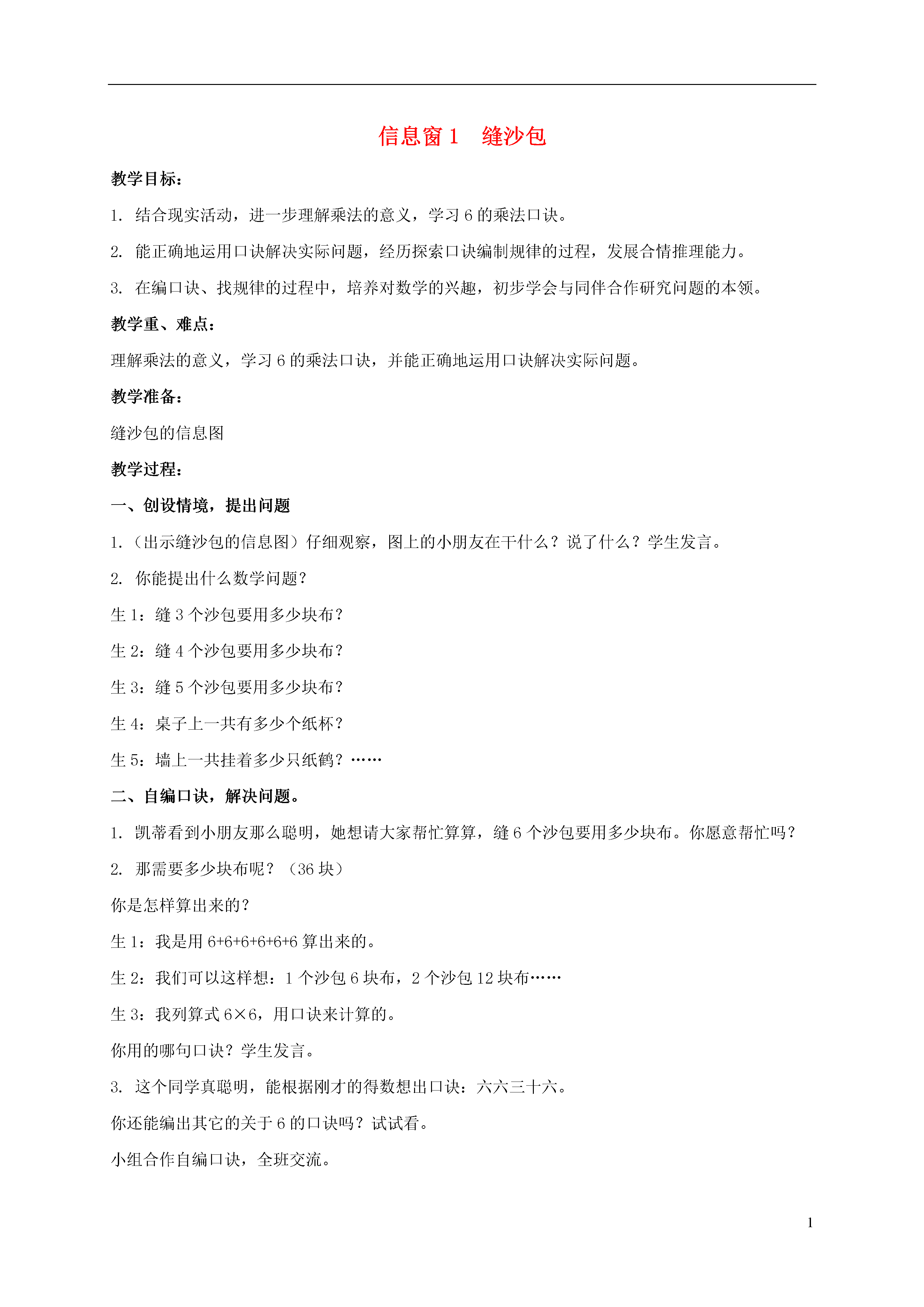 1信息窗1缝沙包教学目标:1.结合现实活动,进一步理解乘法的意义,学习6的乘法口诀。2.能正确地运用口诀解决实际问题,经历探索口诀编制规律的过程,发展合情推理能力。3.在编口诀、找规律的过程中,培养对数学的兴趣,初步学会与同伴合作研究问题的本领。教学重、难点:理解乘法的意义,学习6的乘法口诀,并能正确地运用口诀解决实际问题。教学准备:缝沙包的信息图教学过程:一、创设情境,提出问题1.(出示缝沙包的信息图)仔细观察,图上的小朋友在干什么?说了什么?学生发言。2.你能提出什么数学问题?生1:缝3个沙包要用多少块布?生2:缝4个沙包要用多少块布?生3:缝5个沙包要用多少块布?生4:桌子上一共有多少个纸杯?生5:墙上一共挂着多少只纸鹤?……二、自编口诀,解决问题。1.凯蒂看到小朋友那么聪明,她想请大家帮忙算算,缝6个沙包要用多少块布。你愿意帮忙吗?2.那需要多少块布呢?(36块)你是怎样算出来的?生1:我是用6+6+6+6+6+6算出来的。生2:我们可以这样想:1个沙包6块布,2个沙包12块布……生3:我列算式6×6,用口诀来计算的。你用的哪句口诀?学生发言。3.这个同学真聪明,能根据刚才的得数想出口诀:六六三十六。你还能编出其它的关于6的口诀吗?试试看。小组合作自编口诀,全班交流。4.书上有一首儿歌:……你能接着编下去吗?试试看。请以小组为单位,编儿歌。学生按照儿歌的形式接着填数。5.用你喜欢的方法把这些口诀快速的记下来。对口令,看谁接的又对又快。学生独自记口诀,运用自己的方法体验记忆的过程。三、小结这节课你有什么收获?教学反思:6的口诀,由于数较大,学生背诵起来有困难,在讲解的过程中必须反复背诵,教师应教会学生总结规律,指导背诵。