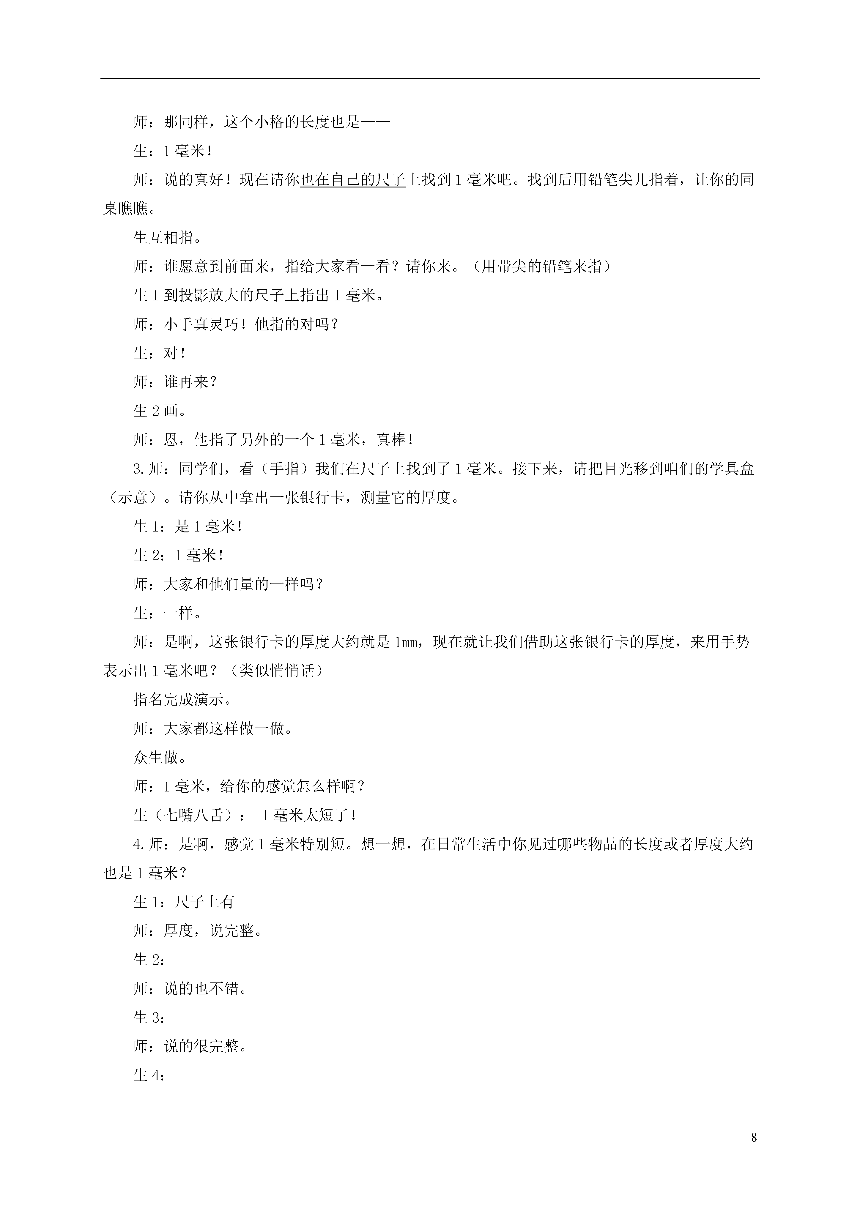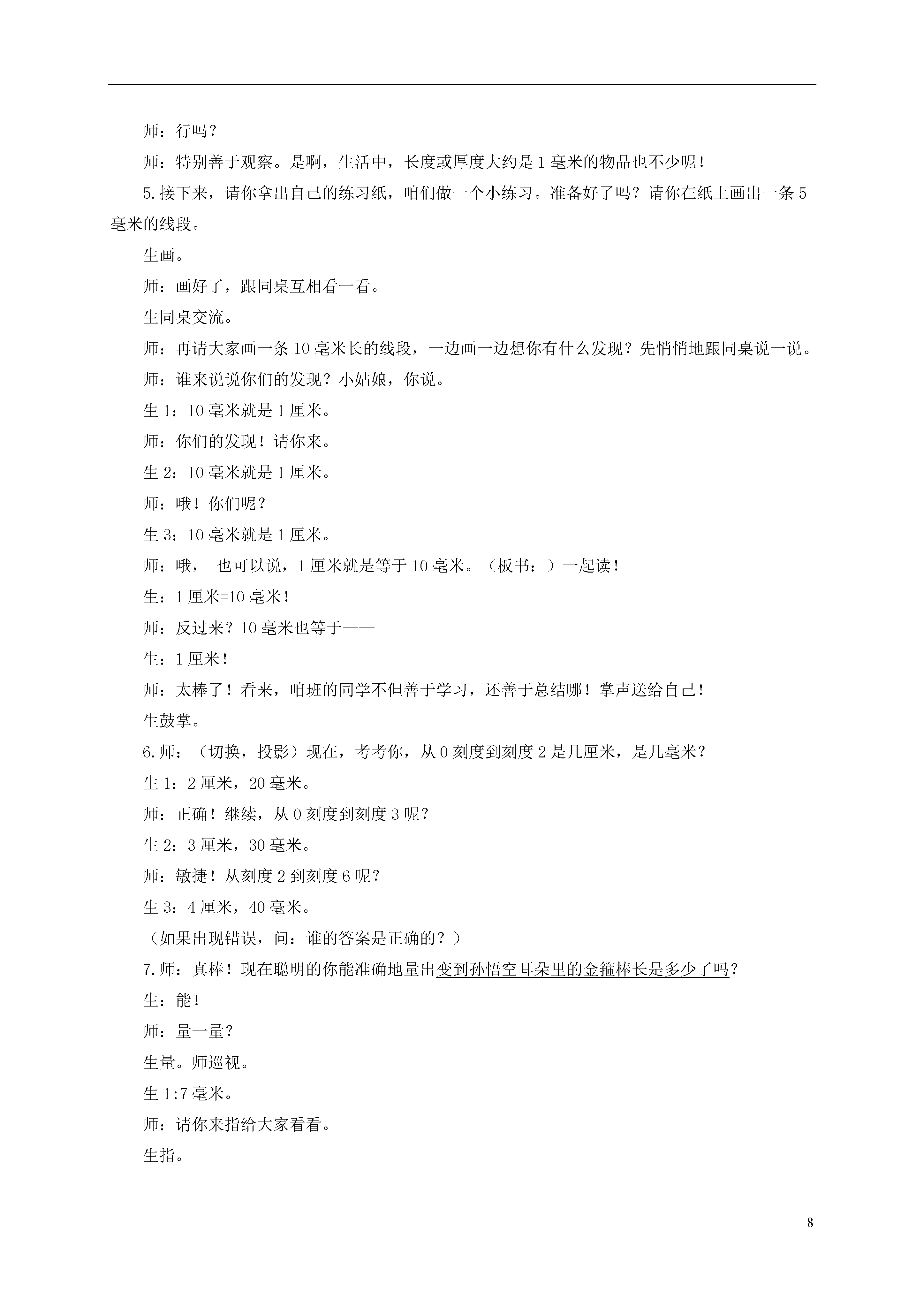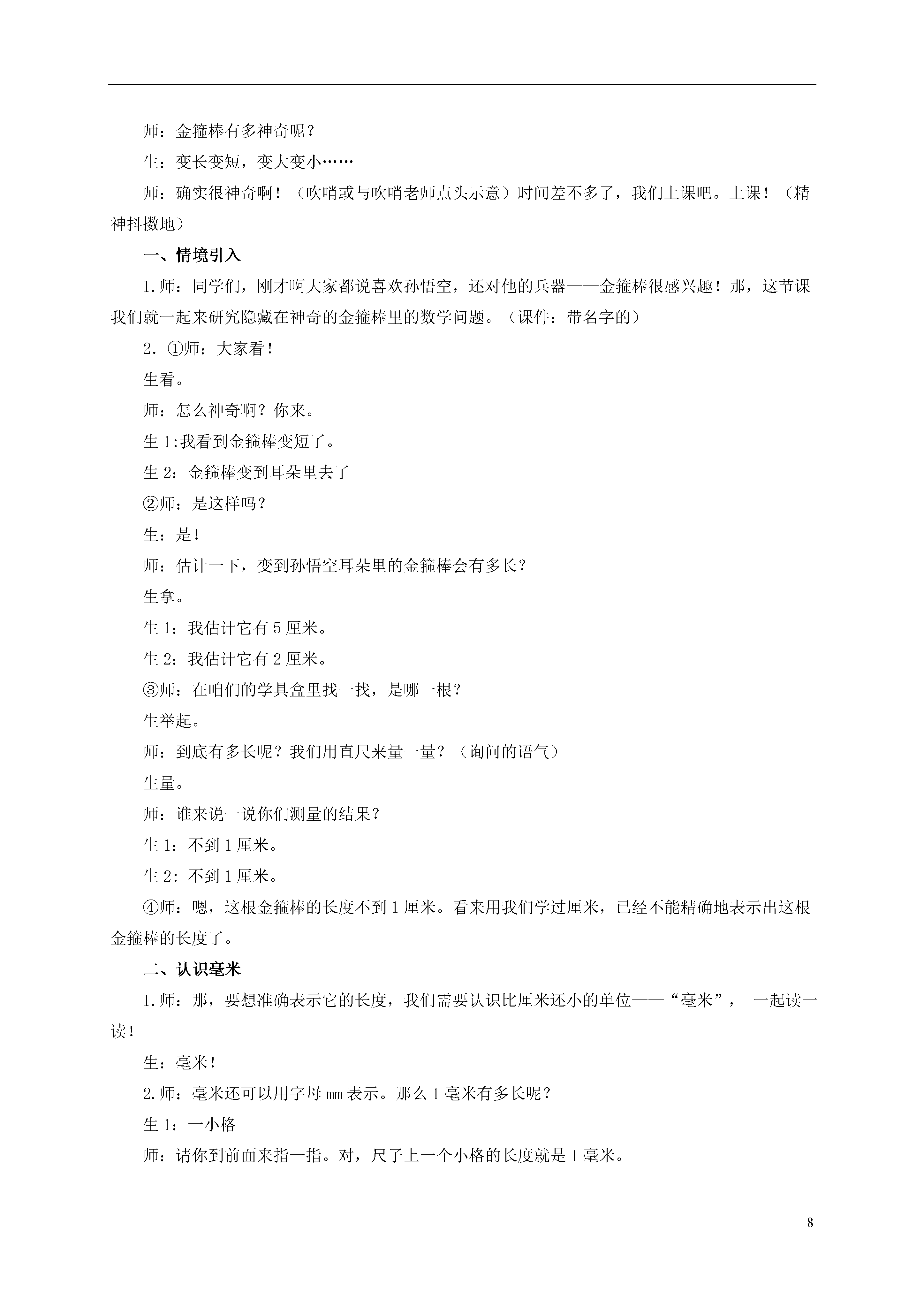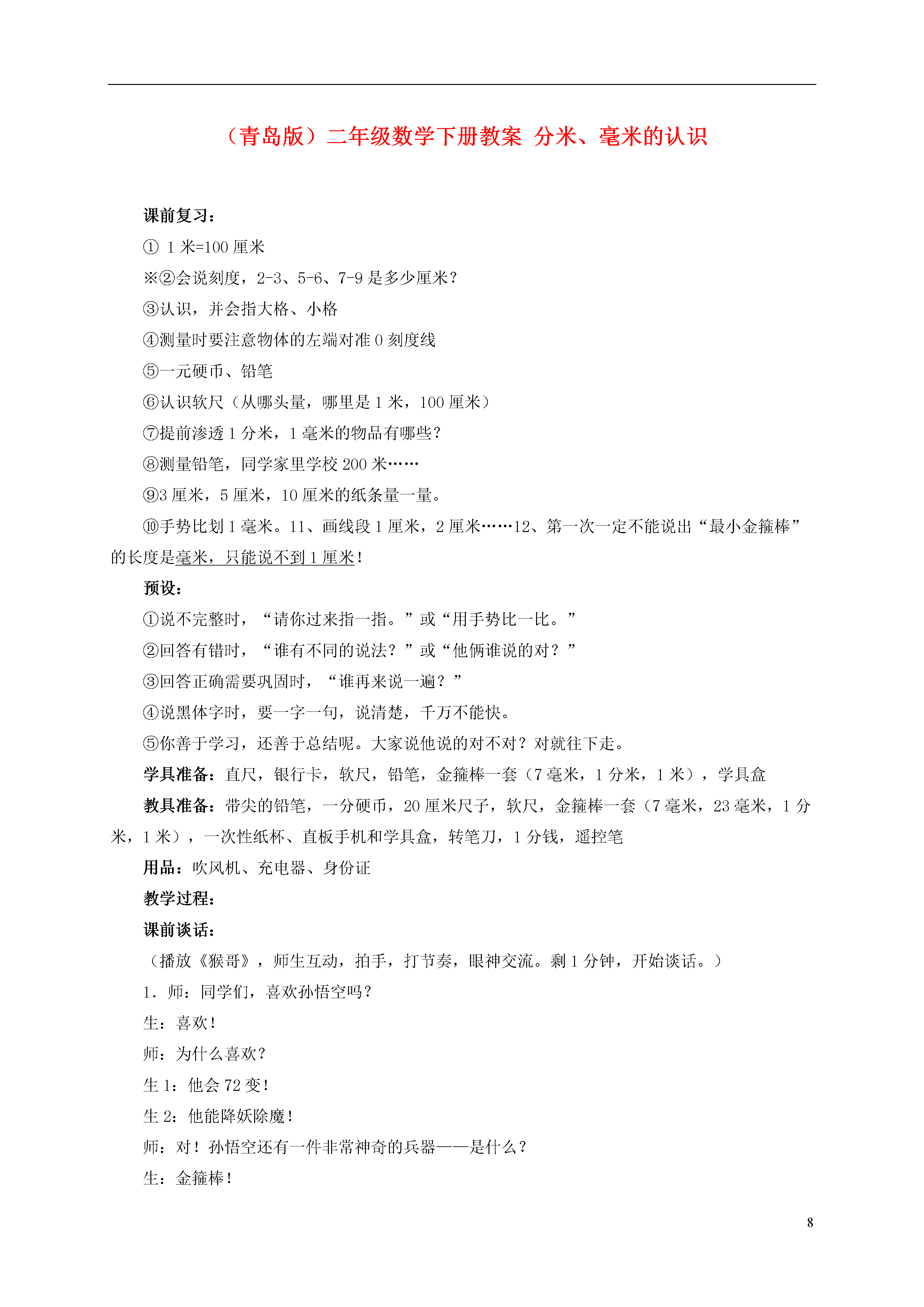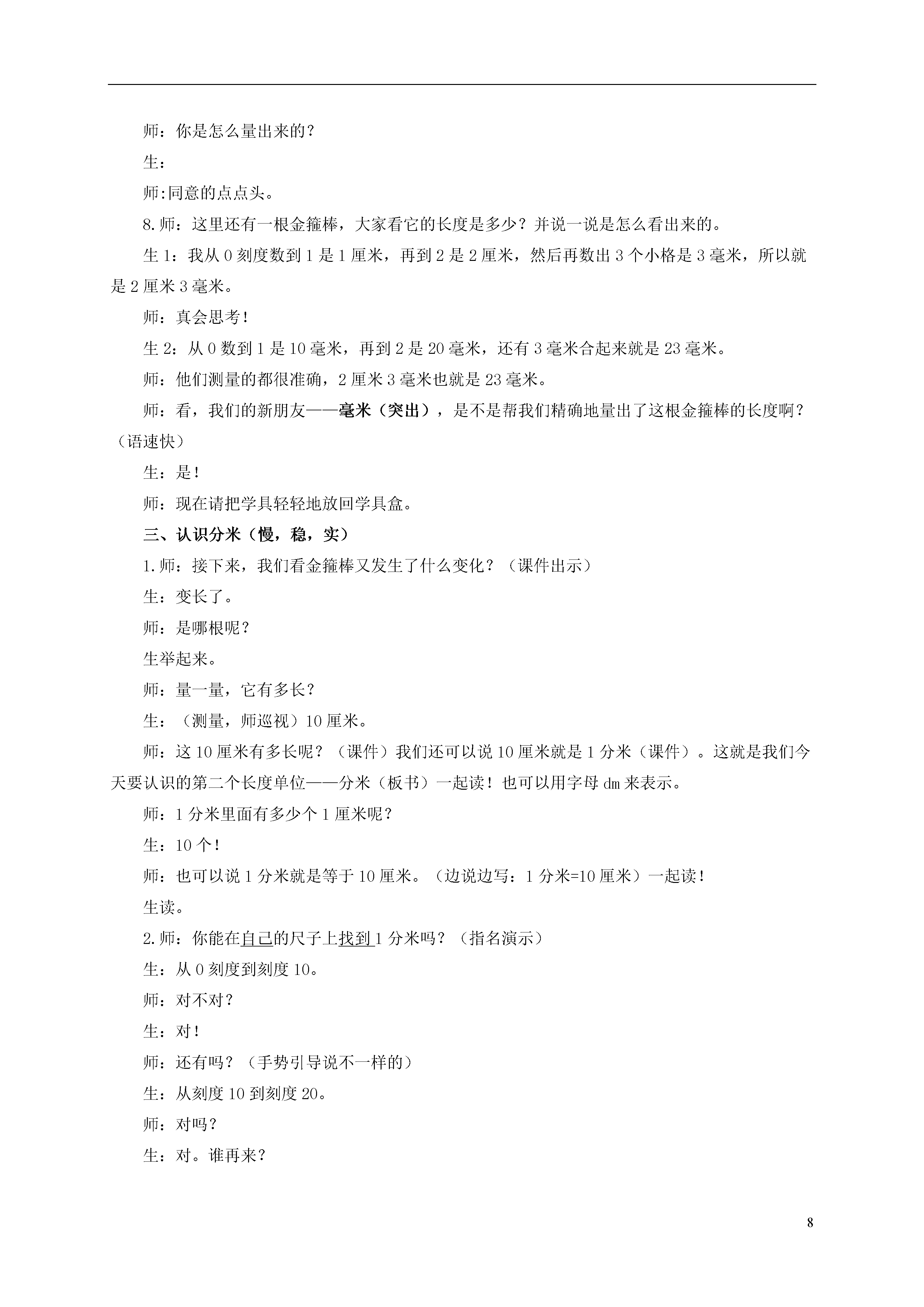 8(青岛版)二年级数学下册教案分米、毫米的认识课前复习:①1米=100厘米※②会说刻度,2-3、5-6、7-9是多少厘米?③认识,并会指大格、小格④测量时要注意物体的左端对准0刻度线⑤一元硬币、铅笔⑥认识软尺(从哪头量,哪里是1米,100厘米)⑦提前渗透1分米,1毫米的物品有哪些?⑧测量铅笔,同学家里学校200米……⑨3厘米,5厘米,10厘米的纸条量一量。⑩手势比划1毫米。11、画线段1厘米,2厘米……12、第一次一定不能说出“最小金箍棒”的长度是毫米,只能说不到1厘米!预设:①说不完整时,“请你过来指一指。”或“用手势比一比。”②回答有错时,“谁有不同的说法?”或“他俩谁说的对?”③回答正确需要巩固时,“谁再来说一遍?”④说黑体字时,要一字一句,说清楚,千万不能快。⑤你善于学习,还善于总结呢。大家说他说的对不对?对就往下走。学具准备:直尺,银行卡,软尺,铅笔,金箍棒一套(7毫米,1分米,1米),学具盒教具准备:带尖的铅笔,一分硬币,20厘米尺子,软尺,金箍棒一套(7毫米,23毫米,1分米,1米),一次性纸杯、直板手机和学具盒,转笔刀,1分钱,遥控笔用品:吹风机、充电器、身份证教学过程:课前谈话:(播放《猴哥》,师生互动,拍手,打节奏,眼神交流。剩1分钟,开始谈话。)1.师:同学们,喜欢孙悟空吗?生:喜欢!师:为什么喜欢?生1:他会72变!生2:他能降妖除魔!师:对!孙悟空还有一件非常神奇的兵器——是什么?生:金箍棒!师:金箍棒有多神奇呢?生:变长变短,变大变小……师:确实很神奇啊!(吹哨或与吹哨老师点头示意)时间差不多了,我们上课吧。上课!(精神抖擞地)一、情境引入1.师:同学们,刚才啊大家都说喜欢孙悟空,还对他的兵器——金箍棒很感兴趣!那,这节课我们就一起来研究隐藏在神奇的金箍棒里的数学问题。(课件:带名字的)2.①师:大家看!生看。师:怎么神奇啊?你来。生1:我看到金箍棒变短了。生2:金箍棒变到耳朵里去了②师:是这样吗?生:是!师:估计一下,变到孙悟空耳朵里的金箍棒会有多长?生拿。生1:我估计它有5厘米。生2:我估计它有2厘米。③师:在咱们的学具盒里找一找,是哪一根?生举起。师:到底有多长呢?我们用直尺来量一量?(询问的语气)生量。师:谁来说一说你们测量的结果?生1:不到1厘米。生2:不到1厘米。④师:嗯,这根金箍棒的长度不到1厘米。看来用我们学过厘米,已经不能精确地表示出这根金箍棒的长度了。二、认识毫米1.师:那,要想准确表示它的长度,我们需要认识比厘米还小的单位——“毫米”,一起读一读!生:毫米!2.师:毫米还可以用字母mm表示。那么1毫米有多长呢?生1:一小格师:请你到前面来指一指。对,尺子上一个小格的长度就是1毫米。师:那同样,这个小格的长度也是——生:1毫米!师:说的真好!现在请你也在自己的尺子上找到1毫米吧。找到后用铅笔尖儿指着,让你的同桌瞧瞧。生互相指。师:谁愿意到前面来,指给大家看一看?请你来。(用带尖的铅笔来指)生1到投影放大的尺子上指出1毫米。师:小手真灵巧!他指的对吗?生:对!师:谁再来?生2画。师:恩,他指了另外的一个1毫米,真棒!3.师:同学们,看(手指)我们在尺子上找到了1毫米。接下来,请把目光移到咱们的学具盒(示意)。请你从中拿出一张银行卡,测量它的厚度。生1:是1毫米!生2:1毫米!师:大家和他们量的一样吗?生:一样。师:是啊,这张银行卡的厚度大约就是1mm,现在就让我们借助这张银行卡的厚度,来用手势表示出1毫米吧?(类似悄悄话)指名完成演示。师:大家都这样做一做。众生做。师:1毫米,给你的感觉怎么样啊?生(七嘴八舌):1毫米太短了!4.师:是啊,感觉1毫米特别短。想一想,在日常生活中你见过哪些物品的长度或者厚度大约也是1毫米?生1:尺子上有师:厚度,说完整。生2:师:说的也不错。生3:师:说的很完整。生4:师:行吗?师:特别善于观察。是啊,生活中,长度或厚度大约是1毫米的物品也不少呢!5.接下来,请你拿出自己的练习纸,咱们做一个小练习。准备好了吗?请你在纸上画出一条5毫米的线段。生画。师:画好了,跟同桌互相看一看。生同桌交流。师:再请大家画一条10毫米长的线段,一边画一边想你有什么发现?先悄悄地跟同桌说一说。师:谁来说说你们的发现?小姑娘,你说。生1:10毫米就是1厘米。师:你们的发现!请你来。生2:10毫米就是1厘米。师:哦!你们呢?生3:10毫米就是1厘米。师:哦,也可以说,1厘米就是等于10毫米。(板书:)一起读!生:1厘米=10毫米!师:反过来?10毫米也等于