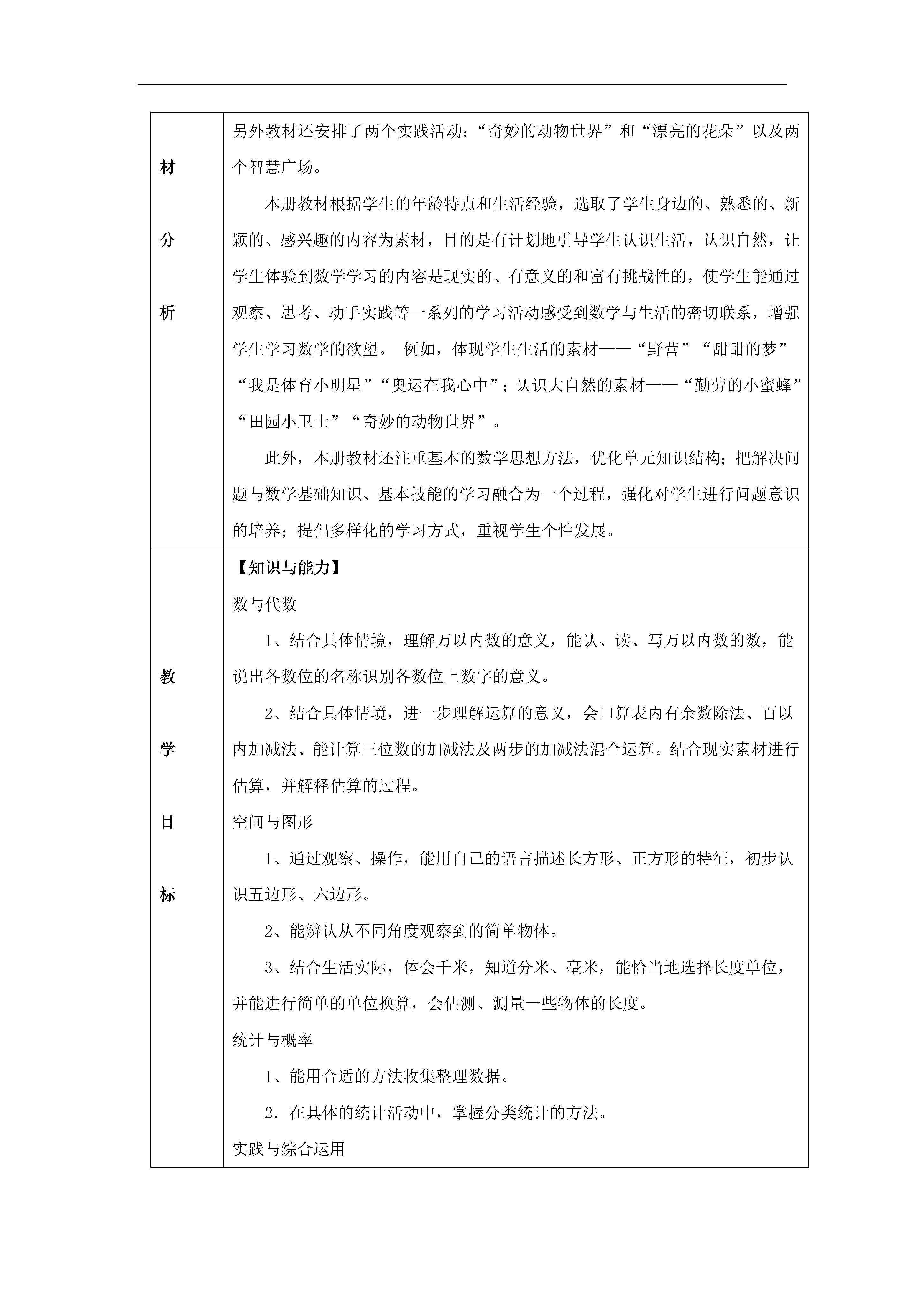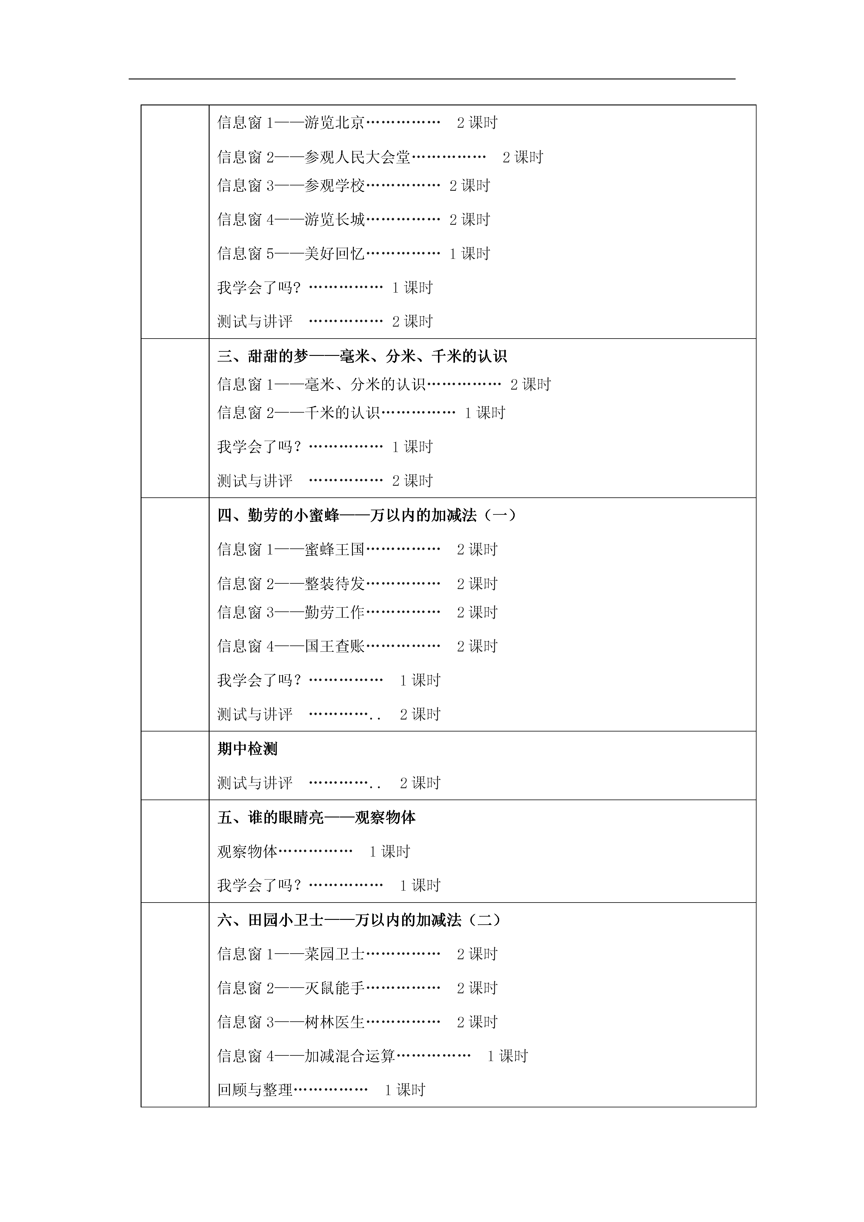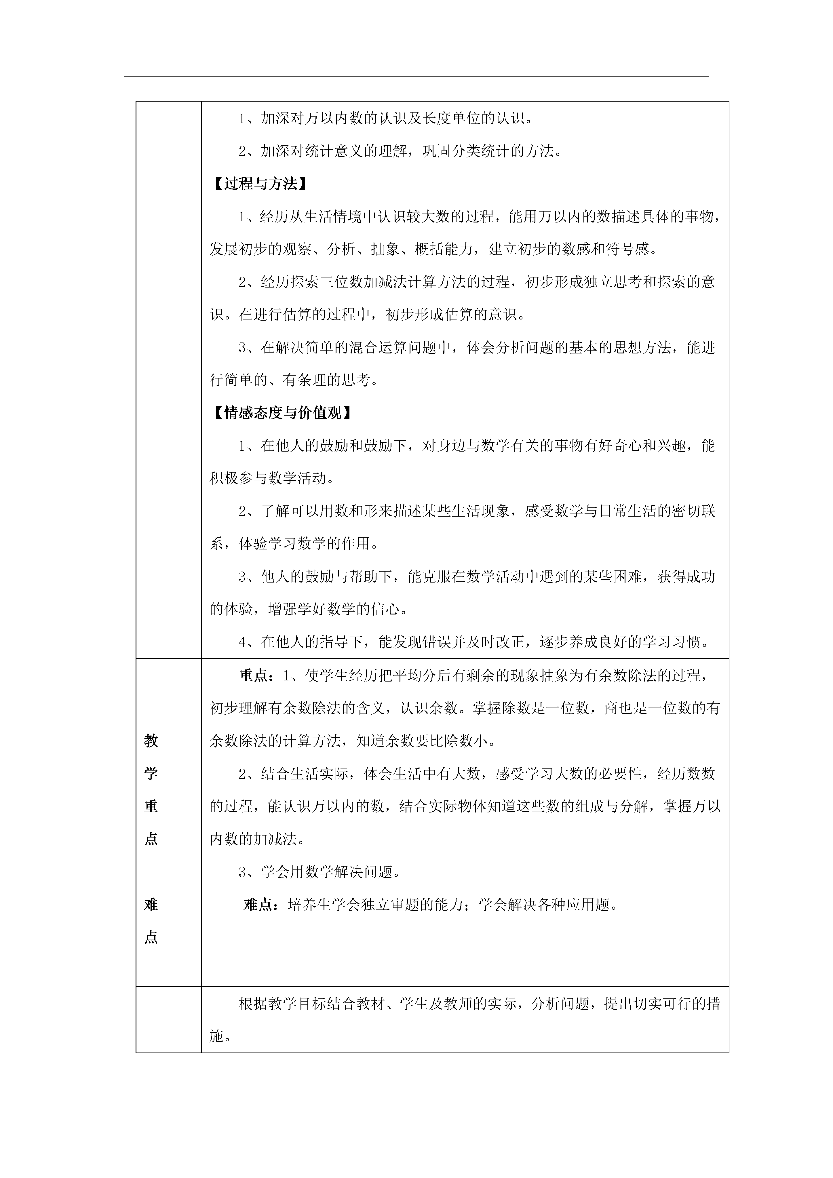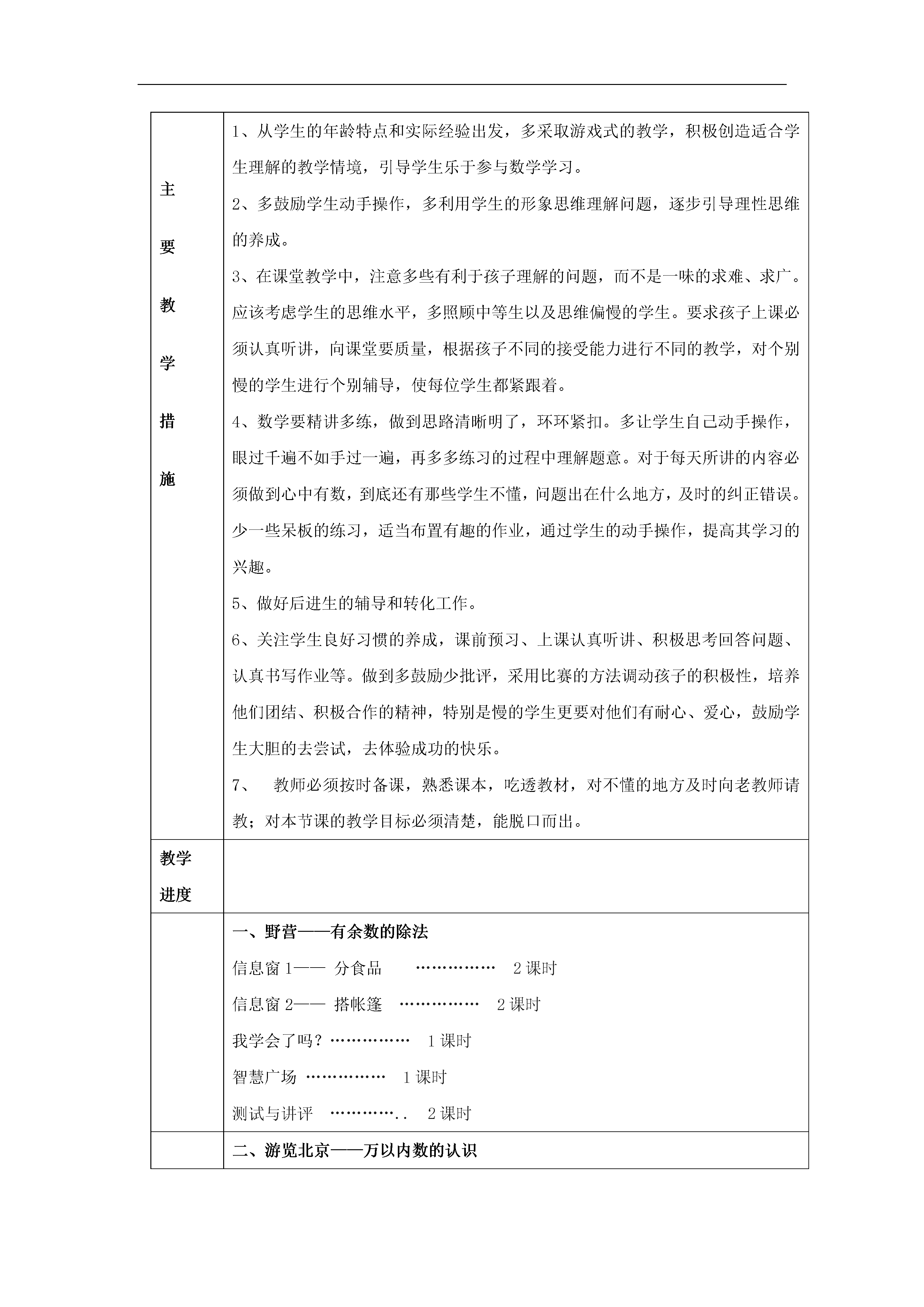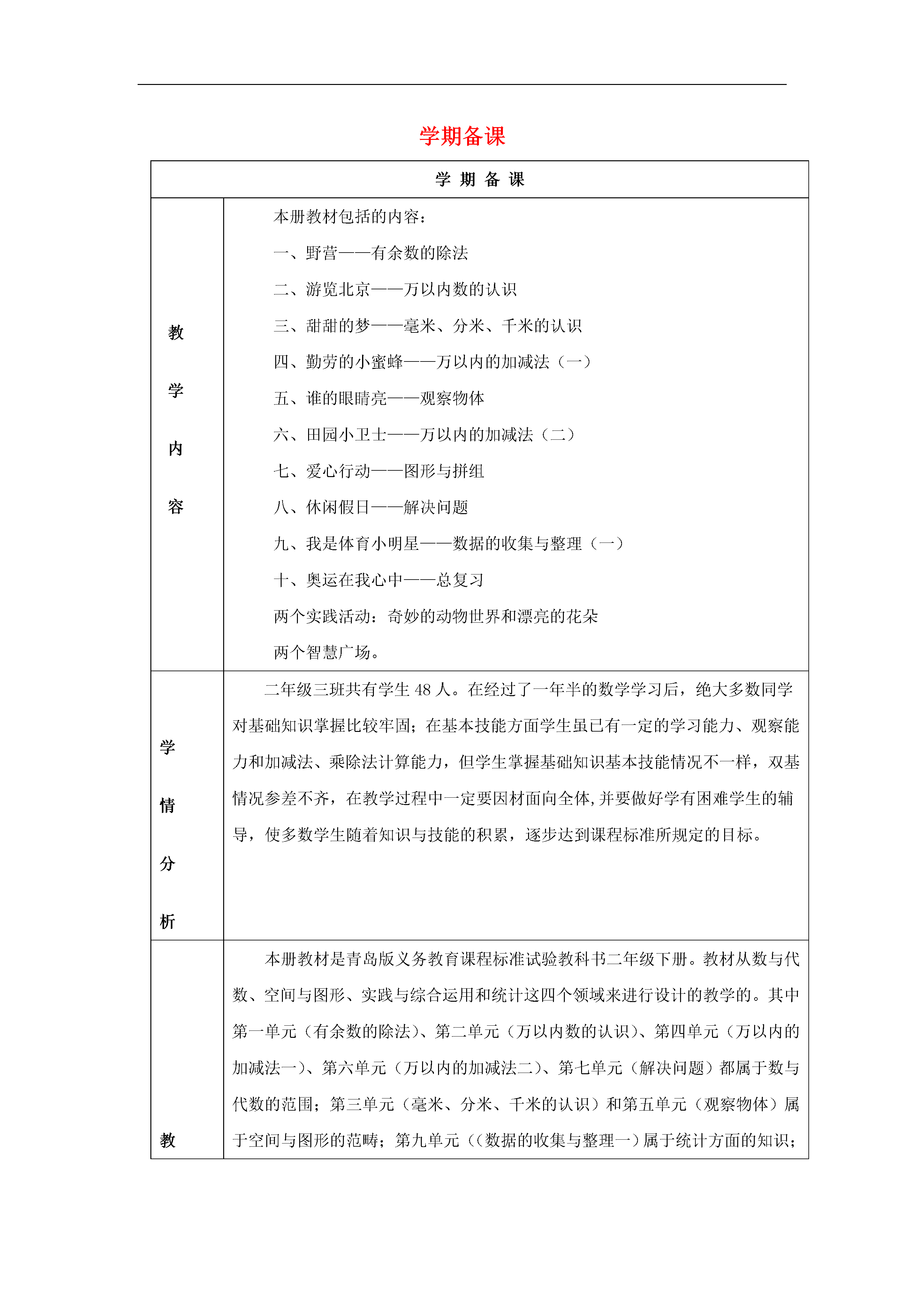 学期备课学期备课教学内容本册教材包括的内容:一、野营——有余数的除法二、游览北京——万以内数的认识三、甜甜的梦——毫米、分米、千米的认识勤劳的小蜜蜂——万以内的加减法(一)谁的眼睛亮——观察物体田园小卫士——万以内的加减法(二)爱心行动——图形与拼组休闲假日——解决问题我是体育小明星——数据的收集与整理(一)奥运在我心中——总复习两个实践活动:奇妙的动物世界和漂亮的花朵两个智慧广场。学情分析二年级三班共有学生48人。在经过了一年半的数学学习后,绝大多数同学对基础知识掌握比较牢固;在基本技能方面学生虽已有一定的学习能力、观察能力和加减法、乘除法计算能力,但学生掌握基础知识基本技能情况不一样,双基情况参差不齐,在教学过程中一定要因材面向全体,并要做好学有困难学生的辅导,使多数学生随着知识与技能的积累,逐步达到课程标准所规定的目标。教材分析本册教材是青岛版义务教育课程标准试验教科书二年级下册。教材从数与代数、空间与图形、实践与综合运用和统计这四个领域来进行设计的教学的。其中第一单元(有余数的除法)、第二单元(万以内数的认识)、第四单元(万以内的加减法一)、第六单元(万以内的加减法二)、第七单元(解决问题)都属于数与代数的范围;第三单元(毫米、分米、千米的认识)和第五单元(观察物体)属于空间与图形的范畴;第九单元((数据的收集与整理一)属于统计方面的知识;另外教材还安排了两个实践活动:“奇妙的动物世界”和“漂亮的花朵”以及两个智慧广场。本册教材根据学生的年龄特点和生活经验,选取了学生身边的、熟悉的、新颖的、感兴趣的内容为素材,目的是有计划地引导学生认识生活,认识自然,让学生体验到数学学习的内容是现实的、有意义的和富有挑战性的,使学生能通过观察、思考、动手实践等一系列的学习活动感受到数学与生活的密切联系,增强学生学习数学的欲望。例如,体现学生生活的素材——“野营”“甜甜的梦”“我是体育小明星”“奥运在我心中”;认识大自然的素材——“勤劳的小蜜蜂”“田园小卫士”“奇妙的动物世界”。此外,本册教材还注重基本的数学思想方法,优化单元知识结构;把解决问题与数学基础知识、基本技能的学习融合为一个过程,强化对学生进行问题意识的培养;提倡多样化的学习方式,重视学生个性发展。教学目标【知识与能力】数与代数1、结合具体情境,理解万以内数的意义,能认、读、写万以内数的数,能说出各数位的名称识别各数位上数字的意义。2、结合具体情境,进一步理解运算的意义,会口算表内有余数除法、百以内加减法、能计算三位数的加减法及两步的加减法混合运算。结合现实素材进行估算,并解释估算的过程。空间与图形1、通过观察、操作,能用自己的语言描述长方形、正方形的特征,初步认识五边形、六边形。2、能辨认从不同角度观察到的简单物体。3、结合生活实际,体会千米,知道分米、毫米,能恰当地选择长度单位,并能进行简单的单位换算,会估测、测量一些物体的长度。统计与概率1、能用合适的方法收集整理数据。2.在具体的统计活动中,掌握分类统计的方法。实践与综合运用1、加深对万以内数的认识及长度单位的认识。2、加深对统计意义的理解,巩固分类统计的方法。【过程与方法】1、经历从生活情境中认识较大数的过程,能用万以内的数描述具体的事物,发展初步的观察、分析、抽象、概括能力,建立初步的数感和符号感。2、经历探索三位数加减法计算方法的过程,初步形成独立思考和探索的意识。在进行估算的过程中,初步形成估算的意识。3、在解决简单的混合运算问题中,体会分析问题的基本的思想方法,能进行简单的、有条理的思考。【情感态度与价值观】1、在他人的鼓励和鼓励下,对身边与数学有关的事物有好奇心和兴趣,能积极参与数学活动。2、了解可以用数和形来描述某些生活现象,感受数学与日常生活的密切联系,体验学习数学的作用。3、他人的鼓励与帮助下,能克服在数学活动中遇到的某些困难,获得成功的体验,增强学好数学的信心。4、在他人的指导下,能发现错误并及时改正,逐步养成良好的学习习惯。教学重点难点重点:1、使学生经历把平均分后有剩余的现象抽象为有余数除法的过程,初步理解有余数除法的含义,认识余数。掌握除数是一位数,商也是一位数的有余数除法的计算方法,知道余数要比除数小。结合生活实际,体会生活中有大数,感受学习大数的必要性,经历数数的过程,能认识万以内的数,结合实际物体知道这些数的组成与分解,掌握万以内数的加减法。3、学会用数学解决问题。难点:培养生学会独立审题的能力;学会解决各种应用题。主要教学措施根据教学目标结合教材、学生及教师的实际,分析问题,提出切实可行的措施。