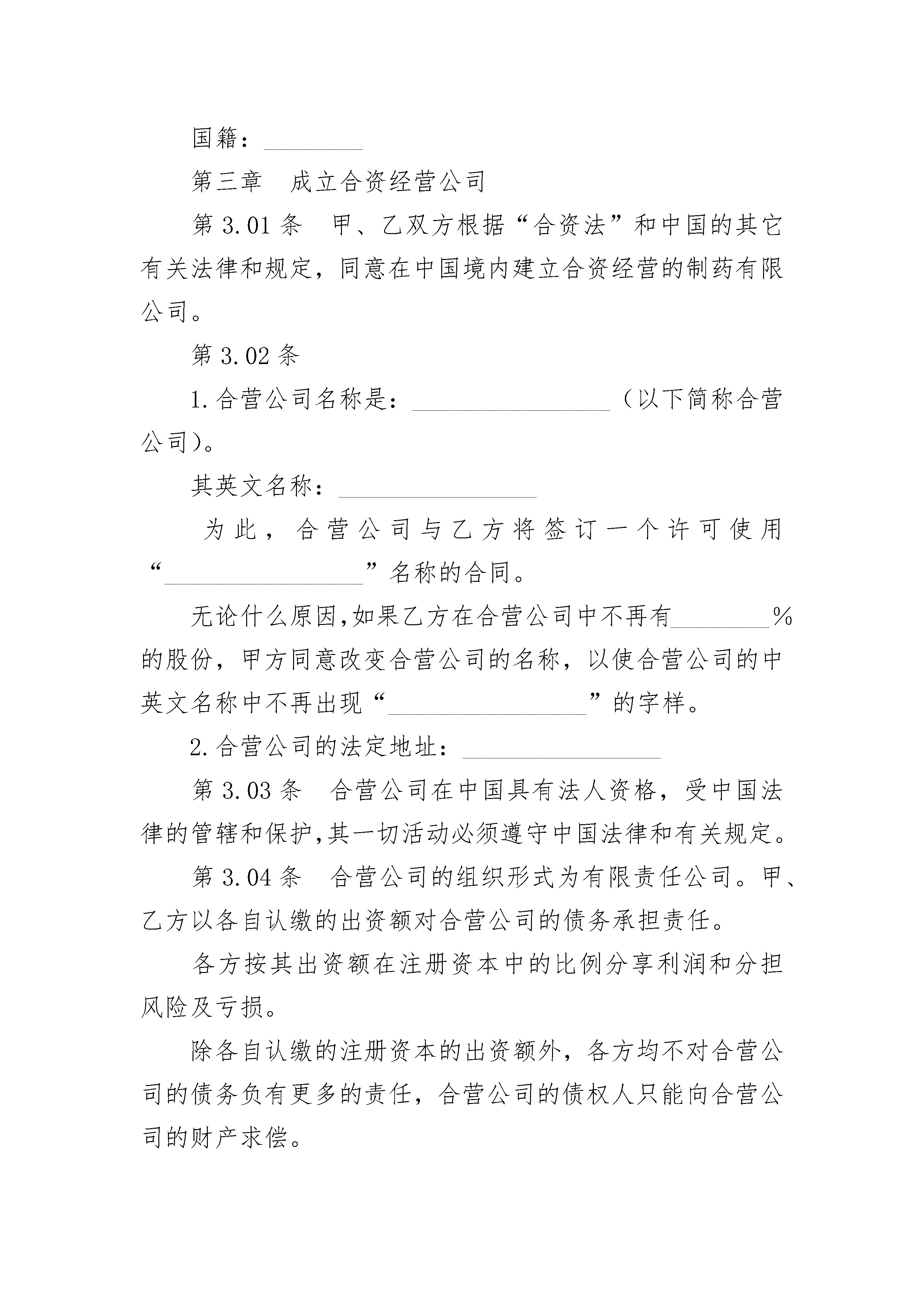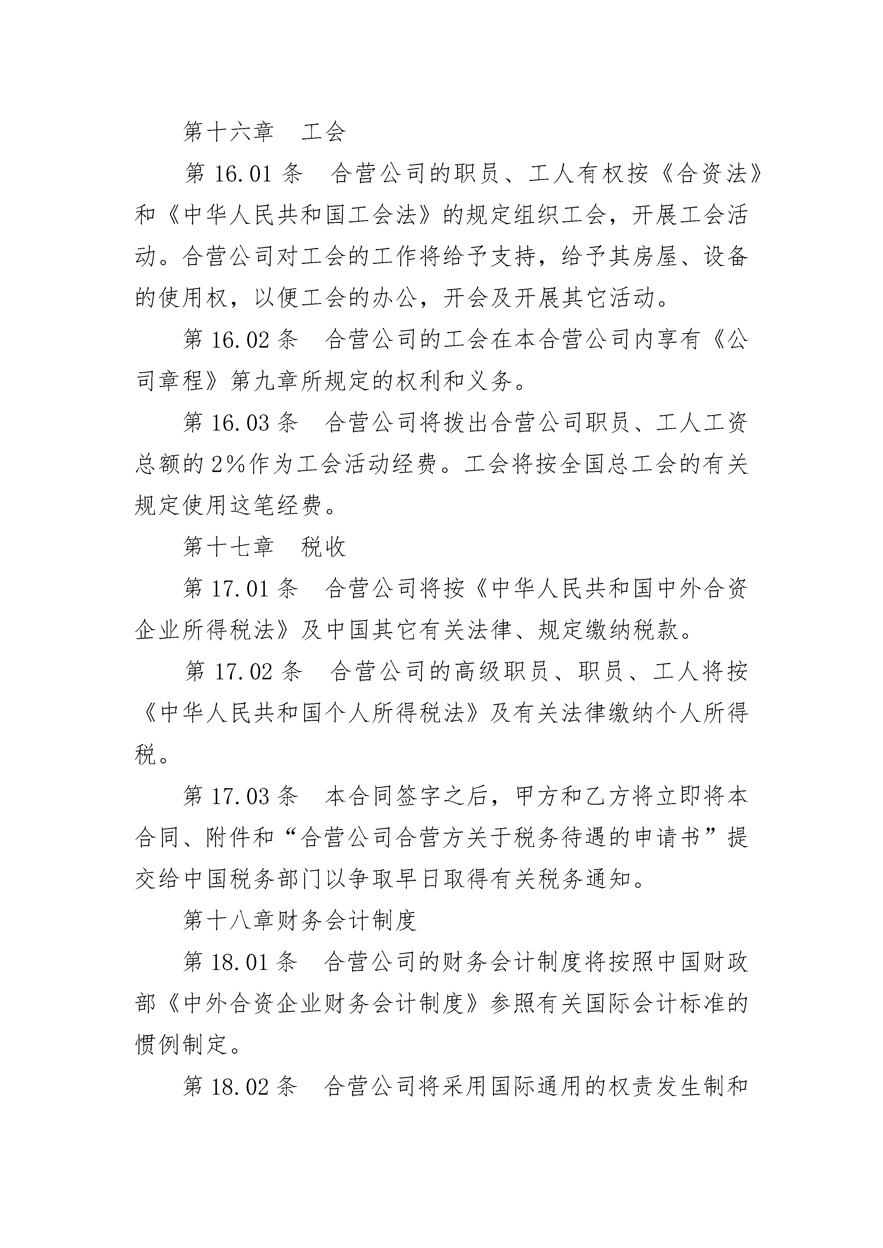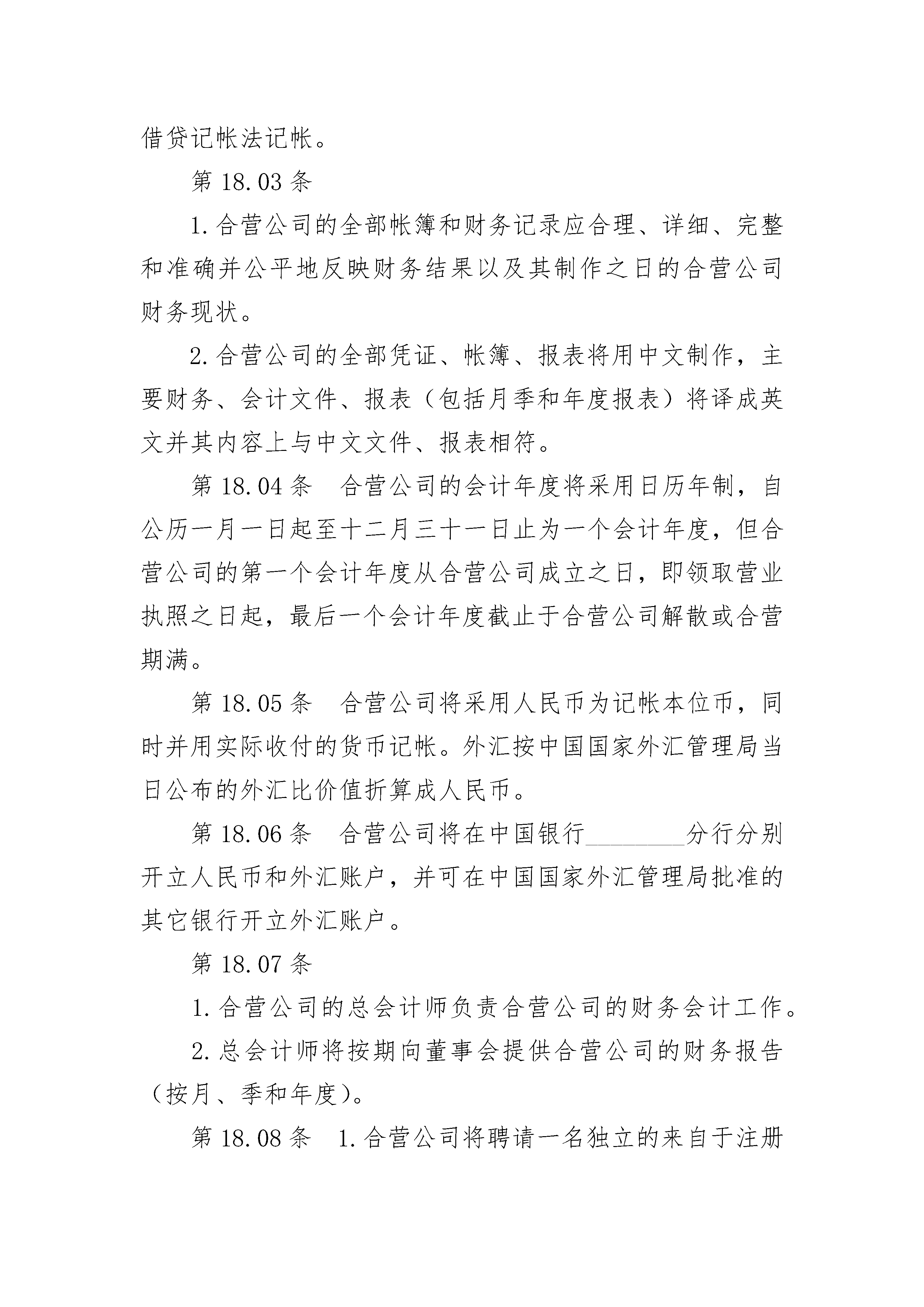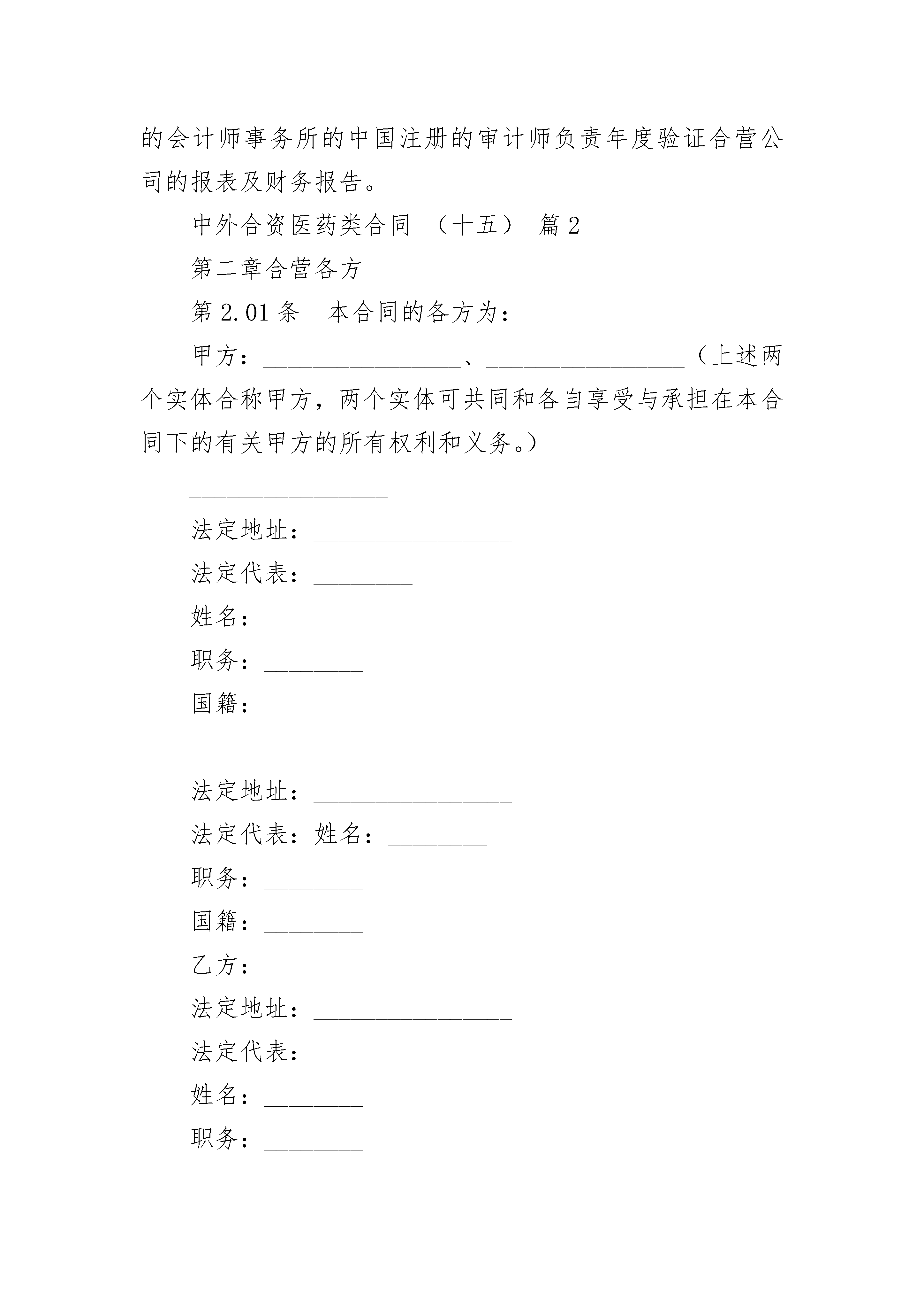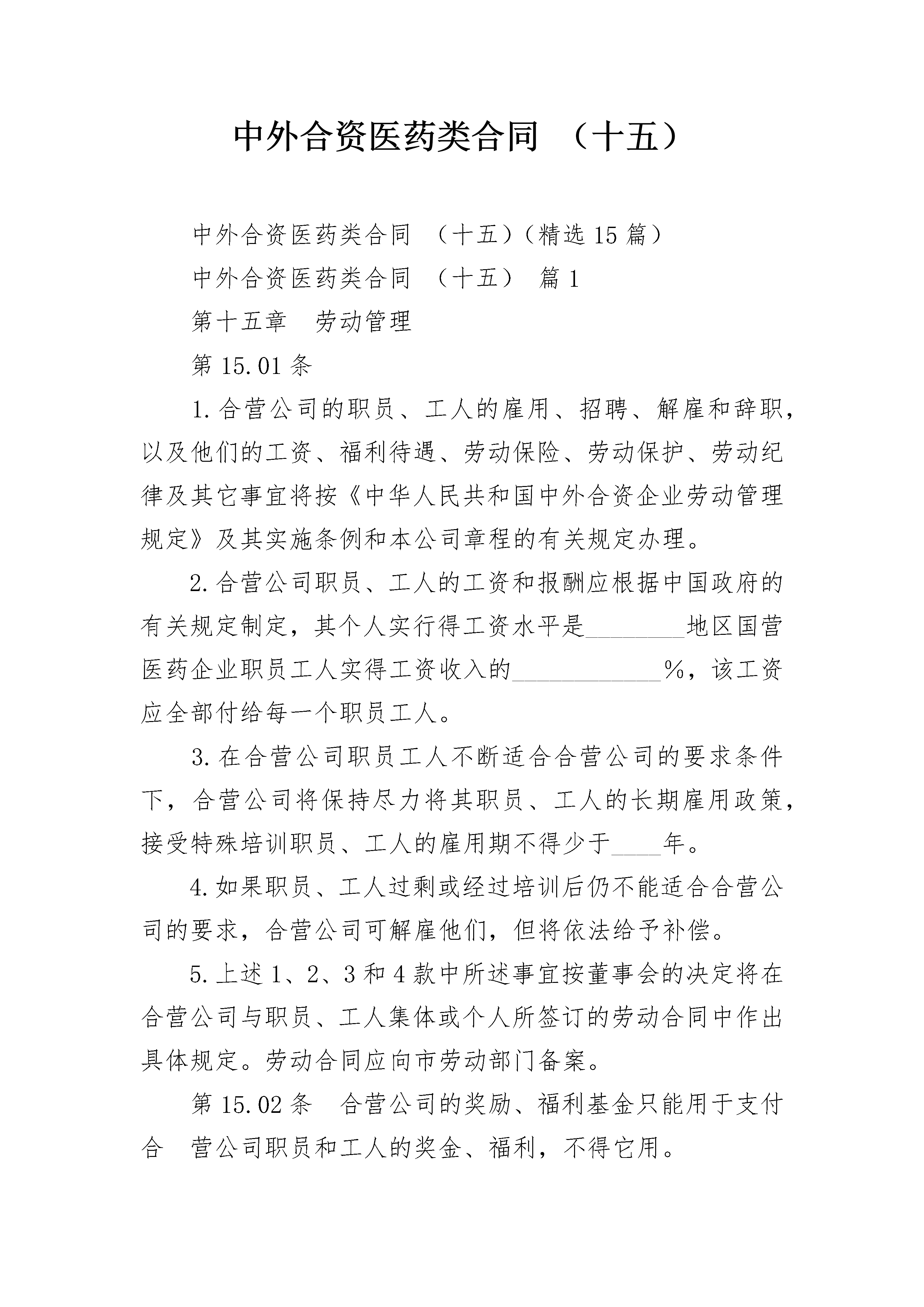 中外合资医药类合同(十五)中外合资医药类合同(十五)(精选15篇)中外合资医药类合同(十五)篇1第十五章劳动管理第15.01条1.合营公司的职员、工人的雇用、招聘、解雇和辞职,以及他们的工资、福利待遇、劳动保险、劳动保护、劳动纪律及其它事宜将按《中华人民共和国中外合资企业劳动管理规定》及其实施条例和本公司章程的有关规定办理。2.合营公司职员、工人的工资和报酬应根据中国政府的有关规定制定,其个人实行得工资水平是________地区国营医药企业职员工人实得工资收入的____________%,该工资应全部付给每一个职员工人。3.在合营公司职员工人不断适合合营公司的要求条件下,合营公司将保持尽力将其职员、工人的长期雇用政策,接受特殊培训职员、工人的雇用期不得少于____年。4.如果职员、工人过剩或经过培训后仍不能适合合营公司的要求,合营公司可解雇他们,但将依法给予补偿。5.上述1、2、3和4款中所述事宜按董事会的决定将在合营公司与职员、工人集体或个人所签订的劳动合同中作出具体规定。劳动合同应向市劳动部门备案。第15.02条合营公司的奖励、福利基金只能用于支付合营公司职员和工人的奖金、福利,不得它用。第十六章工会第16.01条合营公司的职员、工人有权按《合资法》和《中华人民共和国工会法》的规定组织工会,开展工会活动。合营公司对工会的工作将给予支持,给予其房屋、设备的使用权,以便工会的办公,开会及开展其它活动。第16.02条合营公司的工会在本合营公司内享有《公司章程》第九章所规定的权利和义务。第16.03条合营公司将拨出合营公司职员、工人工资总额的2%作为工会活动经费。工会将按全国总工会的有关规定使用这笔经费。第十七章税收第17.01条合营公司将按《中华人民共和国中外合资企业所得税法》及中国其它有关法律、规定缴纳税款。第17.02条合营公司的高级职员、职员、工人将按《中华人民共和国个人所得税法》及有关法律缴纳个人所得税。第17.03条本合同签字之后,甲方和乙方将立即将本合同、附件和“合营公司合营方关于税务待遇的申请书”提交给中国税务部门以争取早日取得有关税务通知。第十八章财务会计制度第18.01条合营公司的财务会计制度将按照中国财政部《中外合资企业财务会计制度》参照有关国际会计标准的惯例制定。第18.02条合营公司将采用国际通用的权责发生制和借贷记帐法记帐。第18.03条1.合营公司的全部帐簿和财务记录应合理、详细、完整和准确并公平地反映财务结果以及其制作之日的合营公司财务现状。2.合营公司的全部凭证、帐簿、报表将用中文制作,主要财务、会计文件、报表(包括月季和年度报表)将译成英文并其内容上与中文文件、报表相符。第18.04条合营公司的会计年度将采用日历年制,自公历一月一日起至十二月三十一日止为一个会计年度,但合营公司的第一个会计年度从合营公司成立之日,即领取营业执照之日起,最后一个会计年度截止于合营公司解散或合营期满。第18.05条合营公司将采用人民币为记帐本位币,同时并用实际收付的货币记帐。外汇按中国国家外汇管理局当日公布的外汇比价值折算成人民币。第18.06条合营公司将在中国银行________分行分别开立人民币和外汇账户,并可在中国国家外汇管理局批准的其它银行开立外汇账户。第18.07条1.合营公司的总会计师负责合营公司的财务会计工作。2.总会计师将按期向董事会提供合营公司的财务报告(按月、季和年度)。第18.08条1.合营公司将聘请一名独立的来自于注册的会计师事务所的中国注册的审计师负责年度验证合营公司的报表及财务报告。中外合资医药类合同(十五)篇2第二章合营各方第2.01条本合同的各方为:甲方:________________、________________(上述两个实体合称甲方,两个实体可共同和各自享受与承担在本合同下的有关甲方的所有权利和义务。)________________法定地址:________________法定代表:________姓名:________职务:________国籍:________________________法定地址:________________法定代表:姓名:________职务:________国籍:________乙方:________________法定地址:________________法定代表:________姓名:________职务:________国籍:________第三章成立合资经营公司第3.01条甲、乙双方根据“合资法”和中国的其它有关法律和规定,同意在中国境内建立合资经营的制药有限公司。第3.02条1.合营公司名称是:________________(以下简称合营公司)。其英文名称:_______________
