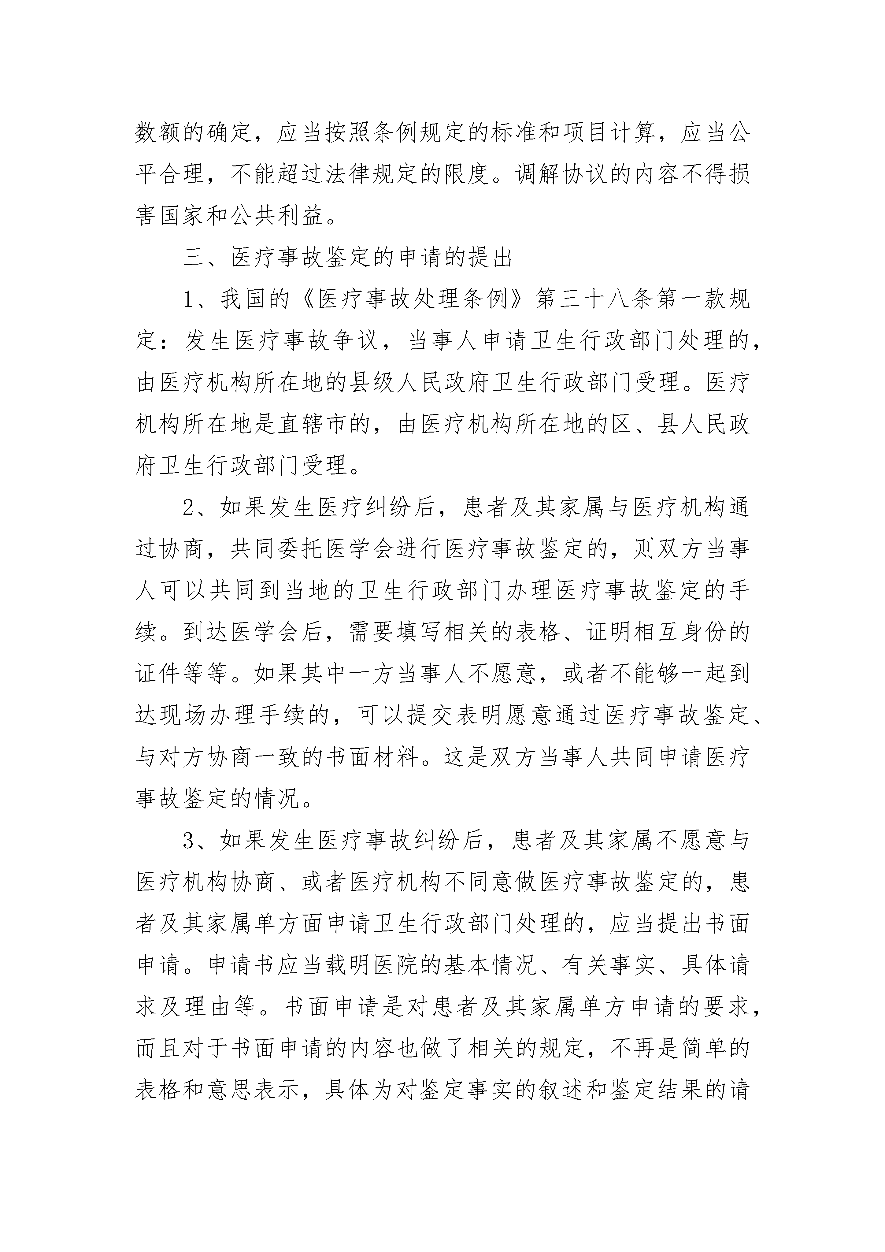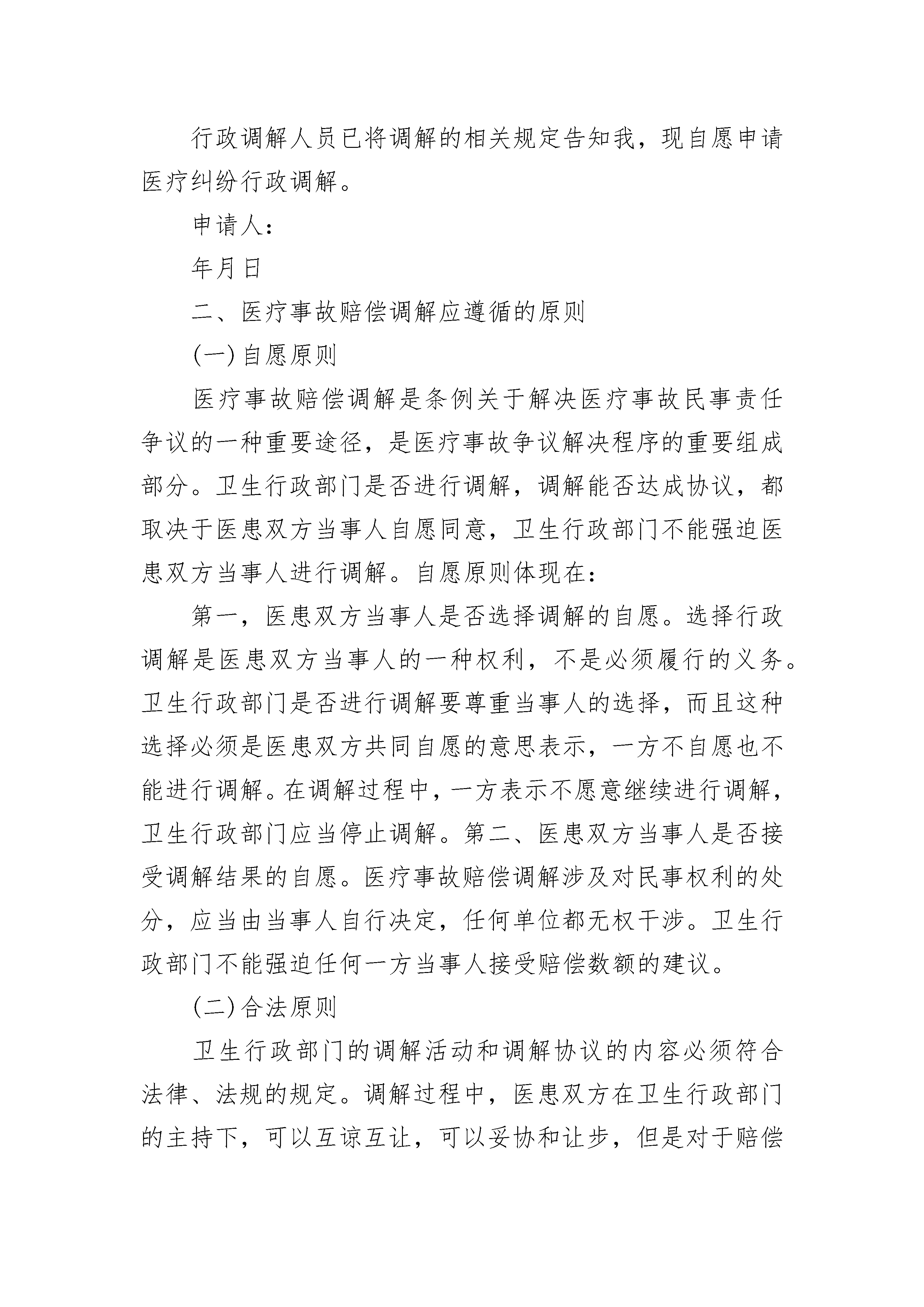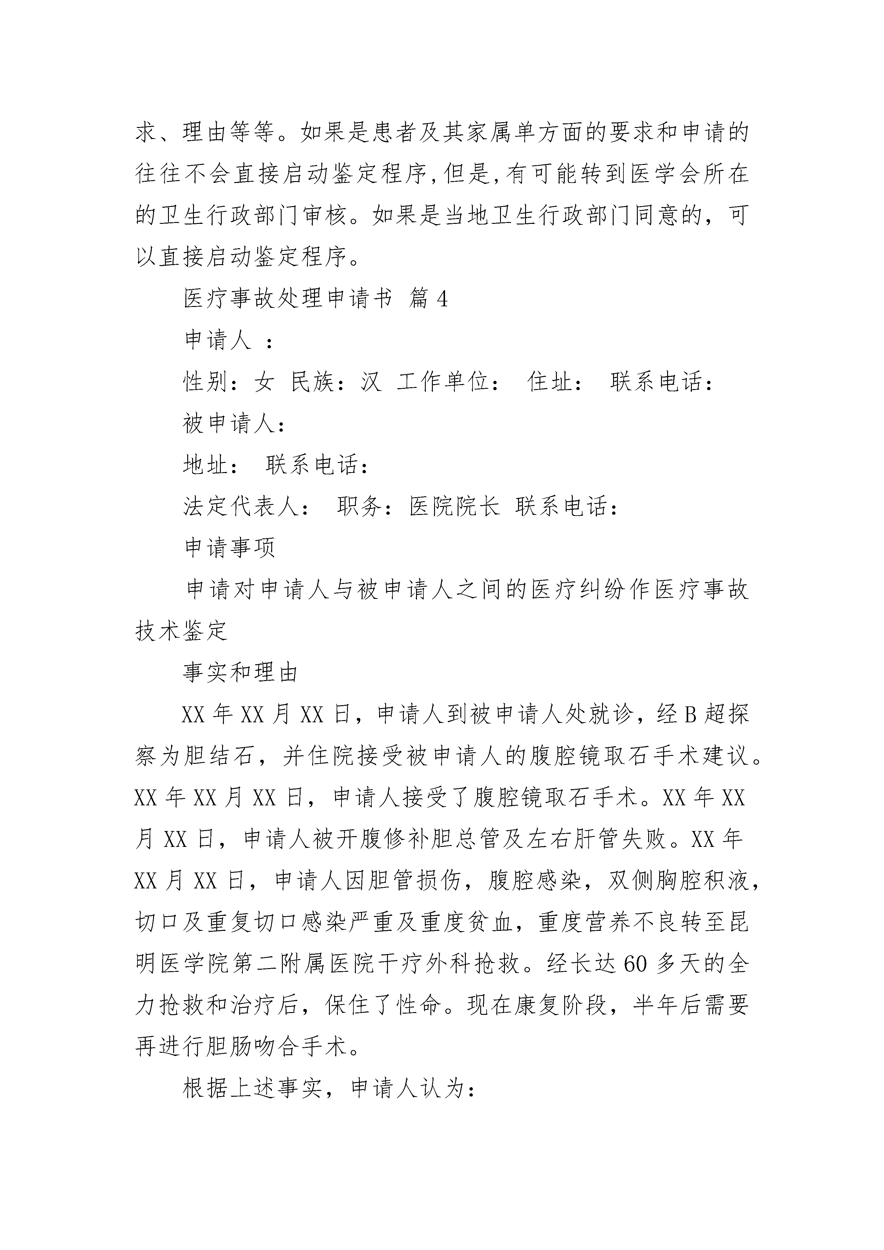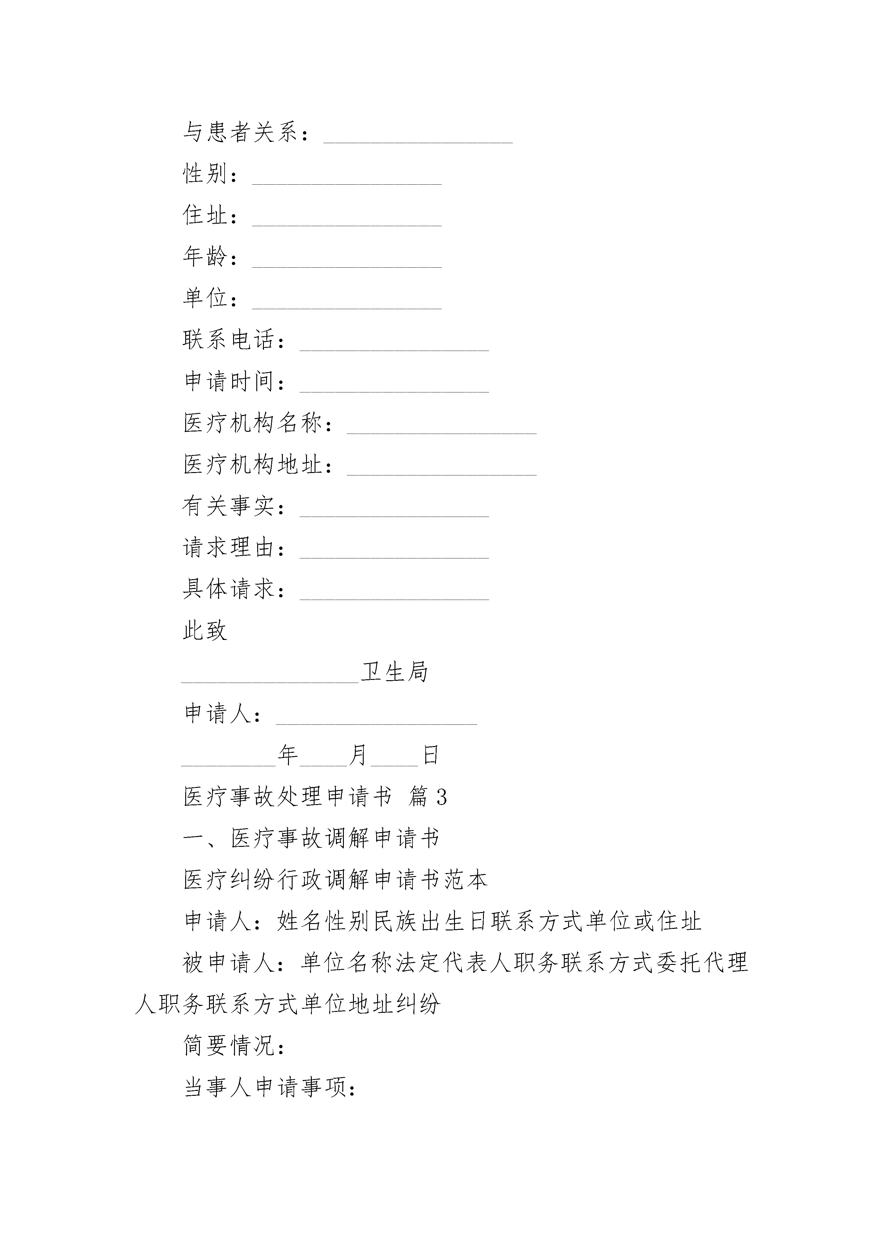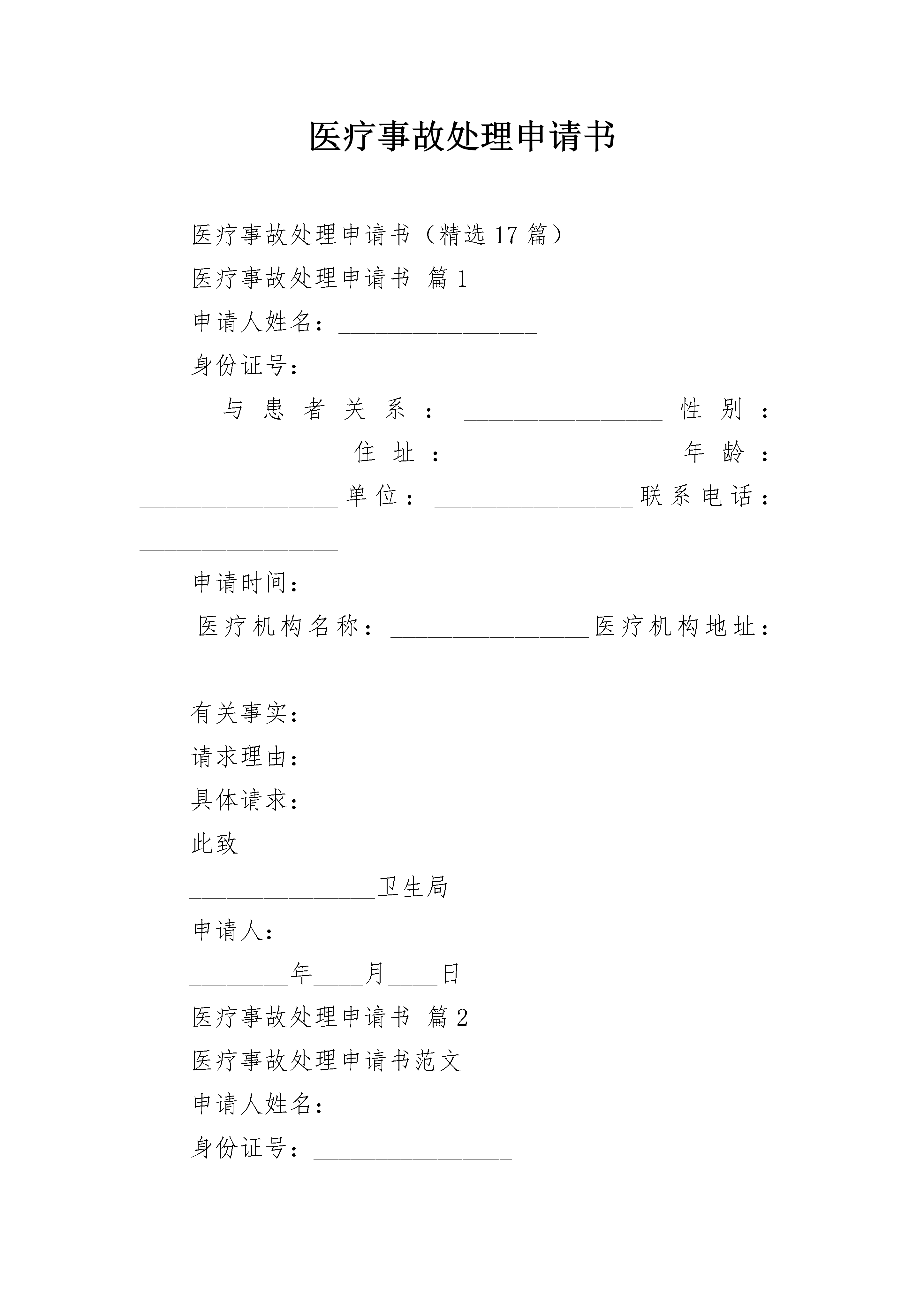 医疗事故处理申请书医疗事故处理申请书(精选17篇)医疗事故处理申请书篇1申请人姓名:________________身份证号:________________与患者关系:________________性别:________________住址:________________年龄:________________单位:________________联系电话:________________申请时间:________________医疗机构名称:________________医疗机构地址:________________有关事实:请求理由:具体请求:此致_______________卫生局申请人:_________________________年____月____日医疗事故处理申请书篇2医疗事故处理申请书范文申请人姓名:________________身份证号:________________与患者关系:________________性别:________________住址:________________年龄:________________单位:________________联系电话:________________申请时间:________________医疗机构名称:________________医疗机构地址:________________有关事实:________________请求理由:________________具体请求:________________此致_______________卫生局申请人:_________________________年____月____日医疗事故处理申请书篇3一、医疗事故调解申请书医疗纠纷行政调解申请书范本申请人:姓名性别民族出生日联系方式单位或住址被申请人:单位名称法定代表人职务联系方式委托代理人职务联系方式单位地址纠纷简要情况:当事人申请事项:行政调解人员已将调解的相关规定告知我,现自愿申请医疗纠纷行政调解。申请人:年月日二、医疗事故赔偿调解应遵循的原则(一)自愿原则医疗事故赔偿调解是条例关于解决医疗事故民事责任争议的一种重要途径,是医疗事故争议解决程序的重要组成部分。卫生行政部门是否进行调解,调解能否达成协议,都取决于医患双方当事人自愿同意,卫生行政部门不能强迫医患双方当事人进行调解。自愿原则体现在:第一,医患双方当事人是否选择调解的自愿。选择行政调解是医患双方当事人的一种权利,不是必须履行的义务。卫生行政部门是否进行调解要尊重当事人的选择,而且这种选择必须是医患双方共同自愿的意思表示,一方不自愿也不能进行调解。在调解过程中,一方表示不愿意继续进行调解,卫生行政部门应当停止调解。第二、医患双方当事人是否接受调解结果的自愿。医疗事故赔偿调解涉及对民事权利的处分,应当由当事人自行决定,任何单位都无权干涉。卫生行政部门不能强迫任何一方当事人接受赔偿数额的建议。(二)合法原则卫生行政部门的调解活动和调解协议的内容必须符合法律、法规的规定。调解过程中,医患双方在卫生行政部门的主持下,可以互谅互让,可以妥协和让步,但是对于赔偿数额的确定,应当按照条例规定的标准和项目计算,应当公平合理,不能超过法律规定的限度。调解协议的内容不得损害国家和公共利益。三、医疗事故鉴定的申请的提出1、我国的《医疗事故处理条例》第三十八条第一款规定:发生医疗事故争议,当事人申请卫生行政部门处理的,由医疗机构所在地的县级人民政府卫生行政部门受理。医疗机构所在地是直辖市的,由医疗机构所在地的区、县人民政府卫生行政部门受理。2、如果发生医疗纠纷后,患者及其家属与医疗机构通过协商,共同委托医学会进行医疗事故鉴定的,则双方当事人可以共同到当地的卫生行政部门办理医疗事故鉴定的手续。到达医学会后,需要填写相关的表格、证明相互身份的证件等等。如果其中一方当事人不愿意,或者不能够一起到达现场办理手续的,可以提交表明愿意通过医疗事故鉴定、与对方协商一致的书面材料。这是双方当事人共同申请医疗事故鉴定的情况。3、如果发生医疗事故纠纷后,患者及其家属不愿意与医疗机构协商、或者医疗机构不同意做医疗事故鉴定的,患者及其家属单方面申请卫生行政部门处理的,应当提出书面申请。申请书应当载明医院的基本情况、有关事实、具体请求及理由等。书面申请是对患者及其家属单方申请的要求,而且对于书面申请的内容也做了相关的规定,不再是简单的表格和意思表示,具体为对鉴定事实的叙述和鉴定结果的请求、理由等等。如果是患者及其家属单方面的要求和申请的往往不会直接启动鉴定程序,但是,有可能转到医学会所在的卫生行政部门审核。如果是当地卫生行政部门同意的,可以直接启动鉴定程序。医疗事故处理申请书篇4申请人:性别:女民族:汉工作单位:住址:联系电话:被申请
