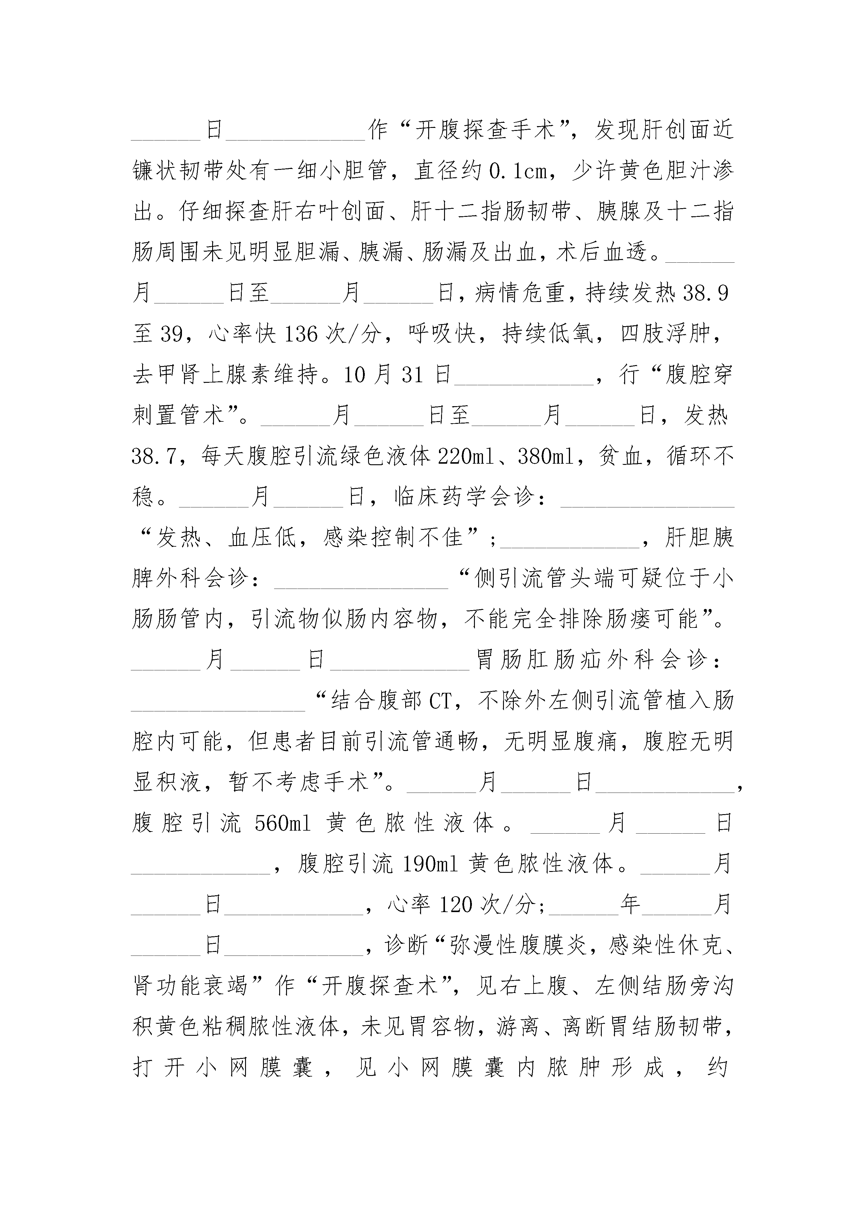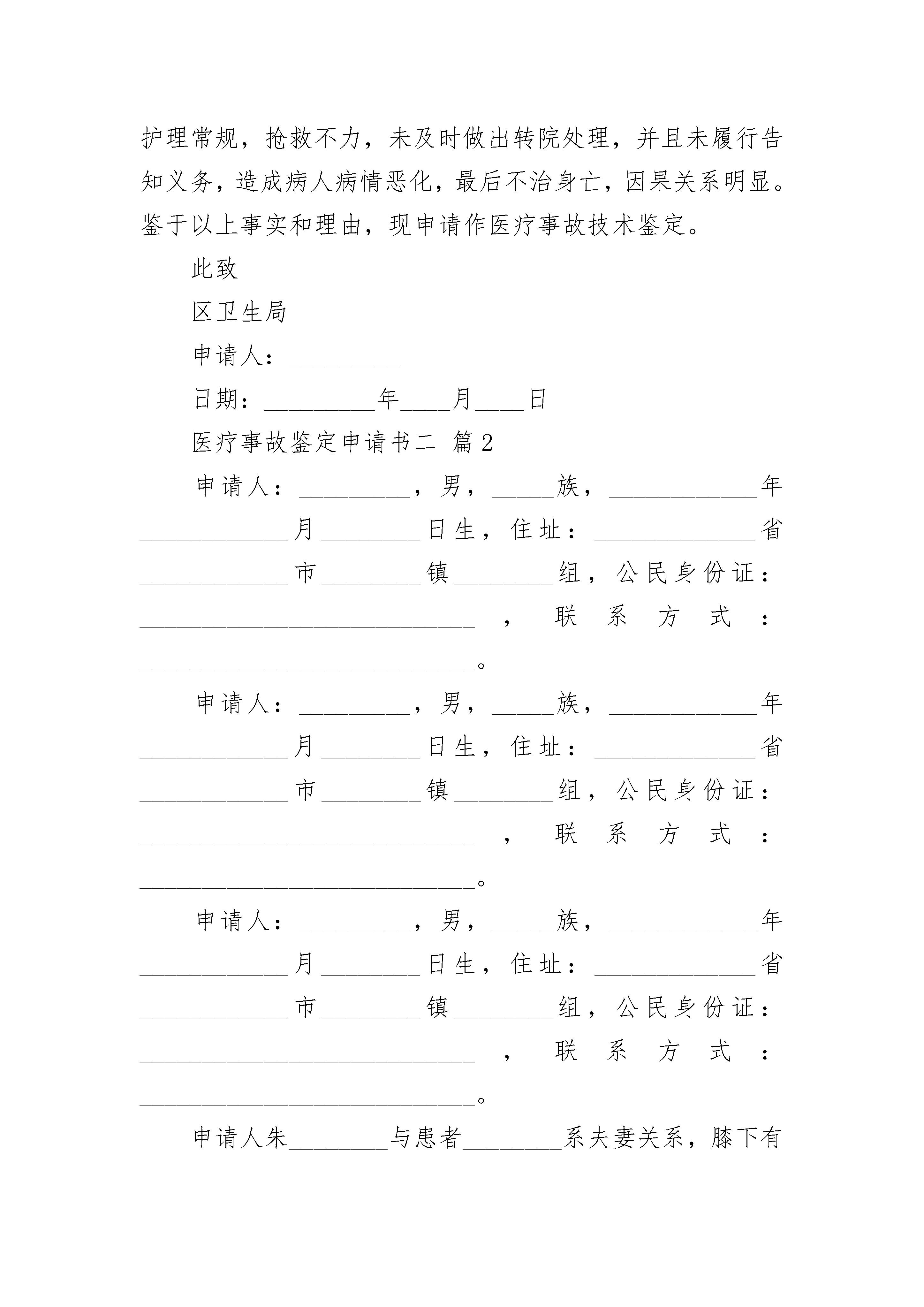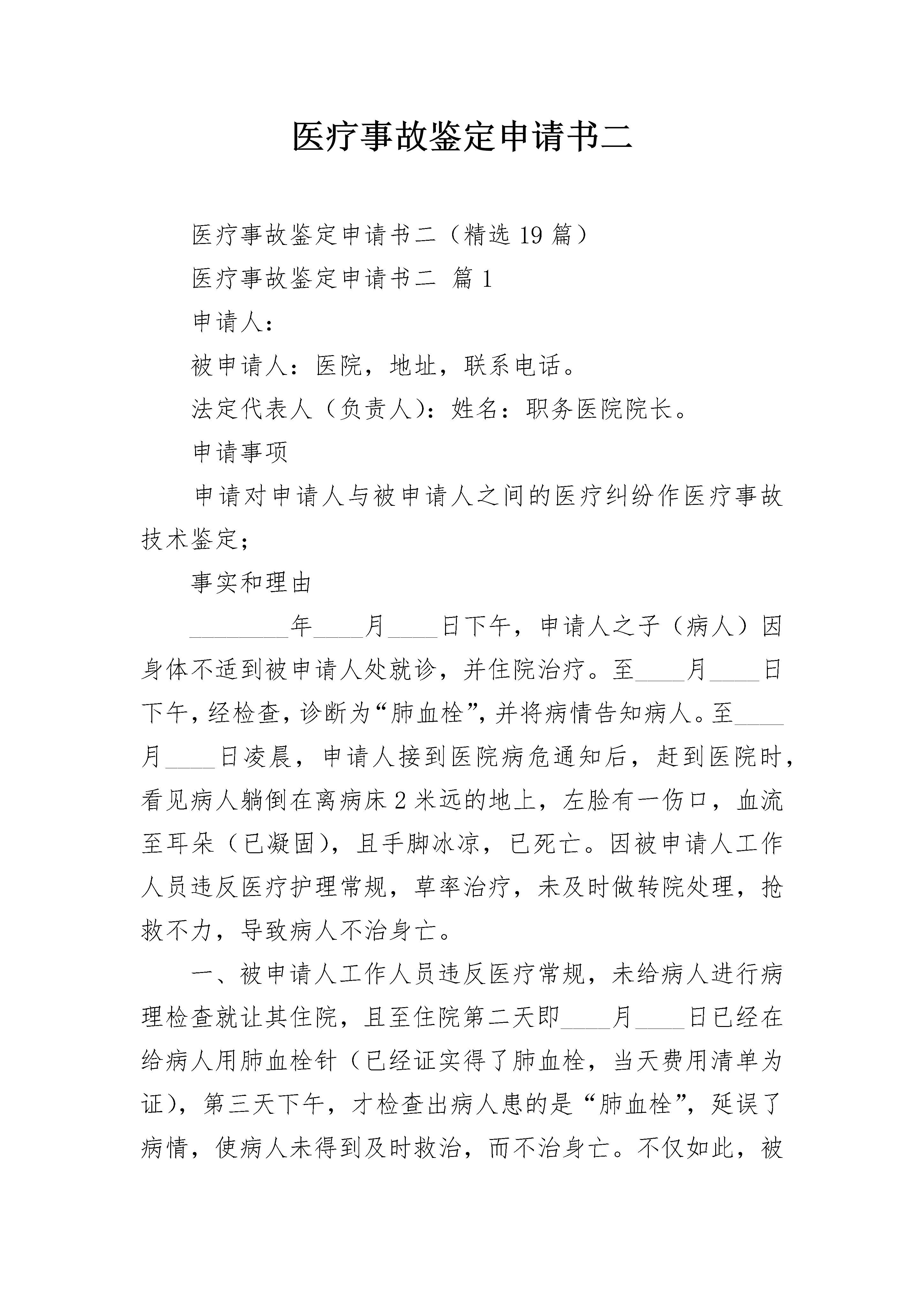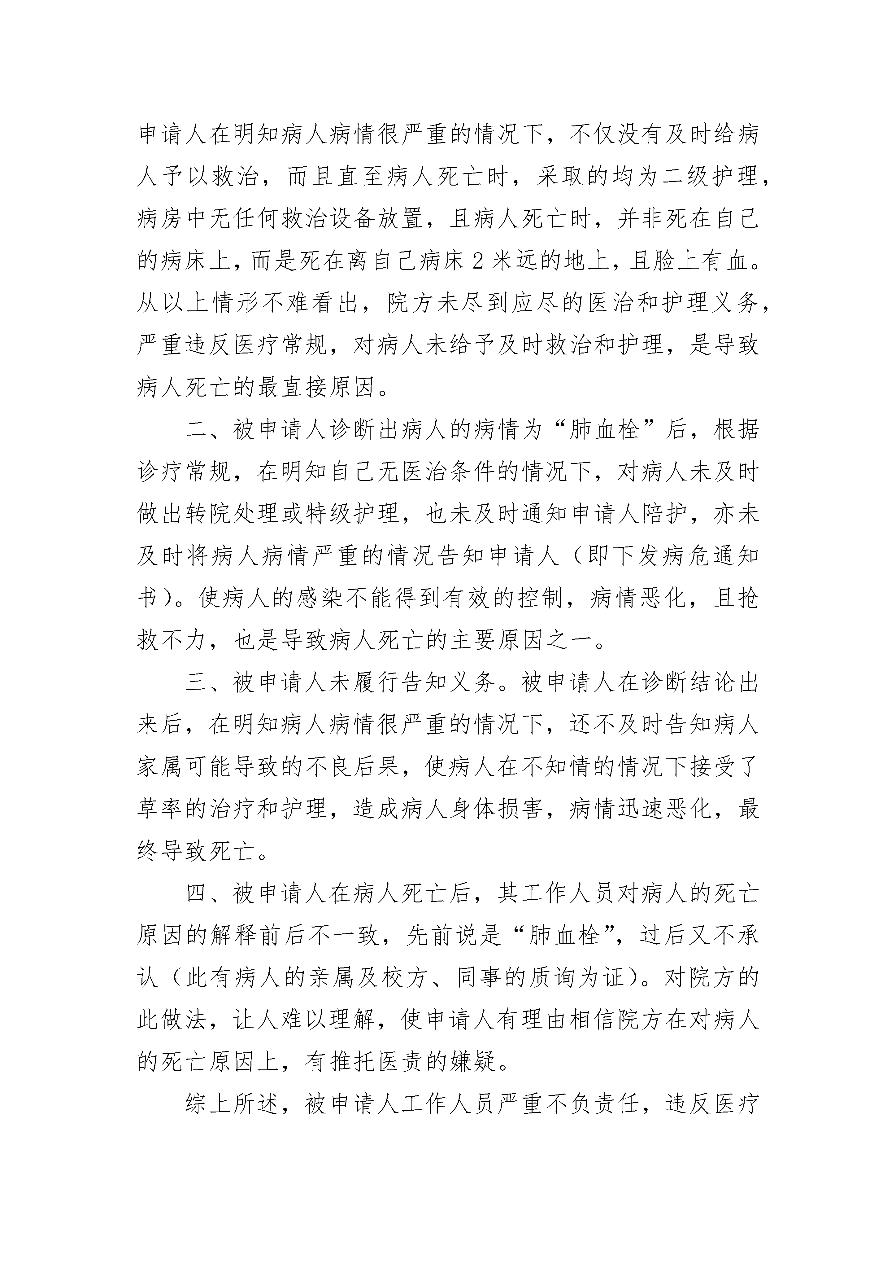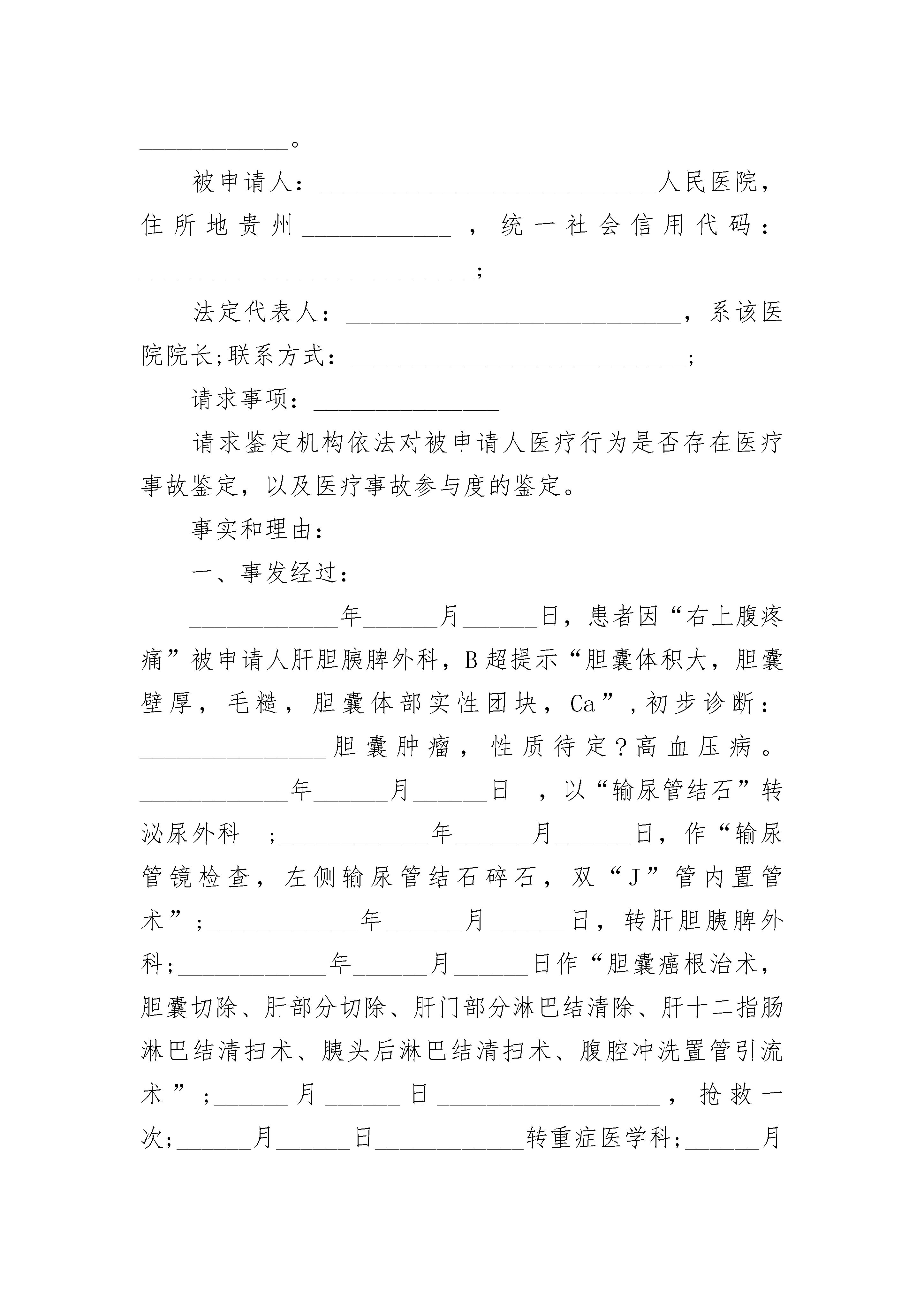 医疗事故鉴定申请书二医疗事故鉴定申请书二(精选19篇)医疗事故鉴定申请书二篇1申请人:被申请人:医院,地址,联系电话。法定代表人(负责人):姓名:职务医院院长。申请事项申请对申请人与被申请人之间的医疗纠纷作医疗事故技术鉴定;事实和理由________年____月____日下午,申请人之子(病人)因身体不适到被申请人处就诊,并住院治疗。至____月____日下午,经检查,诊断为“肺血栓”,并将病情告知病人。至____月____日凌晨,申请人接到医院病危通知后,赶到医院时,看见病人躺倒在离病床2米远的地上,左脸有一伤口,血流至耳朵(已凝固),且手脚冰凉,已死亡。因被申请人工作人员违反医疗护理常规,草率治疗,未及时做转院处理,抢救不力,导致病人不治身亡。一、被申请人工作人员违反医疗常规,未给病人进行病理检查就让其住院,且至住院第二天即____月____日已经在给病人用肺血栓针(已经证实得了肺血栓,当天费用清单为证),第三天下午,才检查出病人患的是“肺血栓”,延误了病情,使病人未得到及时救治,而不治身亡。不仅如此,被申请人在明知病人病情很严重的情况下,不仅没有及时给病人予以救治,而且直至病人死亡时,采取的均为二级护理,病房中无任何救治设备放置,且病人死亡时,并非死在自己的病床上,而是死在离自己病床2米远的地上,且脸上有血。从以上情形不难看出,院方未尽到应尽的医治和护理义务,严重违反医疗常规,对病人未给予及时救治和护理,是导致病人死亡的最直接原因。二、被申请人诊断出病人的病情为“肺血栓”后,根据诊疗常规,在明知自己无医治条件的情况下,对病人未及时做出转院处理或特级护理,也未及时通知申请人陪护,亦未及时将病人病情严重的情况告知申请人(即下发病危通知书)。使病人的感染不能得到有效的控制,病情恶化,且抢救不力,也是导致病人死亡的主要原因之一。三、被申请人未履行告知义务。被申请人在诊断结论出来后,在明知病人病情很严重的情况下,还不及时告知病人家属可能导致的不良后果,使病人在不知情的情况下接受了草率的治疗和护理,造成病人身体损害,病情迅速恶化,最终导致死亡。四、被申请人在病人死亡后,其工作人员对病人的死亡原因的解释前后不一致,先前说是“肺血栓”,过后又不承认(此有病人的亲属及校方、同事的质询为证)。对院方的此做法,让人难以理解,使申请人有理由相信院方在对病人的死亡原因上,有推托医责的嫌疑。综上所述,被申请人工作人员严重不负责任,违反医疗护理常规,抢救不力,未及时做出转院处理,并且未履行告知义务,造成病人病情恶化,最后不治身亡,因果关系明显。鉴于以上事实和理由,现申请作医疗事故技术鉴定。此致区卫生局申请人:_________日期:_________年____月____日医疗事故鉴定申请书二篇2申请人:_________,男,_____族,____________年____________月________日生,住址:_____________省____________市________镇________组,公民身份证:___________________________,联系方式:___________________________。申请人:_________,男,_____族,____________年____________月________日生,住址:_____________省____________市________镇________组,公民身份证:___________________________,联系方式:___________________________。申请人:_________,男,_____族,____________年____________月________日生,住址:_____________省____________市________镇________组,公民身份证:___________________________,联系方式:___________________________。申请人朱________与患者________系夫妻关系,膝下有____________。被申请人:___________________________人民医院,住所地贵州____________,统一社会信用代码:___________________________;法定代表人:___________________________,系该医院院长;联系方式:___________________________;请求事项:_______________请求鉴定机构依法对被申请人医疗行为是否存在医疗事故鉴定,以及医疗事故参与度的鉴定。事实和理由:一、事发经过:____________年______月______日,患