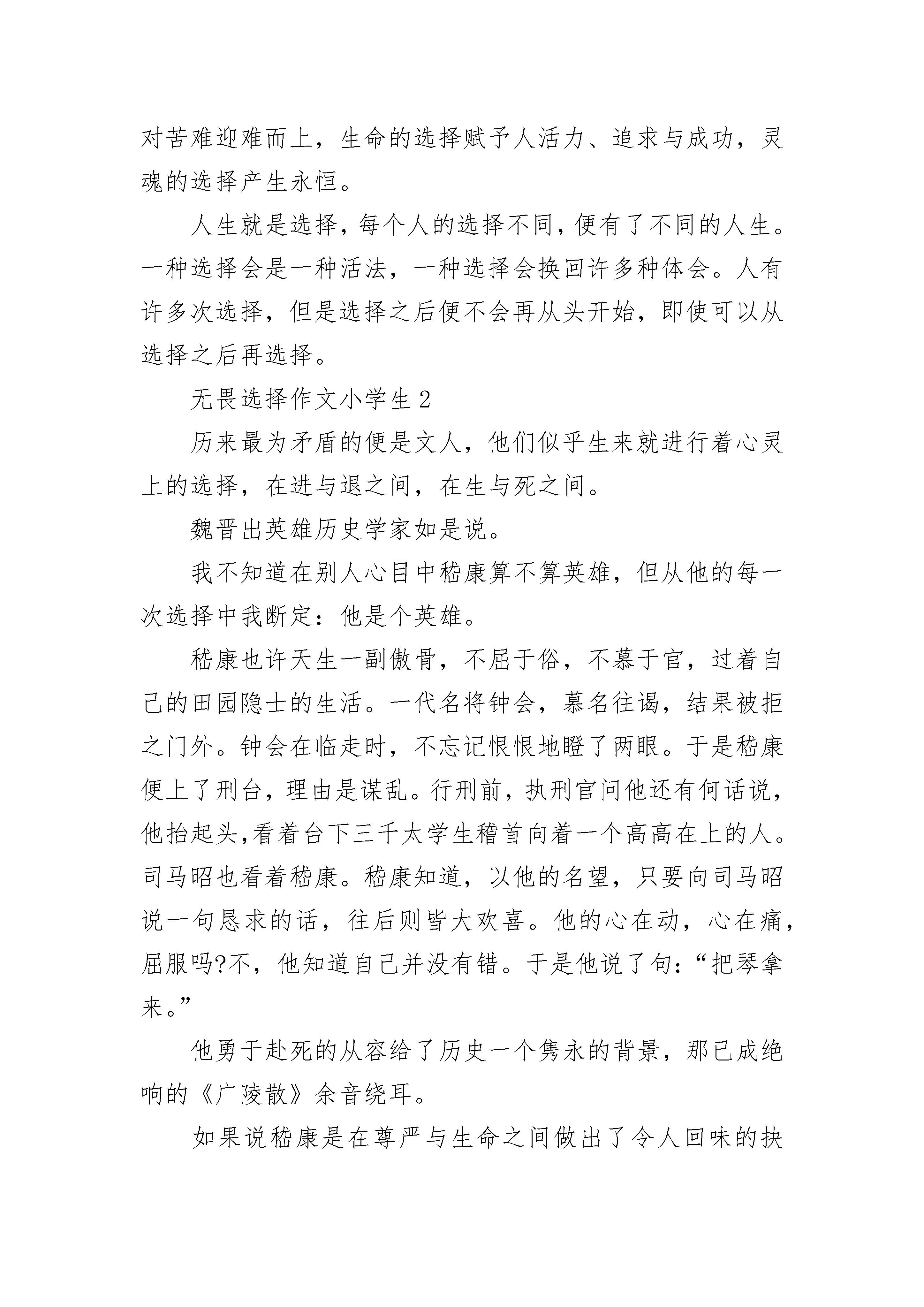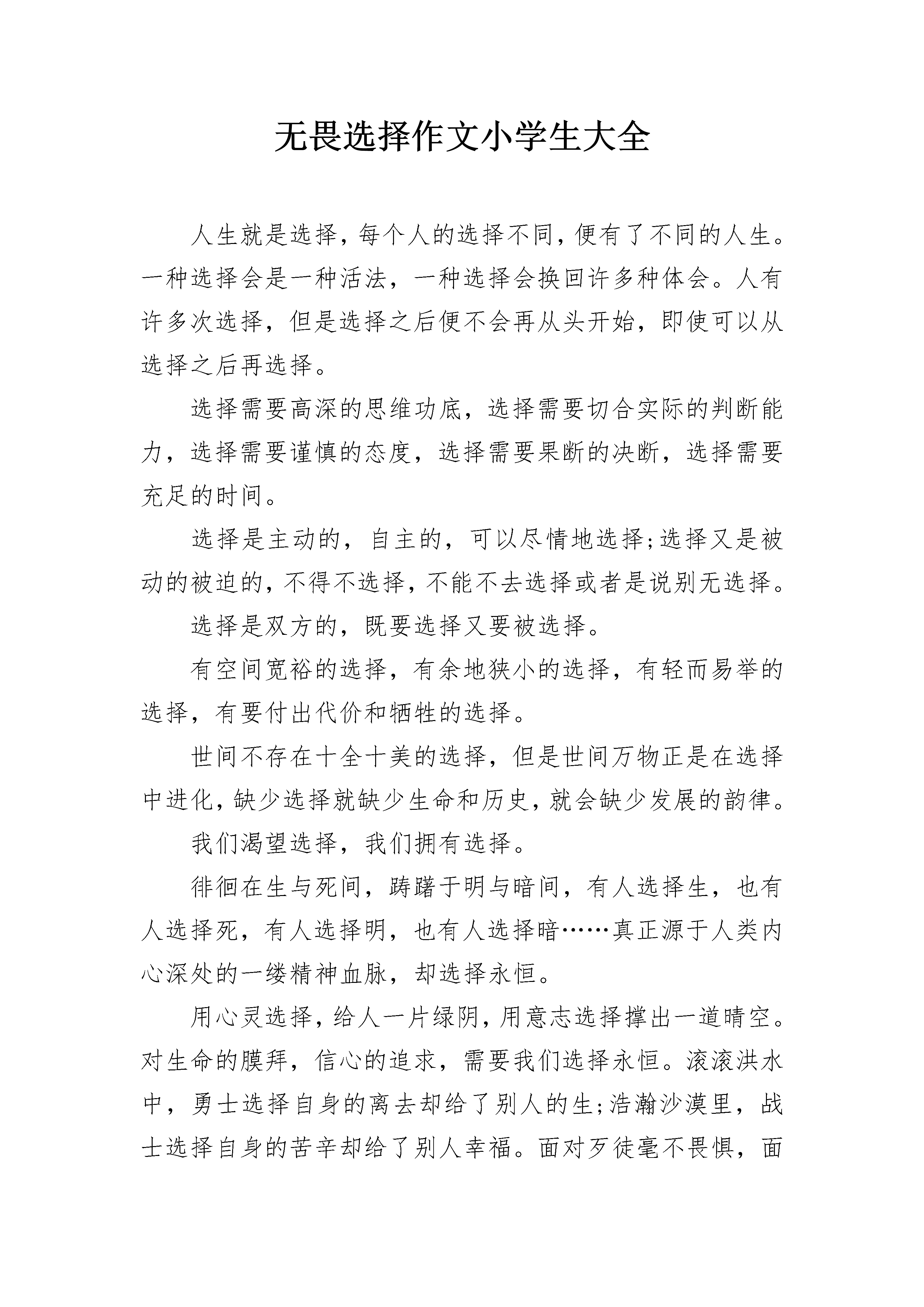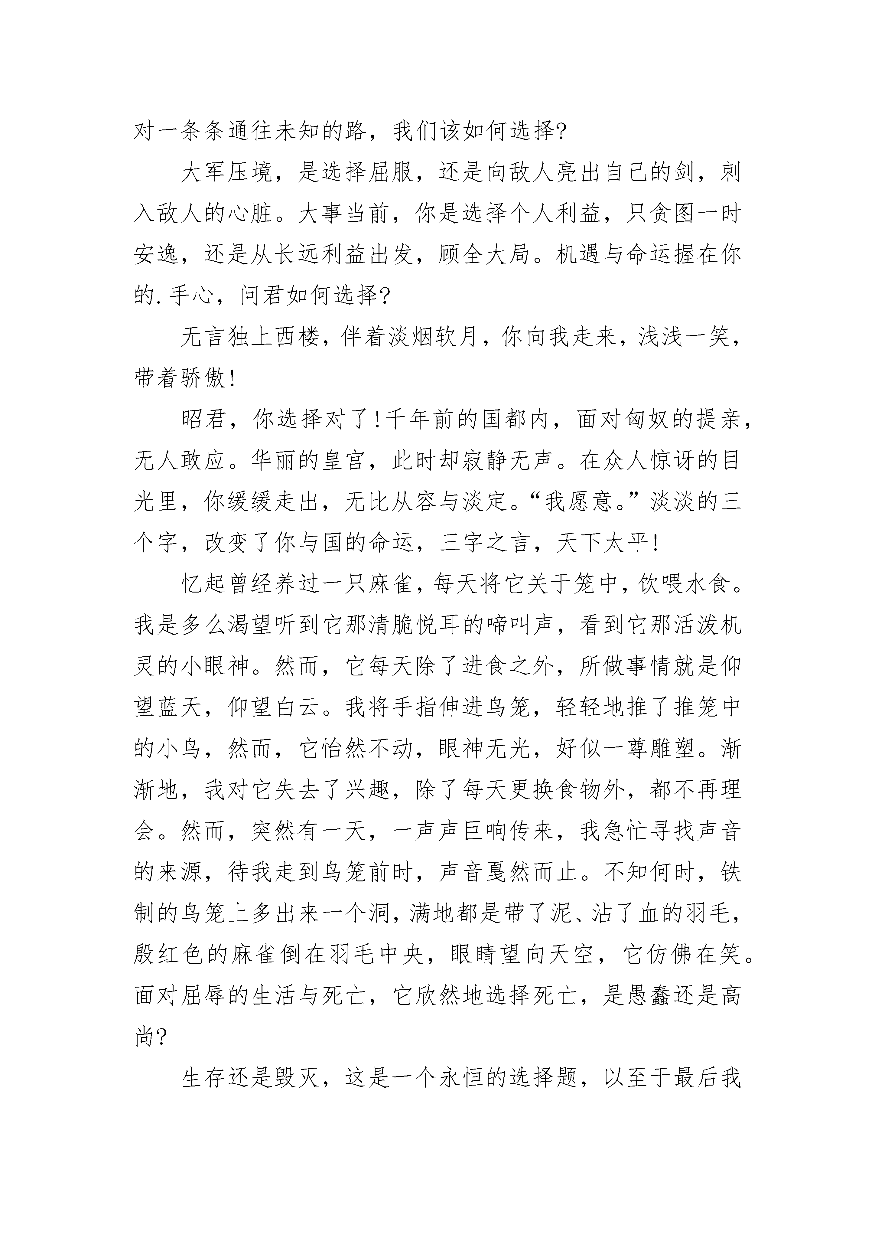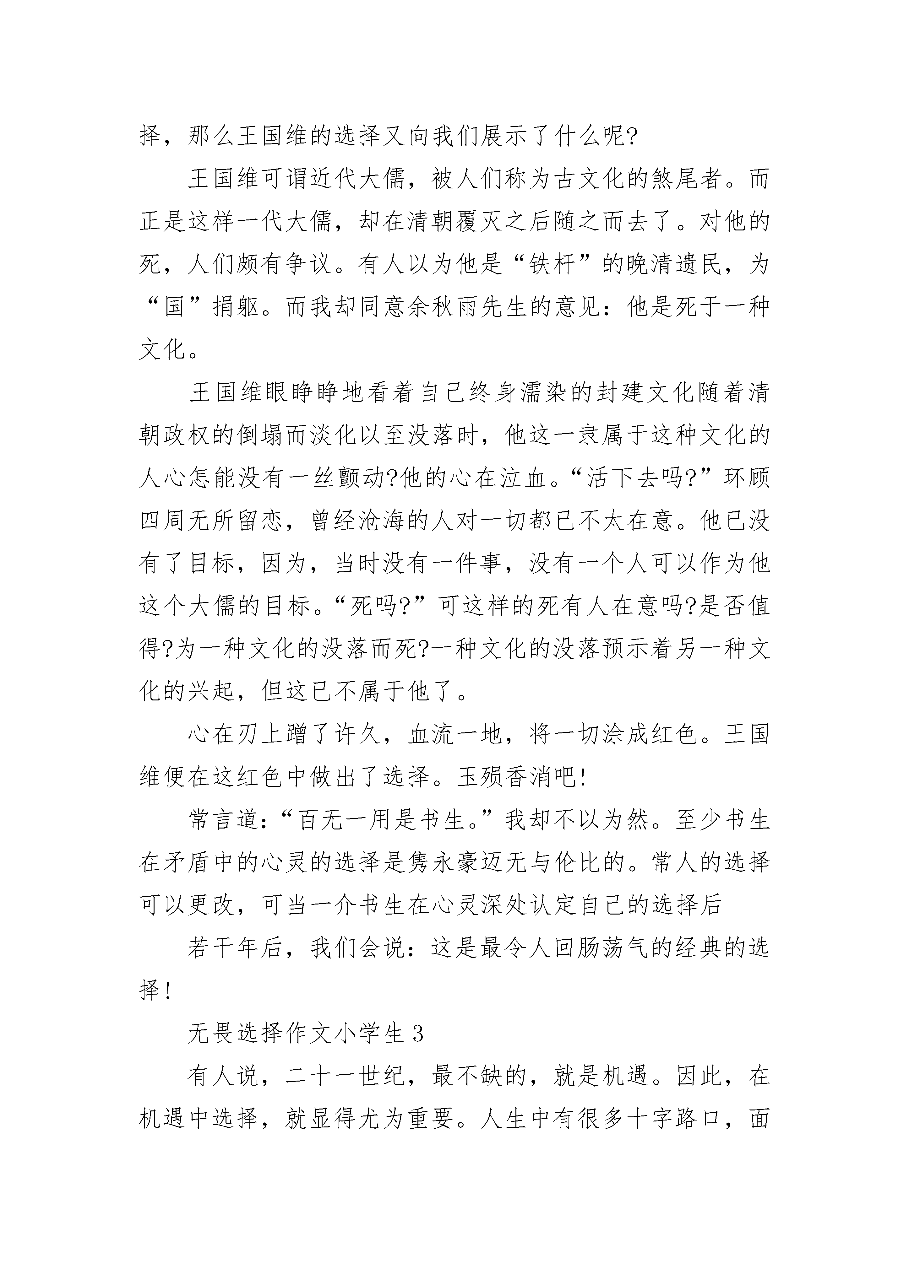 无畏选择作文小学生大全人生就是选择,每个人的选择不同,便有了不同的人生。一种选择会是一种活法,一种选择会换回许多种体会。人有许多次选择,但是选择之后便不会再从头开始,即使可以从选择之后再选择。选择需要高深的思维功底,选择需要切合实际的判断能力,选择需要谨慎的态度,选择需要果断的决断,选择需要充足的时间。选择是主动的,自主的,可以尽情地选择;选择又是被动的被迫的,不得不选择,不能不去选择或者是说别无选择。选择是双方的,既要选择又要被选择。有空间宽裕的选择,有余地狭小的选择,有轻而易举的选择,有要付出代价和牺牲的选择。世间不存在十全十美的选择,但是世间万物正是在选择中进化,缺少选择就缺少生命和历史,就会缺少发展的韵律。我们渴望选择,我们拥有选择。徘徊在生与死间,踌躇于明与暗间,有人选择生,也有人选择死,有人选择明,也有人选择暗……真正源于人类内心深处的一缕精神血脉,却选择永恒。用心灵选择,给人一片绿阴,用意志选择撑出一道晴空。对生命的膜拜,信心的追求,需要我们选择永恒。滚滚洪水中,勇士选择自身的离去却给了别人的生;浩瀚沙漠里,战士选择自身的苦辛却给了别人幸福。面对歹徒毫不畏惧,面对苦难迎难而上,生命的选择赋予人活力、追求与成功,灵魂的选择产生永恒。人生就是选择,每个人的选择不同,便有了不同的人生。一种选择会是一种活法,一种选择会换回许多种体会。人有许多次选择,但是选择之后便不会再从头开始,即使可以从选择之后再选择。无畏选择作文小学生2历来最为矛盾的便是文人,他们似乎生来就进行着心灵上的选择,在进与退之间,在生与死之间。魏晋出英雄历史学家如是说。我不知道在别人心目中嵇康算不算英雄,但从他的每一次选择中我断定:他是个英雄。嵇康也许天生一副傲骨,不屈于俗,不慕于官,过着自己的田园隐士的生活。一代名将钟会,慕名往谒,结果被拒之门外。钟会在临走时,不忘记恨恨地瞪了两眼。于是嵇康便上了刑台,理由是谋乱。行刑前,执刑官问他还有何话说,他抬起头,看着台下三千太学生稽首向着一个高高在上的人。司马昭也看着嵇康。嵇康知道,以他的名望,只要向司马昭说一句恳求的话,往后则皆大欢喜。他的心在动,心在痛,屈服吗?不,他知道自己并没有错。于是他说了句:“把琴拿来。”他勇于赴死的从容给了历史一个隽永的背景,那已成绝响的《广陵散》余音绕耳。如果说嵇康是在尊严与生命之间做出了令人回味的抉择,那么王国维的选择又向我们展示了什么呢?王国维可谓近代大儒,被人们称为古文化的煞尾者。而正是这样一代大儒,却在清朝覆灭之后随之而去了。对他的死,人们颇有争议。有人以为他是“铁杆”的晚清遗民,为“国”捐躯。而我却同意余秋雨先生的意见:他是死于一种文化。王国维眼睁睁地看着自己终身濡染的封建文化随着清朝政权的倒塌而淡化以至没落时,他这一隶属于这种文化的人心怎能没有一丝颤动?他的心在泣血。“活下去吗?”环顾四周无所留恋,曾经沧海的人对一切都已不太在意。他已没有了目标,因为,当时没有一件事,没有一个人可以作为他这个大儒的目标。“死吗?”可这样的死有人在意吗?是否值得?为一种文化的没落而死?一种文化的没落预示着另一种文化的兴起,但这已不属于他了。心在刃上蹭了许久,血流一地,将一切涂成红色。王国维便在这红色中做出了选择。玉殒香消吧!常言道:“百无一用是书生。”我却不以为然。至少书生在矛盾中的心灵的选择是隽永豪迈无与伦比的。常人的选择可以更改,可当一介书生在心灵深处认定自己的选择后若干年后,我们会说:这是最令人回肠荡气的经典的选择!无畏选择作文小学生3有人说,二十一世纪,最不缺的,就是机遇。因此,在机遇中选择,就显得尤为重要。人生中有很多十字路口,面对一条条通往未知的路,我们该如何选择?大军压境,是选择屈服,还是向敌人亮出自己的剑,刺入敌人的心脏。大事当前,你是选择个人利益,只贪图一时安逸,还是从长远利益出发,顾全大局。机遇与命运握在你的.手心,问君如何选择?无言独上西楼,伴着淡烟软月,你向我走来,浅浅一笑,带着骄傲!昭君,你选择对了!千年前的国都内,面对匈奴的提亲,无人敢应。华丽的皇宫,此时却寂静无声。在众人惊讶的目光里,你缓缓走出,无比从容与淡定。“我愿意。”淡淡的三个字,改变了你与国的命运,三字之言,天下太平!忆起曾经养过一只麻雀,每天将它关于笼中,饮喂水食。我是多么渴望听到它那清脆悦耳的啼叫声,看到它那活泼机灵的小眼神。然而,它每天除了进食之外,所做事情就是仰望蓝天,仰望白云。我将手指伸进鸟笼,轻轻地推了推笼中的小鸟,然而,它怡然不动,眼神无光,好似一尊雕塑。渐渐地,我对它失去了兴趣,除了每天更换食物外,都不再理会。然而,突然有一天,一声声巨响传来,我急忙寻找声音的来源,待我走到鸟笼前时,声音戛然而止。不知何时,铁制的鸟笼上多出来一个洞,满地都是带了泥、沾了血的羽毛,殷红色的麻雀倒在羽毛