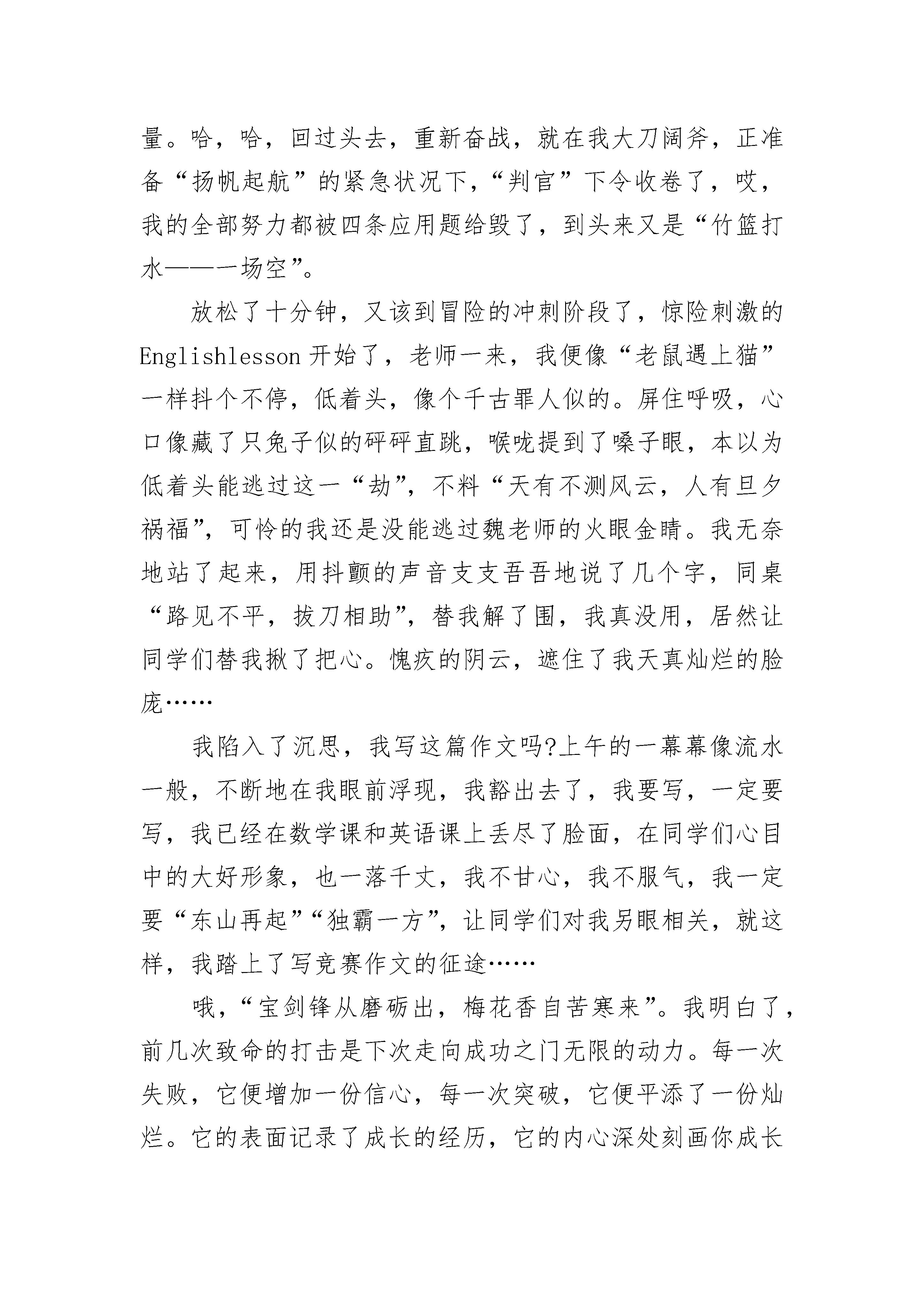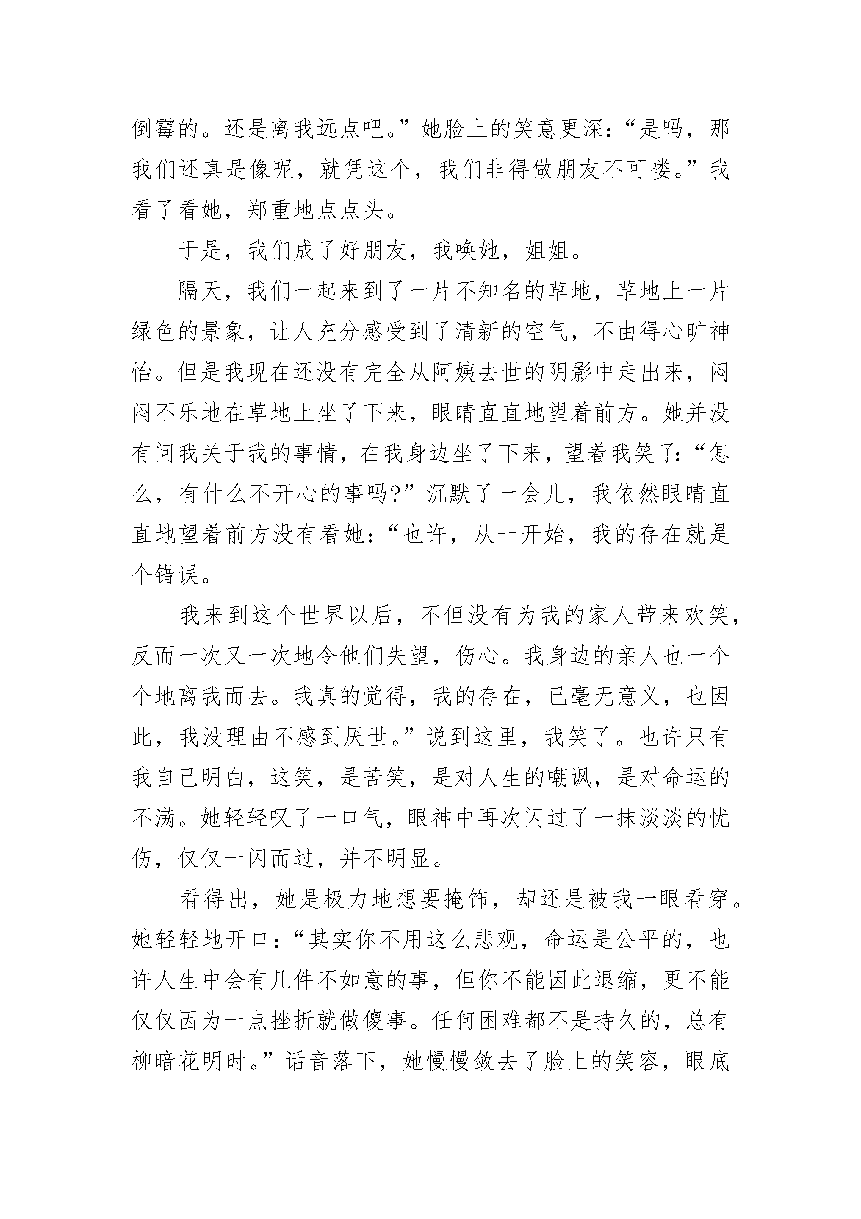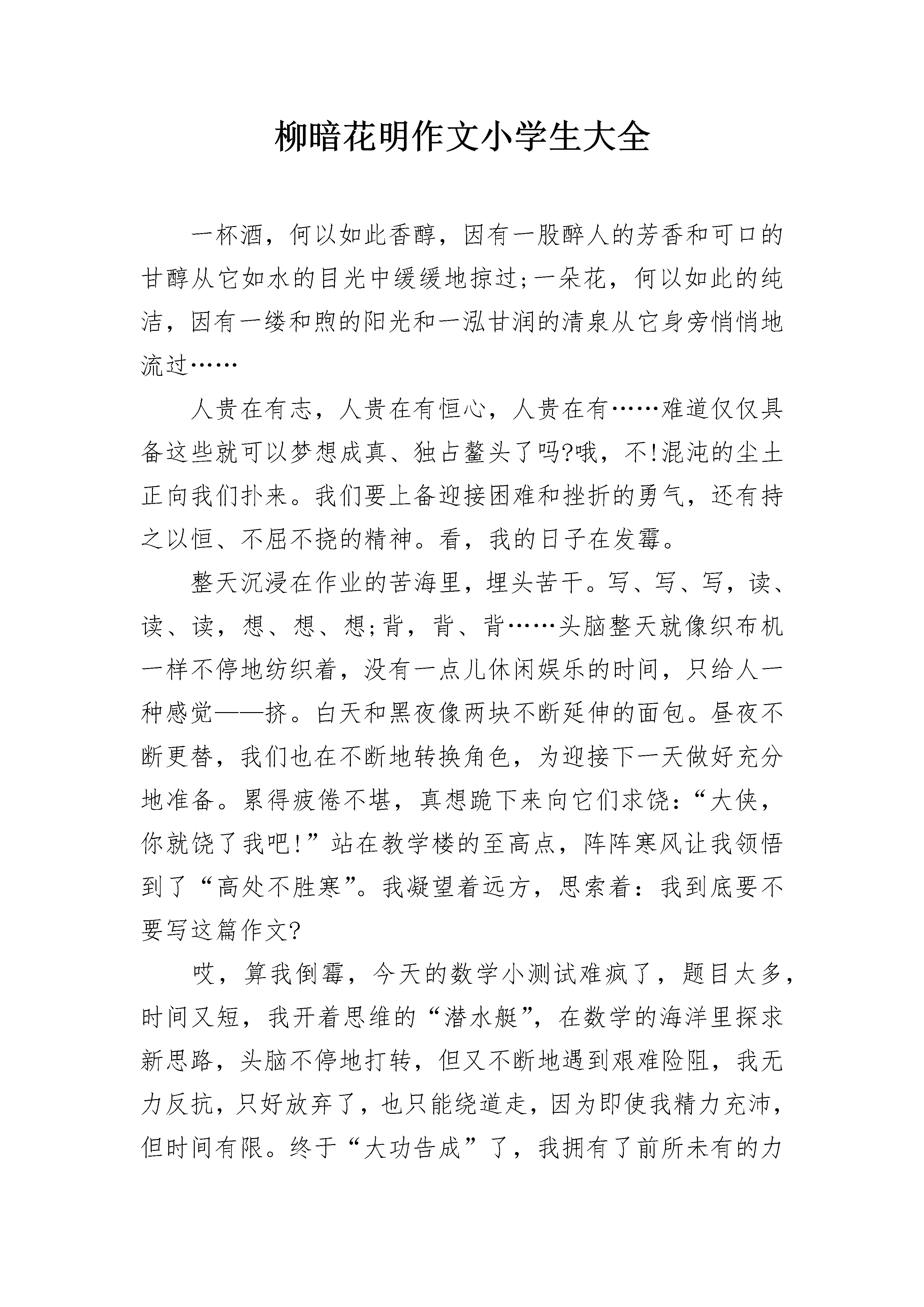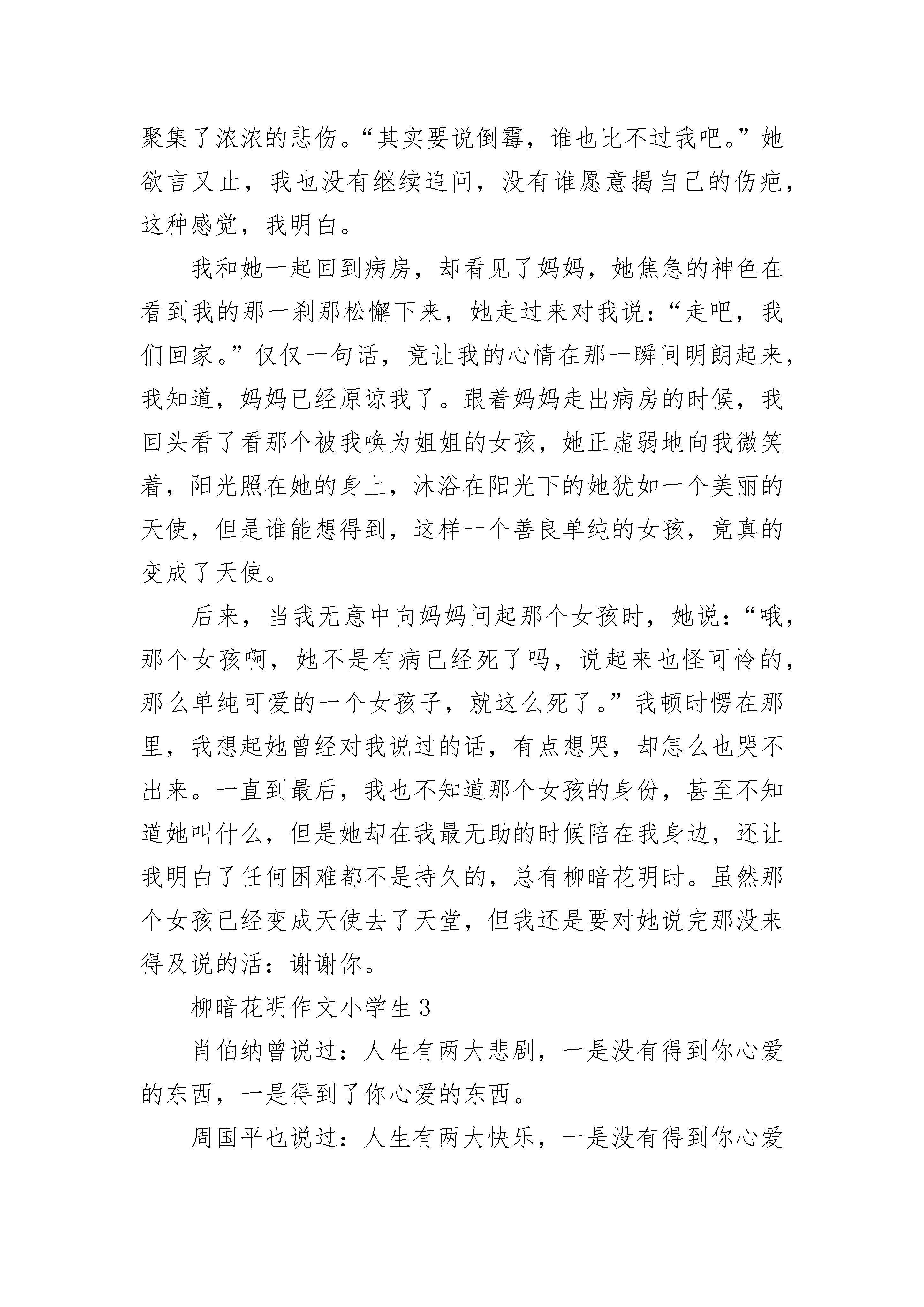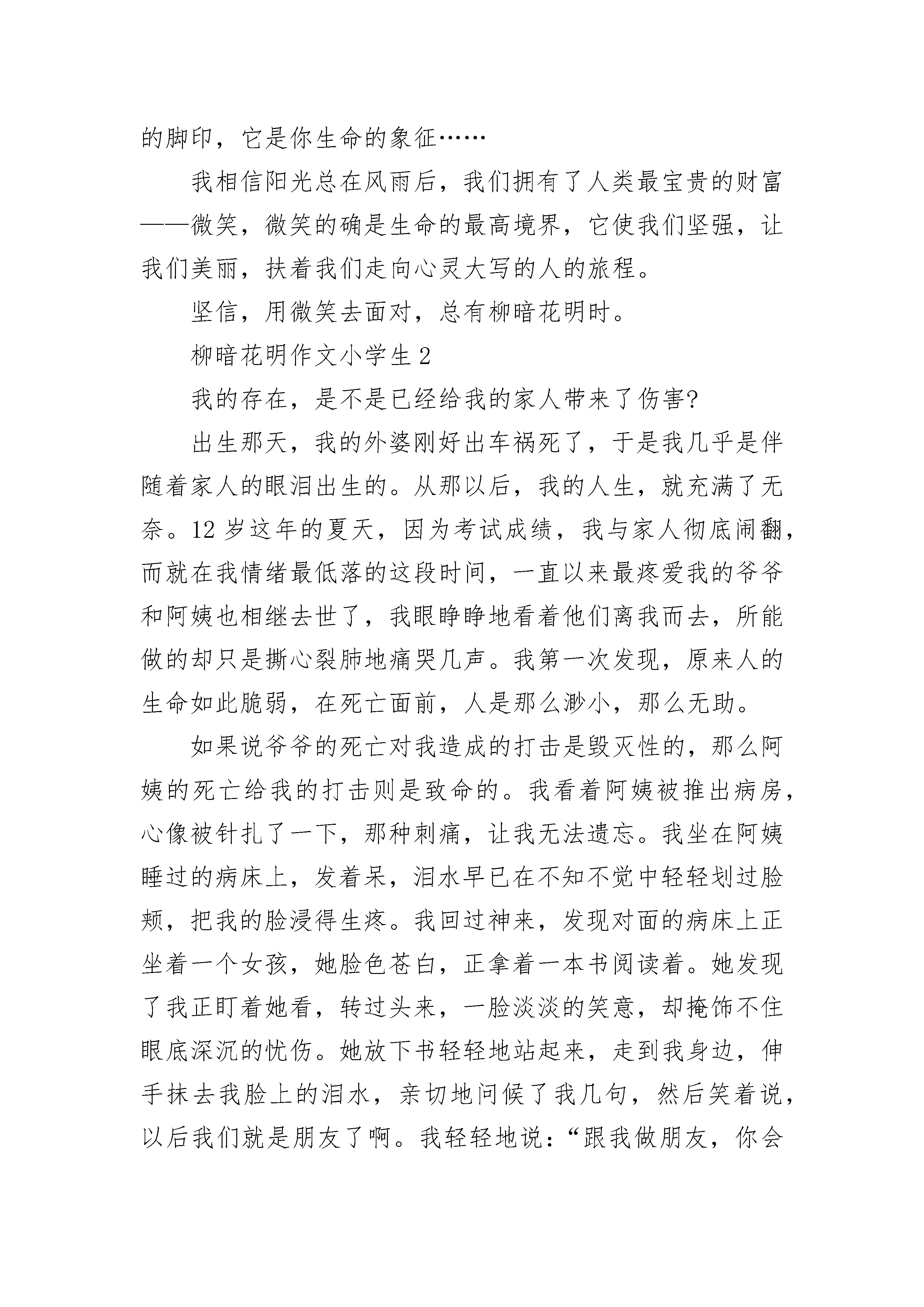 柳暗花明作文小学生大全一杯酒,何以如此香醇,因有一股醉人的芳香和可口的甘醇从它如水的目光中缓缓地掠过;一朵花,何以如此的纯洁,因有一缕和煦的阳光和一泓甘润的清泉从它身旁悄悄地流过……人贵在有志,人贵在有恒心,人贵在有……难道仅仅具备这些就可以梦想成真、独占鳌头了吗?哦,不!混沌的尘土正向我们扑来。我们要上备迎接困难和挫折的勇气,还有持之以恒、不屈不挠的精神。看,我的日子在发霉。整天沉浸在作业的苦海里,埋头苦干。写、写、写,读、读、读,想、想、想;背,背、背……头脑整天就像织布机一样不停地纺织着,没有一点儿休闲娱乐的时间,只给人一种感觉——挤。白天和黑夜像两块不断延伸的面包。昼夜不断更替,我们也在不断地转换角色,为迎接下一天做好充分地准备。累得疲倦不堪,真想跪下来向它们求饶:“大侠,你就饶了我吧!”站在教学楼的至高点,阵阵寒风让我领悟到了“高处不胜寒”。我凝望着远方,思索着:我到底要不要写这篇作文?哎,算我倒霉,今天的数学小测试难疯了,题目太多,时间又短,我开着思维的“潜水艇”,在数学的海洋里探求新思路,头脑不停地打转,但又不断地遇到艰难险阻,我无力反抗,只好放弃了,也只能绕道走,因为即使我精力充沛,但时间有限。终于“大功告成”了,我拥有了前所未有的力量。哈,哈,回过头去,重新奋战,就在我大刀阔斧,正准备“扬帆起航”的紧急状况下,“判官”下令收卷了,哎,我的全部努力都被四条应用题给毁了,到头来又是“竹篮打水——一场空”。放松了十分钟,又该到冒险的冲刺阶段了,惊险刺激的Englishlesson开始了,老师一来,我便像“老鼠遇上猫”一样抖个不停,低着头,像个千古罪人似的。屏住呼吸,心口像藏了只兔子似的砰砰直跳,喉咙提到了嗓子眼,本以为低着头能逃过这一“劫”,不料“天有不测风云,人有旦夕祸福”,可怜的我还是没能逃过魏老师的火眼金睛。我无奈地站了起来,用抖颤的声音支支吾吾地说了几个字,同桌“路见不平,拔刀相助”,替我解了围,我真没用,居然让同学们替我揪了把心。愧疚的阴云,遮住了我天真灿烂的脸庞……我陷入了沉思,我写这篇作文吗?上午的一幕幕像流水一般,不断地在我眼前浮现,我豁出去了,我要写,一定要写,我已经在数学课和英语课上丢尽了脸面,在同学们心目中的大好形象,也一落千丈,我不甘心,我不服气,我一定要“东山再起”“独霸一方”,让同学们对我另眼相关,就这样,我踏上了写竞赛作文的征途……哦,“宝剑锋从磨砺出,梅花香自苦寒来”。我明白了,前几次致命的打击是下次走向成功之门无限的动力。每一次失败,它便增加一份信心,每一次突破,它便平添了一份灿烂。它的表面记录了成长的经历,它的内心深处刻画你成长的脚印,它是你生命的象征……我相信阳光总在风雨后,我们拥有了人类最宝贵的财富——微笑,微笑的确是生命的最高境界,它使我们坚强,让我们美丽,扶着我们走向心灵大写的人的旅程。坚信,用微笑去面对,总有柳暗花明时。柳暗花明作文小学生2我的存在,是不是已经给我的家人带来了伤害?出生那天,我的外婆刚好出车祸死了,于是我几乎是伴随着家人的眼泪出生的。从那以后,我的人生,就充满了无奈。12岁这年的夏天,因为考试成绩,我与家人彻底闹翻,而就在我情绪最低落的这段时间,一直以来最疼爱我的爷爷和阿姨也相继去世了,我眼睁睁地看着他们离我而去,所能做的却只是撕心裂肺地痛哭几声。我第一次发现,原来人的生命如此脆弱,在死亡面前,人是那么渺小,那么无助。如果说爷爷的死亡对我造成的打击是毁灭性的,那么阿姨的死亡给我的打击则是致命的。我看着阿姨被推出病房,心像被针扎了一下,那种刺痛,让我无法遗忘。我坐在阿姨睡过的病床上,发着呆,泪水早已在不知不觉中轻轻划过脸颊,把我的脸浸得生疼。我回过神来,发现对面的病床上正坐着一个女孩,她脸色苍白,正拿着一本书阅读着。她发现了我正盯着她看,转过头来,一脸淡淡的笑意,却掩饰不住眼底深沉的忧伤。她放下书轻轻地站起来,走到我身边,伸手抹去我脸上的泪水,亲切地问候了我几句,然后笑着说,以后我们就是朋友了啊。我轻轻地说:“跟我做朋友,你会倒霉的。还是离我远点吧。”她脸上的笑意更深:“是吗,那我们还真是像呢,就凭这个,我们非得做朋友不可喽。”我看了看她,郑重地点点头。于是,我们成了好朋友,我唤她,姐姐。隔天,我们一起来到了一片不知名的草地,草地上一片绿色的景象,让人充分感受到了清新的空气,不由得心旷神怡。但是我现在还没有完全从阿姨去世的阴影中走出来,闷闷不乐地在草地上坐了下来,眼睛直直地望着前方。她并没有问我关于我的事情,在我身边坐了下来,望着我笑了:“怎么,有什么不开心的事吗?”沉默了一会儿,我依然眼睛直直地望着前方没有看她:“也许,从一开始,我的存在就是个错误。我来到这个世界以后,不但没有为我的家人带来欢笑,反而一次又一次地令他们失望,伤心。我身边的亲人也一个个