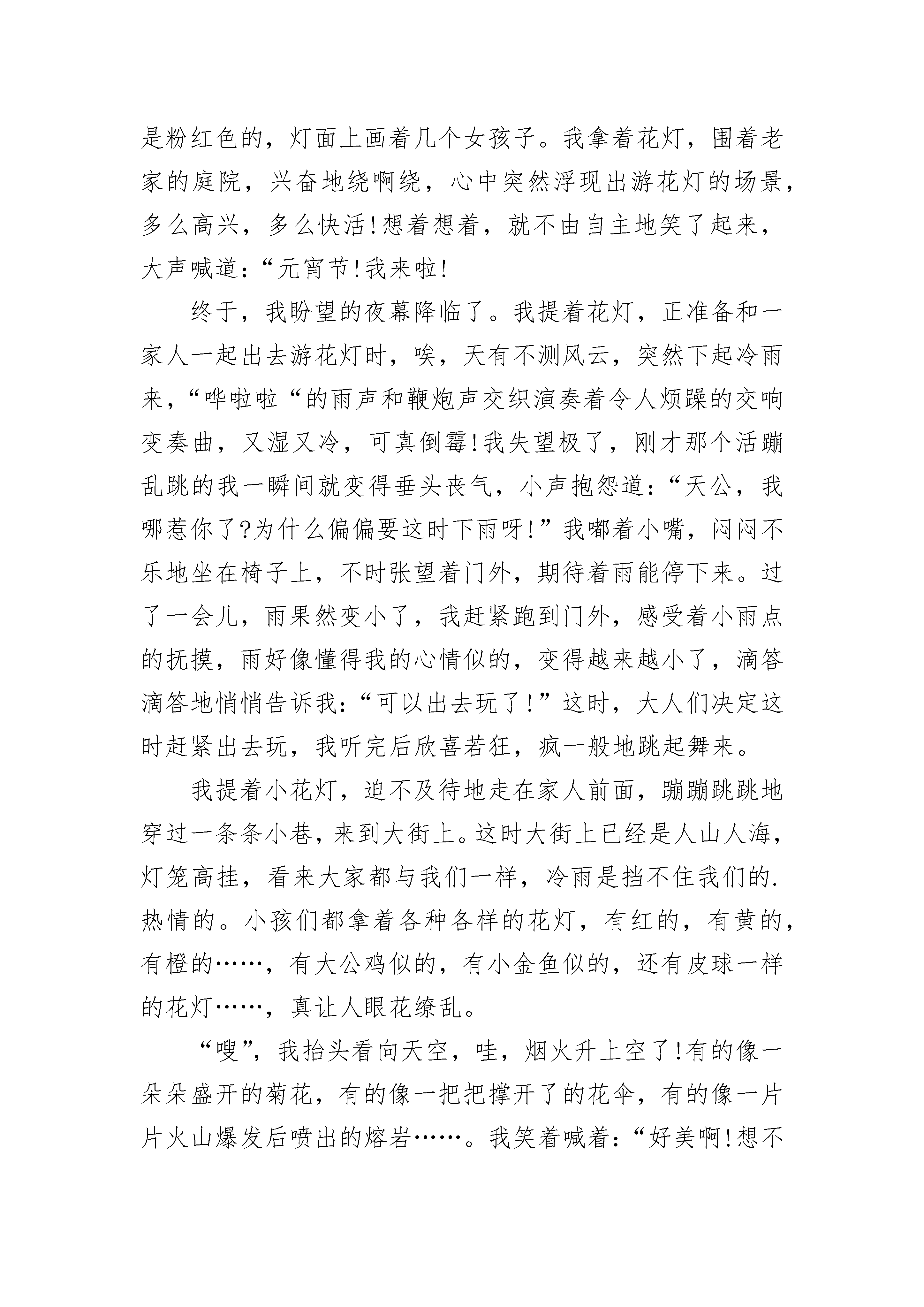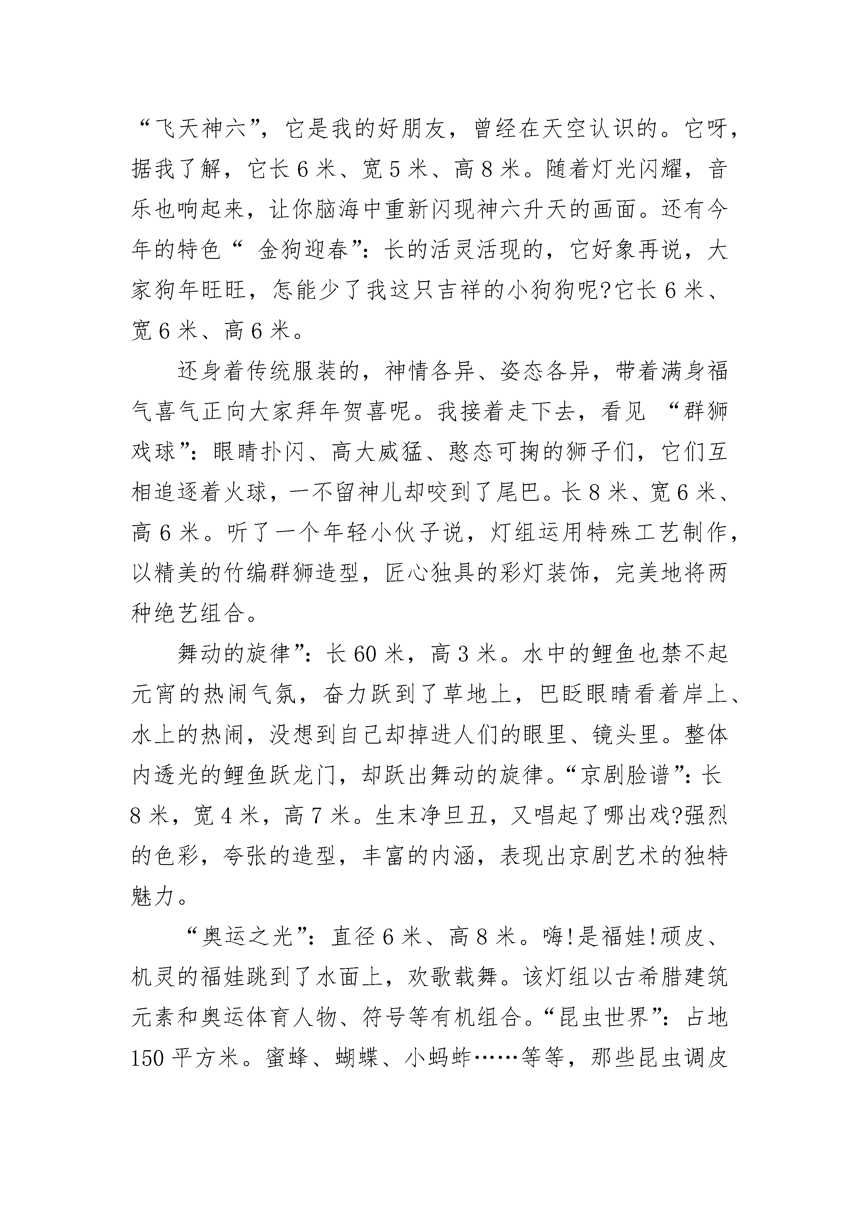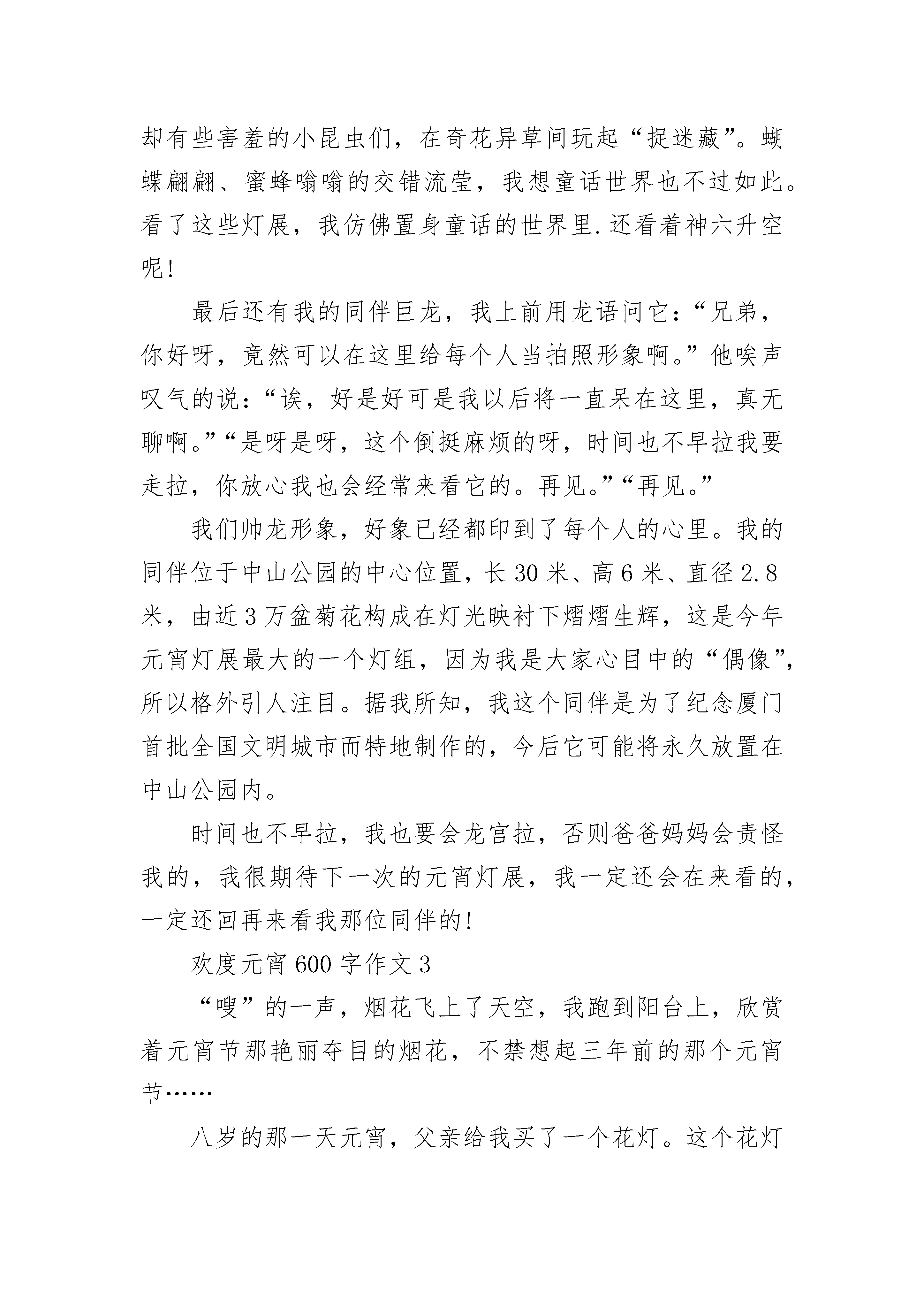 欢度元宵600字作文元宵节前的饭桌上总有几分不同:糯米粉、铁盆、木板、水杯——开始做元宵了!母亲总是那一句“揉一点面放一点水,揉到元宵的感觉时,停水续揉。”在我面前的铁盆里。装着白沙般的面粉。在我左手指间乱摇一阵,掌心缓缓向面粉拍去,无论怎么用力掌心都不能压到盆底。随手一捧粉屑,立刻如流沙般从指尖划过,用另一只手轻抚一下,才明白留下了抹不去的痕迹。这难办。我想。“倒一点水……”我自言自语,一边专注地看着母亲那双泛黄的手。只见十只手指干净利落地一推,一揉,手指从四面八方向面粉挤去。她平缓的气息一呼,一吸,把看似易散的面粉都听话地掌握在手中。我也不闲着。雪白的右手紧紧握住杯子的腰杆,左手更是小心谨慎地托住杯口,紧皱的眉头似乎能随着上扬地手移动着,多倒那么一滴也要狠狠滴骂自己一下。此时,杯中的水好比生命的源泉。沐浴了水的面粉好像活了起来,几下轻推慢揉,几次“雨水”滋润,那如沙般的面粉仿佛让那魔棍轻挥几下,竟变成了一堆巨大的庞然大物——这就是元宵的稚型。“再把面团揉几下,记得要往一个点揉,用力!”母亲两手互相摩擦着,细声细气地提醒,马上就好了。我双手合并着,坚定的眼神自动锁定了方位,腮帮如警示般股三股,雪白的掌心“刷‘地朝面团的白肚皮上刺去,只感觉得血管像打了气般“快要炸了”,没想到,面团软而富有弹性,推在上面跟抹在脸蛋上没什么两样!此时此刻,我的手指好比牙齿,而面团已经有了元宵的味道。紧接着,母亲如鹰爪般的手抓在面粉的一点,捏出了一两个白的深的深洞。轻而不急的一撕二撕,刹那面团一分二,而分四,八个白团静卧不动——最乐的一刻“揉元宵”来了。这时,可谓“全家动员”,五个人、八个面球,球在两手之中左游右逛,无头苍蝇般前扑后退,时而扁圆时而细长,在这千揉百磨之中,圆形的元宵完成了。八个“雪球”在木板之上排成一线,有谁能想到,再“推”、“揉”的锻铸下,竟会如此美丽‘和谐。许久后,厨房里的铁锅脚踩火焰之上,在里面蠢蠢欲动、不停翻滚的热水下,鹅卵石块般的元宵静静在水底围成一圈,只为等待浮出水面的那一刻……欢度元宵600字作文2今天是正月十五元宵节,我是一条调皮又讨人喜欢的龙。听说今年的灯展好看多了,所以我也来凑凑热闹,我就化身成为了一名老百姓。我到了中山公园一看,哇!好多人啊!人山人海的,还没有站稳脚跟就被潮水似的人流挤到了中间。这时,我看到了好多盏花灯比如有:跟我并肩同行的“飞天神六”,它是我的好朋友,曾经在天空认识的。它呀,据我了解,它长6米、宽5米、高8米。随着灯光闪耀,音乐也响起来,让你脑海中重新闪现神六升天的画面。还有今年的特色“金狗迎春”:长的活灵活现的,它好象再说,大家狗年旺旺,怎能少了我这只吉祥的小狗狗呢?它长6米、宽6米、高6米。还身着传统服装的,神情各异、姿态各异,带着满身福气喜气正向大家拜年贺喜呢。我接着走下去,看见“群狮戏球”:眼睛扑闪、高大威猛、憨态可掬的狮子们,它们互相追逐着火球,一不留神儿却咬到了尾巴。长8米、宽6米、高6米。听了一个年轻小伙子说,灯组运用特殊工艺制作,以精美的竹编群狮造型,匠心独具的彩灯装饰,完美地将两种绝艺组合。舞动的旋律”:长60米,高3米。水中的鲤鱼也禁不起元宵的热闹气氛,奋力跃到了草地上,巴眨眼睛看着岸上、水上的热闹,没想到自己却掉进人们的眼里、镜头里。整体内透光的鲤鱼跃龙门,却跃出舞动的旋律。“京剧脸谱”:长8米,宽4米,高7米。生末净旦丑,又唱起了哪出戏?强烈的色彩,夸张的造型,丰富的内涵,表现出京剧艺术的独特魅力。“奥运之光”:直径6米、高8米。嗨!是福娃!顽皮、机灵的福娃跳到了水面上,欢歌载舞。该灯组以古希腊建筑元素和奥运体育人物、符号等有机组合。“昆虫世界”:占地150平方米。蜜蜂、蝴蝶、小蚂蚱……等等,那些昆虫调皮却有些害羞的小昆虫们,在奇花异草间玩起“捉迷藏”。蝴蝶翩翩、蜜蜂嗡嗡的交错流莹,我想童话世界也不过如此。看了这些灯展,我仿佛置身童话的世界里.还看着神六升空呢!最后还有我的同伴巨龙,我上前用龙语问它:“兄弟,你好呀,竟然可以在这里给每个人当拍照形象啊。”他唉声叹气的说:“诶,好是好可是我以后将一直呆在这里,真无聊啊。”“是呀是呀,这个倒挺麻烦的呀,时间也不早拉我要走拉,你放心我也会经常来看它的。再见。”“再见。”我们帅龙形象,好象已经都印到了每个人的心里。我的同伴位于中山公园的中心位置,长30米、高6米、直径2.8米,由近3万盆菊花构成在灯光映衬下熠熠生辉,这是今年元宵灯展最大的一个灯组,因为我是大家心目中的“偶像”,所以格外引人注目。据我所知,我这个同伴是为了纪念厦门首批全国文明城市而特地制作的,今后它可能将永久放置在中山公园内。时间也不早拉,我也要会龙宫拉,否则爸爸妈妈会责怪我的,我很期待下一次的元宵灯展,我一定还会在来看的,一定还回再来看我那位同伴的!欢度元宵