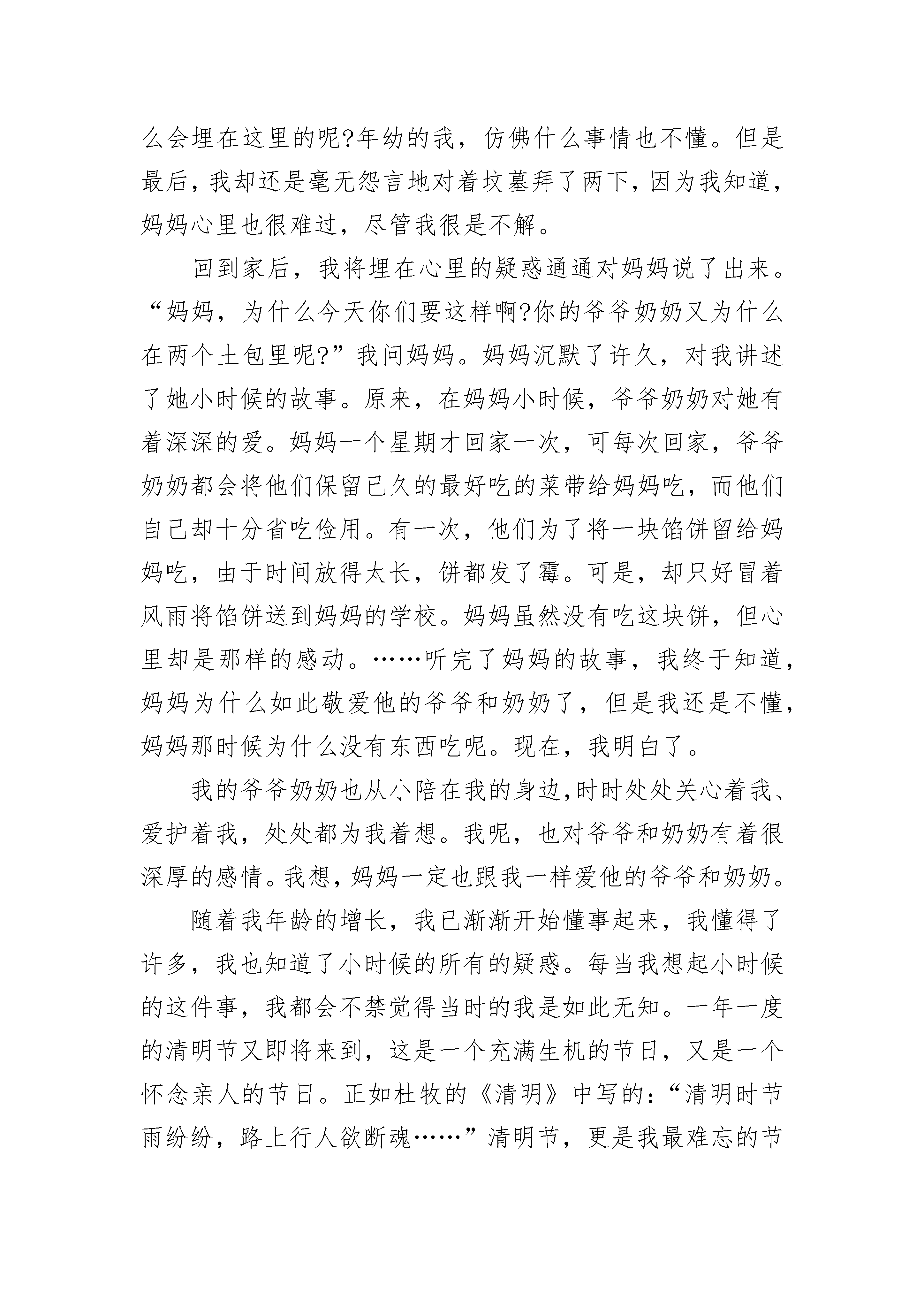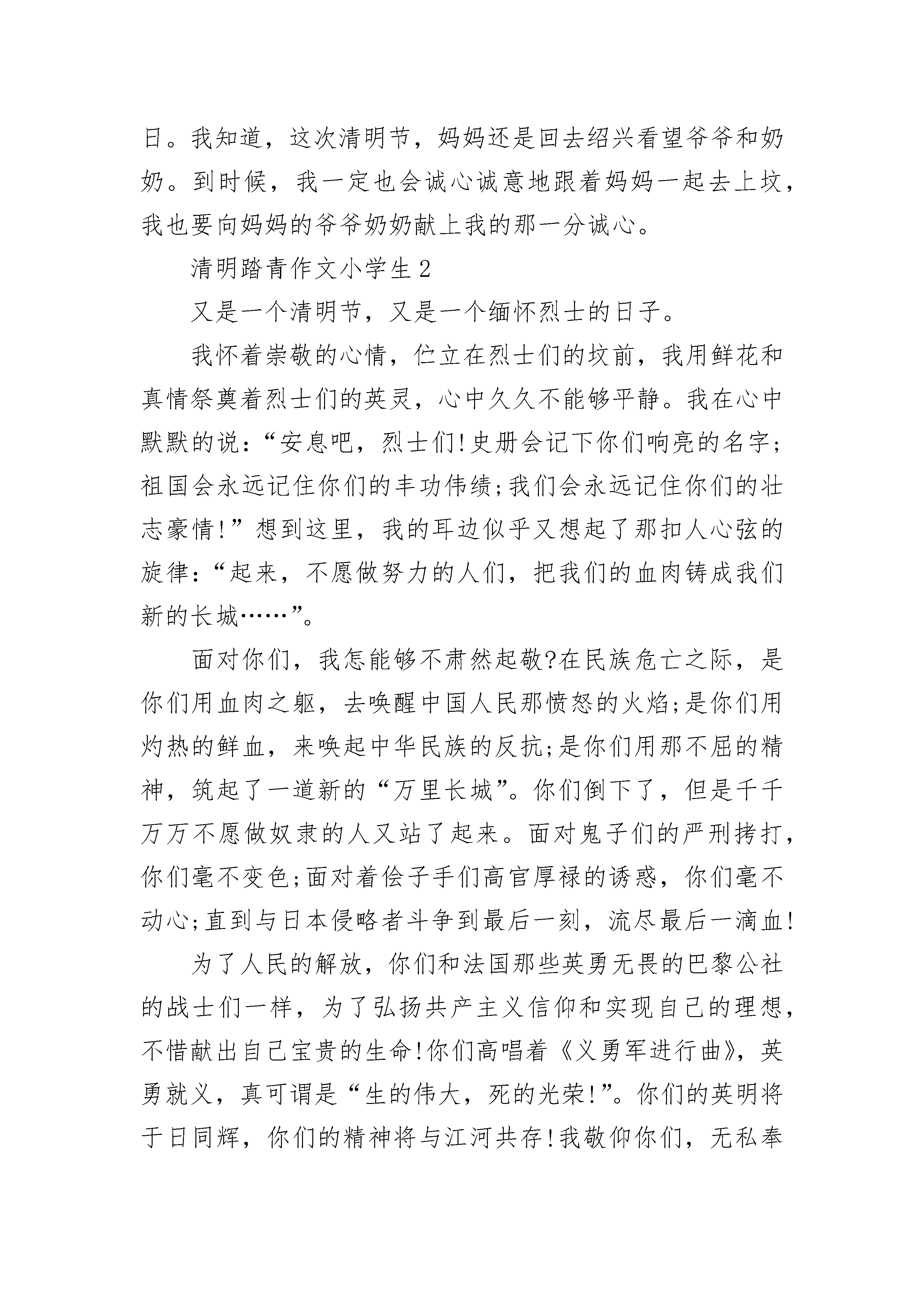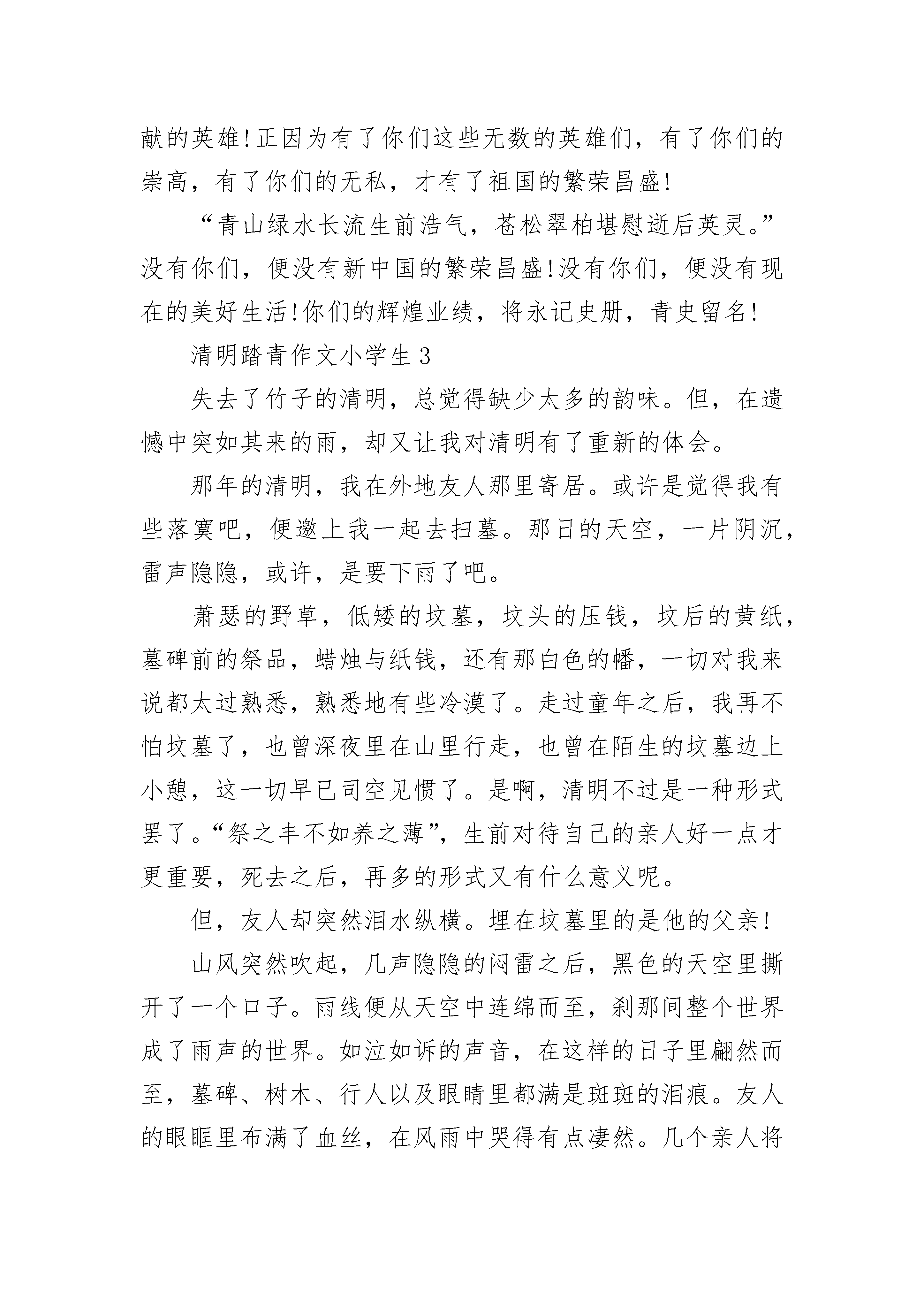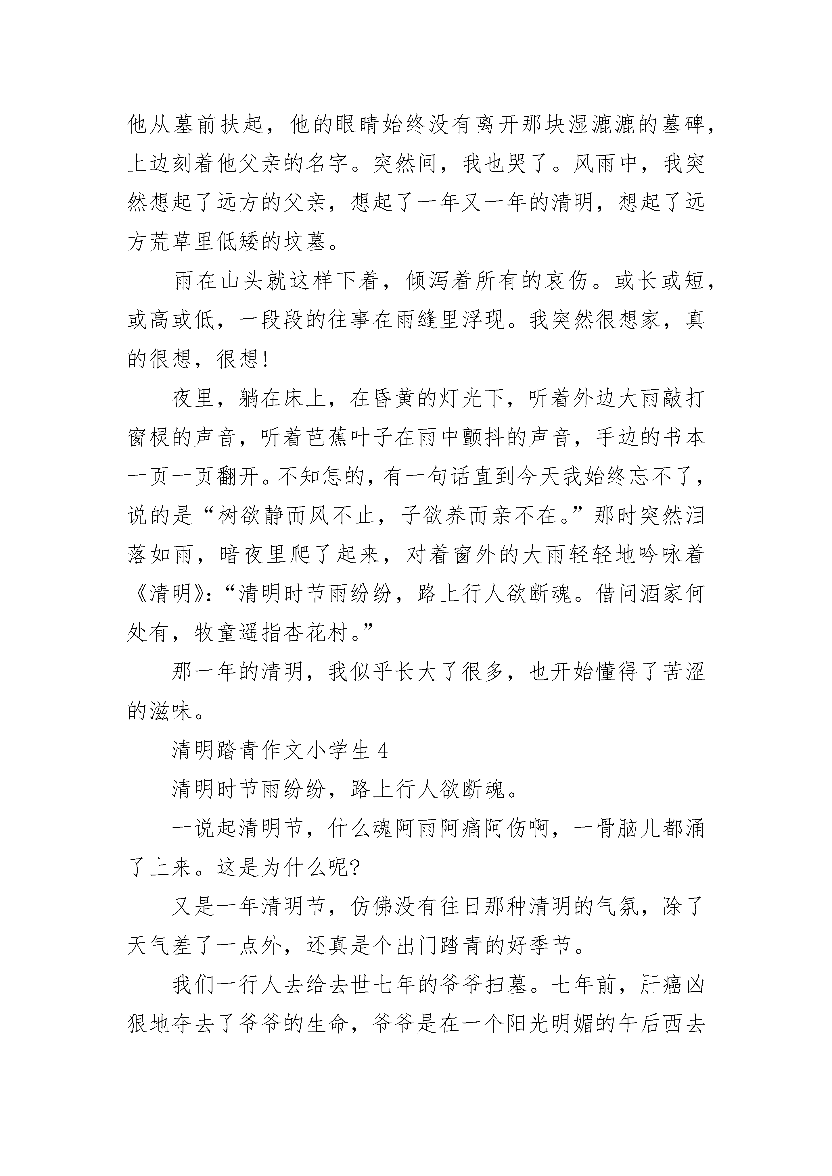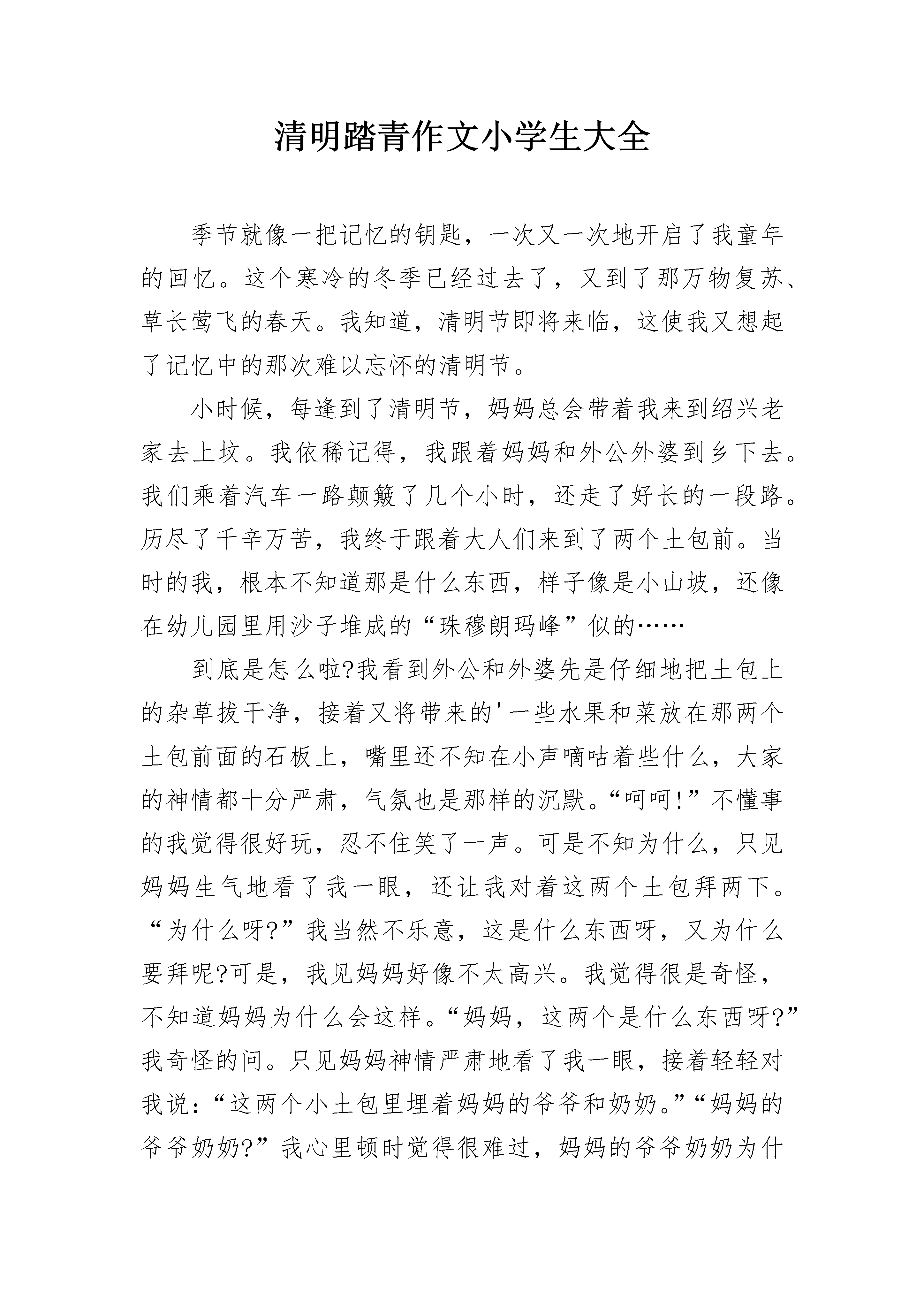 清明踏青作文小学生大全季节就像一把记忆的钥匙,一次又一次地开启了我童年的回忆。这个寒冷的冬季已经过去了,又到了那万物复苏、草长莺飞的春天。我知道,清明节即将来临,这使我又想起了记忆中的那次难以忘怀的清明节。小时候,每逢到了清明节,妈妈总会带着我来到绍兴老家去上坟。我依稀记得,我跟着妈妈和外公外婆到乡下去。我们乘着汽车一路颠簸了几个小时,还走了好长的一段路。历尽了千辛万苦,我终于跟着大人们来到了两个土包前。当时的我,根本不知道那是什么东西,样子像是小山坡,还像在幼儿园里用沙子堆成的“珠穆朗玛峰”似的……到底是怎么啦?我看到外公和外婆先是仔细地把土包上的杂草拔干净,接着又将带来的'一些水果和菜放在那两个土包前面的石板上,嘴里还不知在小声嘀咕着些什么,大家的神情都十分严肃,气氛也是那样的沉默。“呵呵!”不懂事的我觉得很好玩,忍不住笑了一声。可是不知为什么,只见妈妈生气地看了我一眼,还让我对着这两个土包拜两下。“为什么呀?”我当然不乐意,这是什么东西呀,又为什么要拜呢?可是,我见妈妈好像不太高兴。我觉得很是奇怪,不知道妈妈为什么会这样。“妈妈,这两个是什么东西呀?”我奇怪的问。只见妈妈神情严肃地看了我一眼,接着轻轻对我说:“这两个小土包里埋着妈妈的爷爷和奶奶。”“妈妈的爷爷奶奶?”我心里顿时觉得很难过,妈妈的爷爷奶奶为什么会埋在这里的呢?年幼的我,仿佛什么事情也不懂。但是最后,我却还是毫无怨言地对着坟墓拜了两下,因为我知道,妈妈心里也很难过,尽管我很是不解。回到家后,我将埋在心里的疑惑通通对妈妈说了出来。“妈妈,为什么今天你们要这样啊?你的爷爷奶奶又为什么在两个土包里呢?”我问妈妈。妈妈沉默了许久,对我讲述了她小时候的故事。原来,在妈妈小时候,爷爷奶奶对她有着深深的爱。妈妈一个星期才回家一次,可每次回家,爷爷奶奶都会将他们保留已久的最好吃的菜带给妈妈吃,而他们自己却十分省吃俭用。有一次,他们为了将一块馅饼留给妈妈吃,由于时间放得太长,饼都发了霉。可是,却只好冒着风雨将馅饼送到妈妈的学校。妈妈虽然没有吃这块饼,但心里却是那样的感动。……听完了妈妈的故事,我终于知道,妈妈为什么如此敬爱他的爷爷和奶奶了,但是我还是不懂,妈妈那时候为什么没有东西吃呢。现在,我明白了。我的爷爷奶奶也从小陪在我的身边,时时处处关心着我、爱护着我,处处都为我着想。我呢,也对爷爷和奶奶有着很深厚的感情。我想,妈妈一定也跟我一样爱他的爷爷和奶奶。随着我年龄的增长,我已渐渐开始懂事起来,我懂得了许多,我也知道了小时候的所有的疑惑。每当我想起小时候的这件事,我都会不禁觉得当时的我是如此无知。一年一度的清明节又即将来到,这是一个充满生机的节日,又是一个怀念亲人的节日。正如杜牧的《清明》中写的:“清明时节雨纷纷,路上行人欲断魂……”清明节,更是我最难忘的节日。我知道,这次清明节,妈妈还是回去绍兴看望爷爷和奶奶。到时候,我一定也会诚心诚意地跟着妈妈一起去上坟,我也要向妈妈的爷爷奶奶献上我的那一分诚心。清明踏青作文小学生2又是一个清明节,又是一个缅怀烈士的日子。我怀着崇敬的心情,伫立在烈士们的坟前,我用鲜花和真情祭奠着烈士们的英灵,心中久久不能够平静。我在心中默默的说:“安息吧,烈士们!史册会记下你们响亮的名字;祖国会永远记住你们的丰功伟绩;我们会永远记住你们的壮志豪情!”想到这里,我的耳边似乎又想起了那扣人心弦的旋律:“起来,不愿做努力的人们,把我们的血肉铸成我们新的长城……”。面对你们,我怎能够不肃然起敬?在民族危亡之际,是你们用血肉之躯,去唤醒中国人民那愤怒的火焰;是你们用灼热的鲜血,来唤起中华民族的反抗;是你们用那不屈的精神,筑起了一道新的“万里长城”。你们倒下了,但是千千万万不愿做奴隶的人又站了起来。面对鬼子们的严刑拷打,你们毫不变色;面对着侩子手们高官厚禄的诱惑,你们毫不动心;直到与日本侵略者斗争到最后一刻,流尽最后一滴血!为了人民的解放,你们和法国那些英勇无畏的巴黎公社的战士们一样,为了弘扬共产主义信仰和实现自己的理想,不惜献出自己宝贵的生命!你们高唱着《义勇军进行曲》,英勇就义,真可谓是“生的伟大,死的光荣!”。你们的英明将于日同辉,你们的精神将与江河共存!我敬仰你们,无私奉献的英雄!正因为有了你们这些无数的英雄们,有了你们的崇高,有了你们的无私,才有了祖国的繁荣昌盛!“青山绿水长流生前浩气,苍松翠柏堪慰逝后英灵。”没有你们,便没有新中国的繁荣昌盛!没有你们,便没有现在的美好生活!你们的辉煌业绩,将永记史册,青史留名!清明踏青作文小学生3失去了竹子的清明,总觉得缺少太多的韵味。但,在遗憾中突如其来的雨,却又让我对清明有了重新的体会。那年的清明,我在外地友人那里寄居。或许是觉得我有些落寞吧,便邀上我一起去扫墓。那日的天空,一片阴沉,雷声隐隐,或许,是要下雨了吧。