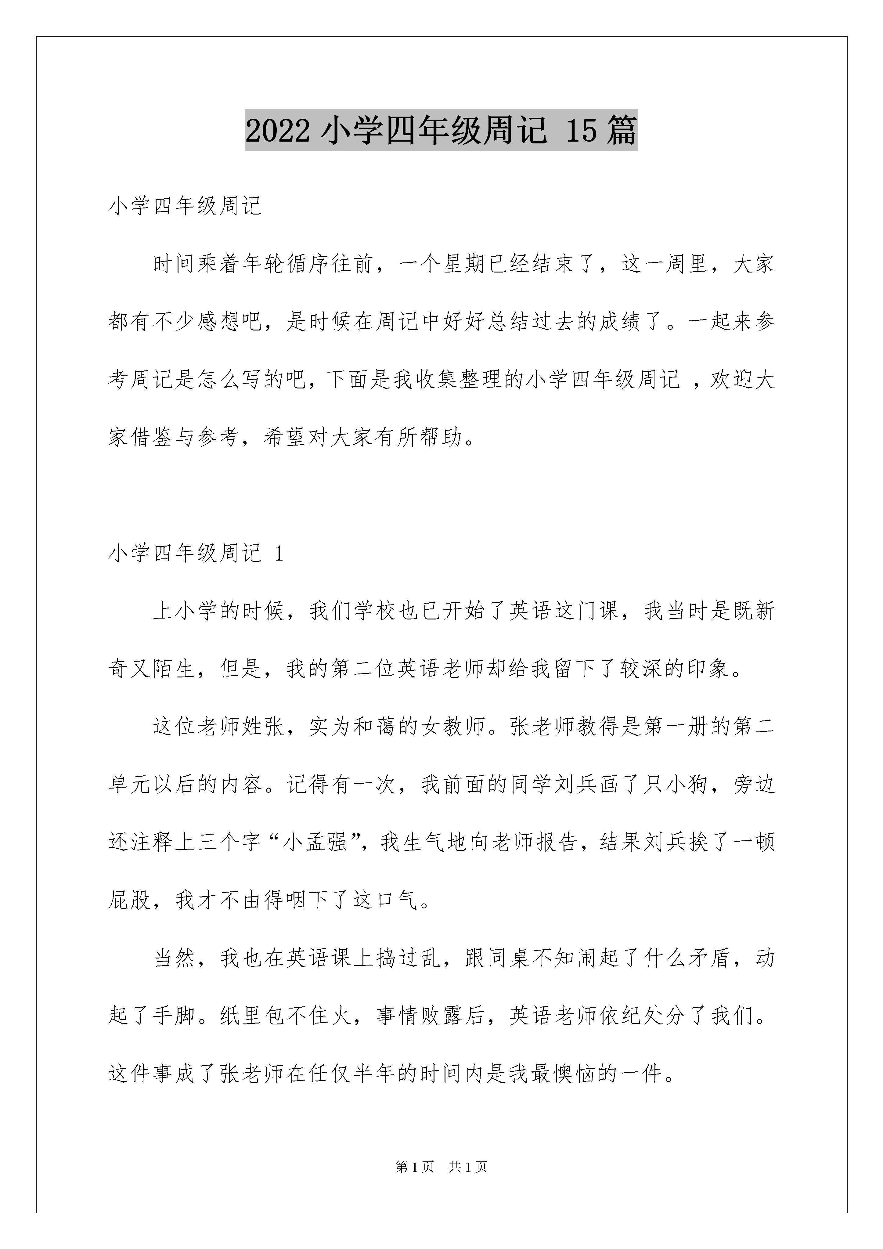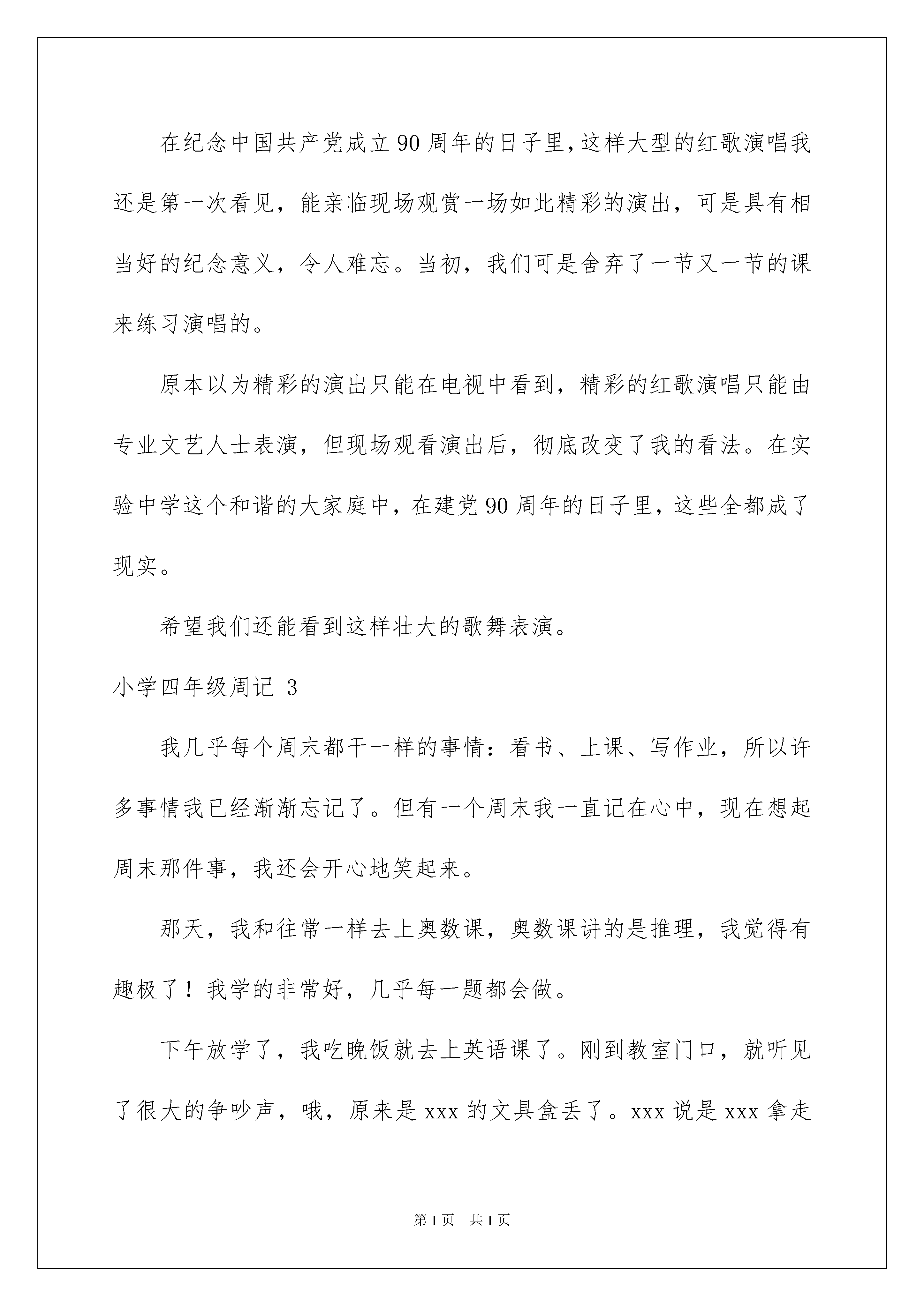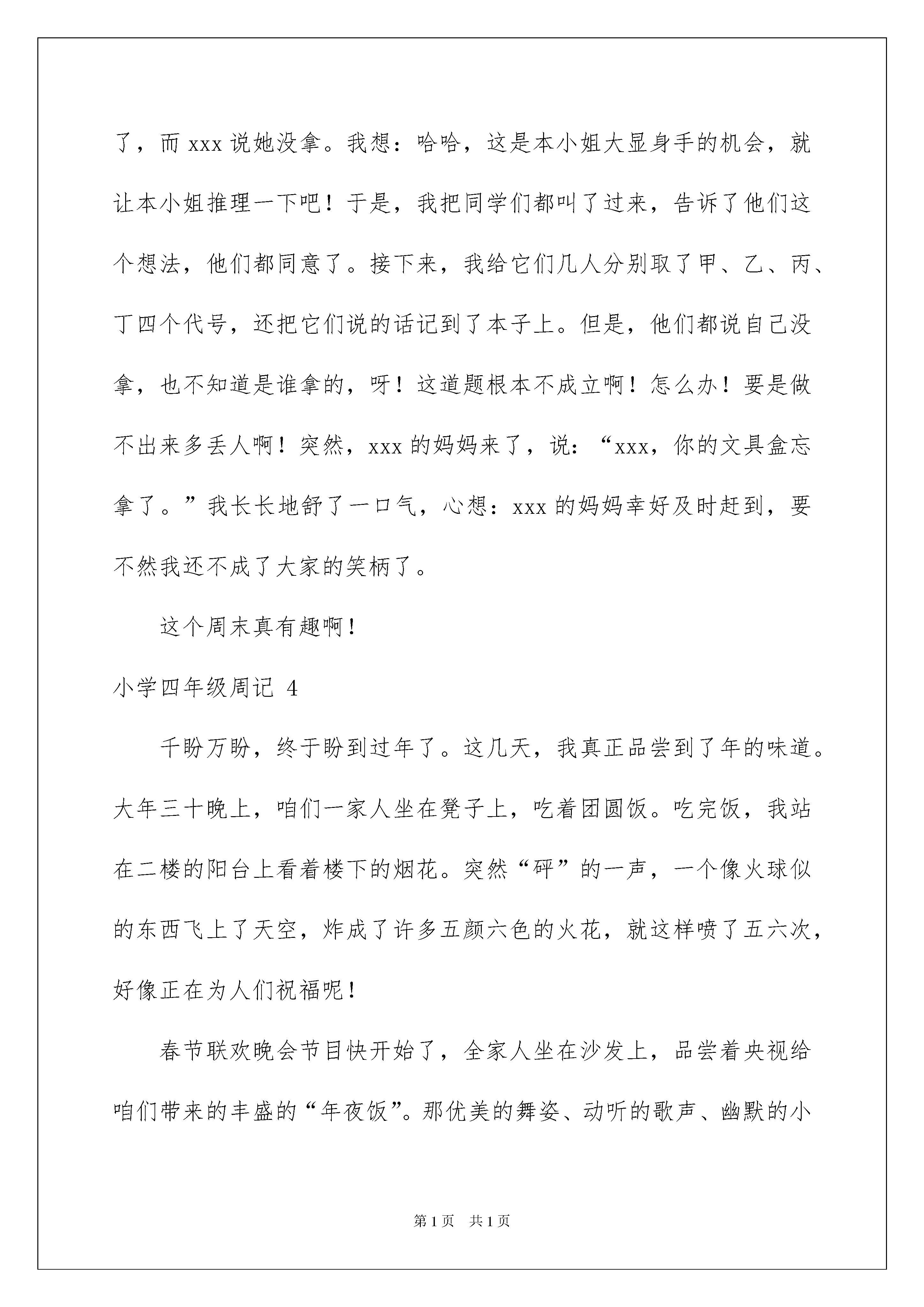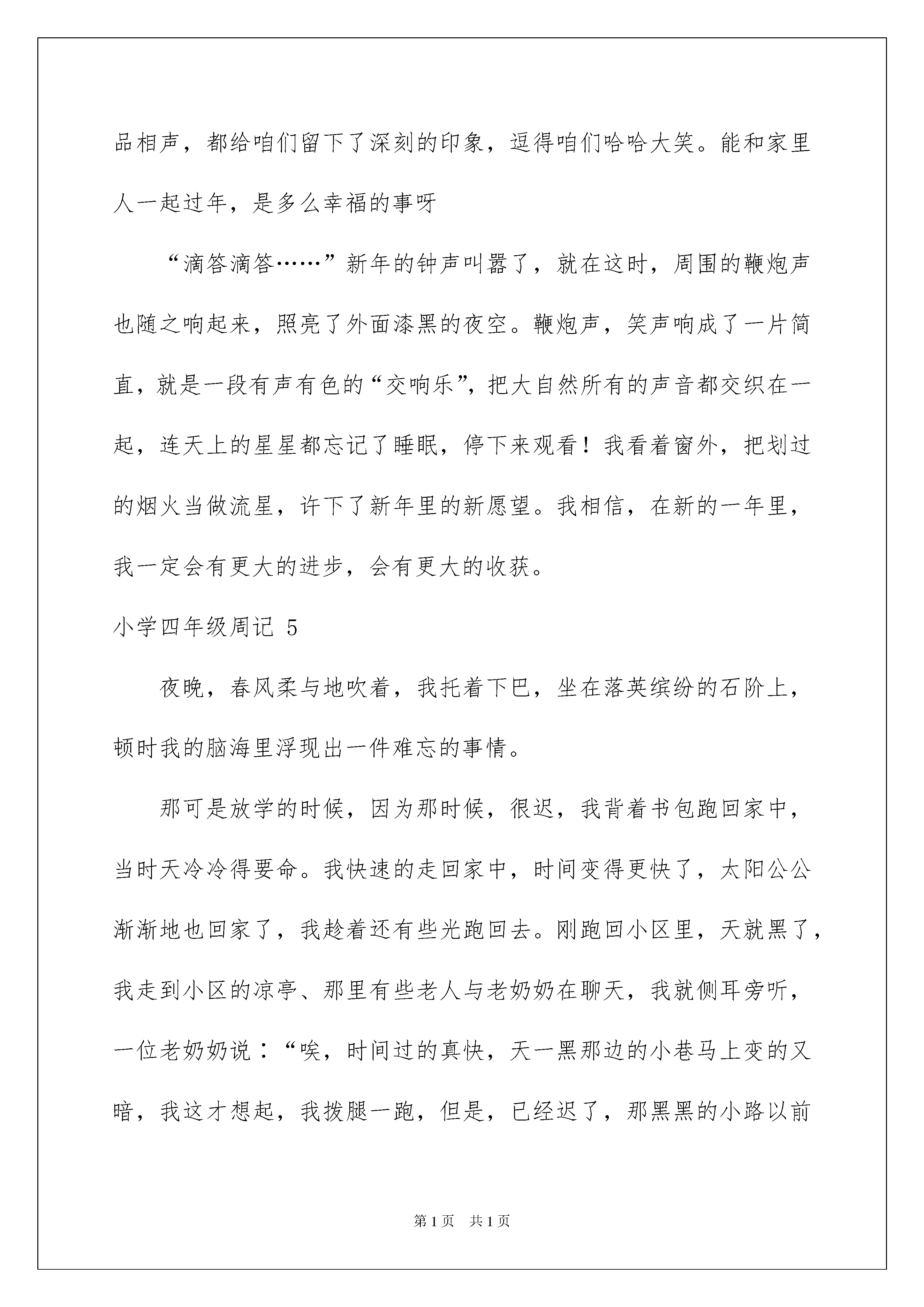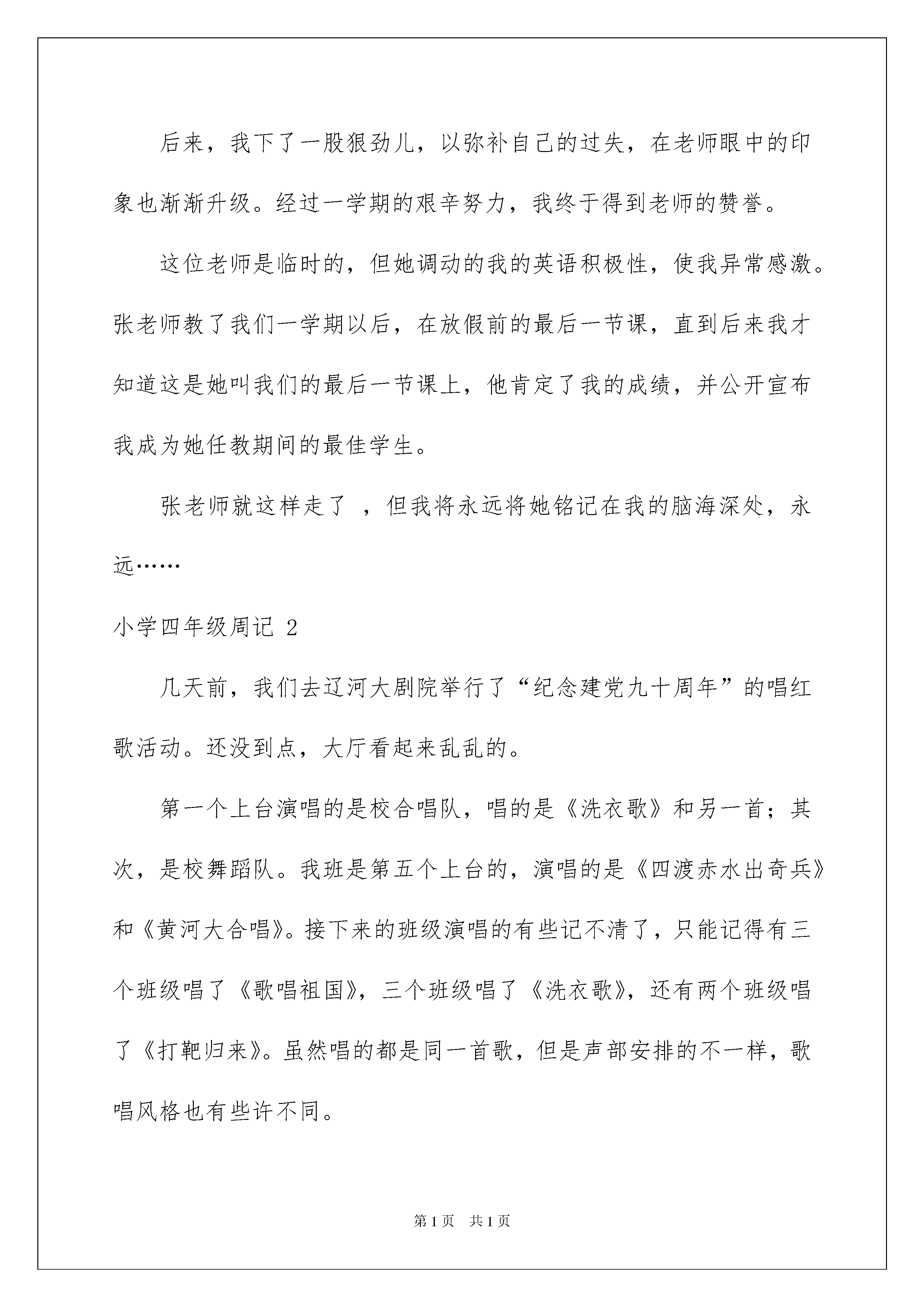 2022小学四年级周记15篇小学四年级周记时间乘着年轮循序往前,一个星期已经结束了,这一周里,大家都有不少感想吧,是时候在周记中好好总结过去的成绩了。一起来参考周记是怎么写的吧,下面是我收集整理的小学四年级周记,欢迎大家借鉴与参考,希望对大家有所帮助。小学四年级周记1上小学的时候,我们学校也已开始了英语这门课,我当时是既新奇又陌生,但是,我的第二位英语老师却给我留下了较深的印象。这位老师姓张,实为和蔼的女教师。张老师教得是第一册的第二单元以后的内容。记得有一次,我前面的同学刘兵画了只小狗,旁边还注释上三个字“小孟强”,我生气地向老师报告,结果刘兵挨了一顿屁股,我才不由得咽下了这口气。当然,我也在英语课上捣过乱,跟同桌不知闹起了什么矛盾,动起了手脚。纸里包不住火,事情败露后,英语老师依纪处分了我们。这件事成了张老师在任仅半年的时间内是我最懊恼的一件。后来,我下了一股狠劲儿,以弥补自己的过失,在老师眼中的印象也渐渐升级。经过一学期的艰辛努力,我终于得到老师的赞誉。这位老师是临时的,但她调动的我的英语积极性,使我异常感激。张老师教了我们一学期以后,在放假前的最后一节课,直到后来我才知道这是她叫我们的最后一节课上,他肯定了我的成绩,并公开宣布我成为她任教期间的最佳学生。张老师就这样走了,但我将永远将她铭记在我的脑海深处,永远……小学四年级周记2几天前,我们去辽河大剧院举行了“纪念建党九十周年”的唱红歌活动。还没到点,大厅看起来乱乱的。第一个上台演唱的是校合唱队,唱的是《洗衣歌》和另一首;其次,是校舞蹈队。我班是第五个上台的,演唱的是《四渡赤水出奇兵》和《黄河大合唱》。接下来的班级演唱的有些记不清了,只能记得有三个班级唱了《歌唱祖国》,三个班级唱了《洗衣歌》,还有两个班级唱了《打靶归来》。虽然唱的都是同一首歌,但是声部安排的不一样,歌唱风格也有些许不同。在纪念中国共产党成立90周年的日子里,这样大型的红歌演唱我还是第一次看见,能亲临现场观赏一场如此精彩的演出,可是具有相当好的纪念意义,令人难忘。当初,我们可是舍弃了一节又一节的课来练习演唱的。原本以为精彩的演出只能在电视中看到,精彩的红歌演唱只能由专业文艺人士表演,但现场观看演出后,彻底改变了我的看法。在实验中学这个和谐的大家庭中,在建党90周年的日子里,这些全都成了现实。希望我们还能看到这样壮大的歌舞表演。小学四年级周记3我几乎每个周末都干一样的事情:看书、上课、写作业,所以许多事情我已经渐渐忘记了。但有一个周末我一直记在心中,现在想起周末那件事,我还会开心地笑起来。那天,我和往常一样去上奥数课,奥数课讲的是推理,我觉得有趣极了!我学的非常好,几乎每一题都会做。下午放学了,我吃晚饭就去上英语课了。刚到教室门口,就听见了很大的争吵声,哦,原来是xxx的文具盒丢了。xxx说是xxx拿走了,而xxx说她没拿。我想:哈哈,这是本小姐大显身手的机会,就让本小姐推理一下吧!于是,我把同学们都叫了过来,告诉了他们这个想法,他们都同意了。接下来,我给它们几人分别取了甲、乙、丙、丁四个代号,还把它们说的话记到了本子上。但是,他们都说自己没拿,也不知道是谁拿的,呀!这道题根本不成立啊!怎么办!要是做不出来多丢人啊!突然,xxx的妈妈来了,说:“xxx,你的文具盒忘拿了。”我长长地舒了一口气,心想:xxx的妈妈幸好及时赶到,要不然我还不成了大家的笑柄了。这个周末真有趣啊!小学四年级周记4千盼万盼,终于盼到过年了。这几天,我真正品尝到了年的味道。大年三十晚上,咱们一家人坐在凳子上,吃着团圆饭。吃完饭,我站在二楼的阳台上看着楼下的烟花。突然“砰”的一声,一个像火球似的东西飞上了天空,炸成了许多五颜六色的火花,就这样喷了五六次,好像正在为人们祝福呢!春节联欢晚会节目快开始了,全家人坐在沙发上,品尝着央视给咱们带来的丰盛的“年夜饭”。那优美的舞姿、动听的歌声、幽默的小品相声,都给咱们留下了深刻的印象,逗得咱们哈哈大笑。能和家里人一起过年,是多么幸福的事呀“滴答滴答……”新年的钟声叫嚣了,就在这时,周围的鞭炮声也随之响起来,照亮了外面漆黑的夜空。鞭炮声,笑声响成了一片简直,就是一段有声有色的“交响乐”,把大自然所有的声音都交织在一起,连天上的星星都忘记了睡眠,停下来观看!我看着窗外,把划过的烟火当做流星,许下了新年里的新愿望。我相信,在新的一年里,我一定会有更大的进步,会有更大的收获。小学四年级周记5夜晚,春风柔与地吹着,我托着下巴,坐在落英缤纷的石阶上,顿时我的脑海里浮现出一件难忘的事情。那可是放学的时候,因为那时候,很迟,我背着书包跑回家中,当时天冷冷得要命