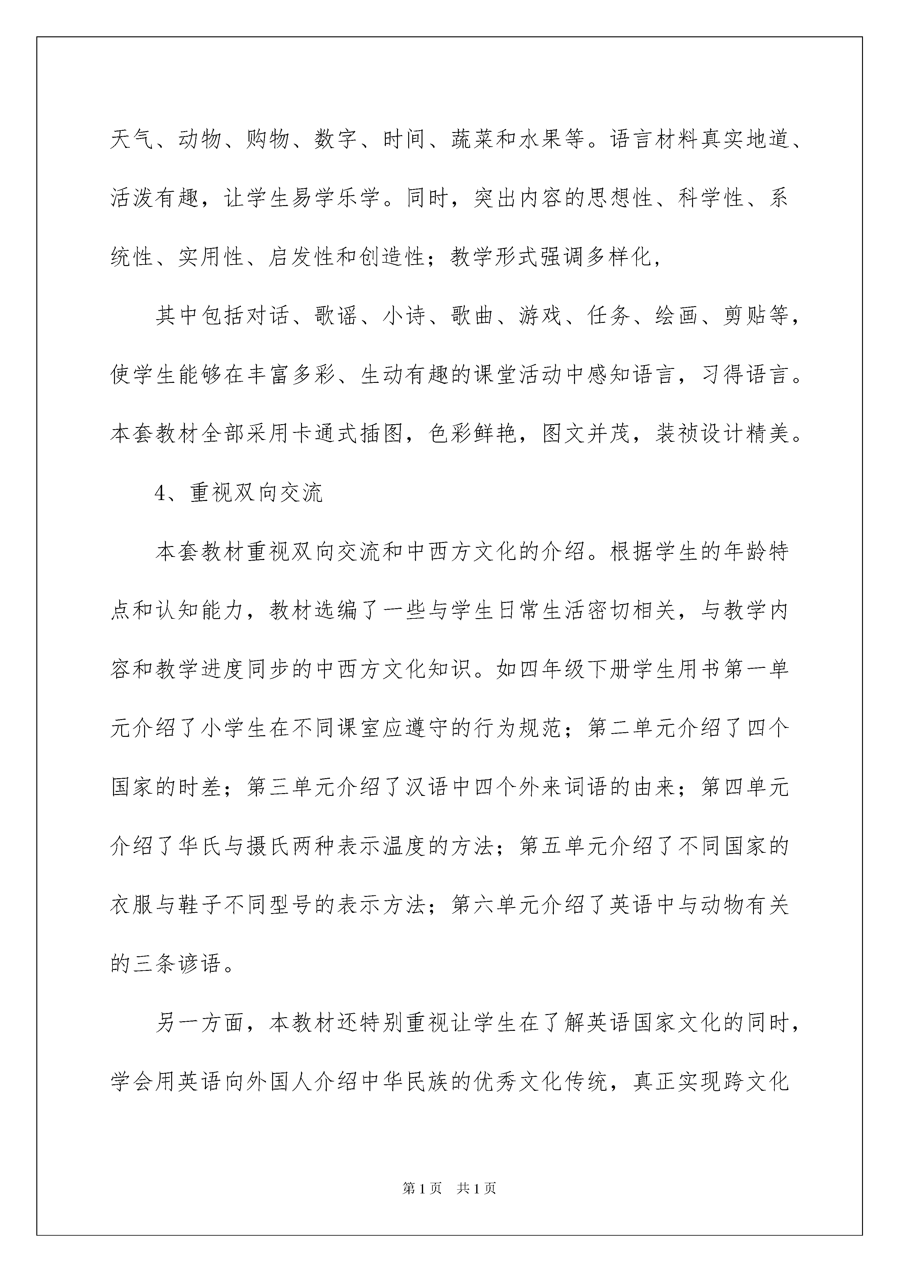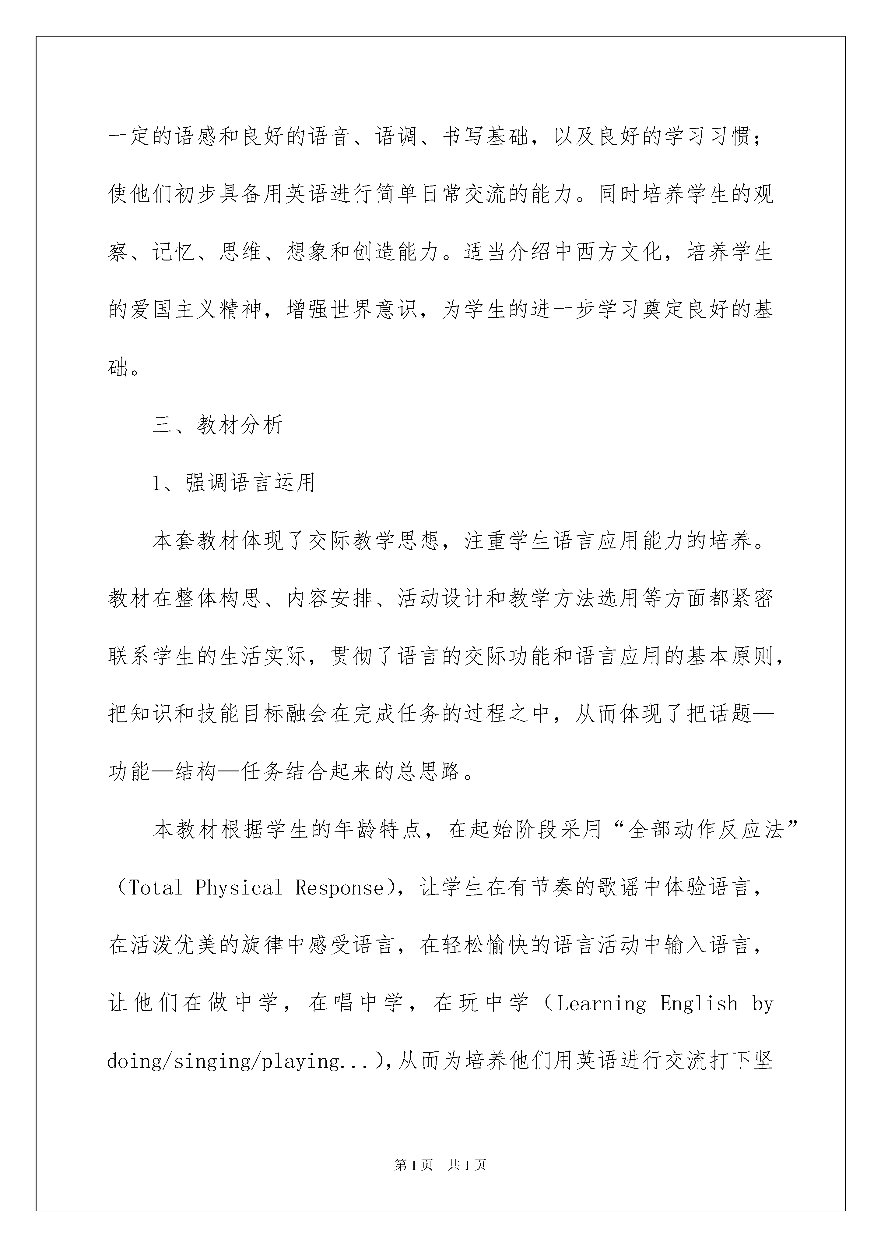 2022小学四年级英语教学计划小学四年级英语教学计划日子在弹指一挥间就毫无声息的流逝,我们迎来了新的学习生活,需要好好的对接下来的教学进行计划了。那么教学计划怎么写才能体现你的真正价值呢?下面是我帮大家整理的小学四年级英语教学计划,仅供参考,大家一起来看看吧。小学四年级英语教学计划1《义务教育课程标准实验教科书英语(PEP)》是课程教材研究所英语课程教材研究开发中心与加拿大LingoMedia国际集团合作编写的一套全新的小学英语教材。这套教材是根据教育部制定的《国家英语课程标准》编写而成的。这套教材已经全国中小学教材审定委员会审查通过,并被推荐从20xx年9月起在全国使用。这套教材共8册,每学期一册,供小学3-6年级的学生使用。一、教学目的本套教材的教学目的是激发学生学习英语的兴趣,培养他们学习英语的积极态度,使他们初步建立学习英语的自信心;培养学生具有一定的语感和良好的语音、语调、书写基础,以及良好的学习习惯;使他们初步具备用英语进行简单日常交流的能力。同时培养学生的观察、记忆、思维、想象和创造能力。适当介绍中西方文化,培养学生的爱国主义精神,增强世界意识,为学生的进一步学习奠定良好的基础。三、教材分析1、强调语言运用本套教材体现了交际教学思想,注重学生语言应用能力的培养。教材在整体构思、内容安排、活动设计和教学方法选用等方面都紧密联系学生的生活实际,贯彻了语言的交际功能和语言应用的基本原则,把知识和技能目标融会在完成任务的过程之中,从而体现了把话题—功能—结构—任务结合起来的总思路。本教材根据学生的年龄特点,在起始阶段采用“全部动作反应法”(TotalPhysicalResponse),让学生在有节奏的歌谣中体验语言,在活泼优美的旋律中感受语言,在轻松愉快的语言活动中输入语言,让他们在做中学,在唱中学,在玩中学(LearningEnglishbydoing/singing/playing...),从而为培养他们用英语进行交流打下坚实的基础。2、注重能力培养从学习者的角度来讲,基础教育最重要的任务是学会学习(Learnhowtolearn)。开发自主学习能力,发展学习策略,培养创新能力,是实施素质教育的重要组成部分。本套教材在内容安排、活动设计和学习评价上都贯穿“学会学习”的主题。学生用书的设计十分注意培养学生自主学习和独立运用所学语言去做事情的能力,如:Let’sfindout/Let’scheck/Readandthink/Tasktime等活动。力求用简单生动、通俗易懂的方式渗透学习策略,鼓励他们能动思考,主动做事,自动调整学习方式,发掘他们积极求知、努力进取的潜能。本教材以及活动手册中还特别设计了学习评价的栏目,引导学生在学习中反思,在反思中学习,有效地增进他们的自我评价意识,以利于学生的终身学习和发展。3、突出兴趣激发本套教材在内容、形式、方法、插图及装祯设计等方面都以激发学生的学习动机和兴趣为宗旨。教学内容紧密联系小学生的生活和学习实际,选择话题充分考虑到小学生的需求,如:学校、家庭、衣服、天气、动物、购物、数字、时间、蔬菜和水果等。语言材料真实地道、活泼有趣,让学生易学乐学。同时,突出内容的思想性、科学性、系统性、实用性、启发性和创造性;教学形式强调多样化,其中包括对话、歌谣、小诗、歌曲、游戏、任务、绘画、剪贴等,使学生能够在丰富多彩、生动有趣的课堂活动中感知语言,习得语言。本套教材全部采用卡通式插图,色彩鲜艳,图文并茂,装祯设计精美。4、重视双向交流本套教材重视双向交流和中西方文化的介绍。根据学生的年龄特点和认知能力,教材选编了一些与学生日常生活密切相关,与教学内容和教学进度同步的中西方文化知识。如四年级下册学生用书第一单元介绍了小学生在不同课室应遵守的行为规范;第二单元介绍了四个国家的时差;第三单元介绍了汉语中四个外来词语的由来;第四单元介绍了华氏与摄氏两种表示温度的方法;第五单元介绍了不同国家的衣服与鞋子不同型号的表示方法;第六单元介绍了英语中与动物有关的三条谚语。另一方面,本教材还特别重视让学生在了解英语国家文化的同时,学会用英语向外国人介绍中华民族的优秀文化传统,真正实现跨文化交际,如:中国最近又兴起了“唐装”热,其名称来由多半是唐朝的兴盛让中国人感到自豪,这在第三单元的Goodtoknow中就有所涉及。5、融合学科内容教育部在新课程设计中,强调学科之间的整合。学生学习英语不仅是为了满足人际交往的需要,也是为了用英语获取各方面的信息,学习其他学科的知识。新教材依据“学会求知(Learnhowtoknow)”的基本精神,十分重视在学习内容上与其他学