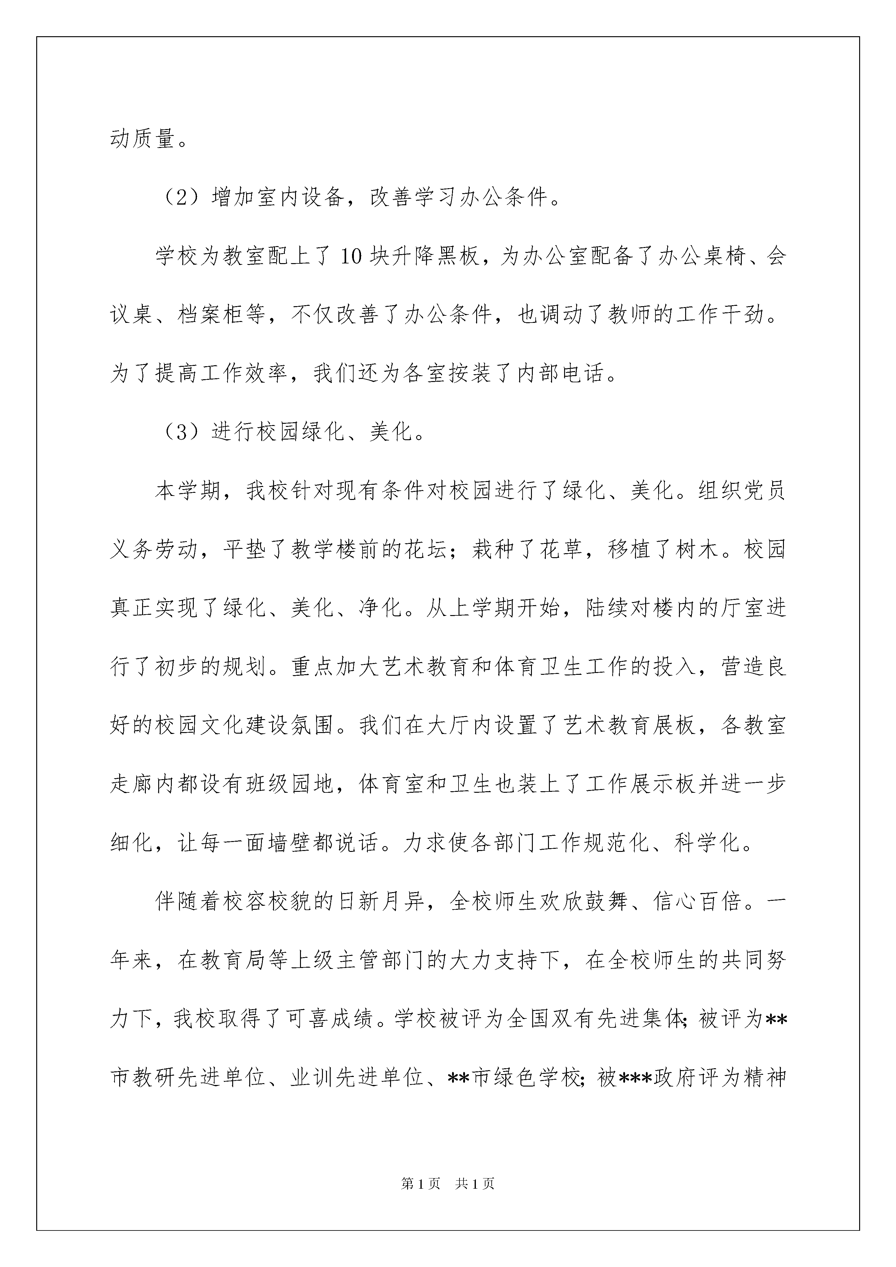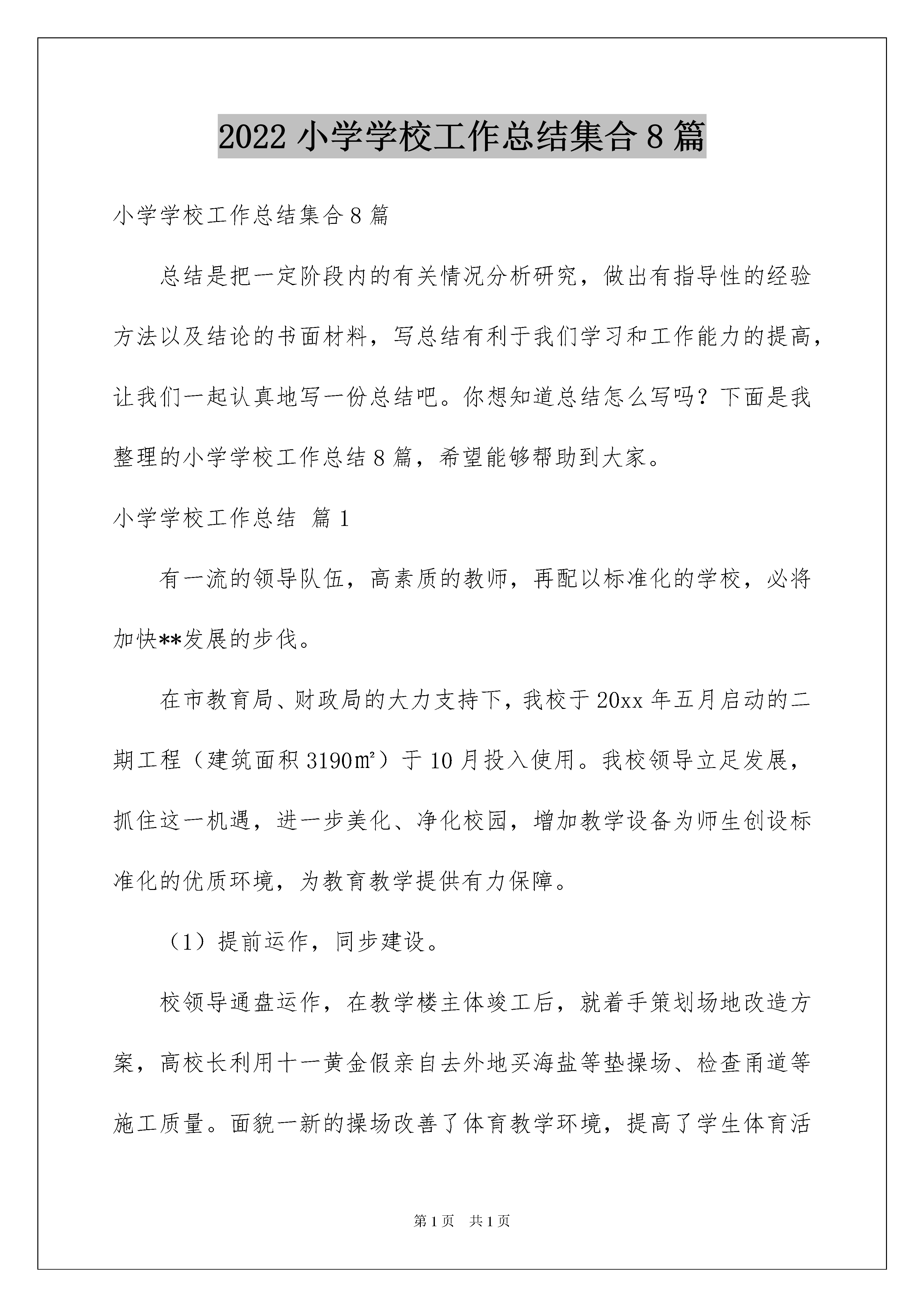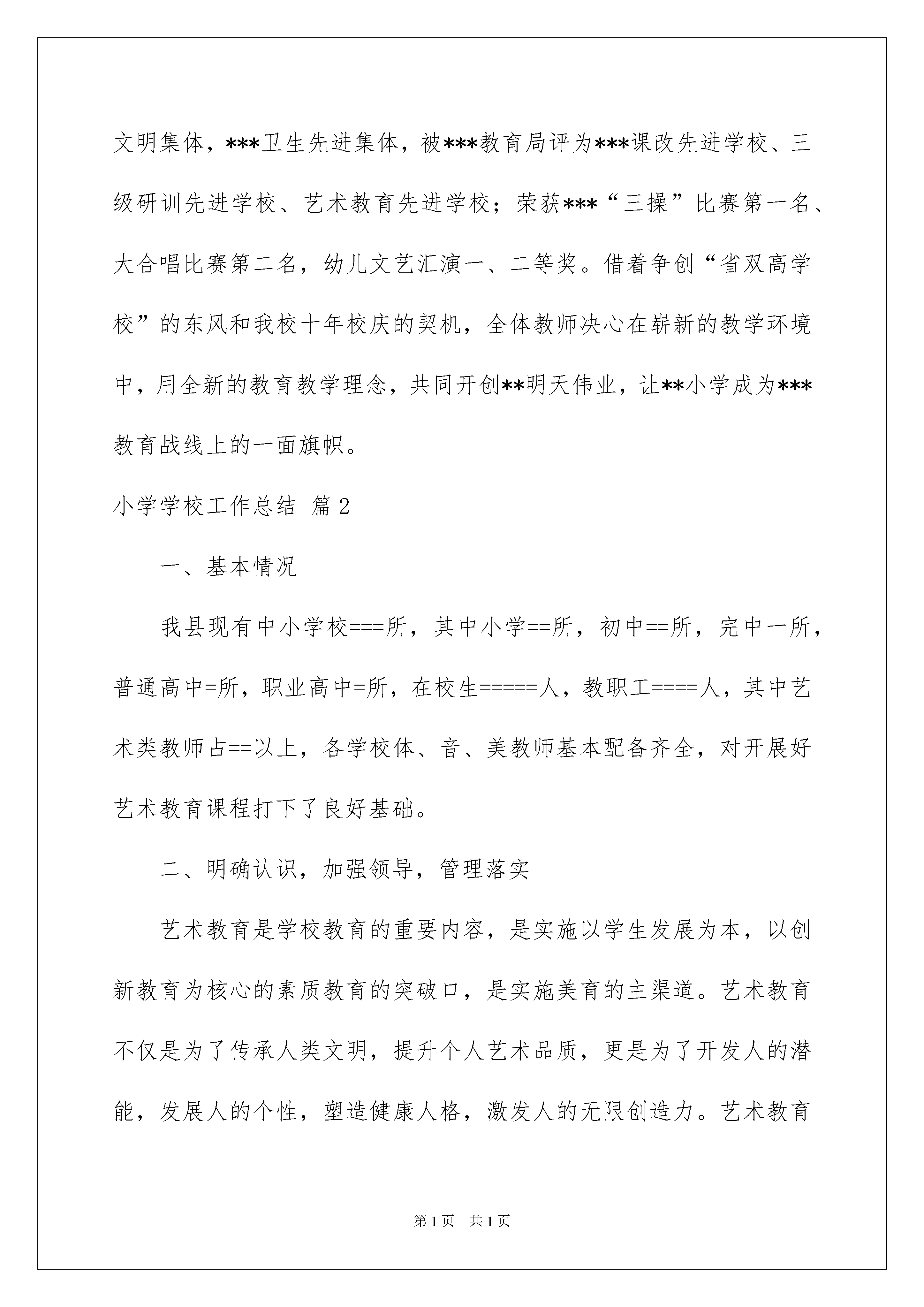 2022小学学校工作总结集合8篇小学学校工作总结集合8篇总结是把一定阶段内的有关情况分析研究,做出有指导性的经验方法以及结论的书面材料,写总结有利于我们学习和工作能力的提高,让我们一起认真地写一份总结吧。你想知道总结怎么写吗?下面是我整理的小学学校工作总结8篇,希望能够帮助到大家。小学学校工作总结篇1有一流的领导队伍,高素质的教师,再配以标准化的学校,必将加快**发展的步伐。在市教育局、财政局的大力支持下,我校于20xx年五月启动的二期工程(建筑面积3190㎡)于10月投入使用。我校领导立足发展,抓住这一机遇,进一步美化、净化校园,增加教学设备为师生创设标准化的优质环境,为教育教学提供有力保障。(1)提前运作,同步建设。校领导通盘运作,在教学楼主体竣工后,就着手策划场地改造方案,高校长利用十一黄金假亲自去外地买海盐等垫操场、检查甬道等施工质量。面貌一新的操场改善了体育教学环境,提高了学生体育活动质量。(2)增加室内设备,改善学习办公条件。学校为教室配上了10块升降黑板,为办公室配备了办公桌椅、会议桌、档案柜等,不仅改善了办公条件,也调动了教师的工作干劲。为了提高工作效率,我们还为各室按装了内部电话。(3)进行校园绿化、美化。本学期,我校针对现有条件对校园进行了绿化、美化。组织党员义务劳动,平垫了教学楼前的花坛;栽种了花草,移植了树木。校园真正实现了绿化、美化、净化。从上学期开始,陆续对楼内的厅室进行了初步的规划。重点加大艺术教育和体育卫生工作的投入,营造良好的校园文化建设氛围。我们在大厅内设置了艺术教育展板,各教室走廊内都设有班级园地,体育室和卫生也装上了工作展示板并进一步细化,让每一面墙壁都说话。力求使各部门工作规范化、科学化。伴随着校容校貌的日新月异,全校师生欢欣鼓舞、信心百倍。一年来,在教育局等上级主管部门的大力支持下,在全校师生的共同努力下,我校取得了可喜成绩。学校被评为全国双有先进集体;被评为**市教研先进单位、业训先进单位、**市绿色学校;被***政府评为精神文明集体,***卫生先进集体,被***教育局评为***课改先进学校、三级研训先进学校、艺术教育先进学校;荣获***“三操”比赛第一名、大合唱比赛第二名,幼儿文艺汇演一、二等奖。借着争创“省双高学校”的东风和我校十年校庆的契机,全体教师决心在崭新的教学环境中,用全新的教育教学理念,共同开创**明天伟业,让**小学成为***教育战线上的一面旗帜。小学学校工作总结篇2一、基本情况我县现有中小学校===所,其中小学==所,初中==所,完中一所,普通高中=所,职业高中=所,在校生=====人,教职工====人,其中艺术类教师占==以上,各学校体、音、美教师基本配备齐全,对开展好艺术教育课程打下了良好基础。二、明确认识,加强领导,管理落实艺术教育是学校教育的重要内容,是实施以学生发展为本,以创新教育为核心的素质教育的突破口,是实施美育的主渠道。艺术教育不仅是为了传承人类文明,提升个人艺术品质,更是为了开发人的潜能,发展人的个性,塑造健康人格,激发人的无限创造力。艺术教育对于促进学生的全面发展具有不可替代的作用。基于这种认识,学校把艺术教育放在学校教育的重要位置上,加强对艺术教育的领导。学校主要领导亲自过问,亲自对学校艺术教育工作进行规划和布署,亲自指导、组织学校艺术教育工作的开展,提出明确的任务和要求。从硬件建设、师资培训、课外活动等方面进行全方位指导,并狠抓检查和落实。学校还经常将艺术教育作为校长办公会和学校行政会的重要议题,就艺术教育的具体问题展开研讨和进行决策。有关领导也经常深入课堂和活动场所,检查工作,了解情况,及时解决工作中的问题。校内和社会重大的艺术活动,学校领导都亲自主持,亲自参加。对艺术特长生学校也给予全面关怀,重视其艺术特长的发展,充分发挥艺术教师和艺术特长生在艺术教育和精神文明建设中的排头兵,生力军作用。由于认识明确,领导有力,管理落实,使学校的艺术教育有了思想上、组织上和管理上的保障,艺术教育得以健康发展。三、建立和健全全面高效艺术教育组织体系全面高效的艺术教育组织体系是实现艺术教育可持续发展的首要基础,组织上保证,制度落实,管理上到位就能保证艺术教育的可持续发展。=、组织落实。学校专门成立了艺术教育领导组,分管校长担任组长,体、音、美室主任为副组长,它包含了学校各个管理层面,不留管理空隙,全方位、立体式推进学校艺术教育。=、形成制度,管理到位。教务处要求有关科目教师积极渗透艺术教育,具体落实在教学计划、教案中,并进行艺术教育教案的教学常规检查,把有没有渗透艺术教育内容作为评选优秀教案重要标准。