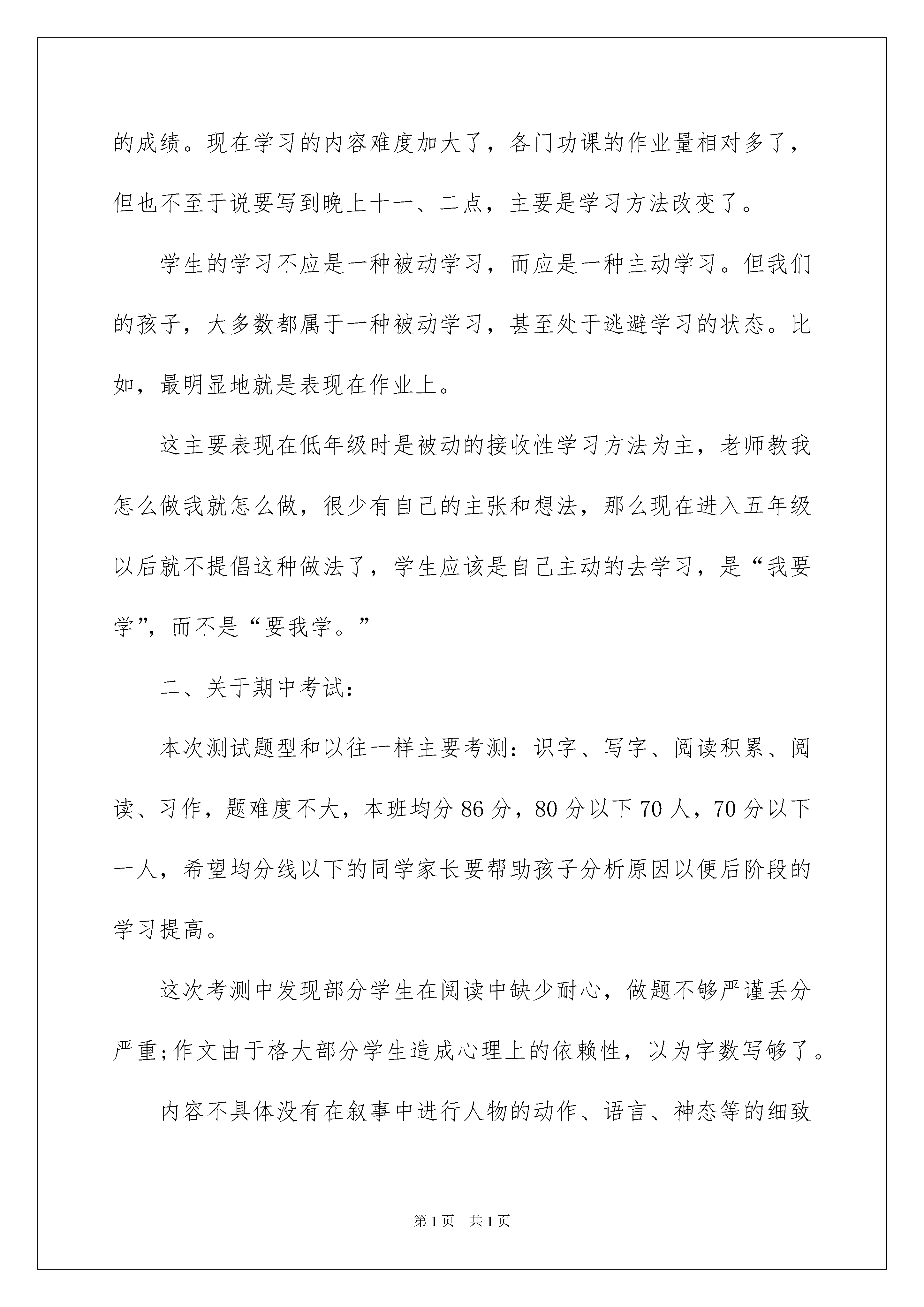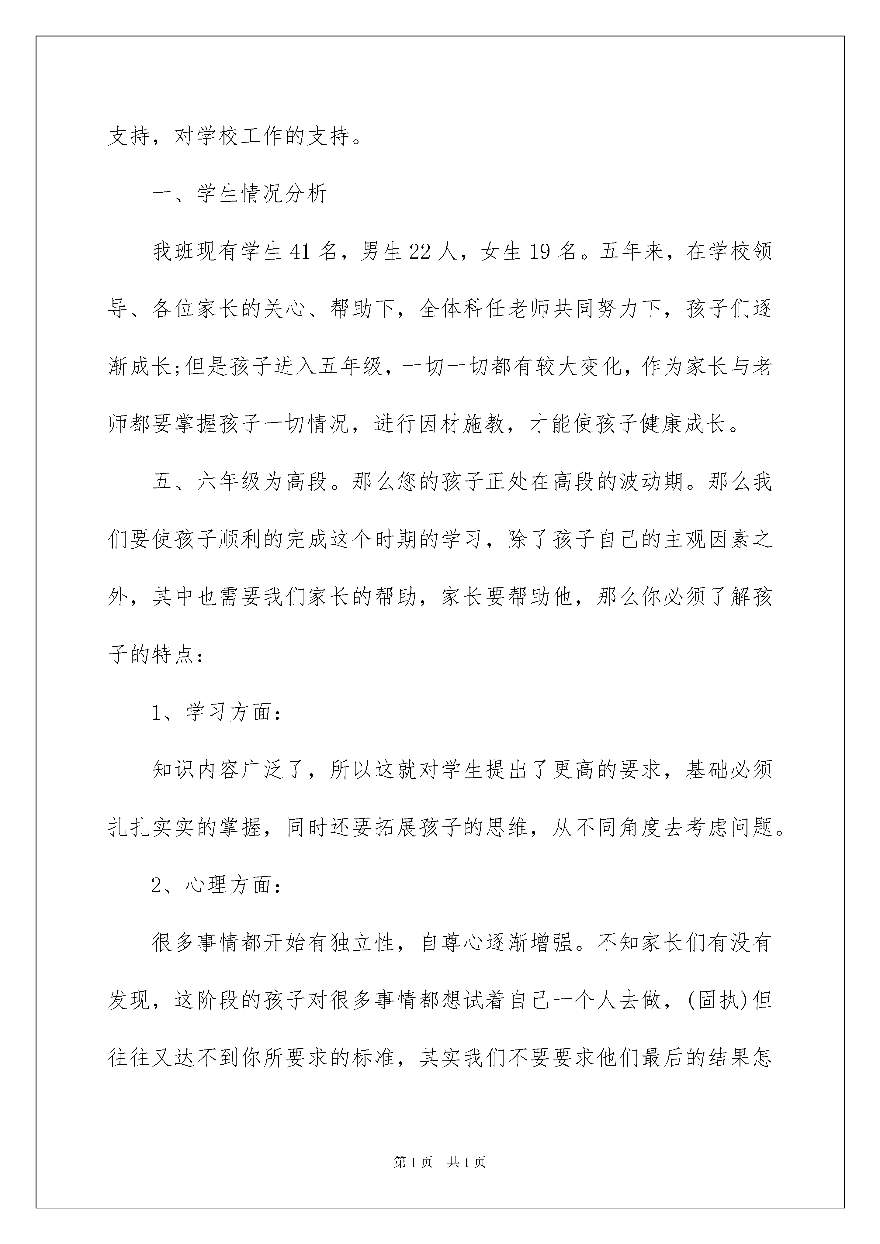 2022小学家长会班主任发言稿(15篇)小学家长会班主任发言稿(15篇)在学习、工作生活中,发言稿与我们的生活息息相关,发言稿可以起到整理演讲者的思路、提示演讲的内容、限定演讲的速度的作用。那么发言稿一般是怎么写的呢?下面是我精心整理的小学家长会班主任发言稿,欢迎阅读,希望大家能够喜欢。小学家长会班主任发言稿1各位家长:大家好!首先,请允许我代表学校所有老师和全体同学们向各位家长的到来表示热烈的欢迎和衷心的感谢。感谢你们对学校工作的支持和对我们班学生的关心和爱护。孩子入学一晃已经五年级了,因为共同的目的,我们才有这样的机会坐在一起,共同地讨论和交流一些关于我们孩子的学习和生活,作为孩子的班主任,在交流之前我想先以我个人的名义,向今天所有到来的或者没有到来的家长表达我深深的谢意,感谢大家对我工作的支持,对学校工作的支持。一、学生情况分析我班现有学生41名,男生22人,女生19名。五年来,在学校领导、各位家长的关心、帮助下,全体科任老师共同努力下,孩子们逐渐成长;但是孩子进入五年级,一切一切都有较大变化,作为家长与老师都要掌握孩子一切情况,进行因材施教,才能使孩子健康成长。五、六年级为高段。那么您的孩子正处在高段的波动期。那么我们要使孩子顺利的完成这个时期的学习,除了孩子自己的主观因素之外,其中也需要我们家长的帮助,家长要帮助他,那么你必须了解孩子的特点:1、学习方面:知识内容广泛了,所以这就对学生提出了更高的要求,基础必须扎扎实实的掌握,同时还要拓展孩子的思维,从不同角度去考虑问题。2、心理方面:很多事情都开始有独立性,自尊心逐渐增强。不知家长们有没有发现,这阶段的孩子对很多事情都想试着自己一个人去做,(固执)但往往又达不到你所要求的标准,其实我们不要要求他们最后的结果怎样,首先就是要答应他们的要求,同意让孩子自己试试。另外,家长还要把握好批评的尺度,这阶段的孩子自尊心逐渐增强,也就是我们通常在讲的孩子知道怕“丢面子”了,所以各位家长在教育孩子的时候要把握好尺度。3、思想意识:思想从单纯走向复杂,也就是说想的事情多了,开始有自己意向,自己有自己的打算,想干什么就干什么,也就是有些家长在说的:“我们孩子很强,不听我们家长的话了。”但是他们的辨别力弱。不能把社会上的是是非非搞清楚,也不完全理解到底哪些事可以做,哪些事不能做,这也就需要家长经常给孩子一些指示和告诫,经常提醒他什么该做,什么不该做,给他明确的方向,但需要的是大人的“口风”必须一致。不要爸爸妈妈这么说,爷爷奶奶却是那么说,这样孩子就更辨别不清楚了。4、学习难度说到学习在座的家长都深有体会。现在的孩子越来越不好辅导了。在一二年级时,有的学生在课堂上不注意听讲,回家以后,家长在家里帮助他们记记生字,背背课文,到考试的时候还是能考到比较满意的成绩。现在学习的内容难度加大了,各门功课的作业量相对多了,但也不至于说要写到晚上十一、二点,主要是学习方法改变了。学生的学习不应是一种被动学习,而应是一种主动学习。但我们的孩子,大多数都属于一种被动学习,甚至处于逃避学习的状态。比如,最明显地就是表现在作业上。这主要表现在低年级时是被动的接收性学习方法为主,老师教我怎么做我就怎么做,很少有自己的主张和想法,那么现在进入五年级以后就不提倡这种做法了,学生应该是自己主动的去学习,是“我要学”,而不是“要我学。”二、关于期中考试:本次测试题型和以往一样主要考测:识字、写字、阅读积累、阅读、习作,题难度不大,本班均分86分,80分以下70人,70分以下一人,希望均分线以下的同学家长要帮助孩子分析原因以便后阶段的学习提高。这次考测中发现部分学生在阅读中缺少耐心,做题不够严谨丢分严重;作文由于格大部分学生造成心理上的依赖性,以为字数写够了。内容不具体没有在叙事中进行人物的动作、语言、神态等的细致描写。比如写骑自行车得到的启示,一骑上自行车就学会了,没有具体写怎么骑的动作、怎么学的过程。三、目前班级存在问题:1、不能静下心来学习、思考。问题最严重表现在今年正值孩子12岁生日,给孩子举办庆典的家长很多,现在国家提倡勤俭节约特别是废除不必要的大操大办,尤其是贺大学、庆生。由于开学以来庆生的居多,造成孩子们每星期这家酒店出、那家酒店进,忙于应酬、热闹不停。致使学习浮躁不能静心学习。每周一的作业完成质量不高影响了学习。班内学习气氛不浓,课下议论如何过生的挺多,穿什么衣服、买什么礼物请谁。还有甚者说谁是谁女朋友等等影响学习、正常友谊的言论。2、缺少动手、思维的实践能力当今社会,竞争日益激烈,要想在社会上立足就得有多方面的才能,特别是参与社会的实践能力,而我班同