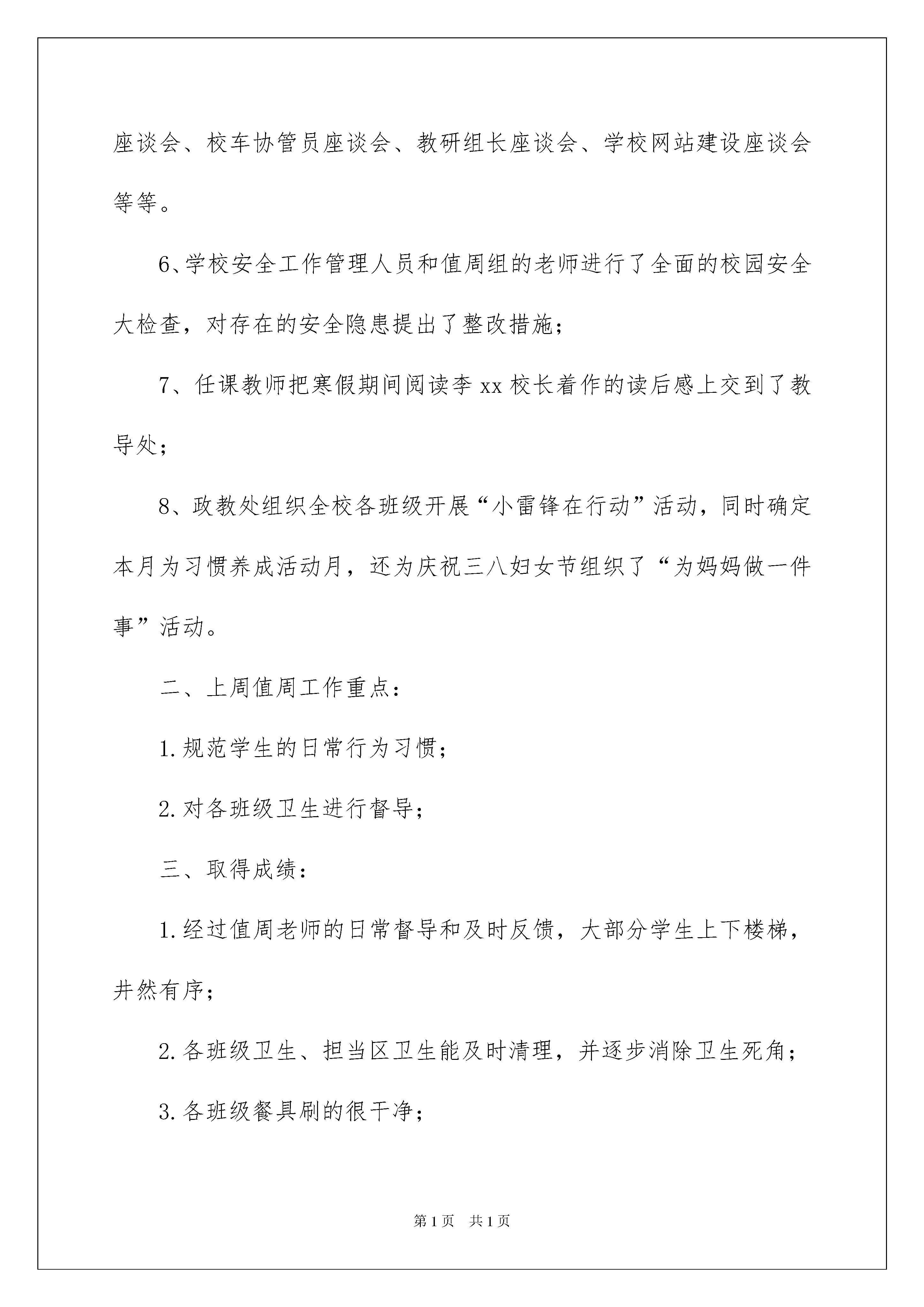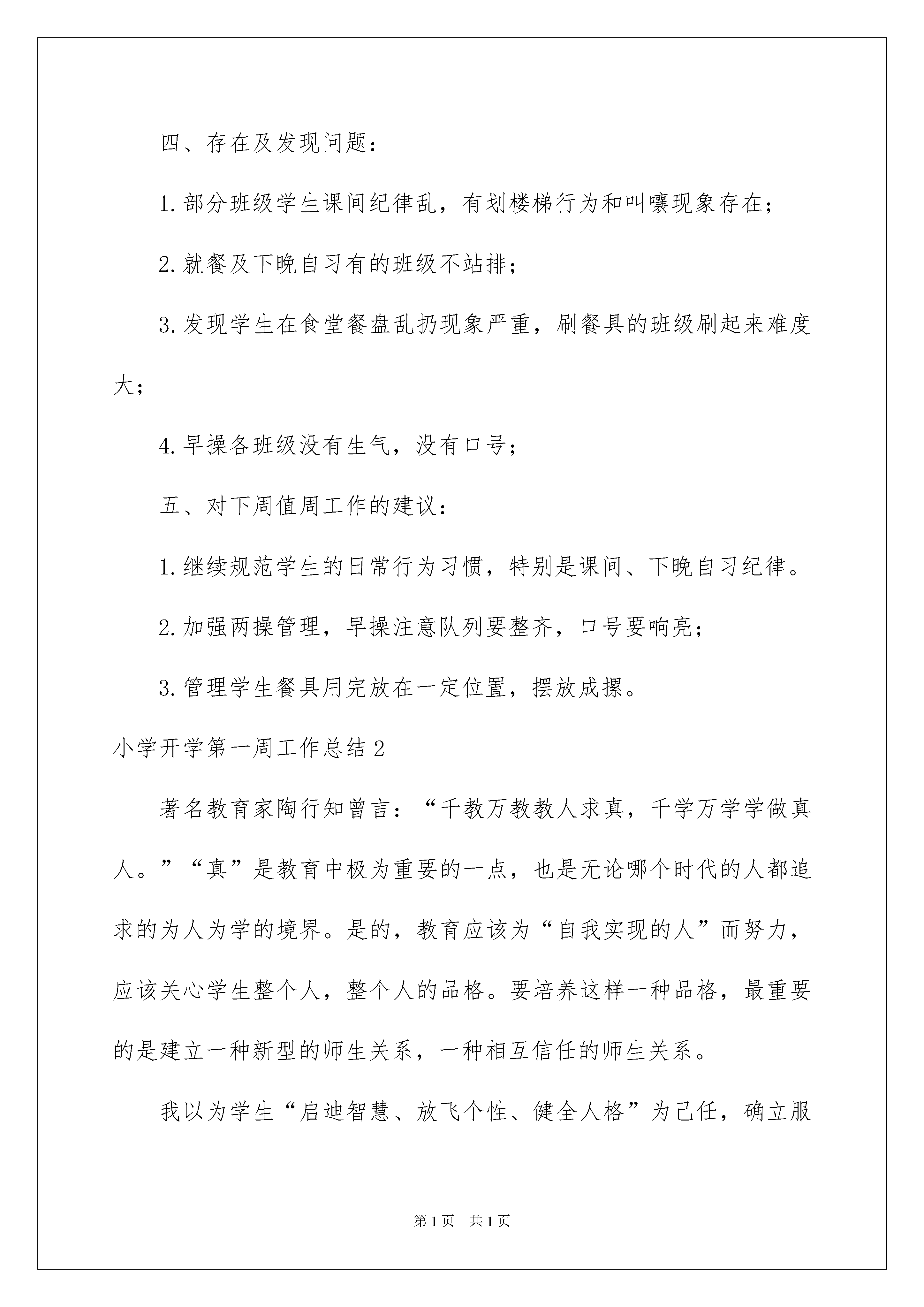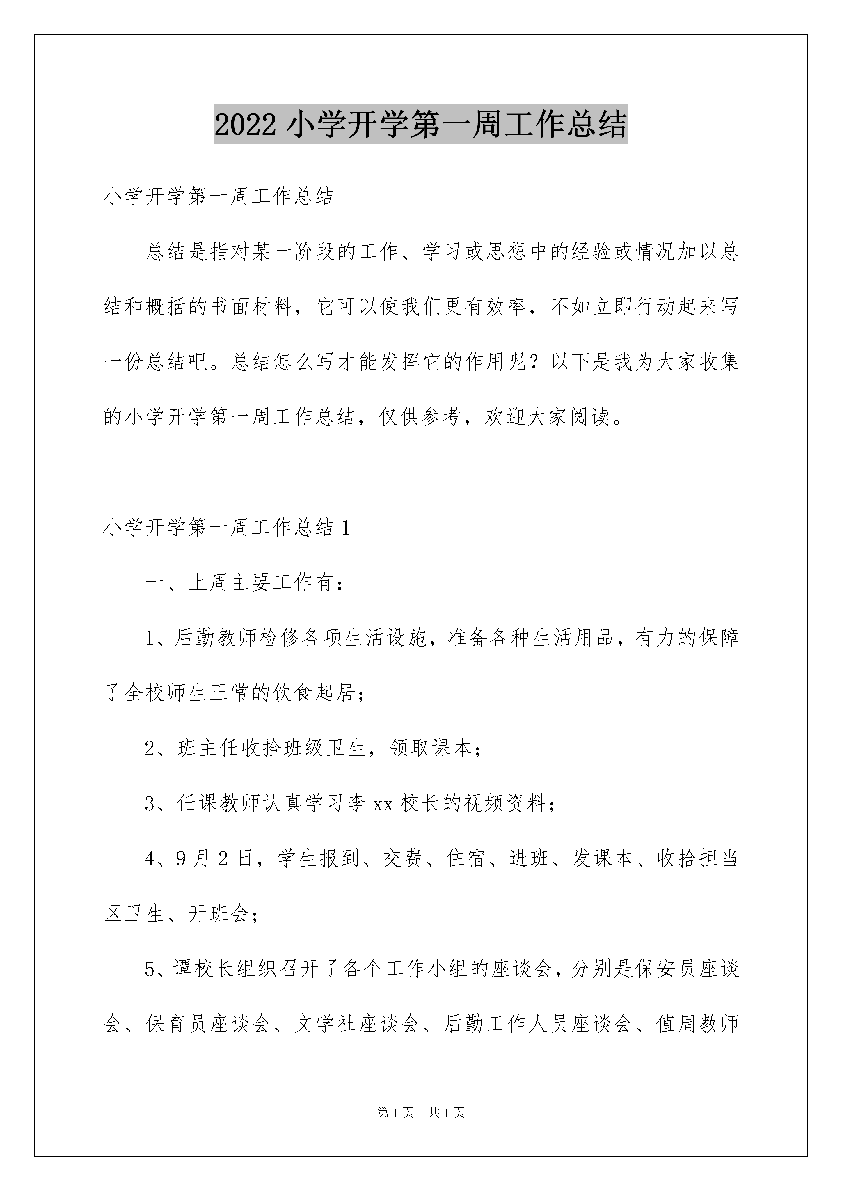 2022小学开学第一周工作总结小学开学第一周工作总结总结是指对某一阶段的工作、学习或思想中的经验或情况加以总结和概括的书面材料,它可以使我们更有效率,不如立即行动起来写一份总结吧。总结怎么写才能发挥它的作用呢?以下是我为大家收集的小学开学第一周工作总结,仅供参考,欢迎大家阅读。小学开学第一周工作总结1一、上周主要工作有:1、后勤教师检修各项生活设施,准备各种生活用品,有力的保障了全校师生正常的饮食起居;2、班主任收拾班级卫生,领取课本;3、任课教师认真学习李xx校长的视频资料;4、9月2日,学生报到、交费、住宿、进班、发课本、收拾担当区卫生、开班会;5、谭校长组织召开了各个工作小组的座谈会,分别是保安员座谈会、保育员座谈会、文学社座谈会、后勤工作人员座谈会、值周教师座谈会、校车协管员座谈会、教研组长座谈会、学校网站建设座谈会等等。6、学校安全工作管理人员和值周组的老师进行了全面的校园安全大检查,对存在的安全隐患提出了整改措施;7、任课教师把寒假期间阅读李xx校长着作的读后感上交到了教导处;8、政教处组织全校各班级开展“小雷锋在行动”活动,同时确定本月为习惯养成活动月,还为庆祝三八妇女节组织了“为妈妈做一件事”活动。二、上周值周工作重点:1.规范学生的日常行为习惯;2.对各班级卫生进行督导;三、取得成绩:1.经过值周老师的日常督导和及时反馈,大部分学生上下楼梯,井然有序;2.各班级卫生、担当区卫生能及时清理,并逐步消除卫生死角;3.各班级餐具刷的很干净;四、存在及发现问题:1.部分班级学生课间纪律乱,有划楼梯行为和叫嚷现象存在;2.就餐及下晚自习有的班级不站排;3.发现学生在食堂餐盘乱扔现象严重,刷餐具的班级刷起来难度大;4.早操各班级没有生气,没有口号;五、对下周值周工作的建议:1.继续规范学生的日常行为习惯,特别是课间、下晚自习纪律。2.加强两操管理,早操注意队列要整齐,口号要响亮;3.管理学生餐具用完放在一定位置,摆放成摞。小学开学第一周工作总结2著名教育家陶行知曾言:“千教万教教人求真,千学万学学做真人。”“真”是教育中极为重要的一点,也是无论哪个时代的人都追求的为人为学的境界。是的,教育应该为“自我实现的人”而努力,应该关心学生整个人,整个人的品格。要培养这样一种品格,最重要的是建立一种新型的师生关系,一种相互信任的师生关系。我以为学生“启迪智慧、放飞个性、健全人格”为己任,确立服务观念,不仅把学生看作是教育对象,而且把他们视为服务对象,为他们的健康成长服务。其次我倡导尊重观念,尊重学生的选择,尊重学生的个性,尊重不同的声音,尊重不同的需要。有了服务和尊重的意识,教师对待学生的态度就会有所改变,教师的教育方式也会有所变革。在教育过程中,我不干预学生的思想,只起一个组织者的作用,学生自己表达,自己指导,自己评价,自己创造,自己选择。“成功的教育就在于学生学会了自我表现和自我英择。”为了搞好六年级的班主任工作我做了以下工作|:一、亲近学生,研究学生;展现自我,树立威望。二、组建和培养班干部队伍。定期召开班干部会议,明确各自的职责。三、以强化常规训练带动教育教学工作。训练的内容包括《小学生守则》和《小学生日常行为规范》要求的常规、课堂常规、集会和出操常规、卫生常规、劳动常规、参观常规以及路队常规等等诸多方面。训练可以通过集体或个人、单项强化或全面优化相结合的方式进行(根据具体情况选择),务必使每个学生具有服从集体,服从命令的思想,具有自我约束力,形成习惯,保证整个班集体随时表现出活而不乱,严而不死的良好班风班貌。四、激发学生竞争意识及其途径。竞争是一股巨大的、潜在的、其它任何外力都不可能达到或代替的动力。班主任应在班内掀起激烈的、持久的竞争活动。必须强调,这是互助、友好的竞争而不是敌视和保守的竞争,其目的是为了取得共同的、更大的进步。1、激发与外班学生的竞争意识:2、设立班级量化管理制度:以班管理制度和周评表、周学习明星等相对固定的评价模式,对学生个人和小组的各种表现每周评价,使每个学生和小组明确近期优缺点何在,在班上居何位置,从而增强警惕性和进取心。3、奖励和批评:奖励与批评的方式各种各样,目的都是鼓励先进、指出缺点、激励所有学生争取更大的成绩。奖励比批评的教育效果更明显。4、重视主题班会与主题队会的开展。协调与科任老师和家长的关系,建立丰富的信息网络。5、培养学生的个性特长和创造能力。五、爱学生。爱是教育的桥梁,是教育的推动力,是后进生转变的催化剂;爱是成功的基础,是力量的源泉。这种爱是博大无私的爱,它包涵了崇高的使命感和责任感。诚如一位哲人所说:教师的爱能使犯了错