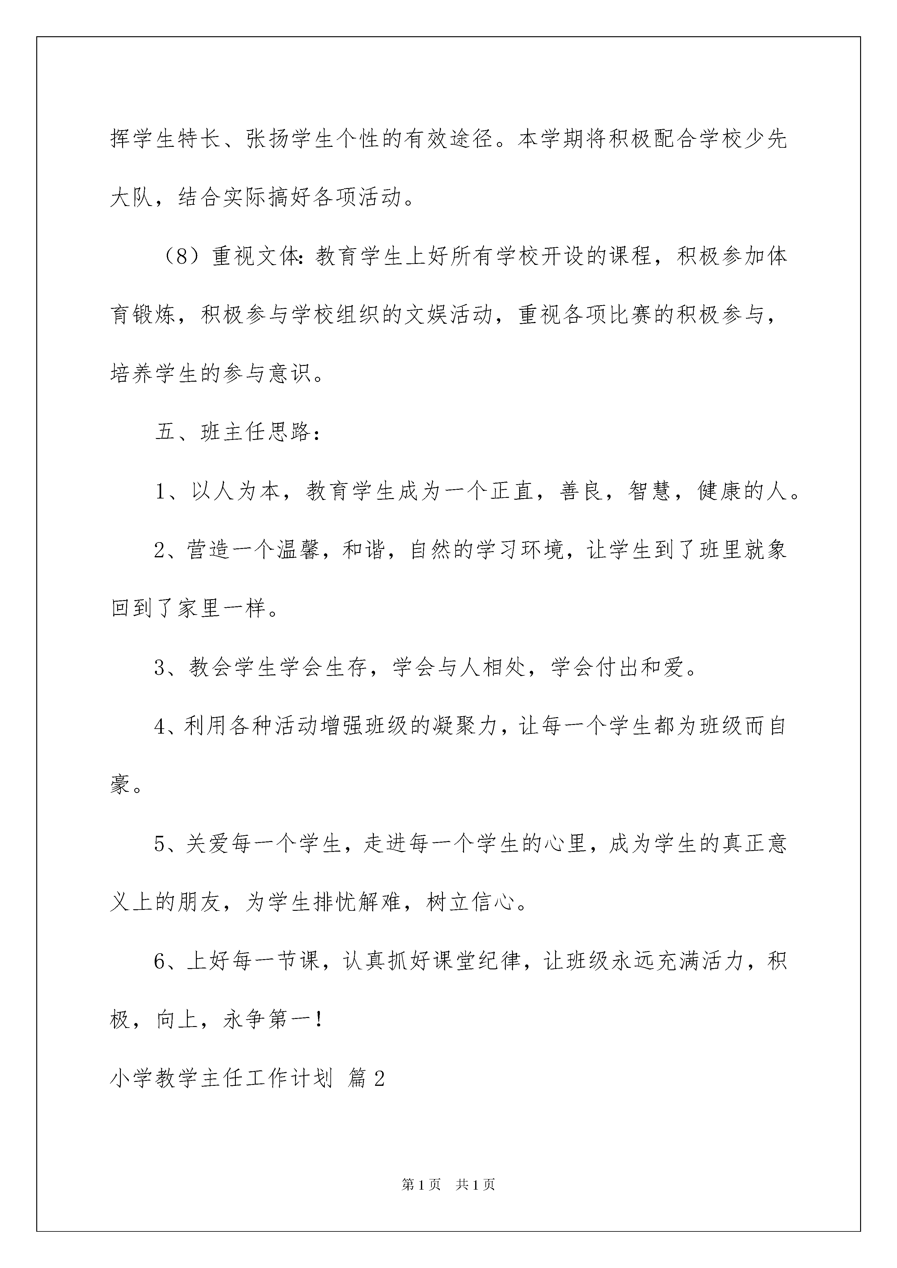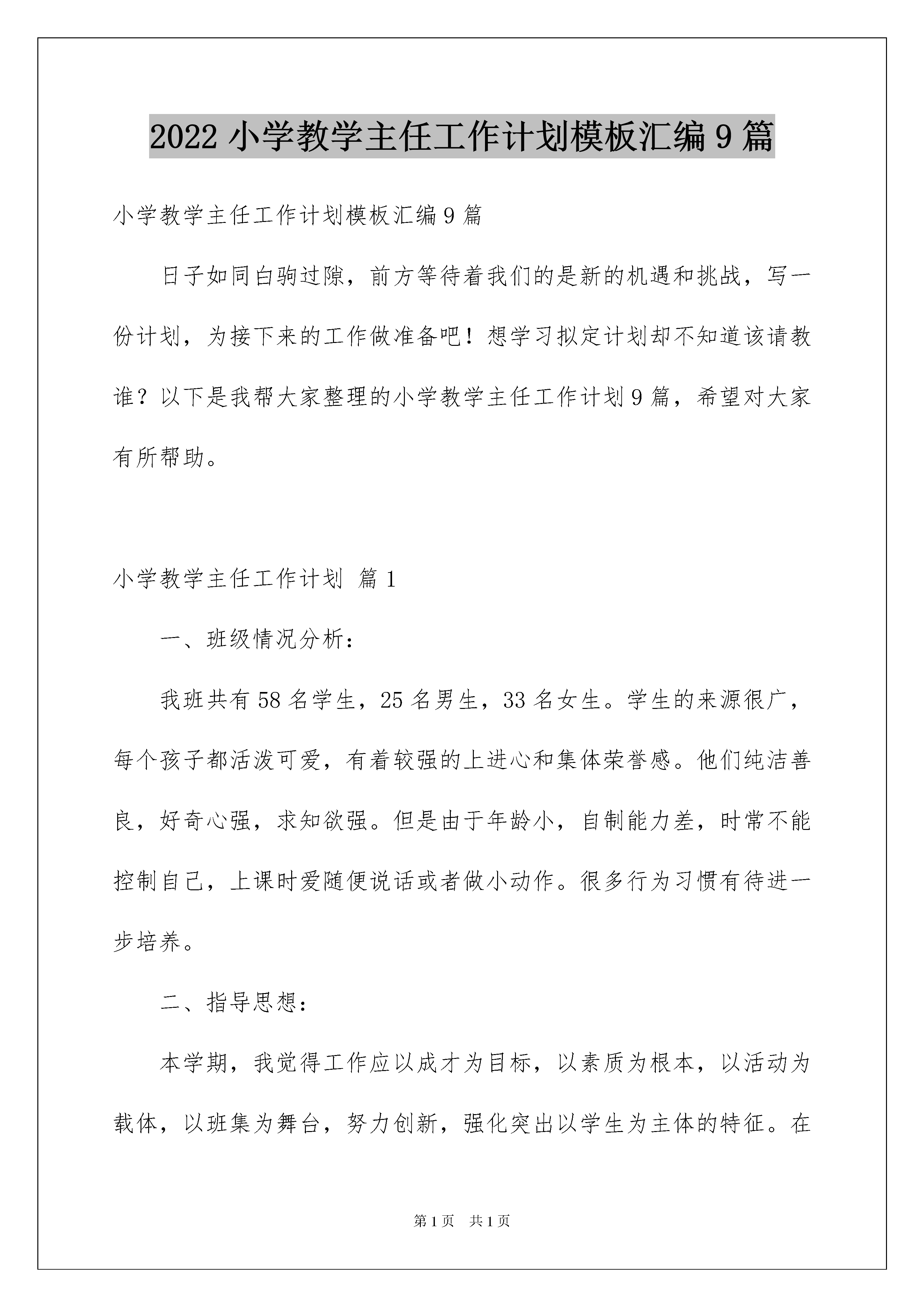 2022小学教学主任工作计划模板汇编9篇小学教学主任工作计划模板汇编9篇日子如同白驹过隙,前方等待着我们的是新的机遇和挑战,写一份计划,为接下来的工作做准备吧!想学习拟定计划却不知道该请教谁?以下是我帮大家整理的小学教学主任工作计划9篇,希望对大家有所帮助。小学教学主任工作计划篇1一、班级情况分析:我班共有58名学生,25名男生,33名女生。学生的来源很广,每个孩子都活泼可爱,有着较强的上进心和集体荣誉感。他们纯洁善良,好奇心强,求知欲强。但是由于年龄小,自制能力差,时常不能控制自己,上课时爱随便说话或者做小动作。很多行为习惯有待进一步培养。二、指导思想:本学期,我觉得工作应以成才为目标,以素质为根本,以活动为载体,以班集为舞台,努力创新,强化突出以学生为主体的特征。在新学期里形成一个良好的班级氛围,让学生在愉快的环境中轻松地学习,有效地培养学生的学习兴趣;培养学生的合作意识和人际交往能力;逐步形成开朗、乐观、愉快的性格;使学生具有一定的恒心,责任心和自控能力;使他们每人都有良好的思想道德素质。并且在期末都能打个漂亮仗。三、探索的实验课题:语文教学与阅读四、采取的措施:1。重视养成教育:养成良好的学习习惯和生活习惯,对学生的成长进步是十分必要的,良好的行为习惯使一个人的终生发展受益非浅。因此,在班级进行良好品德的养成教育是十分必要的。2、根据学生的思想实际情况,与学校的德育密切配合,本学期,将从不同的方面和角度对学生进行规律性的常规训练。(1)重点落实好《小学生日常行为规范》,使学生逐步形成良好的道德品质,行为习惯,学习习惯和积极的学习态度,不使一个学生掉队。(2)加强后进生管理:面向全体学生,分类施教,加强对后进生的辅导,要从关心、爱护学生的角度出发,了解关心学生。及时了解学生的心理变化,掌握他们成长道路上的发展情况。(3)及时了解学情:准确把握学生对知识的掌握,因材施教,在重点难点上下工夫,以促进全班成绩的平稳、扎实地上升。(4)家教结合:经常保持与否学生家长联系,使学校教育和家庭教育有机地结合起来,本学期,力争把所有的家长走访一次,甚至多次。要不厌其烦的做好后进生的转化,抓两头,促中间,使全班形成一盘棋,真正成为一个团结向上的班集体。(5)培养班级干部:及时召开班干部会议,针对他们在中出现的问题,教给他们方法,使他们明确自己的职责,指出他们的优缺点和今后努力的方向。同时,还要求他们注意班干部成员之间的合作,齐心协力,拧成一股绳,尽力在同学之间树立他们的威信,创造机会,锻炼和培养他们的能力。(6)重视关怀教育:要关心学生的生活,及时和家长联系,体贴他们的冷暖,了解他们的心理,建立平等和谐的师生关系,做学生的知心朋友,以使班主任做的更好。(7)抓好少先队:班级的一个重要部分,就是班主任,是充分发挥学生特长、张扬学生个性的有效途径。本学期将积极配合学校少先大队,结合实际搞好各项活动。(8)重视文体:教育学生上好所有学校开设的课程,积极参加体育锻炼,积极参与学校组织的文娱活动,重视各项比赛的积极参与,培养学生的参与意识。五、班主任思路:1、以人为本,教育学生成为一个正直,善良,智慧,健康的人。2、营造一个温馨,和谐,自然的学习环境,让学生到了班里就象回到了家里一样。3、教会学生学会生存,学会与人相处,学会付出和爱。4、利用各种活动增强班级的凝聚力,让每一个学生都为班级而自豪。5、关爱每一个学生,走进每一个学生的心里,成为学生的真正意义上的朋友,为学生排忧解难,树立信心。6、上好每一节课,认真抓好课堂纪律,让班级永远充满活力,积极,向上,永争第一!小学教学主任工作计划篇2这学期我继续担任五(2)班的班主任。在上一学期的工作中,我学习了很多,也了解了许多自己的不足之处。这学期,我将努力做好班主任工作,从孩子的实际情况出发,汲取上学期的经验,从细节入手,全面抓好班级管理工作,努力提高学生知识水平和道德素质。一、班级情况分析:经过上学期的学习,孩子们已经熟悉了学校的日常生活和学习,对各项常规也已经不再陌生,对于老师的要求孩子们也能够理解和执行。大多数孩子也有了初步的学习意识,能够按时的完成作业,维护班级纪律,大胆参与学校班级的事情,可塑性极强。可是也有一部分孩子的行为习惯不良,学习意识不足,还需要花大力气在这部分孩子身上,希望在这学期的的悉心教育下,他们会有所转变。二、班集体的目标:每天进步一点点。三、常规教育方面为了使学生能够及早进入角色,适应学校的生活,这就要班主任在日常生活中能有序的引导,并且内容要近一点,小一点,实一点,时时处处向学生进行有针对性的常规教育。因此,我决定从以