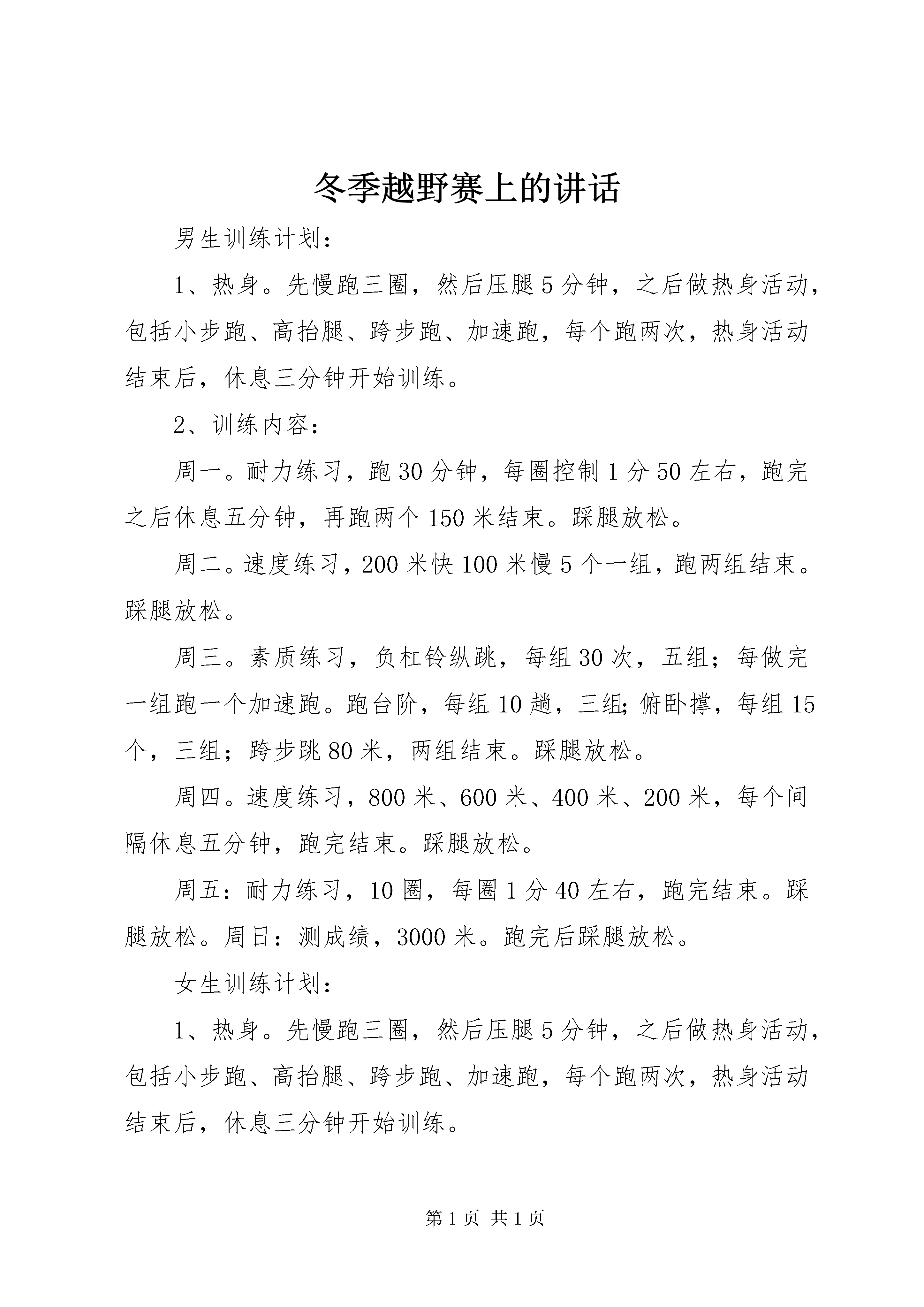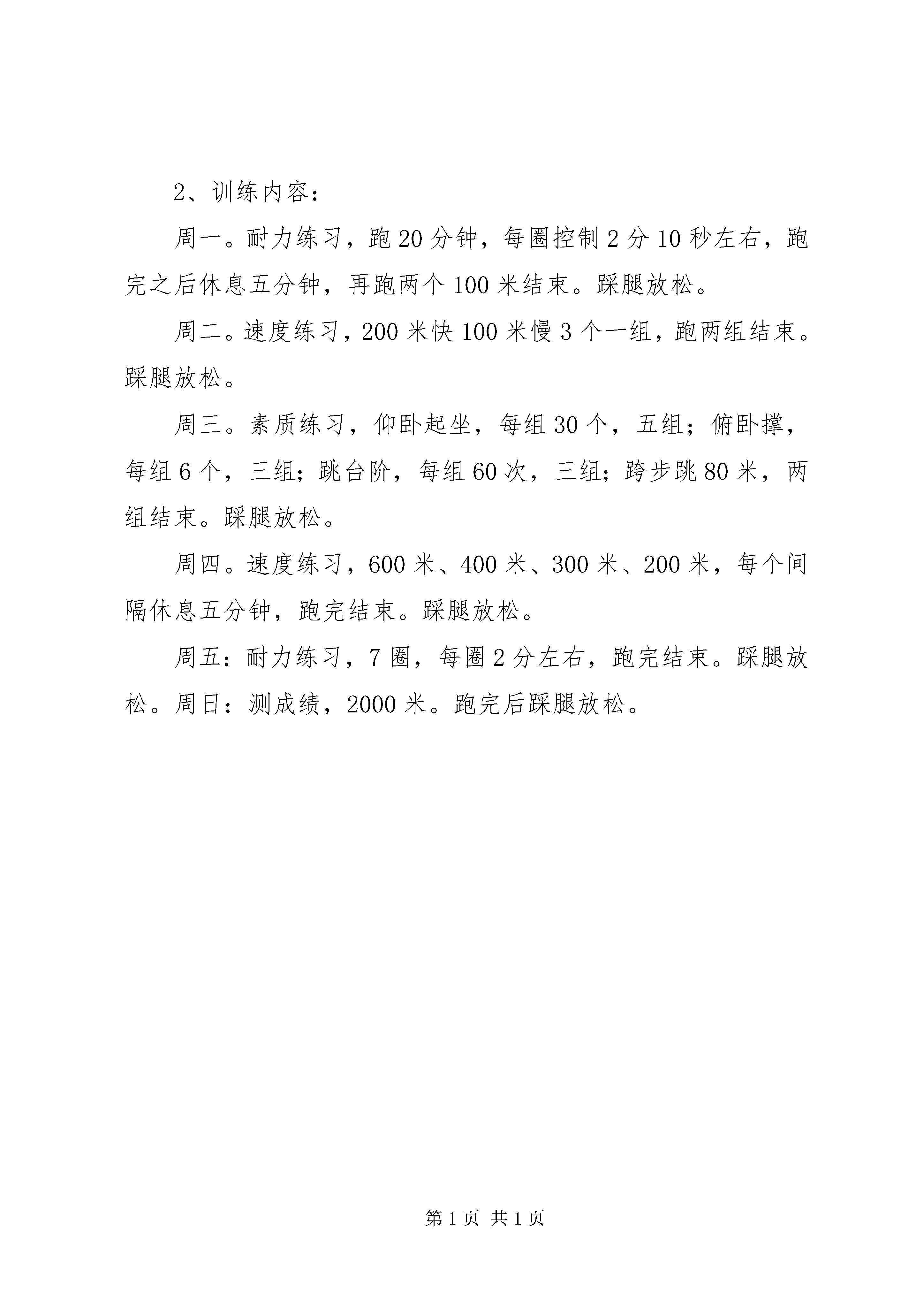 冬季越野赛上的讲话男生训练计划:1、热身。先慢跑三圈,然后压腿5分钟,之后做热身活动,包括小步跑、高抬腿、跨步跑、加速跑,每个跑两次,热身活动结束后,休息三分钟开始训练。2、训练内容:周一。耐力练习,跑30分钟,每圈控制1分50左右,跑完之后休息五分钟,再跑两个150米结束。踩腿放松。周二。速度练习,200米快100米慢5个一组,跑两组结束。踩腿放松。周三。素质练习,负杠铃纵跳,每组30次,五组;每做完一组跑一个加速跑。跑台阶,每组10趟,三组;俯卧撑,每组15个,三组;跨步跳80米,两组结束。踩腿放松。周四。速度练习,800米、600米、400米、200米,每个间隔休息五分钟,跑完结束。踩腿放松。周五:耐力练习,10圈,每圈1分40左右,跑完结束。踩腿放松。周日:测成绩,3000米。跑完后踩腿放松。女生训练计划:1、热身。先慢跑三圈,然后压腿5分钟,之后做热身活动,包括小步跑、高抬腿、跨步跑、加速跑,每个跑两次,热身活动结束后,休息三分钟开始训练。2、训练内容:周一。耐力练习,跑20分钟,每圈控制2分10秒左右,跑完之后休息五分钟,再跑两个100米结束。踩腿放松。周二。速度练习,200米快100米慢3个一组,跑两组结束。踩腿放松。周三。素质练习,仰卧起坐,每组30个,五组;俯卧撑,每组6个,三组;跳台阶,每组60次,三组;跨步跳80米,两组结束。踩腿放松。周四。速度练习,600米、400米、300米、200米,每个间隔休息五分钟,跑完结束。踩腿放松。周五:耐力练习,7圈,每圈2分左右,跑完结束。踩腿放松。周日:测成绩,2000米。跑完后踩腿放松。