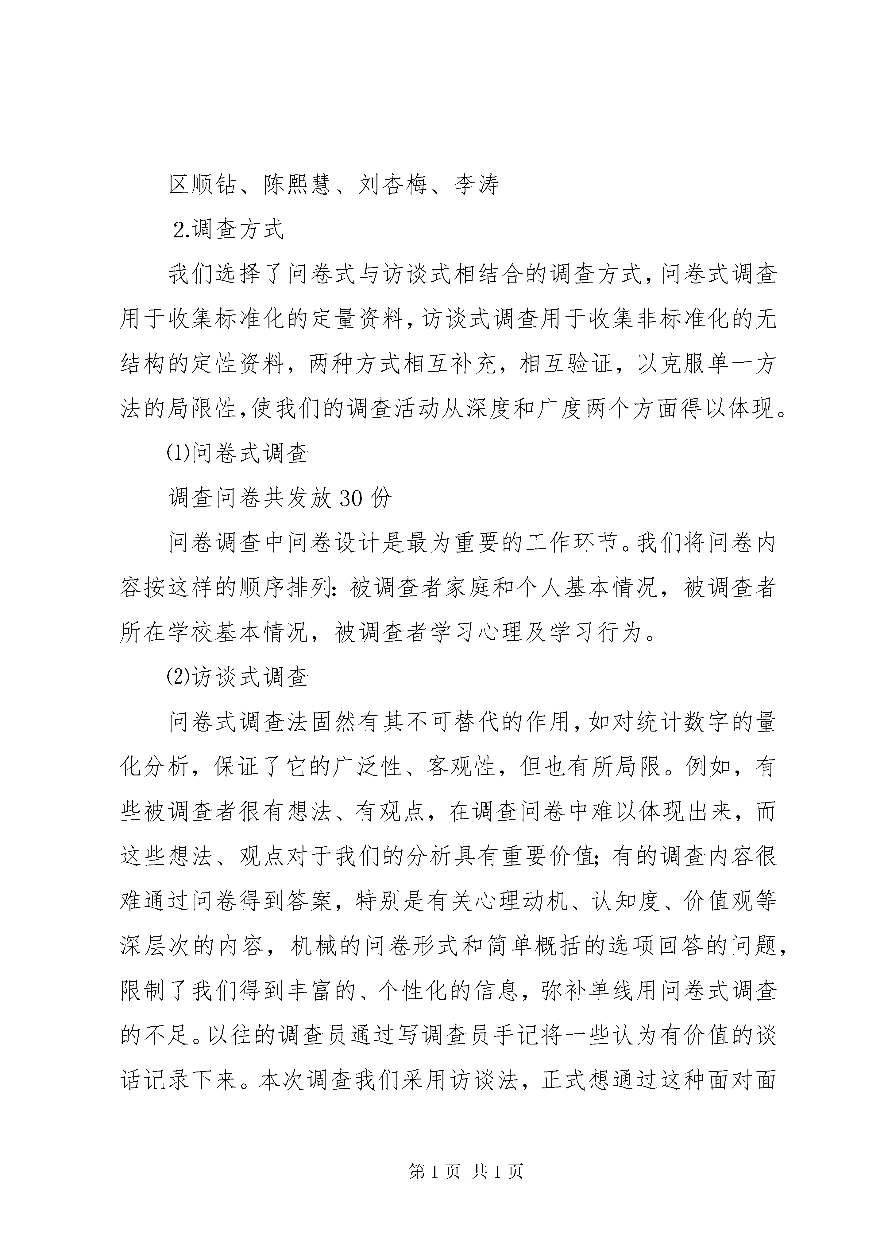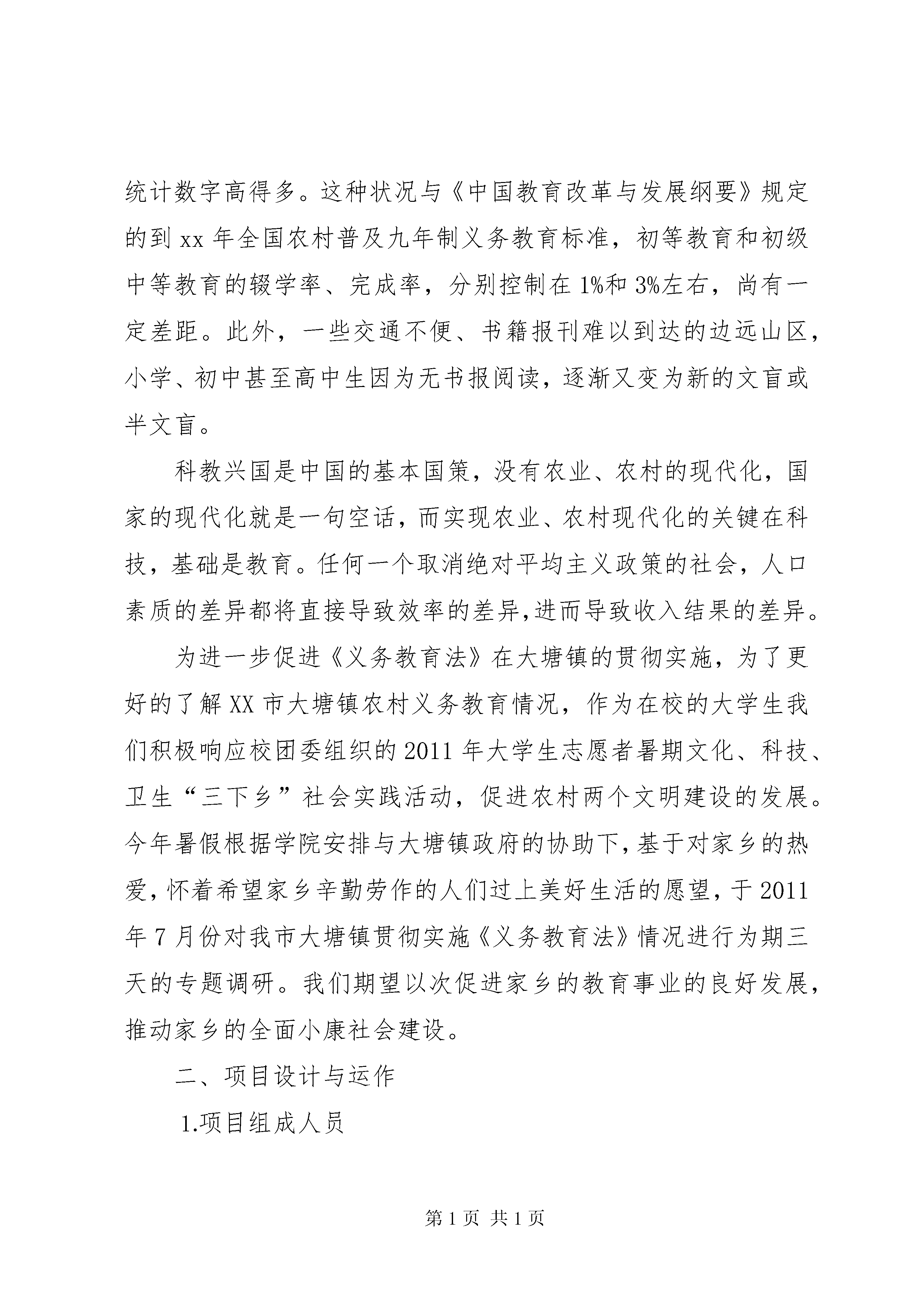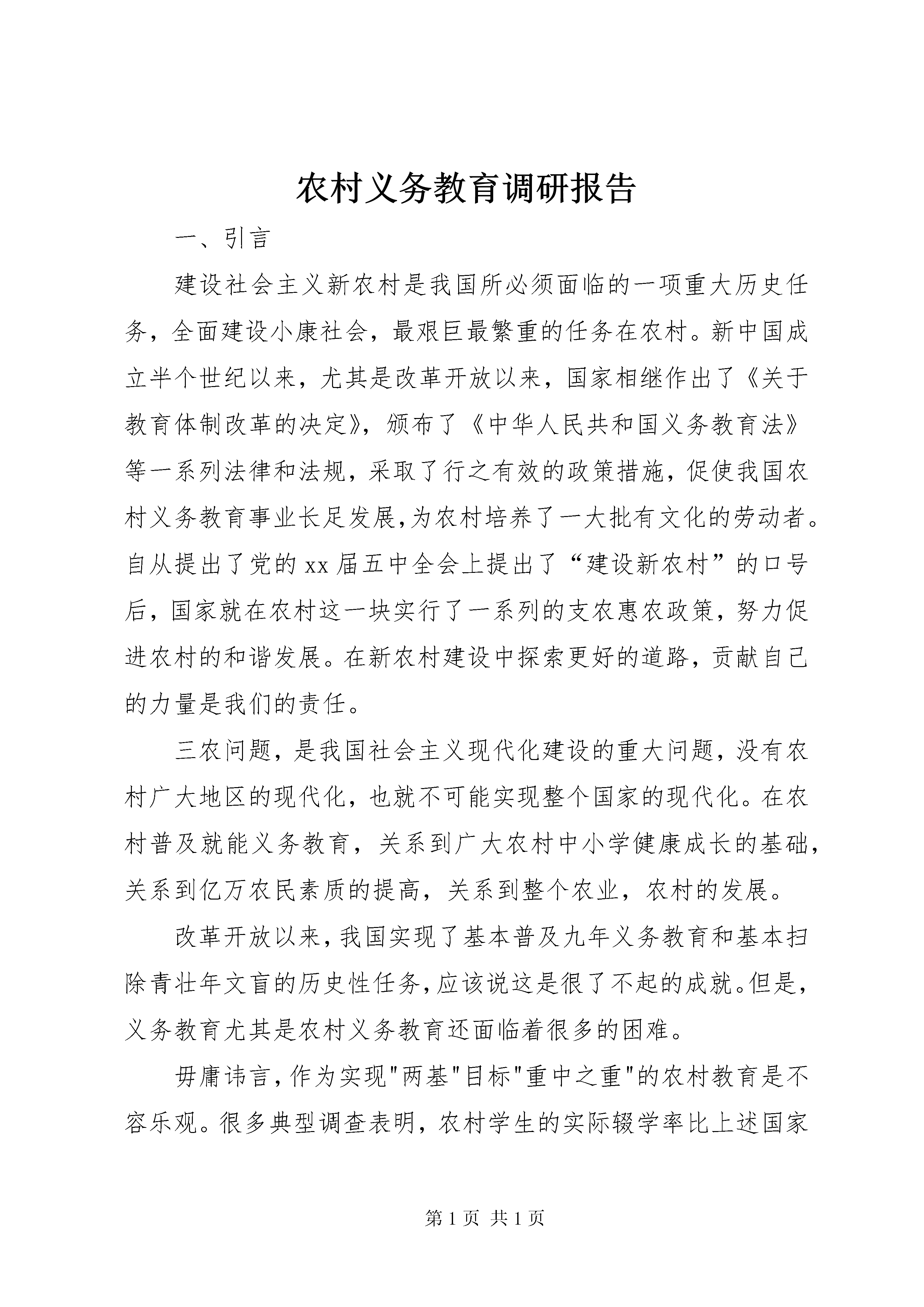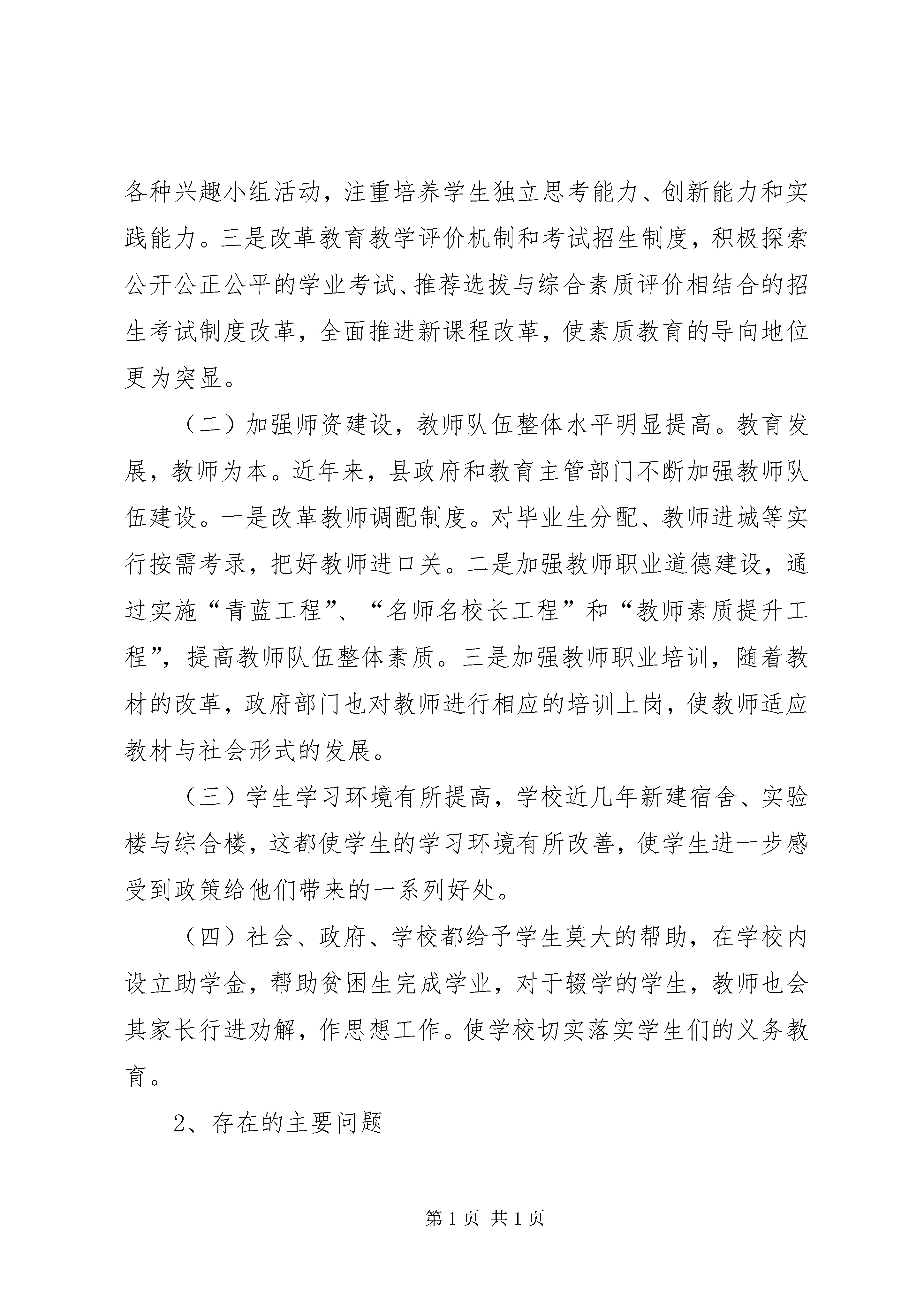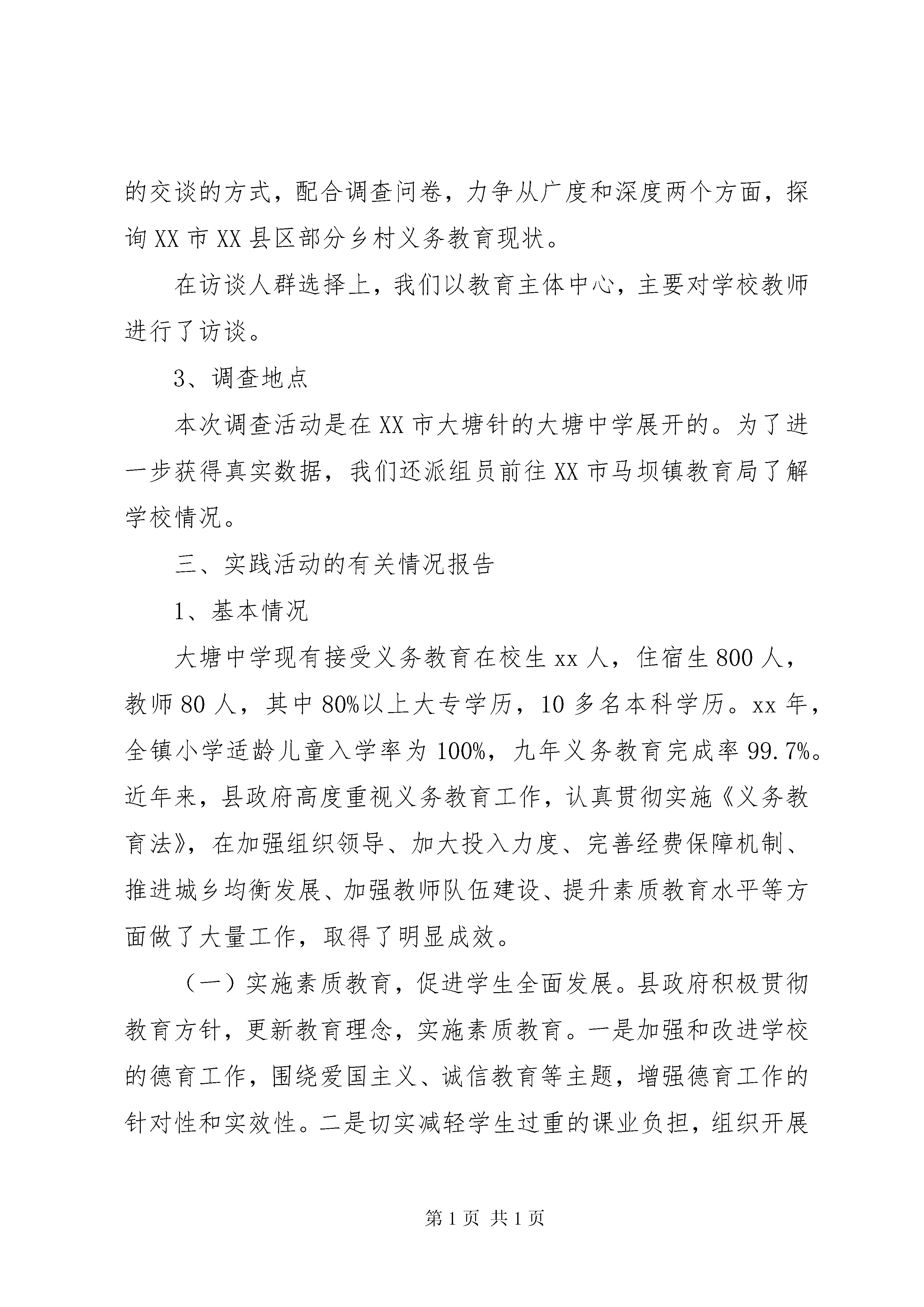 农村义务教育调研报告一、引言建设社会主义新农村是我国所必须面临的一项重大历史任务,全面建设小康社会,最艰巨最繁重的任务在农村。新中国成立半个世纪以来,尤其是改革开放以来,国家相继作出了《关于教育体制改革的决定》,颁布了《中华人民共和国义务教育法》等一系列法律和法规,采取了行之有效的政策措施,促使我国农村义务教育事业长足发展,为农村培养了一大批有文化的劳动者。自从提出了党的xx届五中全会上提出了“建设新农村”的口号后,国家就在农村这一块实行了一系列的支农惠农政策,努力促进农村的和谐发展。在新农村建设中探索更好的道路,贡献自己的力量是我们的责任。三农问题,是我国社会主义现代化建设的重大问题,没有农村广大地区的现代化,也就不可能实现整个国家的现代化。在农村普及就能义务教育,关系到广大农村中小学健康成长的基础,关系到亿万农民素质的提高,关系到整个农业,农村的发展。改革开放以来,我国实现了基本普及九年义务教育和基本扫除青壮年文盲的历史性任务,应该说这是很了不起的成就。但是,义务教育尤其是农村义务教育还面临着很多的困难。毋庸讳言,作为实现"两基"目标"重中之重"的农村教育是不容乐观。很多典型调查表明,农村学生的实际辍学率比上述国家统计数字高得多。这种状况与《中国教育改革与发展纲要》规定的到xx年全国农村普及九年制义务教育标准,初等教育和初级中等教育的辍学率、完成率,分别控制在1%和3%左右,尚有一定差距。此外,一些交通不便、书籍报刊难以到达的边远山区,小学、初中甚至高中生因为无书报阅读,逐渐又变为新的文盲或半文盲。科教兴国是中国的基本国策,没有农业、农村的现代化,国家的现代化就是一句空话,而实现农业、农村现代化的关键在科技,基础是教育。任何一个取消绝对平均主义政策的社会,人口素质的差异都将直接导致效率的差异,进而导致收入结果的差异。为进一步促进《义务教育法》在大塘镇的贯彻实施,为了更好的了解XX市大塘镇农村义务教育情况,作为在校的大学生我们积极响应校团委组织的2011年大学生志愿者暑期文化、科技、卫生“三下乡”社会实践活动,促进农村两个文明建设的发展。今年暑假根据学院安排与大塘镇政府的协助下,基于对家乡的热爱,怀着希望家乡辛勤劳作的人们过上美好生活的愿望,于2011年7月份对我市大塘镇贯彻实施《义务教育法》情况进行为期三天的专题调研。我们期望以次促进家乡的教育事业的良好发展,推动家乡的全面小康社会建设。二、项目设计与运作⒈项目组成人员区顺钻、陈熙慧、刘杏梅、李涛⒉调查方式我们选择了问卷式与访谈式相结合的调查方式,问卷式调查用于收集标准化的定量资料,访谈式调查用于收集非标准化的无结构的定性资料,两种方式相互补充,相互验证,以克服单一方法的局限性,使我们的调查活动从深度和广度两个方面得以体现。⑴问卷式调查调查问卷共发放30份问卷调查中问卷设计是最为重要的工作环节。我们将问卷内容按这样的顺序排列:被调查者家庭和个人基本情况,被调查者所在学校基本情况,被调查者学习心理及学习行为。⑵访谈式调查问卷式调查法固然有其不可替代的作用,如对统计数字的量化分析,保证了它的广泛性、客观性,但也有所局限。例如,有些被调查者很有想法、有观点,在调查问卷中难以体现出来,而这些想法、观点对于我们的分析具有重要价值;有的调查内容很难通过问卷得到答案,特别是有关心理动机、认知度、价值观等深层次的内容,机械的问卷形式和简单概括的选项回答的问题,限制了我们得到丰富的、个性化的信息,弥补单线用问卷式调查的不足。以往的调查员通过写调查员手记将一些认为有价值的谈话记录下来。本次调查我们采用访谈法,正式想通过这种面对面的交谈的方式,配合调查问卷,力争从广度和深度两个方面,探询XX市XX县区部分乡村义务教育现状。在访谈人群选择上,我们以教育主体中心,主要对学校教师进行了访谈。3、调查地点本次调查活动是在XX市大塘针的大塘中学展开的。为了进一步获得真实数据,我们还派组员前往XX市马坝镇教育局了解学校情况。三、实践活动的有关情况报告1、基本情况大塘中学现有接受义务教育在校生xx人,住宿生800人,教师80人,其中80%以上大专学历,10多名本科学历。xx年,全镇小学适龄儿童入学率为100%,九年义务教育完成率99.7%。近年来,县政府高度重视义务教育工作,认真贯彻实施《义务教育法》,在加强组织领导、加大投入力度、完善经费保障机制、推进城乡均衡发展、加强教师队伍建设、提升素质教育水平等方面做了大量工作,取得了明显成效。(一)实施素质教育,促进学生全面发展。县政府积极贯彻教育方针,更新教育理念,实施素质教育。一是加强和改进学校的德育工作,围绕爱国主义、诚信教育等主题,增强德育工作的针对性和实效性。二是切实减轻学生过重的课业负担,组织开展各种兴趣小组活动,注重培养学生独