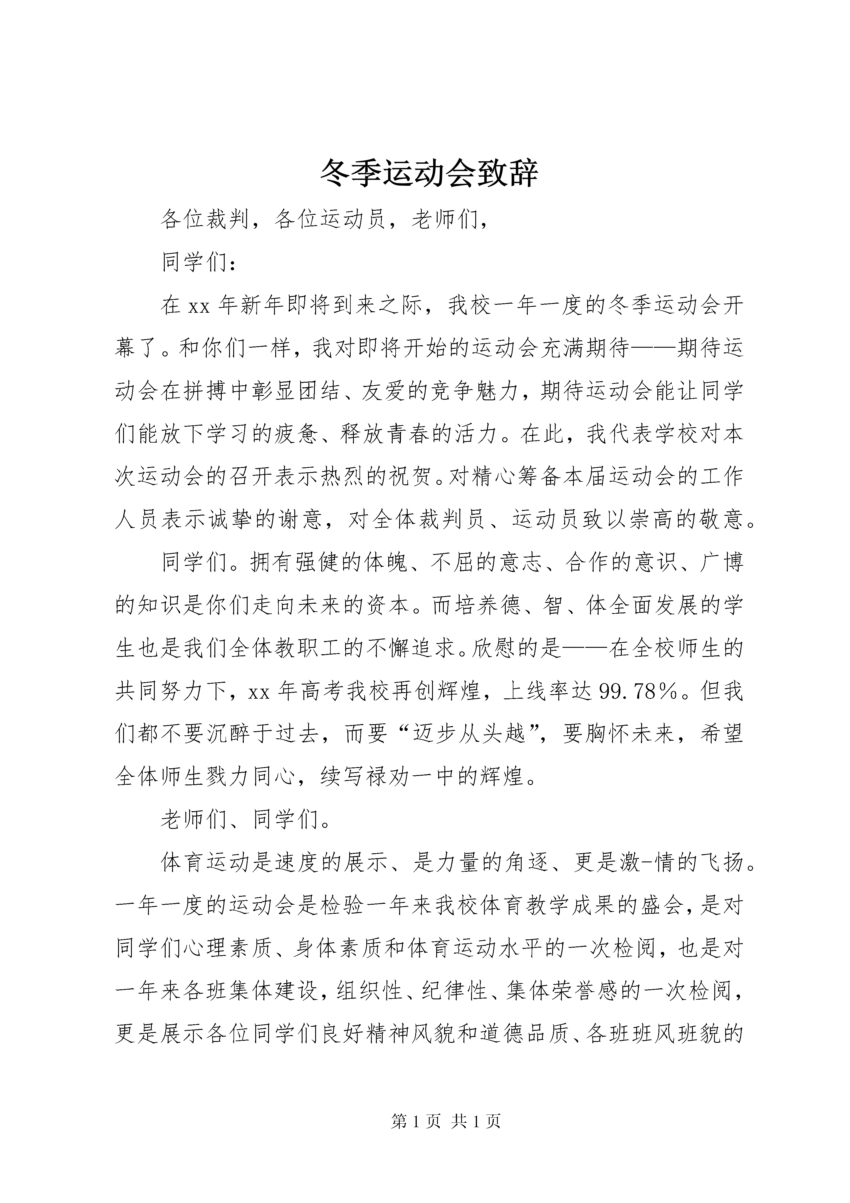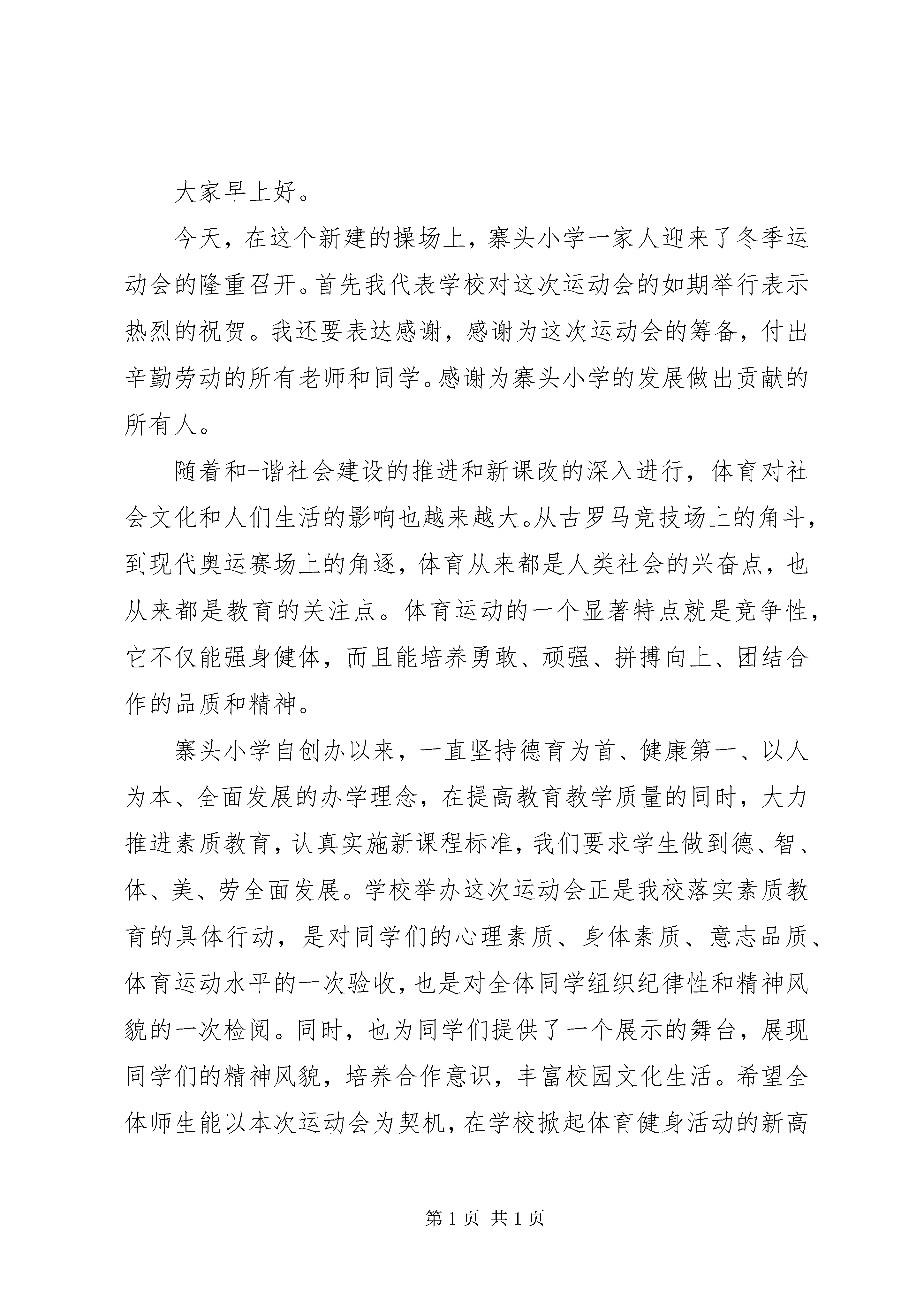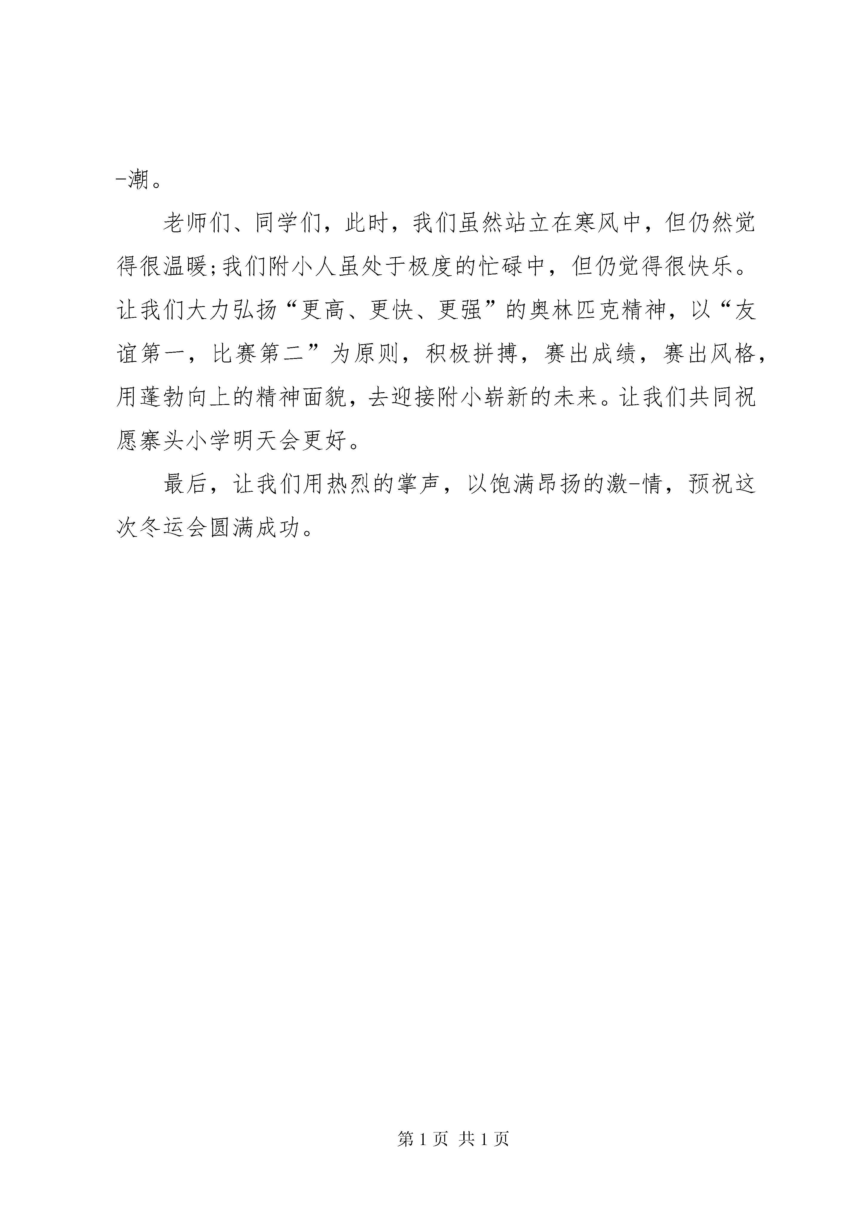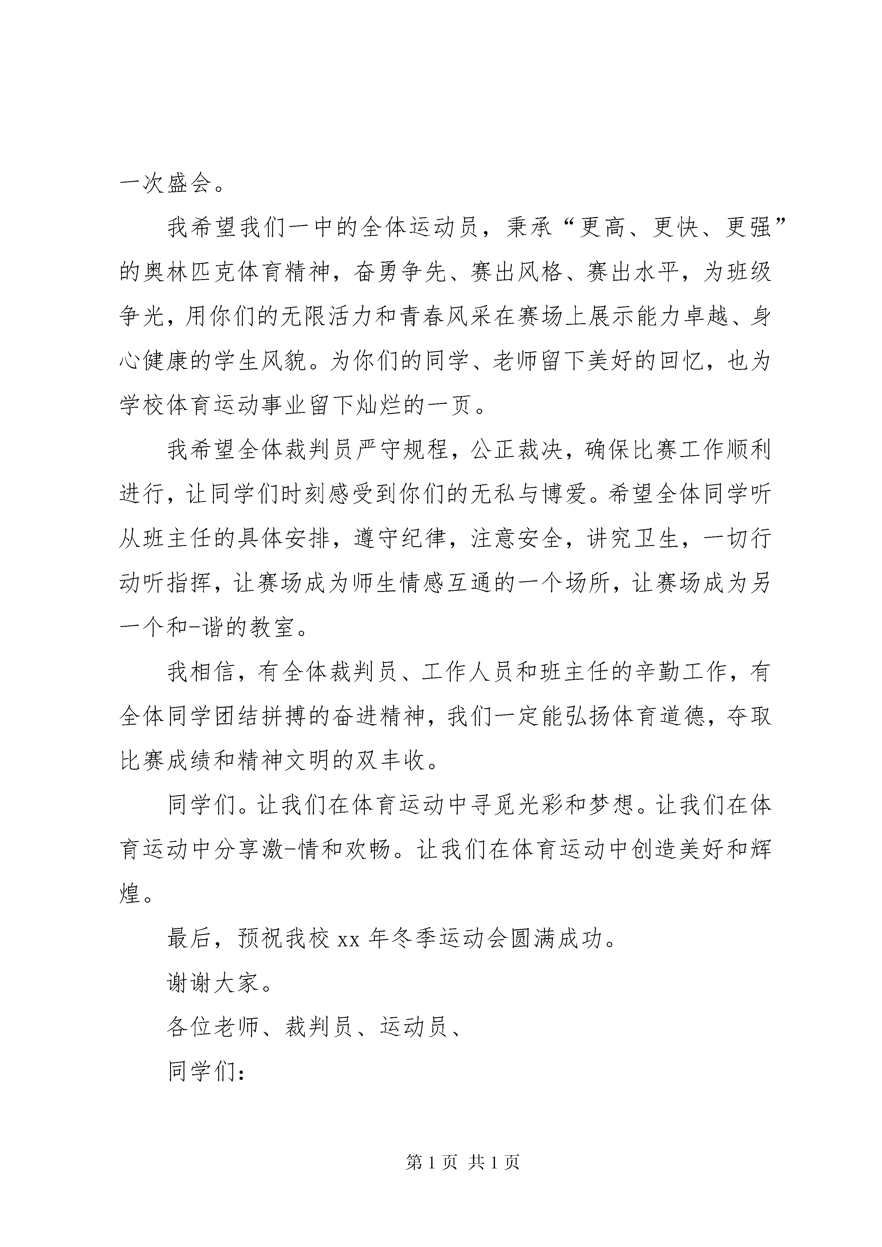 冬季运动会致辞各位裁判,各位运动员,老师们,同学们:在xx年新年即将到来之际,我校一年一度的冬季运动会开幕了。和你们一样,我对即将开始的运动会充满期待——期待运动会在拼搏中彰显团结、友爱的竞争魅力,期待运动会能让同学们能放下学习的疲惫、释放青春的活力。在此,我代表学校对本次运动会的召开表示热烈的祝贺。对精心筹备本届运动会的工作人员表示诚挚的谢意,对全体裁判员、运动员致以崇高的敬意。同学们。拥有强健的体魄、不屈的意志、合作的意识、广博的知识是你们走向未来的资本。而培养德、智、体全面发展的学生也是我们全体教职工的不懈追求。欣慰的是——在全校师生的共同努力下,xx年高考我校再创辉煌,上线率达99.78%。但我们都不要沉醉于过去,而要“迈步从头越”,要胸怀未来,希望全体师生戮力同心,续写禄劝一中的辉煌。老师们、同学们。体育运动是速度的展示、是力量的角逐、更是激-情的飞扬。一年一度的运动会是检验一年来我校体育教学成果的盛会,是对同学们心理素质、身体素质和体育运动水平的一次检阅,也是对一年来各班集体建设,组织性、纪律性、集体荣誉感的一次检阅,更是展示各位同学们良好精神风貌和道德品质、各班班风班貌的一次盛会。我希望我们一中的全体运动员,秉承“更高、更快、更强”的奥林匹克体育精神,奋勇争先、赛出风格、赛出水平,为班级争光,用你们的无限活力和青春风采在赛场上展示能力卓越、身心健康的学生风貌。为你们的同学、老师留下美好的回忆,也为学校体育运动事业留下灿烂的一页。我希望全体裁判员严守规程,公正裁决,确保比赛工作顺利进行,让同学们时刻感受到你们的无私与博爱。希望全体同学听从班主任的具体安排,遵守纪律,注意安全,讲究卫生,一切行动听指挥,让赛场成为师生情感互通的一个场所,让赛场成为另一个和-谐的教室。我相信,有全体裁判员、工作人员和班主任的辛勤工作,有全体同学团结拼搏的奋进精神,我们一定能弘扬体育道德,夺取比赛成绩和精神文明的双丰收。同学们。让我们在体育运动中寻觅光彩和梦想。让我们在体育运动中分享激-情和欢畅。让我们在体育运动中创造美好和辉煌。最后,预祝我校xx年冬季运动会圆满成功。谢谢大家。各位老师、裁判员、运动员、同学们:大家早上好。今天,在这个新建的操场上,寨头小学一家人迎来了冬季运动会的隆重召开。首先我代表学校对这次运动会的如期举行表示热烈的祝贺。我还要表达感谢,感谢为这次运动会的筹备,付出辛勤劳动的所有老师和同学。感谢为寨头小学的发展做出贡献的所有人。随着和-谐社会建设的推进和新课改的深入进行,体育对社会文化和人们生活的影响也越来越大。从古罗马竞技场上的角斗,到现代奥运赛场上的角逐,体育从来都是人类社会的兴奋点,也从来都是教育的关注点。体育运动的一个显著特点就是竞争性,它不仅能强身健体,而且能培养勇敢、顽强、拼搏向上、团结合作的品质和精神。寨头小学自创办以来,一直坚持德育为首、健康第一、以人为本、全面发展的办学理念,在提高教育教学质量的同时,大力推进素质教育,认真实施新课程标准,我们要求学生做到德、智、体、美、劳全面发展。学校举办这次运动会正是我校落实素质教育的具体行动,是对同学们的心理素质、身体素质、意志品质、体育运动水平的一次验收,也是对全体同学组织纪律性和精神风貌的一次检阅。同时,也为同学们提供了一个展示的舞台,展现同学们的精神风貌,培养合作意识,丰富校园文化生活。希望全体师生能以本次运动会为契机,在学校掀起体育健身活动的新高-潮。老师们、同学们,此时,我们虽然站立在寒风中,但仍然觉得很温暖;我们附小人虽处于极度的忙碌中,但仍觉得很快乐。让我们大力弘扬“更高、更快、更强”的奥林匹克精神,以“友谊第一,比赛第二”为原则,积极拼搏,赛出成绩,赛出风格,用蓬勃向上的精神面貌,去迎接附小崭新的未来。让我们共同祝愿寨头小学明天会更好。最后,让我们用热烈的掌声,以饱满昂扬的激-情,预祝这次冬运会圆满成功。