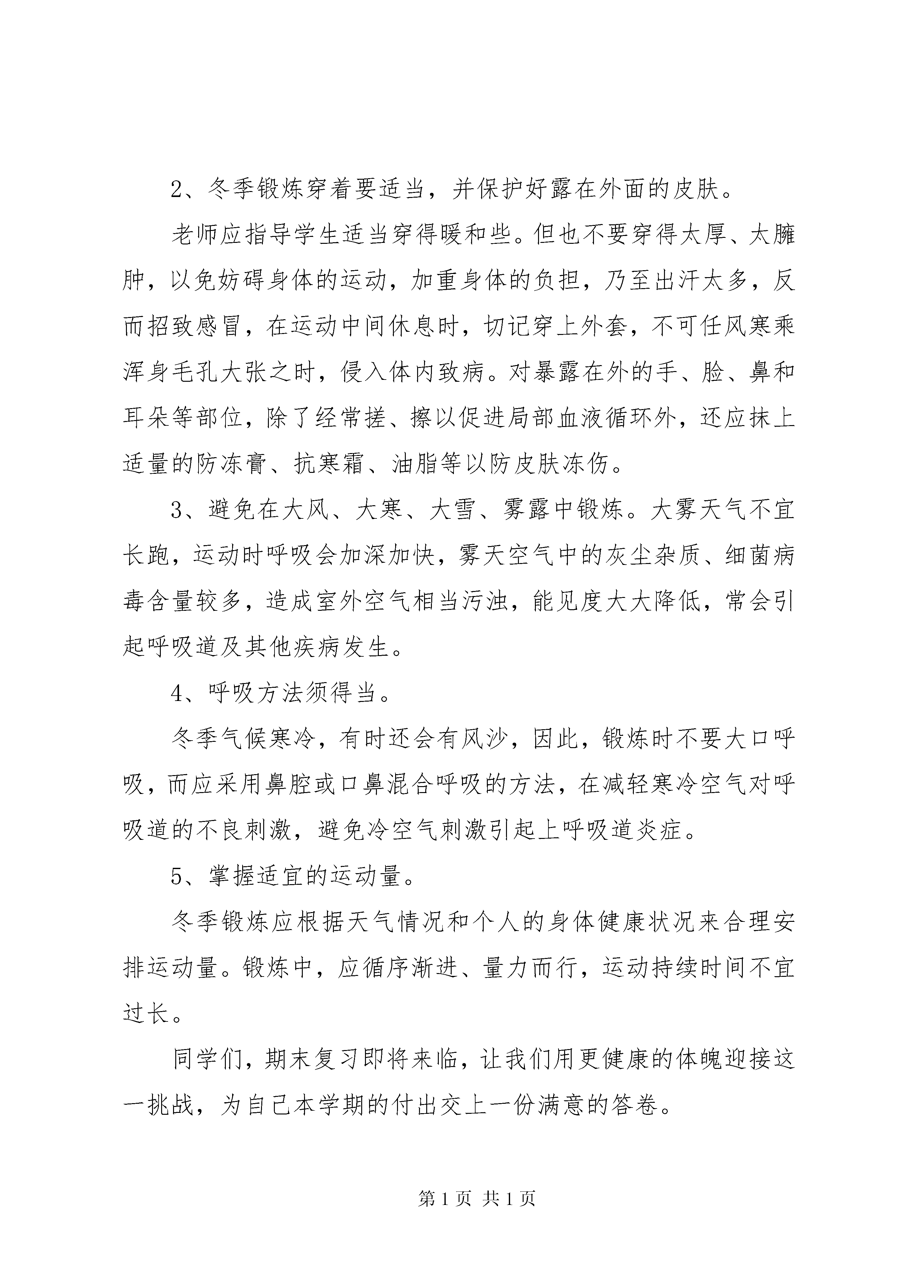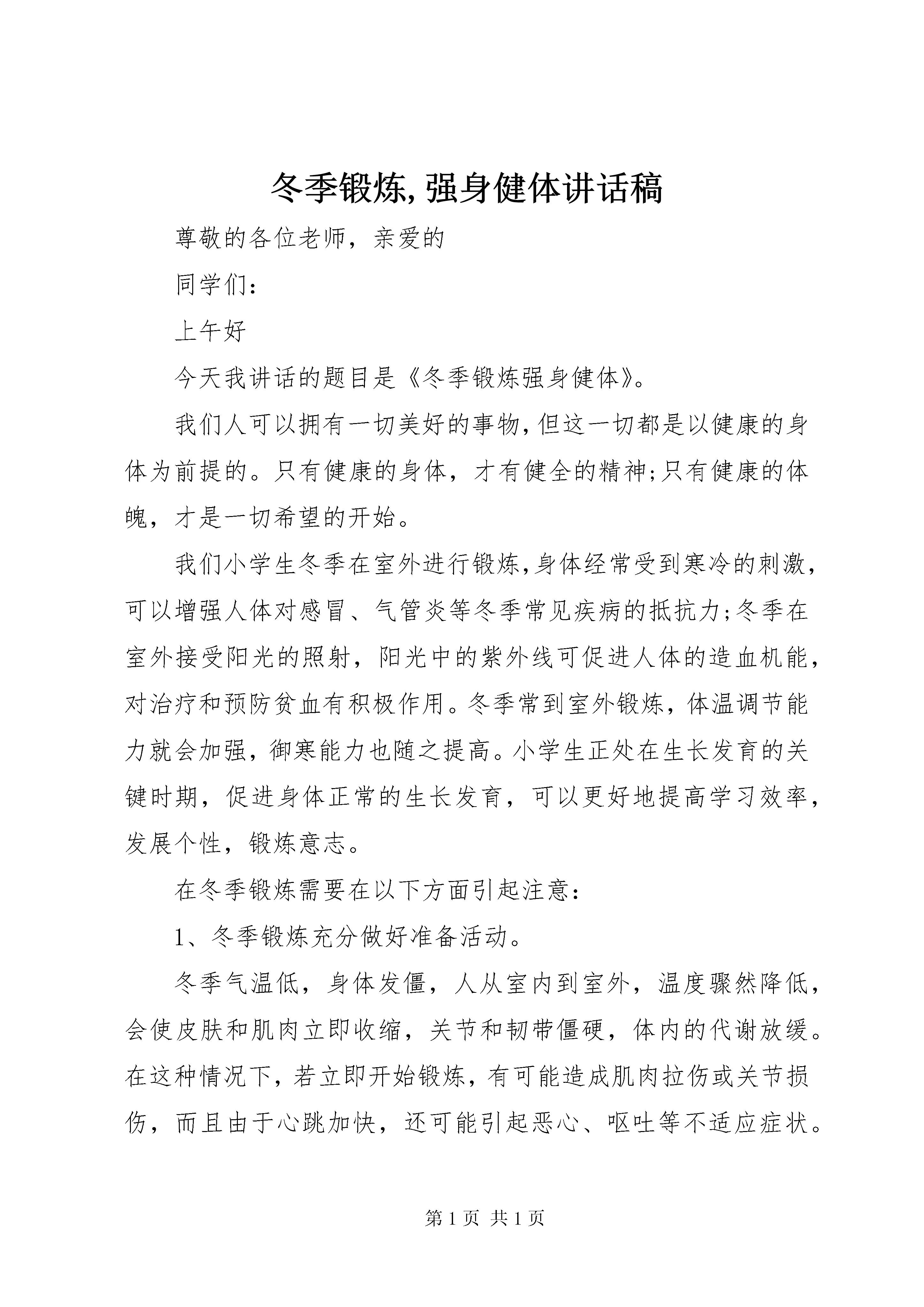 冬季锻炼,强身健体讲话稿尊敬的各位老师,亲爱的同学们:上午好今天我讲话的题目是《冬季锻炼强身健体》。我们人可以拥有一切美好的事物,但这一切都是以健康的身体为前提的。只有健康的身体,才有健全的精神;只有健康的体魄,才是一切希望的开始。我们小学生冬季在室外进行锻炼,身体经常受到寒冷的刺激,可以增强人体对感冒、气管炎等冬季常见疾病的抵抗力;冬季在室外接受阳光的照射,阳光中的紫外线可促进人体的造血机能,对治疗和预防贫血有积极作用。冬季常到室外锻炼,体温调节能力就会加强,御寒能力也随之提高。小学生正处在生长发育的关键时期,促进身体正常的生长发育,可以更好地提高学习效率,发展个性,锻炼意志。在冬季锻炼需要在以下方面引起注意:1、冬季锻炼充分做好准备活动。冬季气温低,身体发僵,人从室内到室外,温度骤然降低,会使皮肤和肌肉立即收缩,关节和韧带僵硬,体内的代谢放缓。在这种情况下,若立即开始锻炼,有可能造成肌肉拉伤或关节损伤,而且由于心跳加快,还可能引起恶心、呕吐等不适应症状。2、冬季锻炼穿着要适当,并保护好露在外面的皮肤。老师应指导学生适当穿得暖和些。但也不要穿得太厚、太臃肿,以免妨碍身体的运动,加重身体的负担,乃至出汗太多,反而招致感冒,在运动中间休息时,切记穿上外套,不可任风寒乘浑身毛孔大张之时,侵入体内致病。对暴露在外的手、脸、鼻和耳朵等部位,除了经常搓、擦以促进局部血液循环外,还应抹上适量的防冻膏、抗寒霜、油脂等以防皮肤冻伤。3、避免在大风、大寒、大雪、雾露中锻炼。大雾天气不宜长跑,运动时呼吸会加深加快,雾天空气中的灰尘杂质、细菌病毒含量较多,造成室外空气相当污浊,能见度大大降低,常会引起呼吸道及其他疾病发生。4、呼吸方法须得当。冬季气候寒冷,有时还会有风沙,因此,锻炼时不要大口呼吸,而应采用鼻腔或口鼻混合呼吸的方法,在减轻寒冷空气对呼吸道的不良刺激,避免冷空气刺激引起上呼吸道炎症。5、掌握适宜的运动量。冬季锻炼应根据天气情况和个人的身体健康状况来合理安排运动量。锻炼中,应循序渐进、量力而行,运动持续时间不宜过长。同学们,期末复习即将来临,让我们用更健康的体魄迎接这一挑战,为自己本学期的付出交上一份满意的答卷。我的讲话完毕谢谢