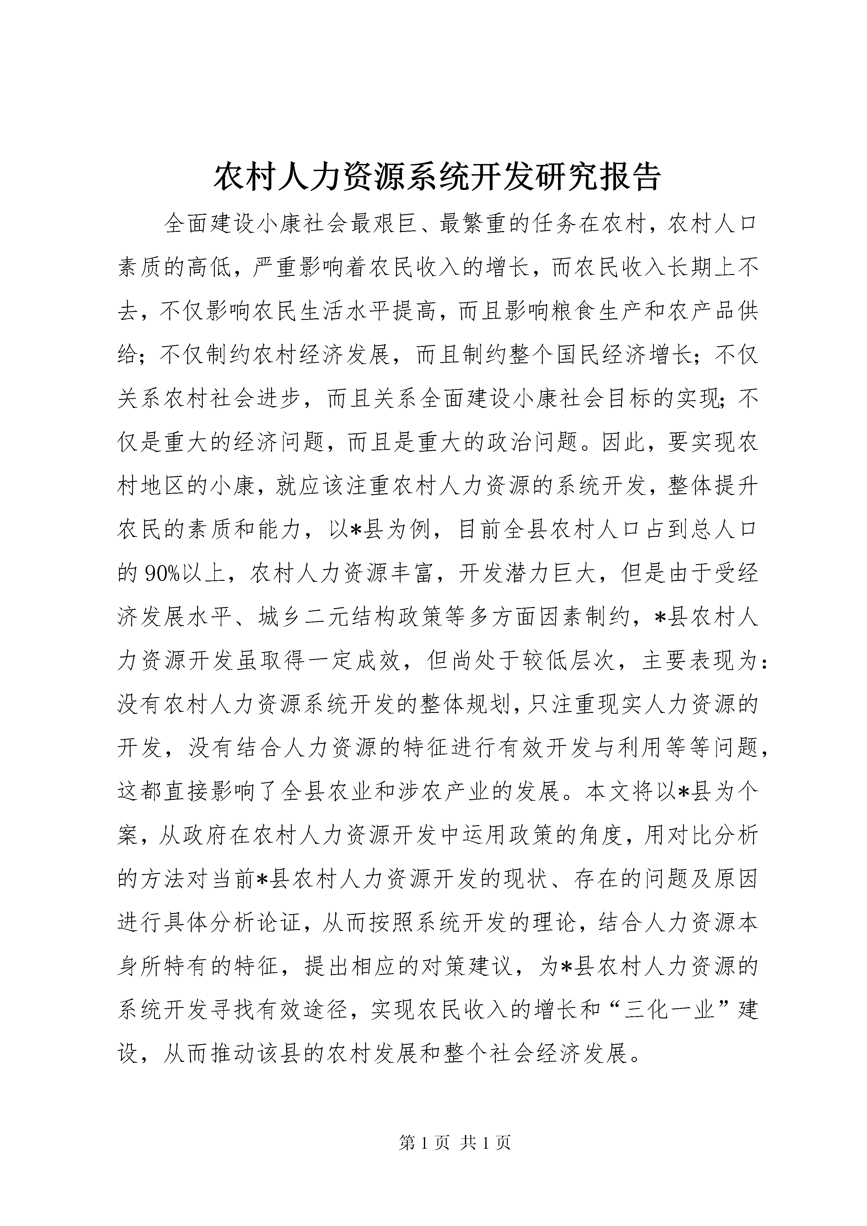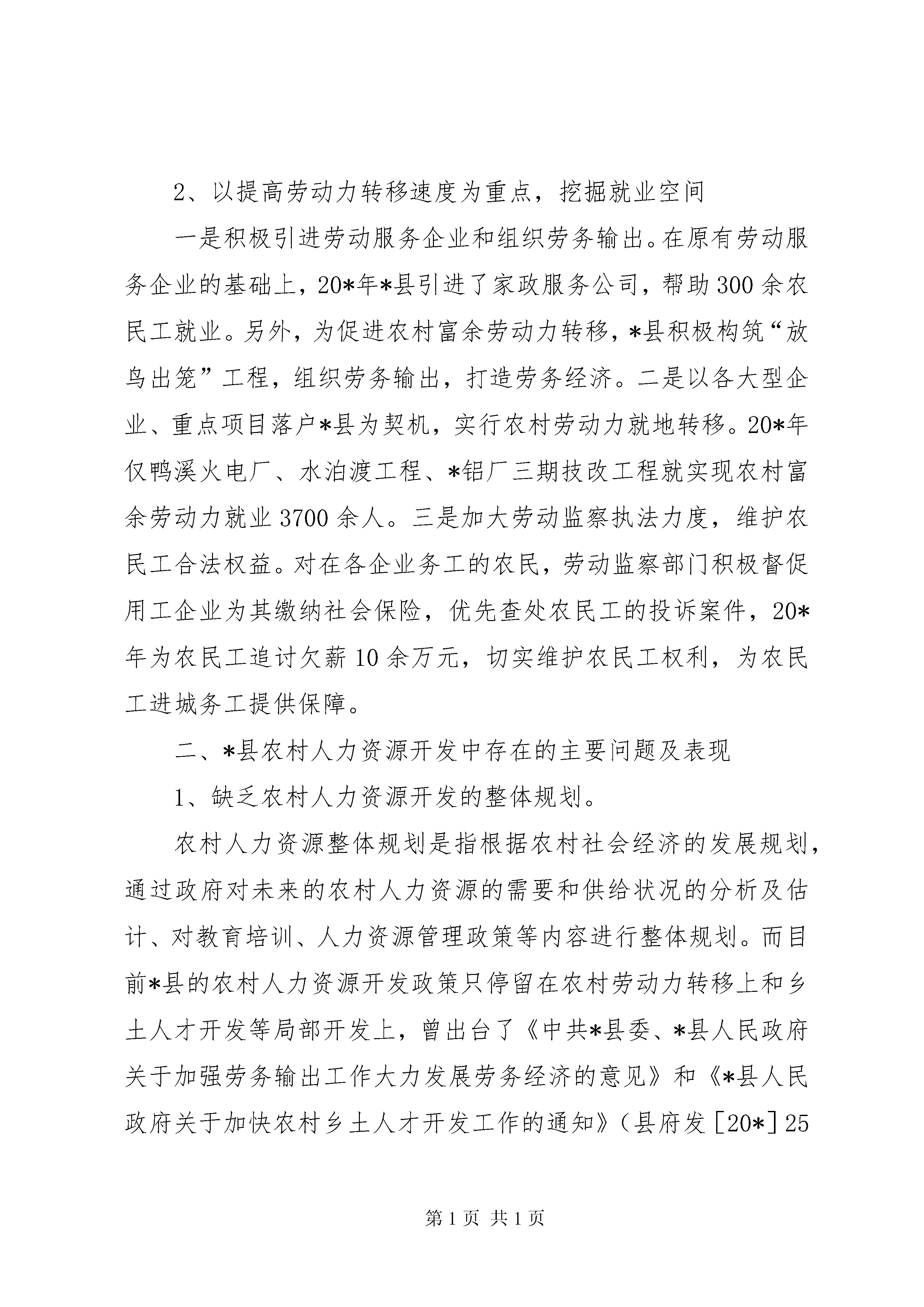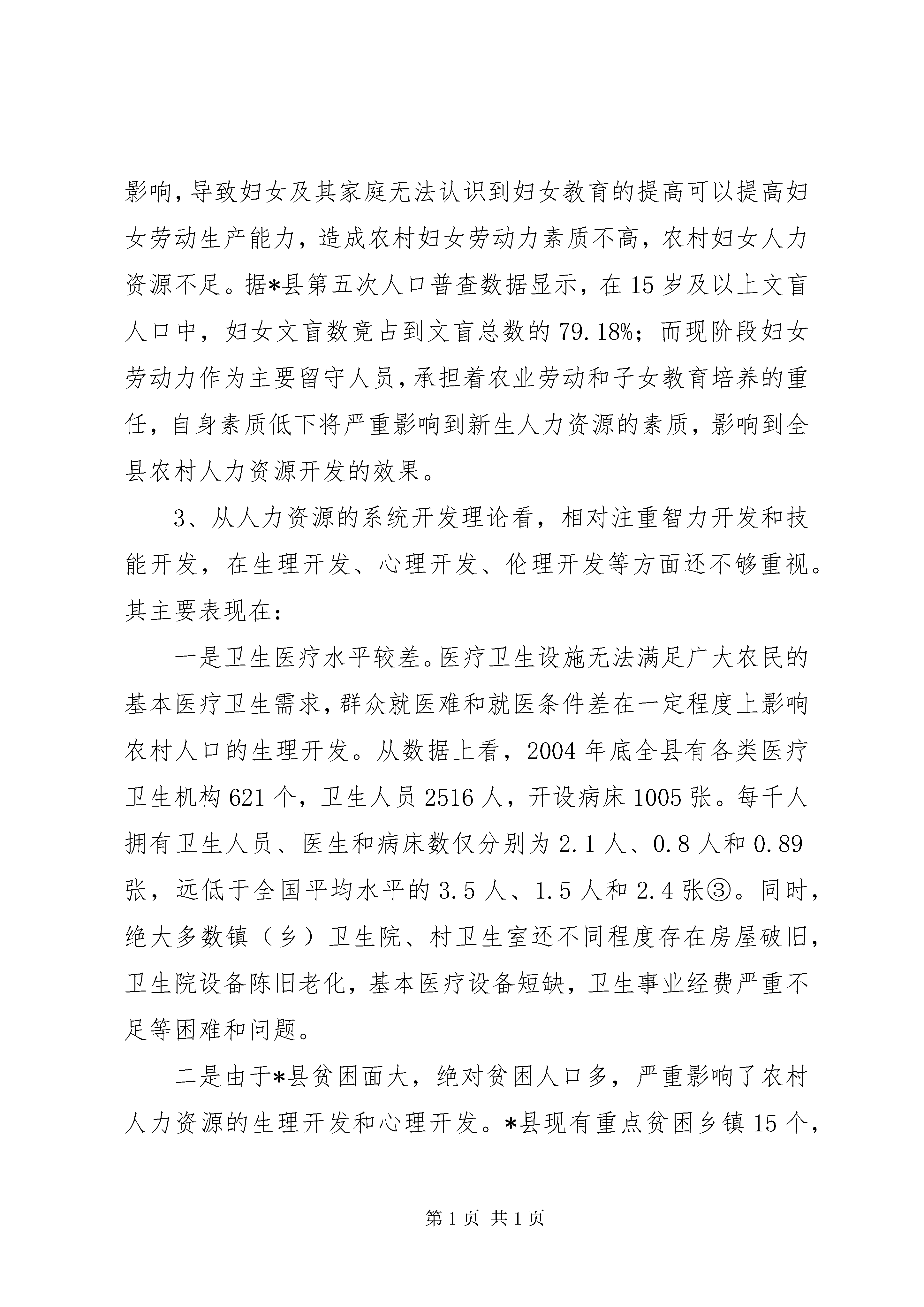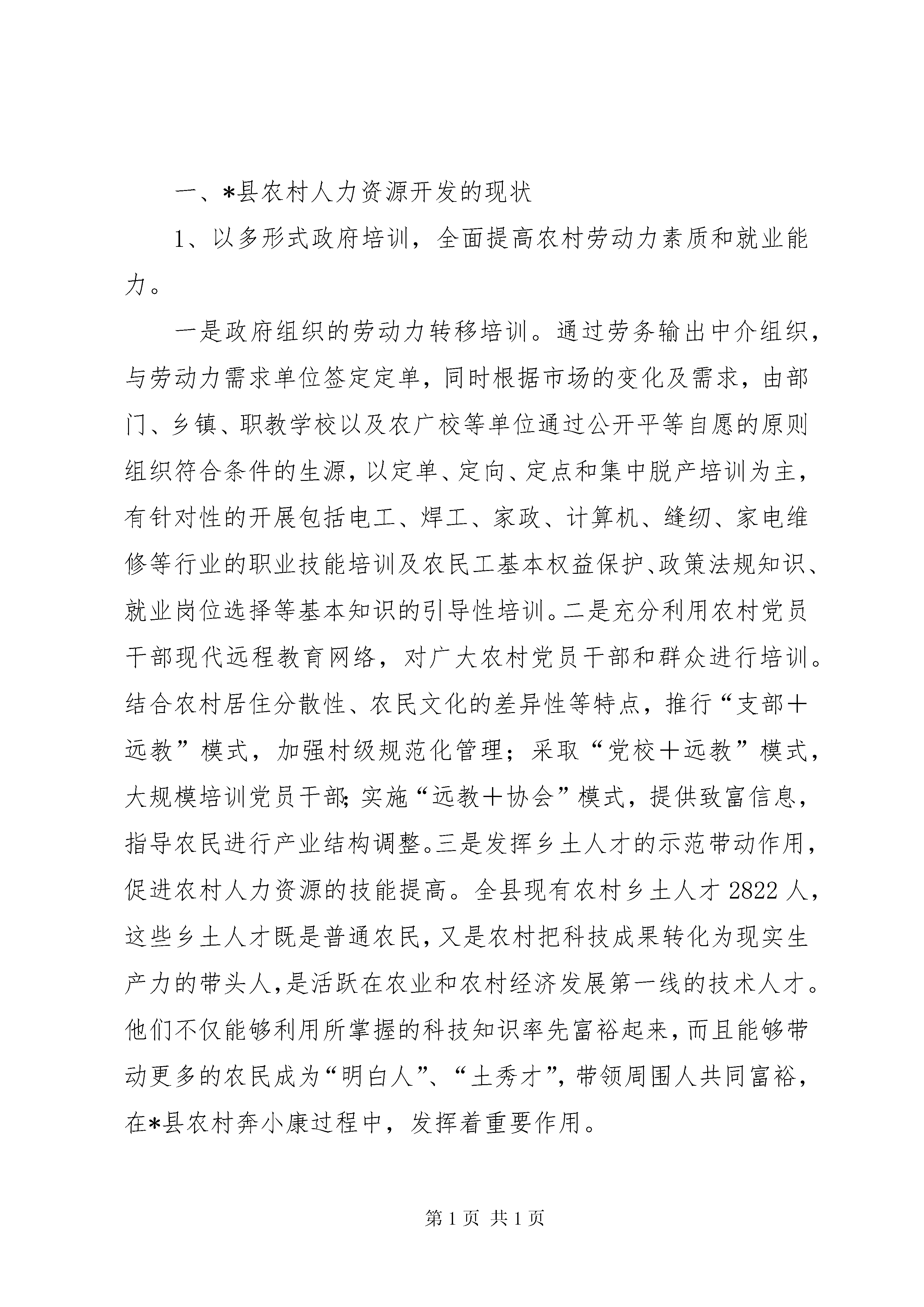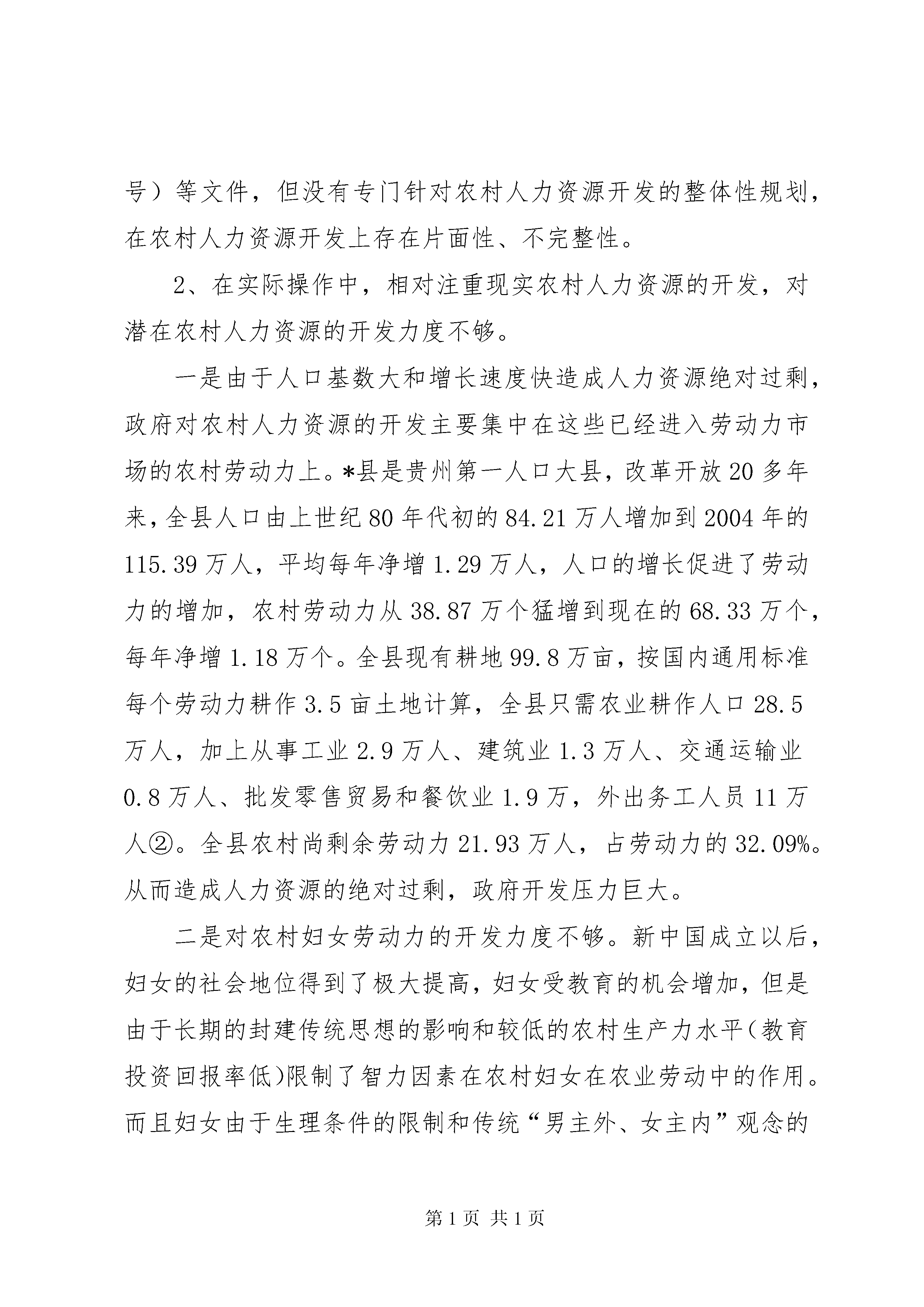 农村人力资源系统开发研究报告全面建设小康社会最艰巨、最繁重的任务在农村,农村人口素质的高低,严重影响着农民收入的增长,而农民收入长期上不去,不仅影响农民生活水平提高,而且影响粮食生产和农产品供给;不仅制约农村经济发展,而且制约整个国民经济增长;不仅关系农村社会进步,而且关系全面建设小康社会目标的实现;不仅是重大的经济问题,而且是重大的政治问题。因此,要实现农村地区的小康,就应该注重农村人力资源的系统开发,整体提升农民的素质和能力,以*县为例,目前全县农村人口占到总人口的90%以上,农村人力资源丰富,开发潜力巨大,但是由于受经济发展水平、城乡二元结构政策等多方面因素制约,*县农村人力资源开发虽取得一定成效,但尚处于较低层次,主要表现为:没有农村人力资源系统开发的整体规划,只注重现实人力资源的开发,没有结合人力资源的特征进行有效开发与利用等等问题,这都直接影响了全县农业和涉农产业的发展。本文将以*县为个案,从政府在农村人力资源开发中运用政策的角度,用对比分析的方法对当前*县农村人力资源开发的现状、存在的问题及原因进行具体分析论证,从而按照系统开发的理论,结合人力资源本身所特有的特征,提出相应的对策建议,为*县农村人力资源的系统开发寻找有效途径,实现农民收入的增长和“三化一业”建设,从而推动该县的农村发展和整个社会经济发展。一、*县农村人力资源开发的现状1、以多形式政府培训,全面提高农村劳动力素质和就业能力。一是政府组织的劳动力转移培训。通过劳务输出中介组织,与劳动力需求单位签定定单,同时根据市场的变化及需求,由部门、乡镇、职教学校以及农广校等单位通过公开平等自愿的原则组织符合条件的生源,以定单、定向、定点和集中脱产培训为主,有针对性的开展包括电工、焊工、家政、计算机、缝纫、家电维修等行业的职业技能培训及农民工基本权益保护、政策法规知识、就业岗位选择等基本知识的引导性培训。二是充分利用农村党员干部现代远程教育网络,对广大农村党员干部和群众进行培训。结合农村居住分散性、农民文化的差异性等特点,推行“支部+远教”模式,加强村级规范化管理;采取“党校+远教”模式,大规模培训党员干部;实施“远教+协会”模式,提供致富信息,指导农民进行产业结构调整。三是发挥乡土人才的示范带动作用,促进农村人力资源的技能提高。全县现有农村乡土人才2822人,这些乡土人才既是普通农民,又是农村把科技成果转化为现实生产力的带头人,是活跃在农业和农村经济发展第一线的技术人才。他们不仅能够利用所掌握的科技知识率先富裕起来,而且能够带动更多的农民成为“明白人”、“土秀才”,带领周围人共同富裕,在*县农村奔小康过程中,发挥着重要作用。2、以提高劳动力转移速度为重点,挖掘就业空间一是积极引进劳动服务企业和组织劳务输出。在原有劳动服务企业的基础上,20*年*县引进了家政服务公司,帮助300余农民工就业。另外,为促进农村富余劳动力转移,*县积极构筑“放鸟出笼”工程,组织劳务输出,打造劳务经济。二是以各大型企业、重点项目落户*县为契机,实行农村劳动力就地转移。20*年仅鸭溪火电厂、水泊渡工程、*铝厂三期技改工程就实现农村富余劳动力就业3700余人。三是加大劳动监察执法力度,维护农民工合法权益。对在各企业务工的农民,劳动监察部门积极督促用工企业为其缴纳社会保险,优先查处农民工的投诉案件,20*年为农民工追讨欠薪10余万元,切实维护农民工权利,为农民工进城务工提供保障。二、*县农村人力资源开发中存在的主要问题及表现1、缺乏农村人力资源开发的整体规划。农村人力资源整体规划是指根据农村社会经济的发展规划,通过政府对未来的农村人力资源的需要和供给状况的分析及估计、对教育培训、人力资源管理政策等内容进行整体规划。而目前*县的农村人力资源开发政策只停留在农村劳动力转移上和乡土人才开发等局部开发上,曾出台了《中共*县委、*县人民政府关于加强劳务输出工作大力发展劳务经济的意见》和《*县人民政府关于加快农村乡土人才开发工作的通知》(县府发[20*]25号)等文件,但没有专门针对农村人力资源开发的整体性规划,在农村人力资源开发上存在片面性、不完整性。2、在实际操作中,相对注重现实农村人力资源的开发,对潜在农村人力资源的开发力度不够。一是由于人口基数大和增长速度快造成人力资源绝对过剩,政府对农村人力资源的开发主要集中在这些已经进入劳动力市场的农村劳动力上。*县是贵州第一人口大县,改革开放20多年来,全县人口由上世纪80年代初的84.21万人增加到2004年的115.39万人,平均每年净增1.29万人,人口的增长促进了劳动力的增加,农村劳动力从38.87万个猛增到现在的68.33万个,每年净增1.18万个。全县现有耕地99.8万亩,按国内通用标准每个劳动力耕作3.5亩土地计算,全